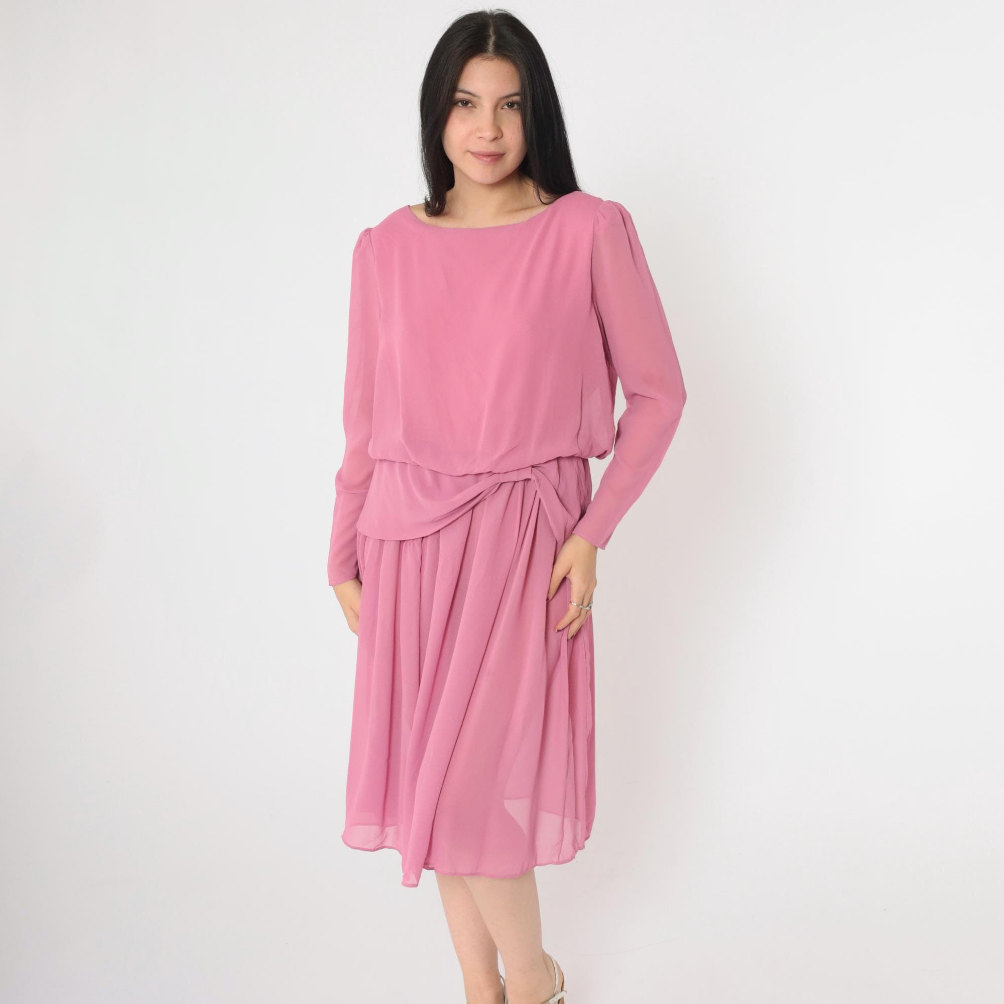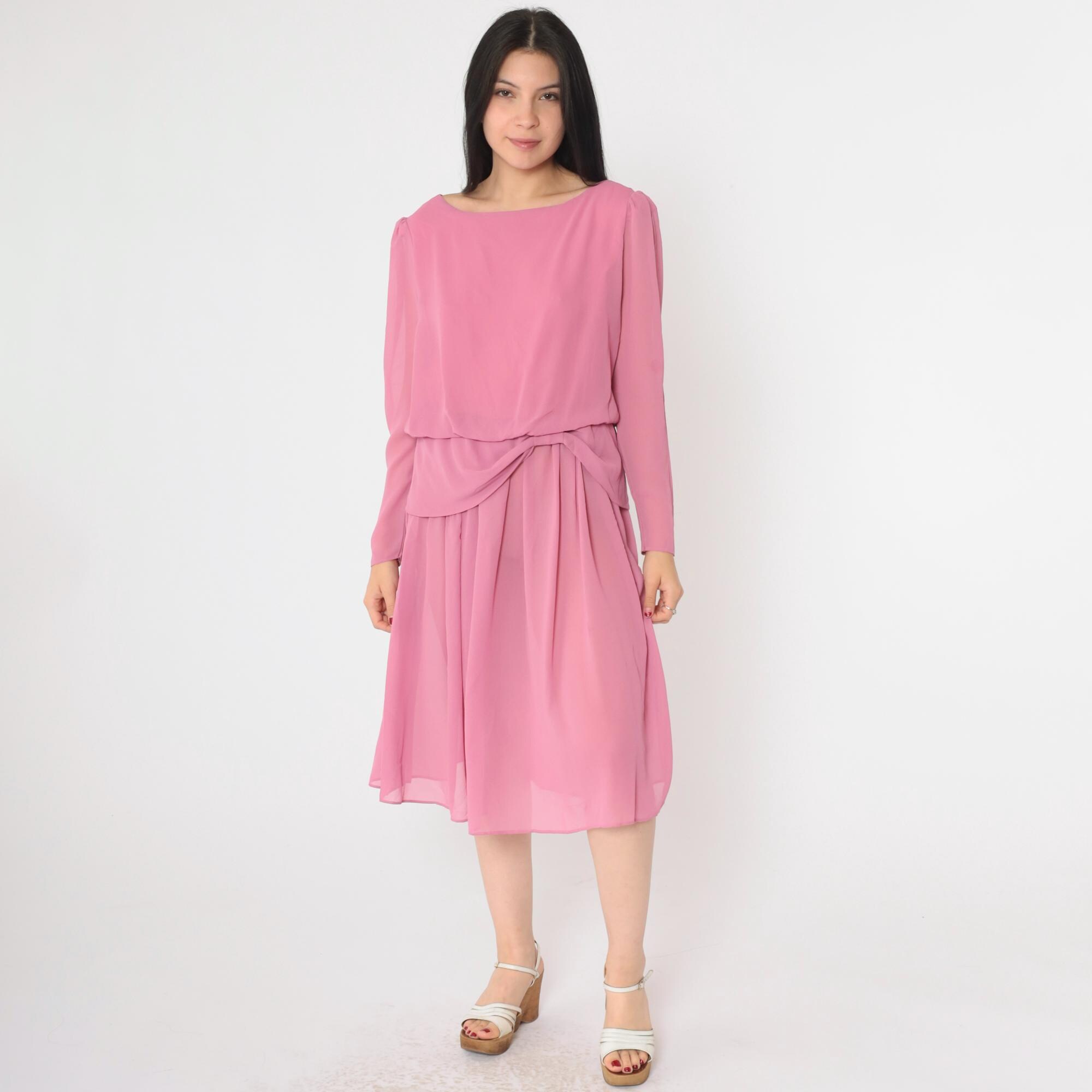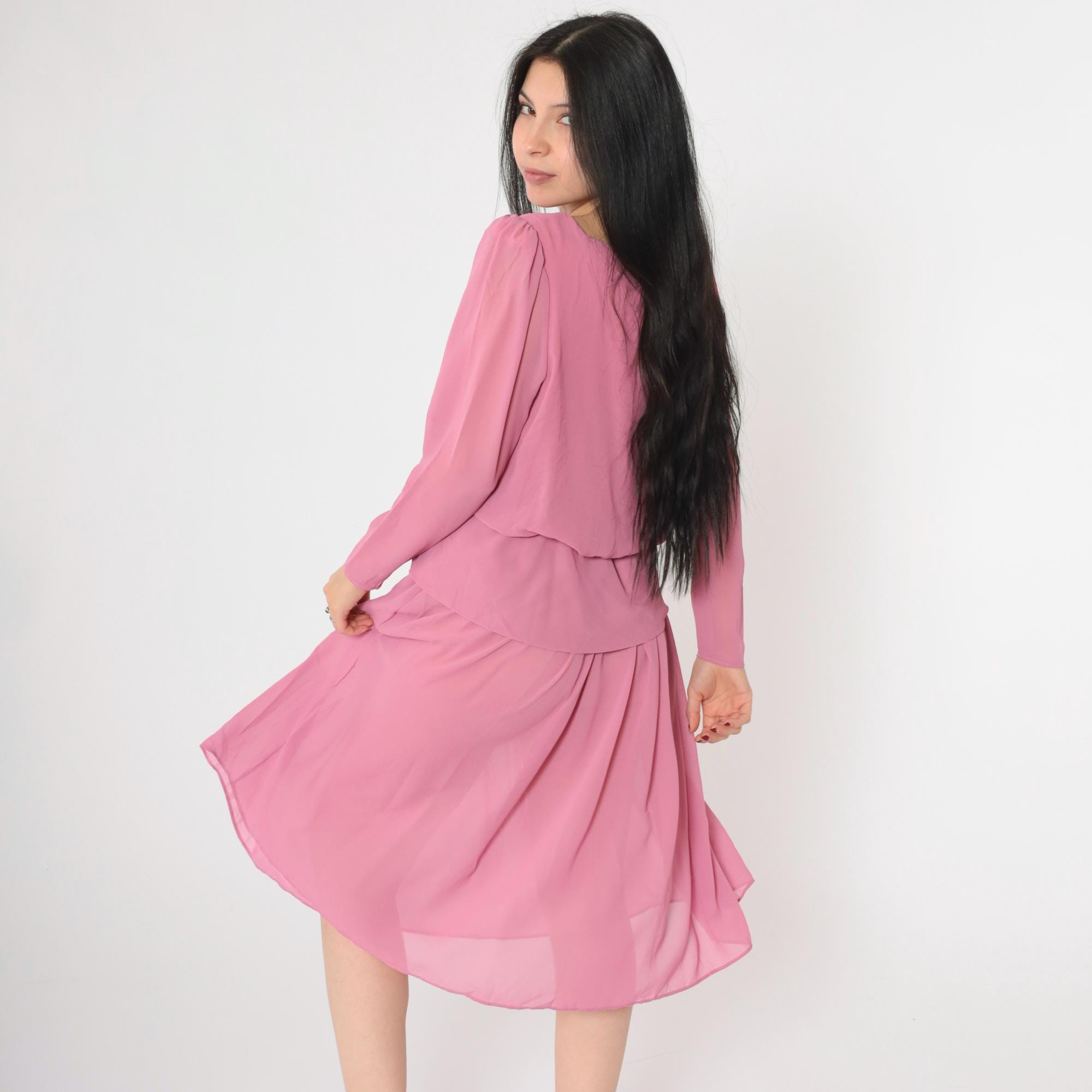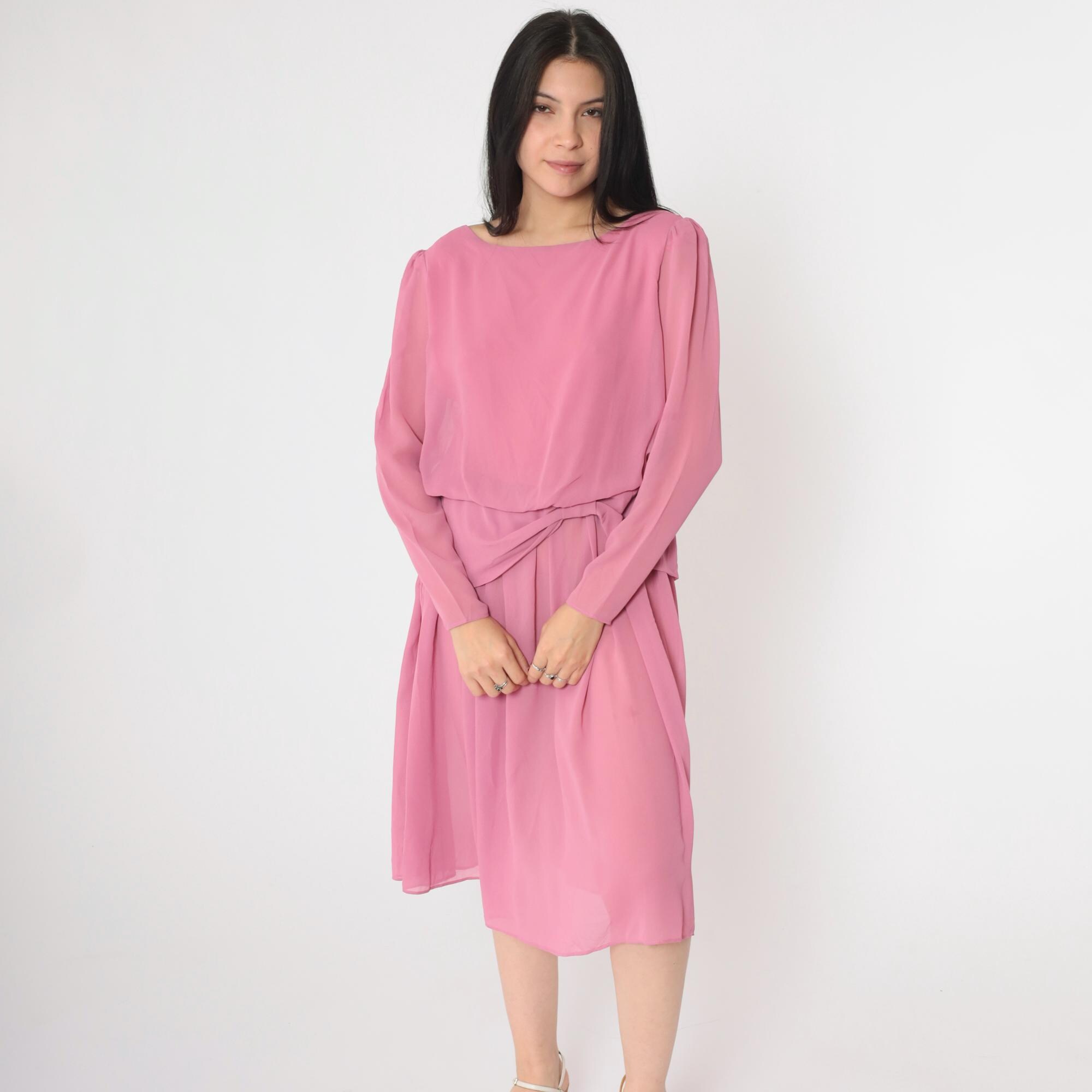 Vintage 80s dress in semi-sheer pink chiffon with long puff sleeves and an elastic waist. It features a peplum waist and a midi length skirt.