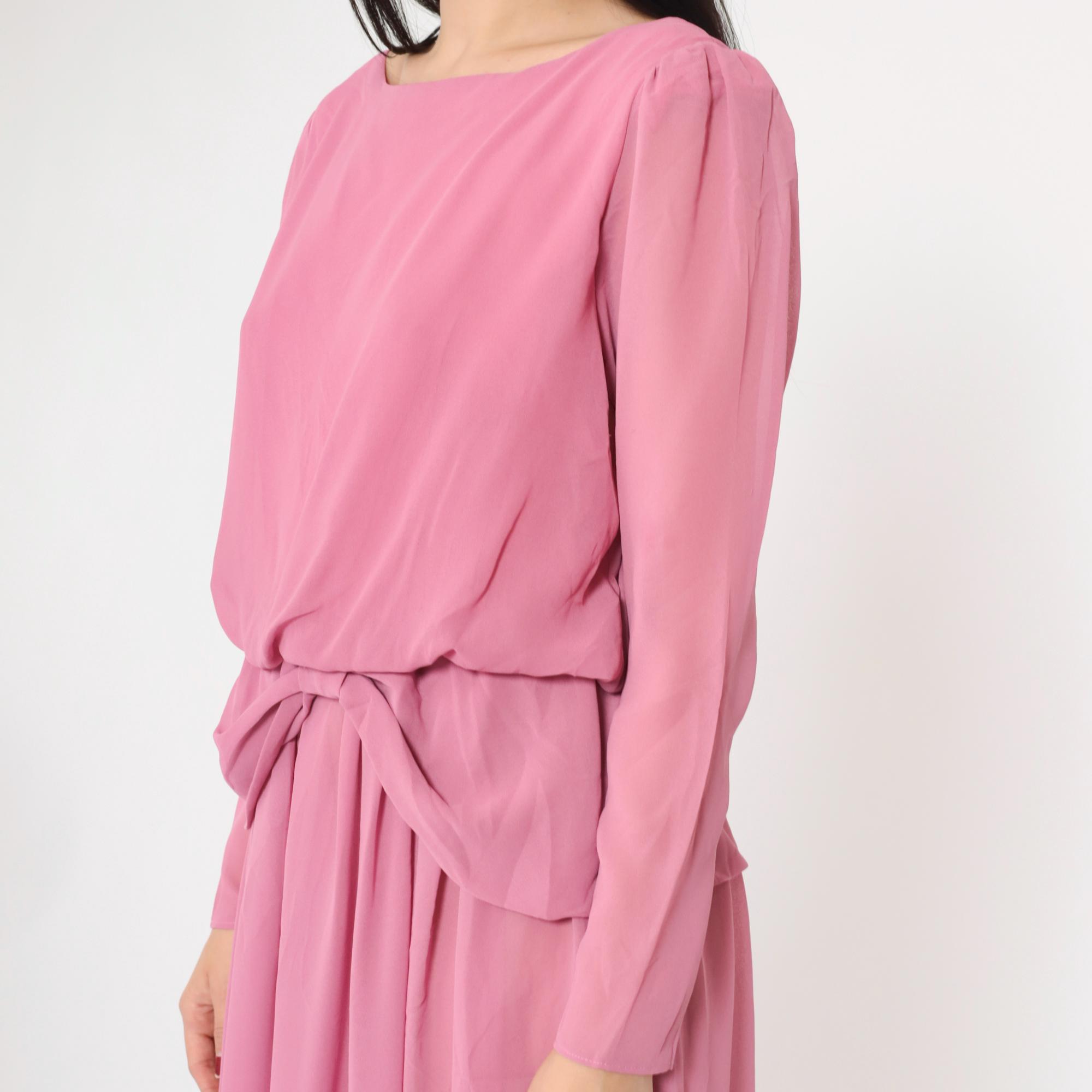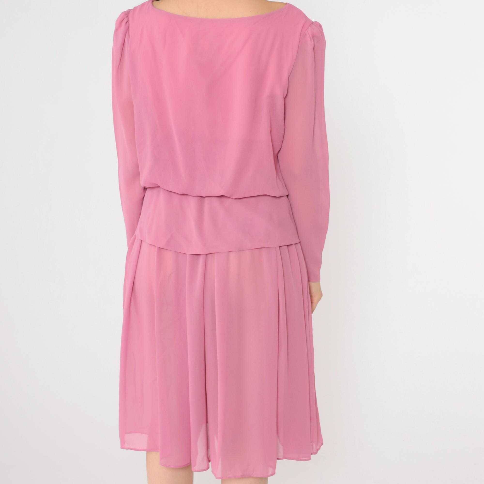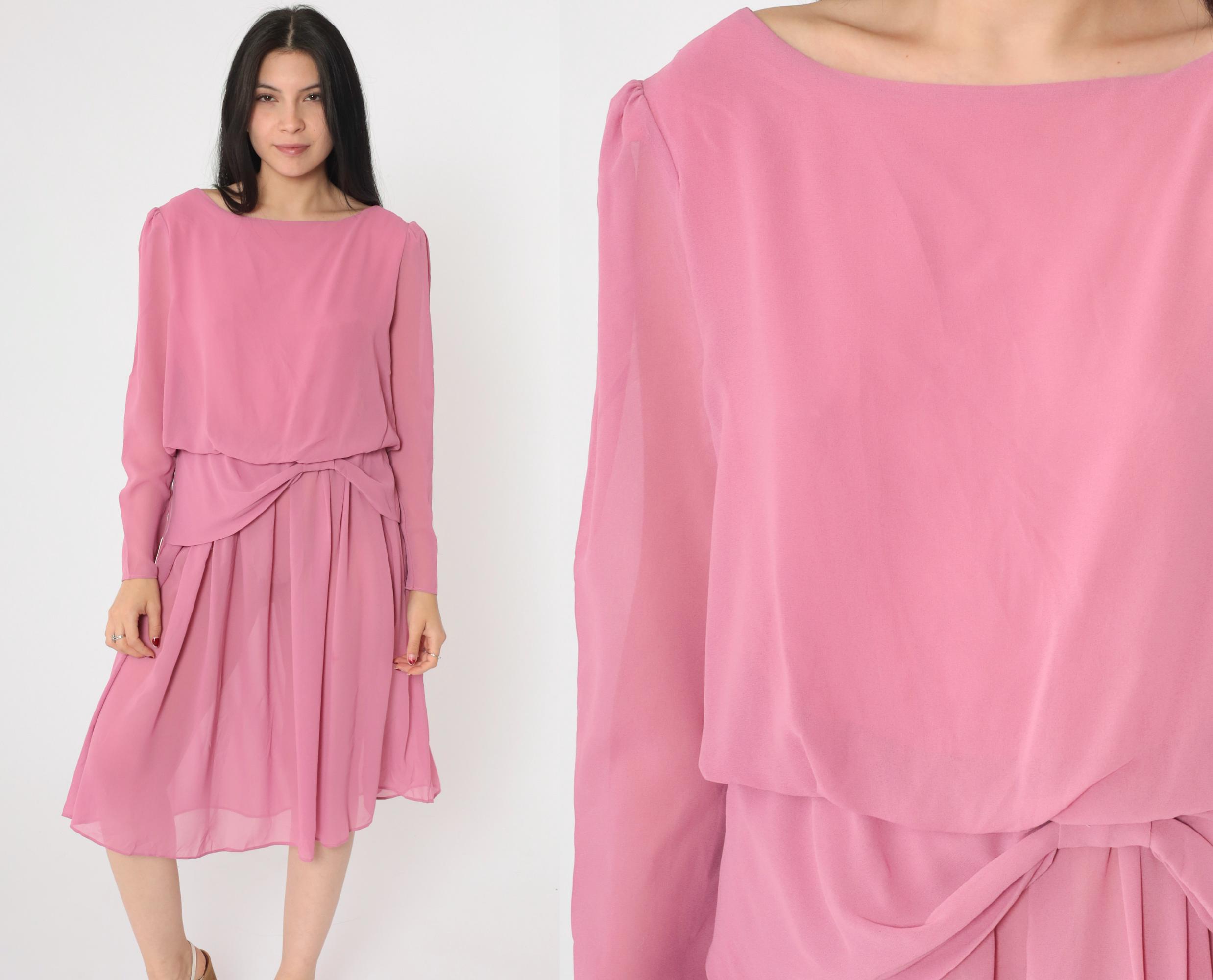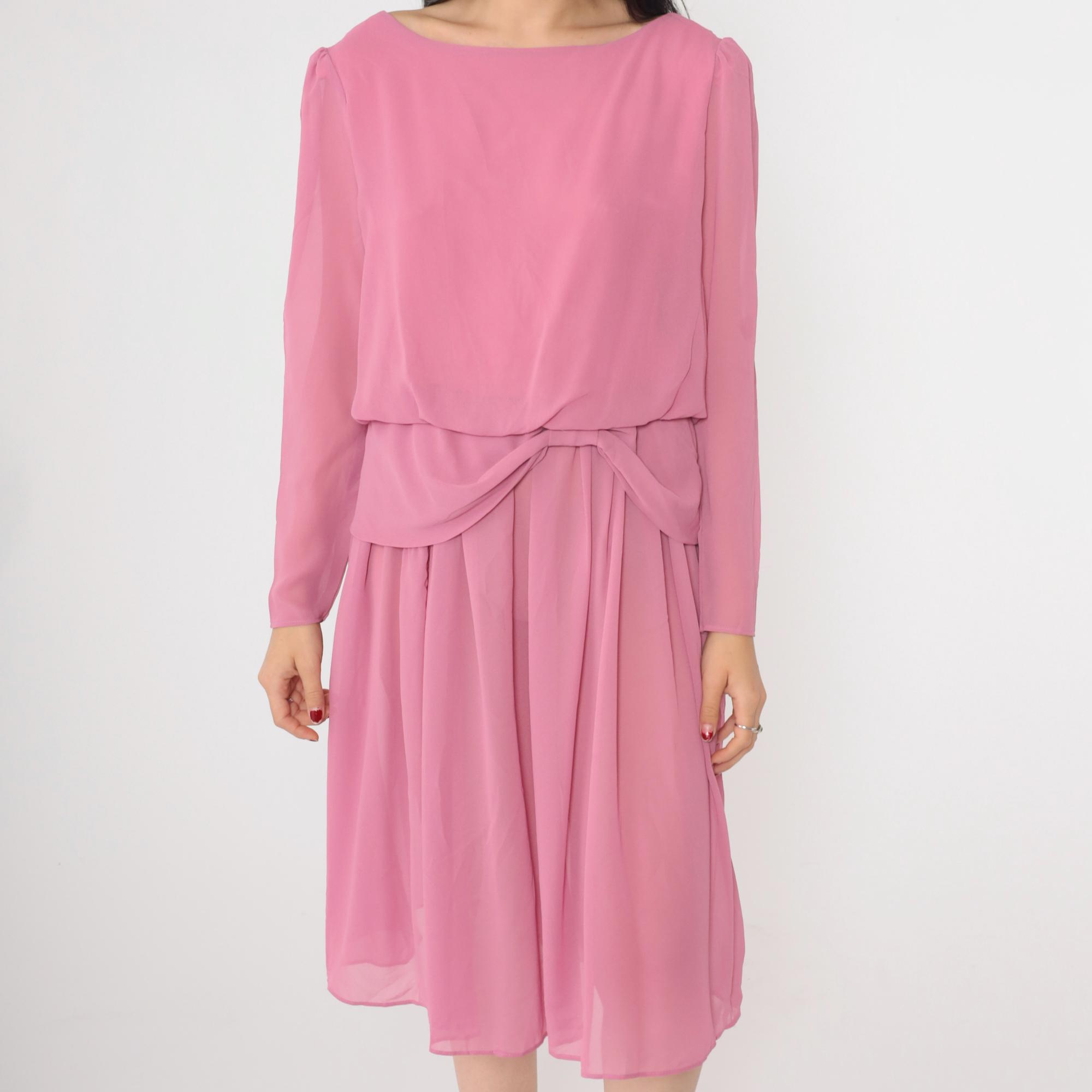 Vintage 80s dress in semi-sheer pink chiffon with long puff sleeves and an elastic waist. It features a peplum waist and a midi length skirt.