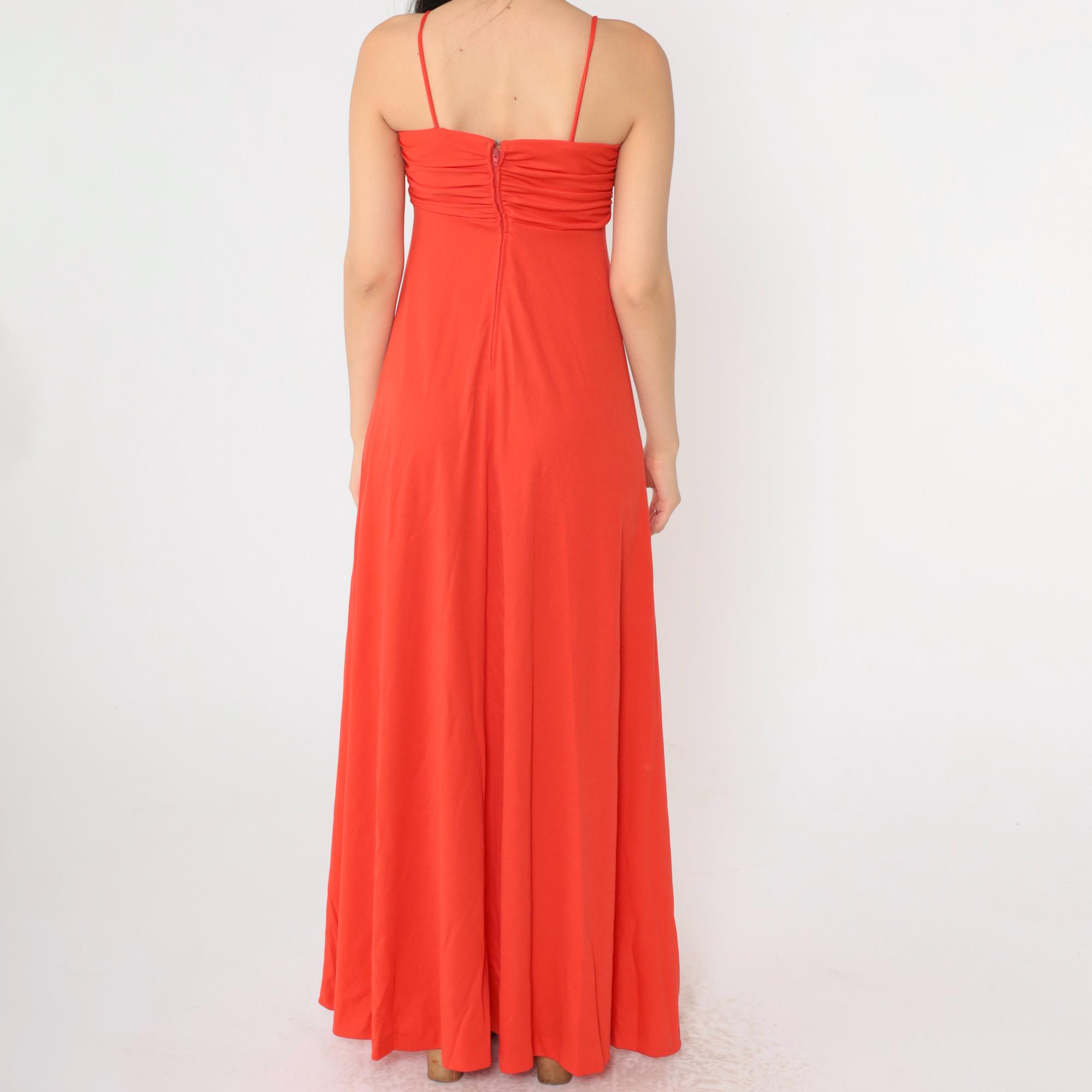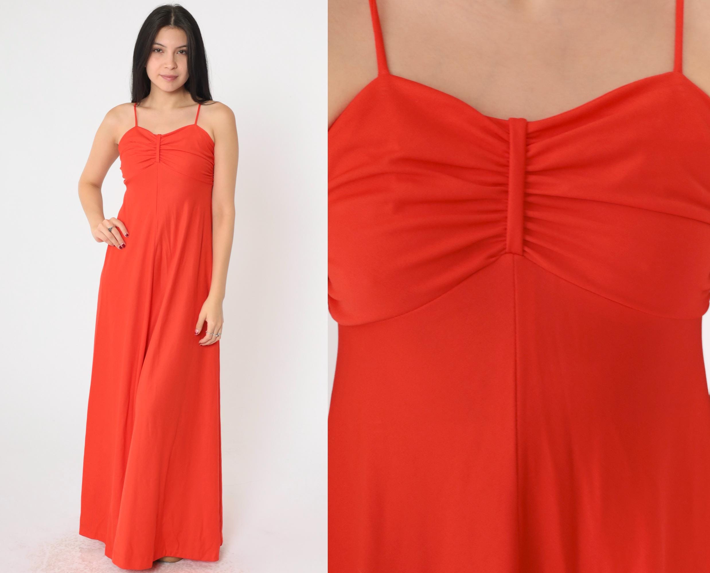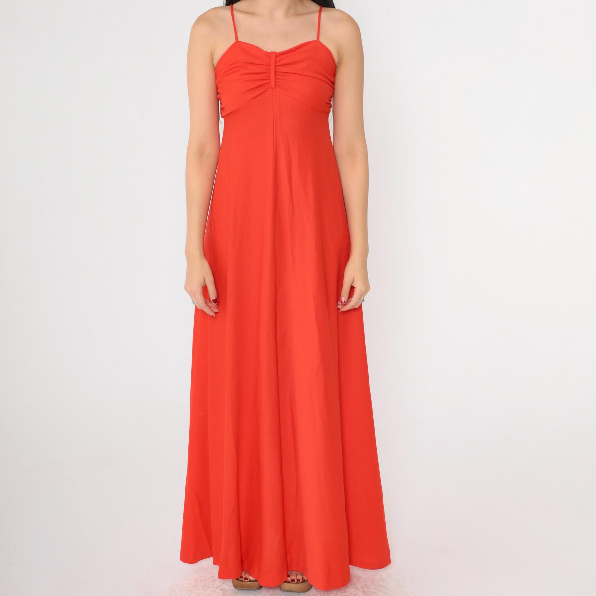 Vintage 70s maxi dress in red with a gathered bodice and an empire waist. It has spaghetti straps and a long flowing skirt. Maxi length.