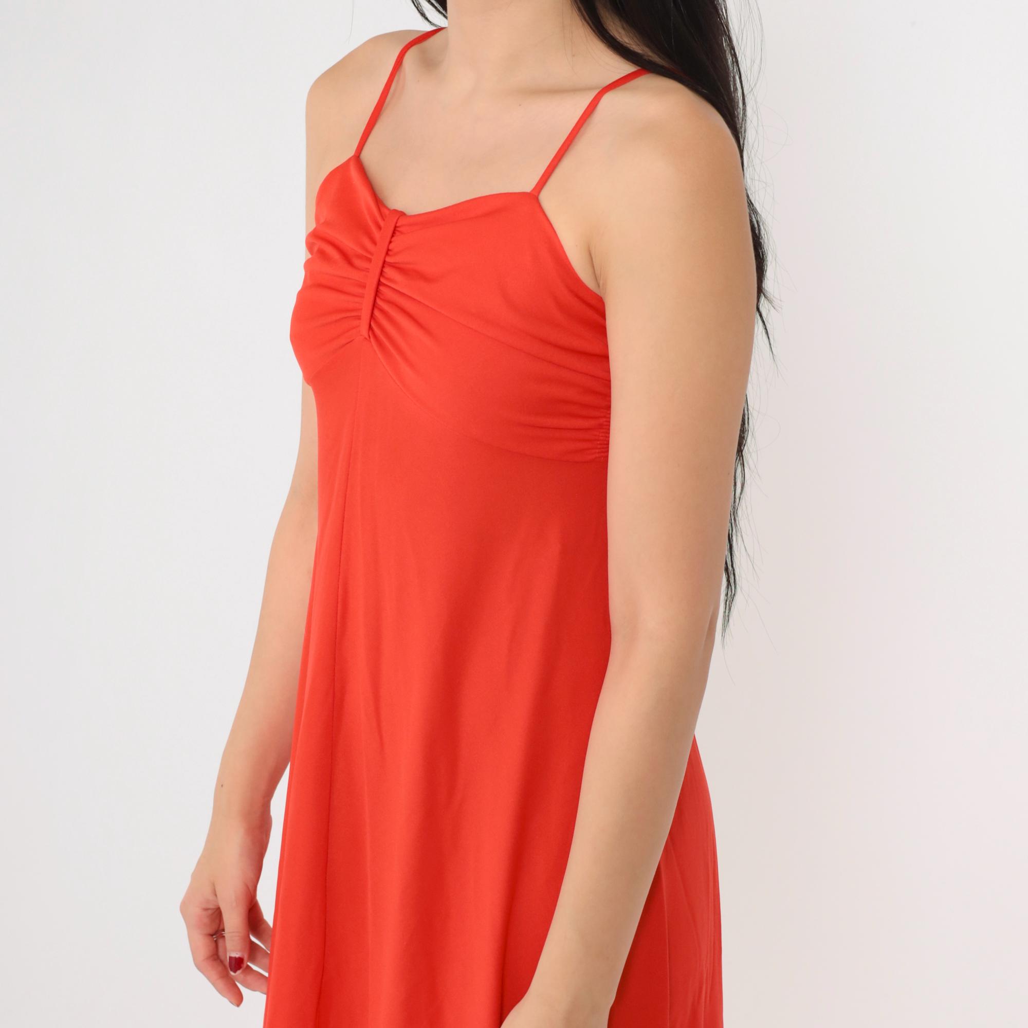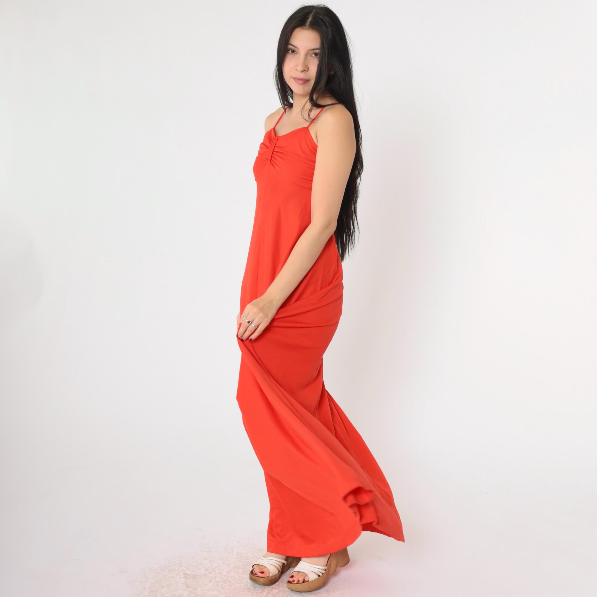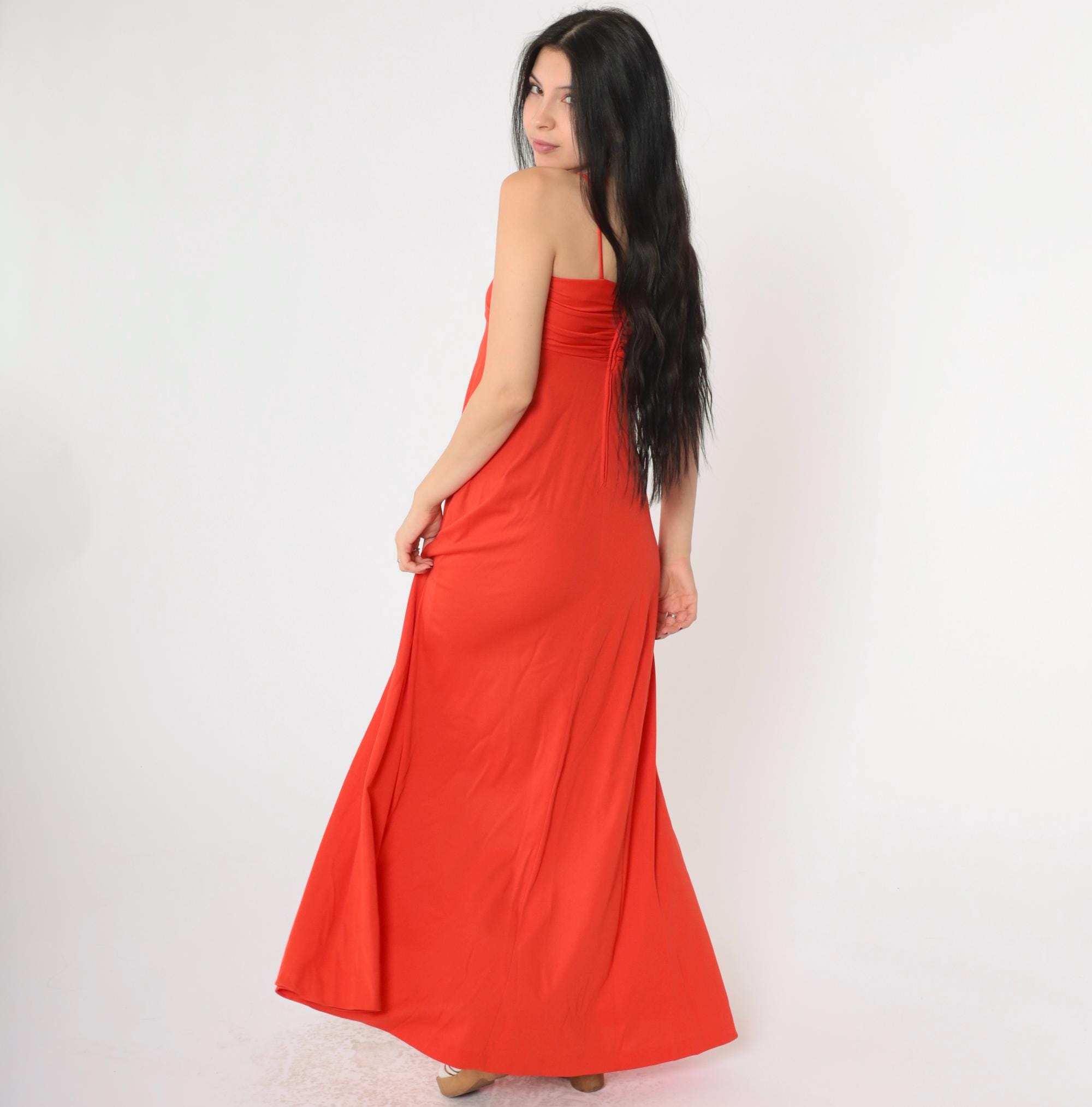 Vintage 70s maxi dress in red with a gathered bodice and an empire waist. It has spaghetti straps and a long flowing skirt. Maxi length.