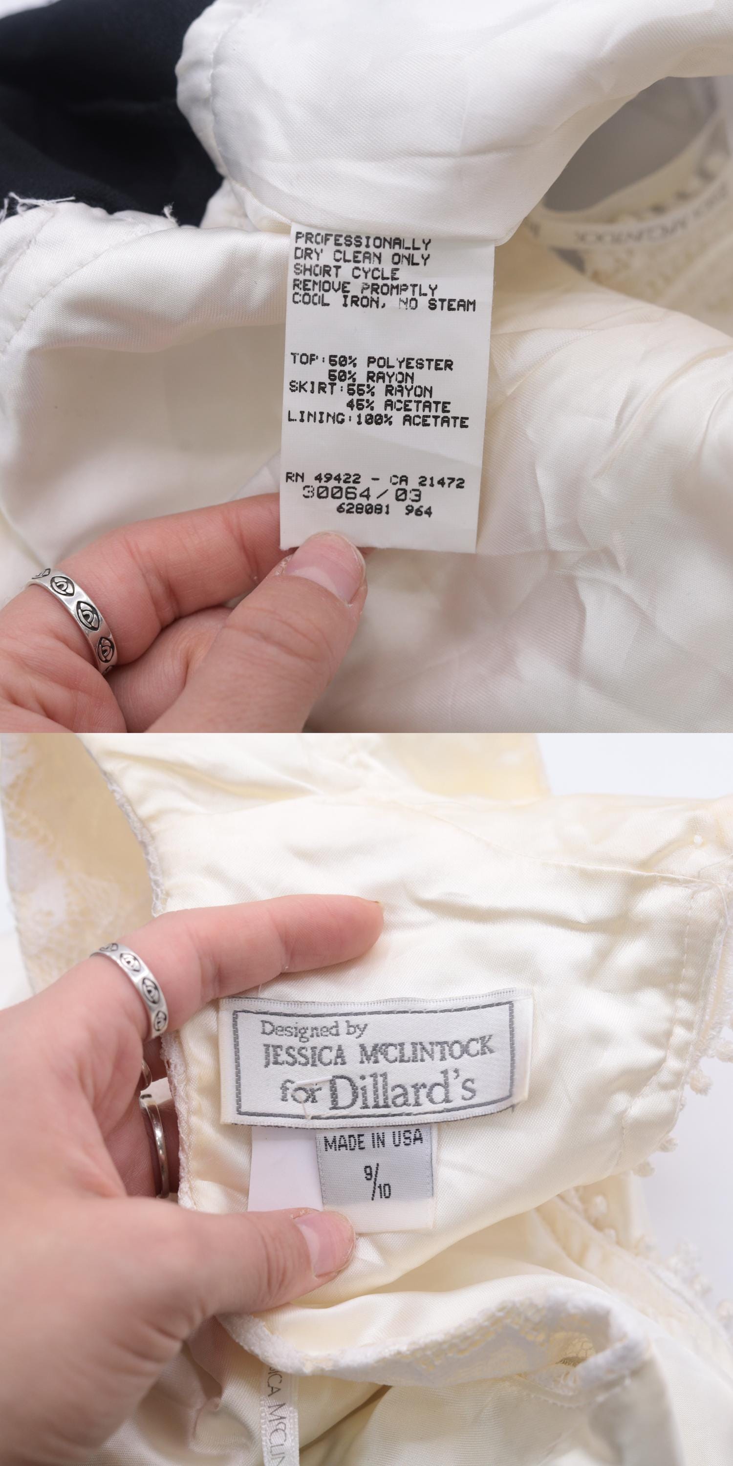 Material: top 50 Polyester 50 Rayon skirt 55 Rayon 45 Acetate lining 100 Acetate