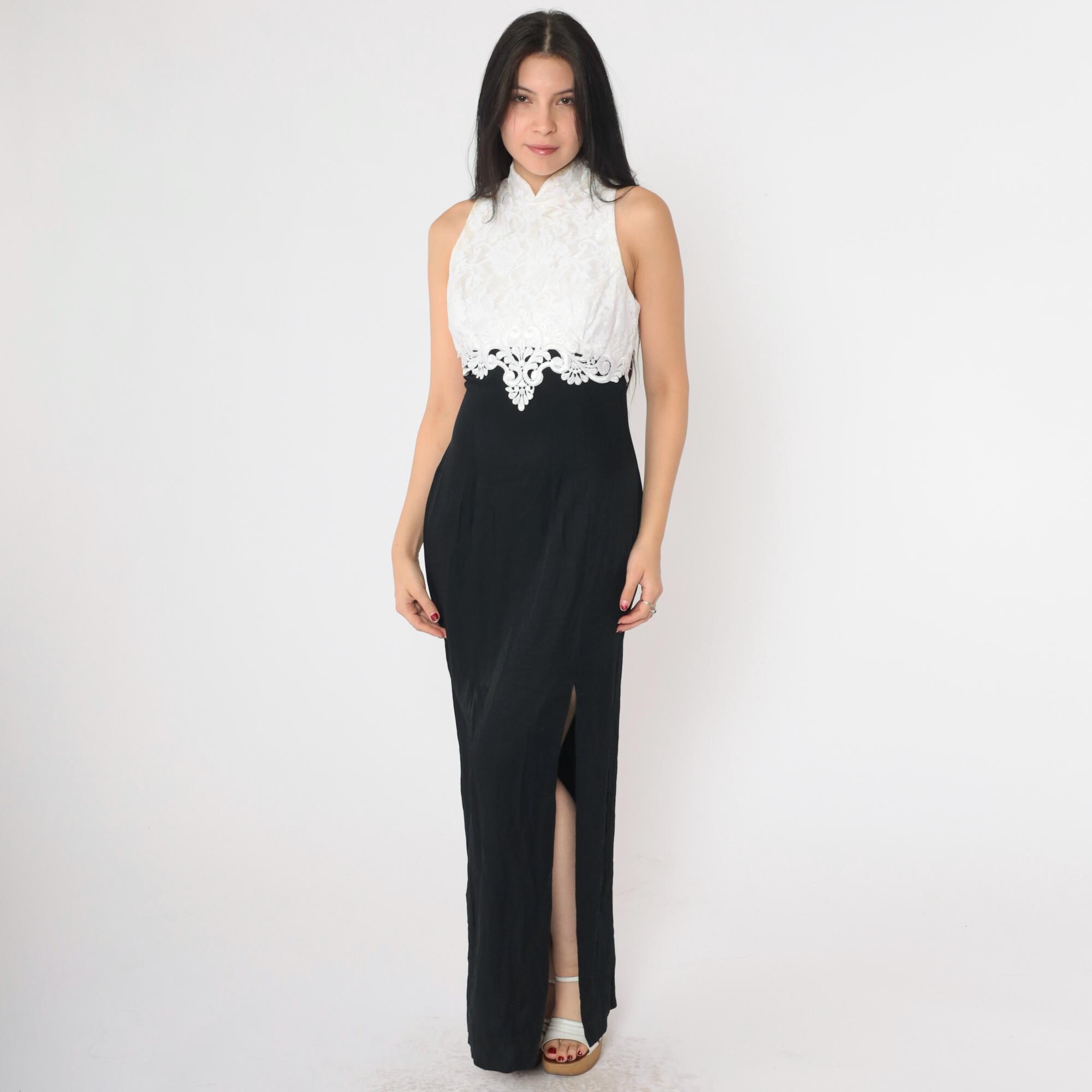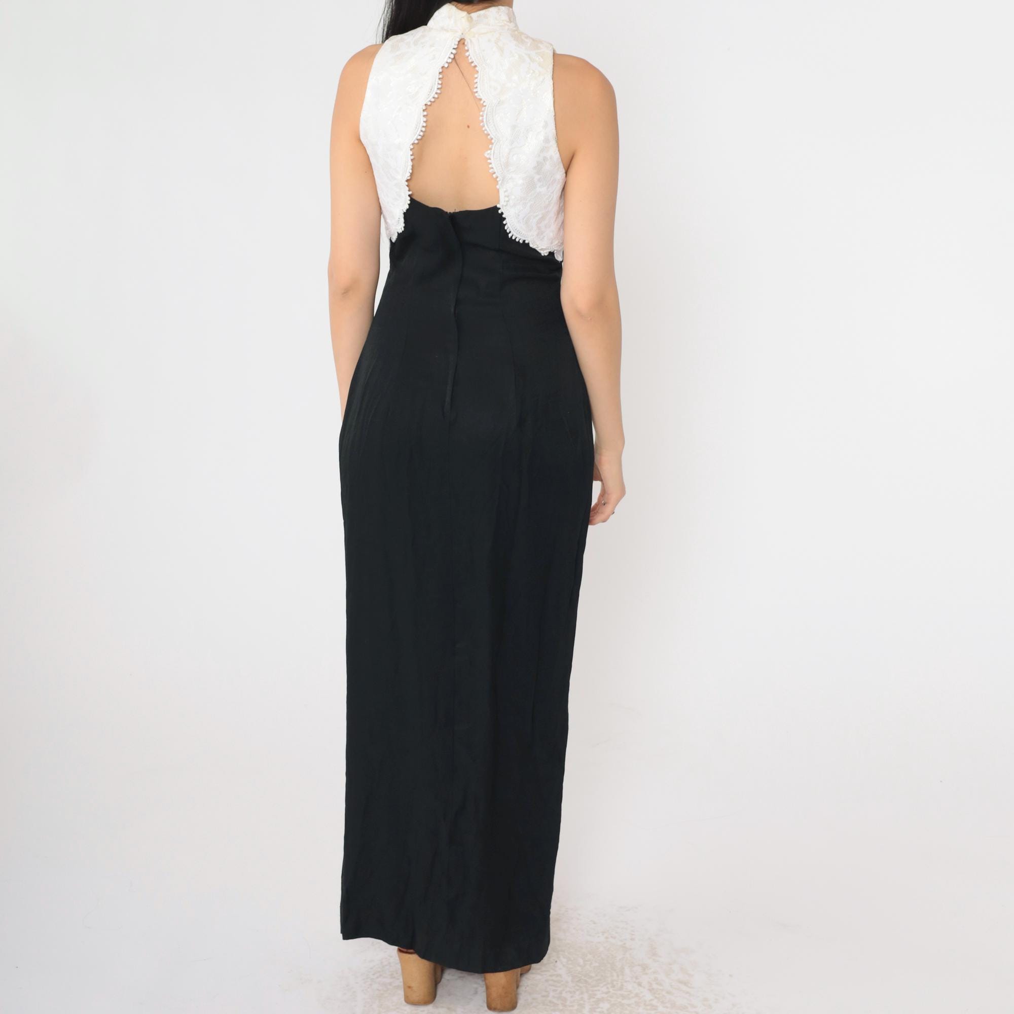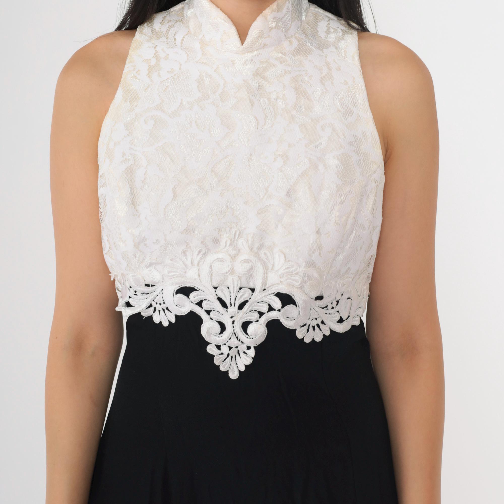 Vintage 80s 90s Jessica McClintock evening dress in classic black and white. This maxi dress features a sleeveless design with a high lace neckline and scalloped cutout back. It features an empire waist and a front slit.