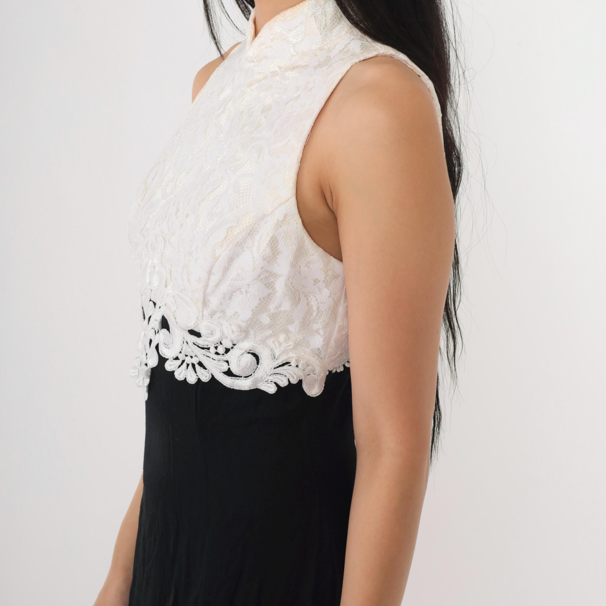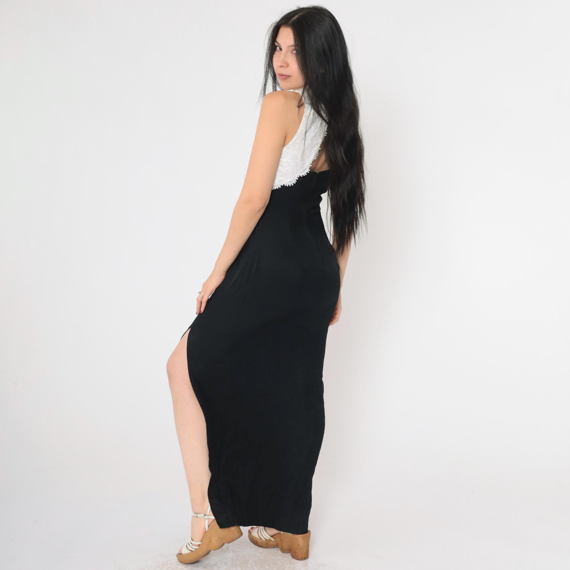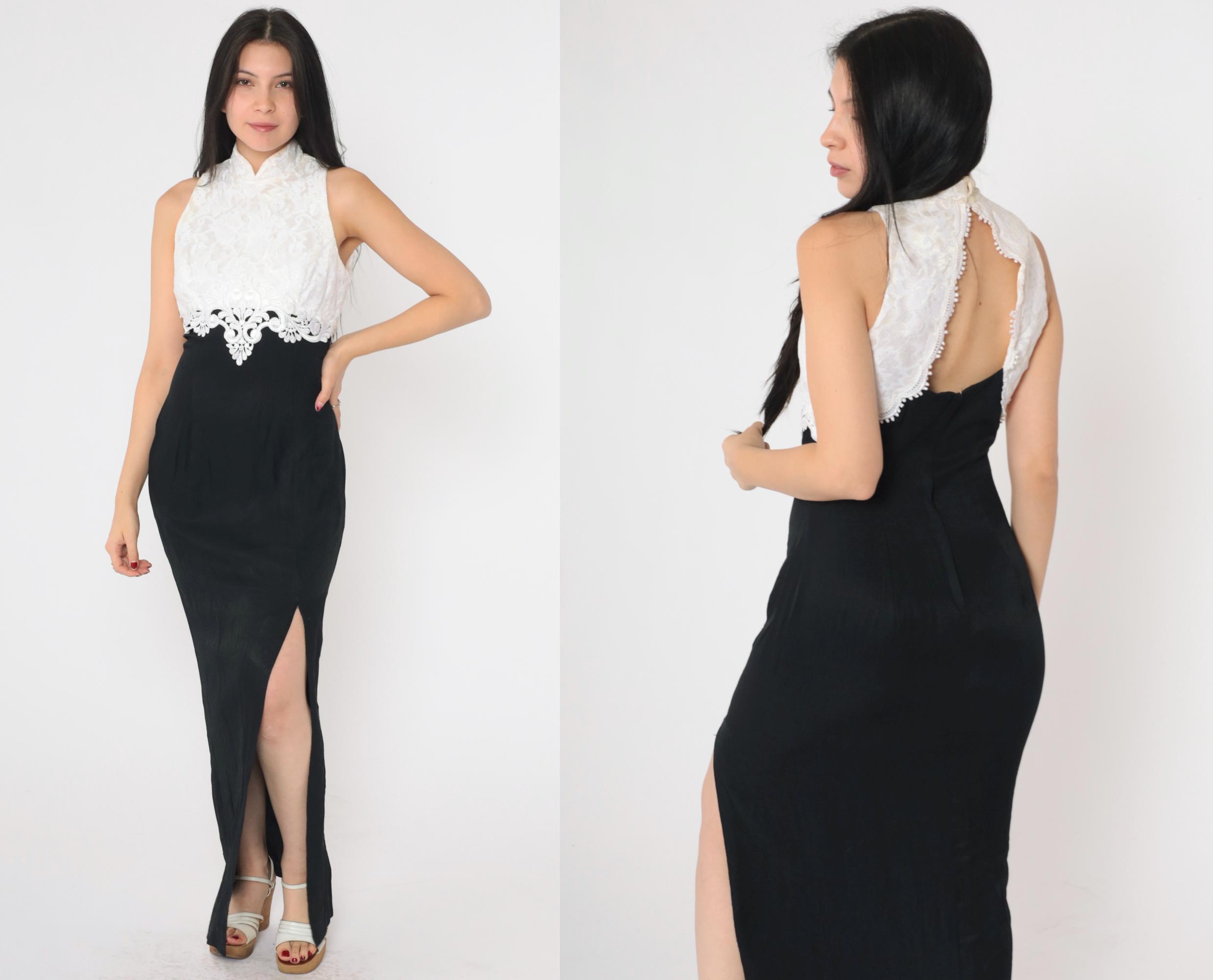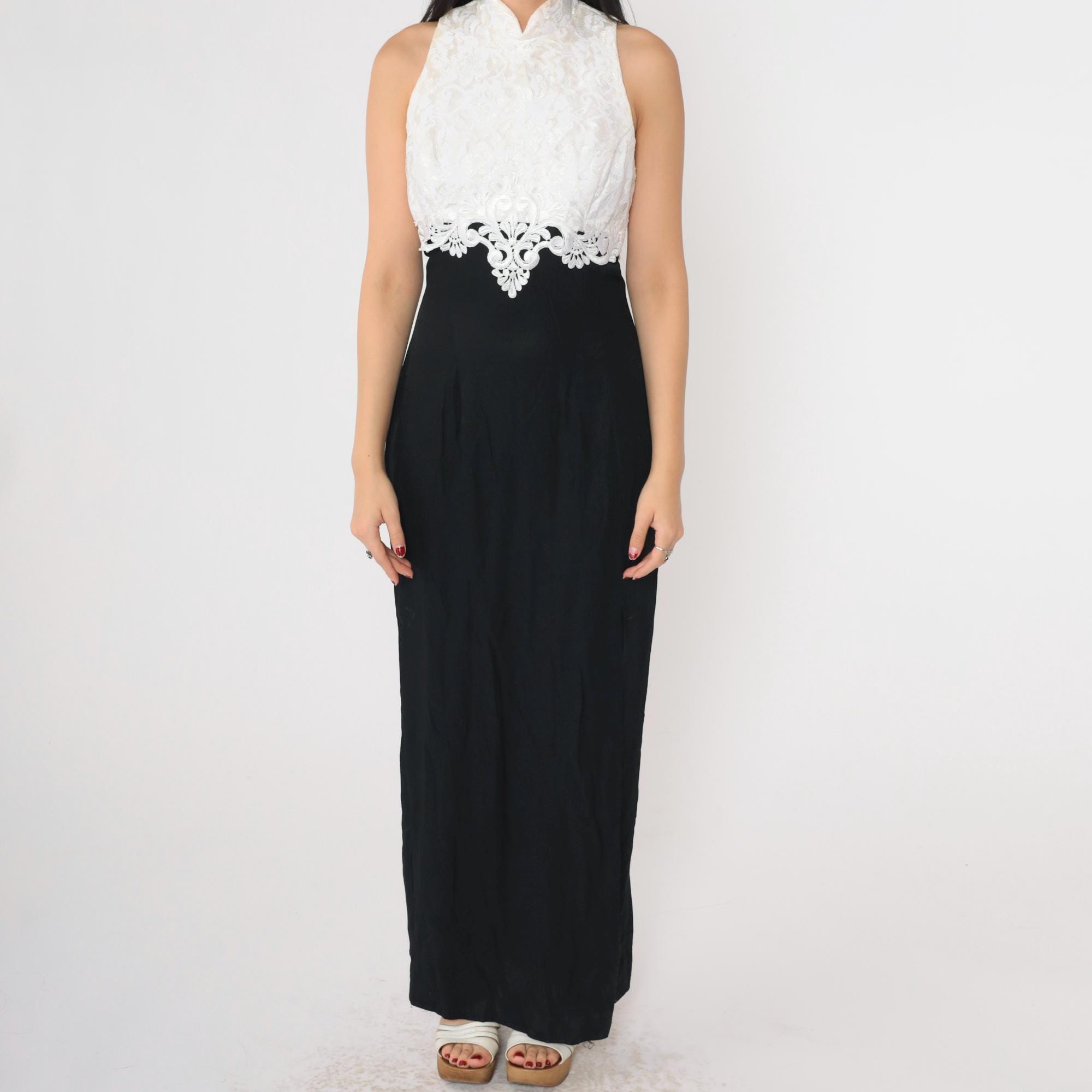 Vintage 80s 90s Jessica McClintock evening dress in classic black and white. This maxi dress features a sleeveless design with a high lace neckline and scalloped cutout back. It features an empire waist and a front slit.