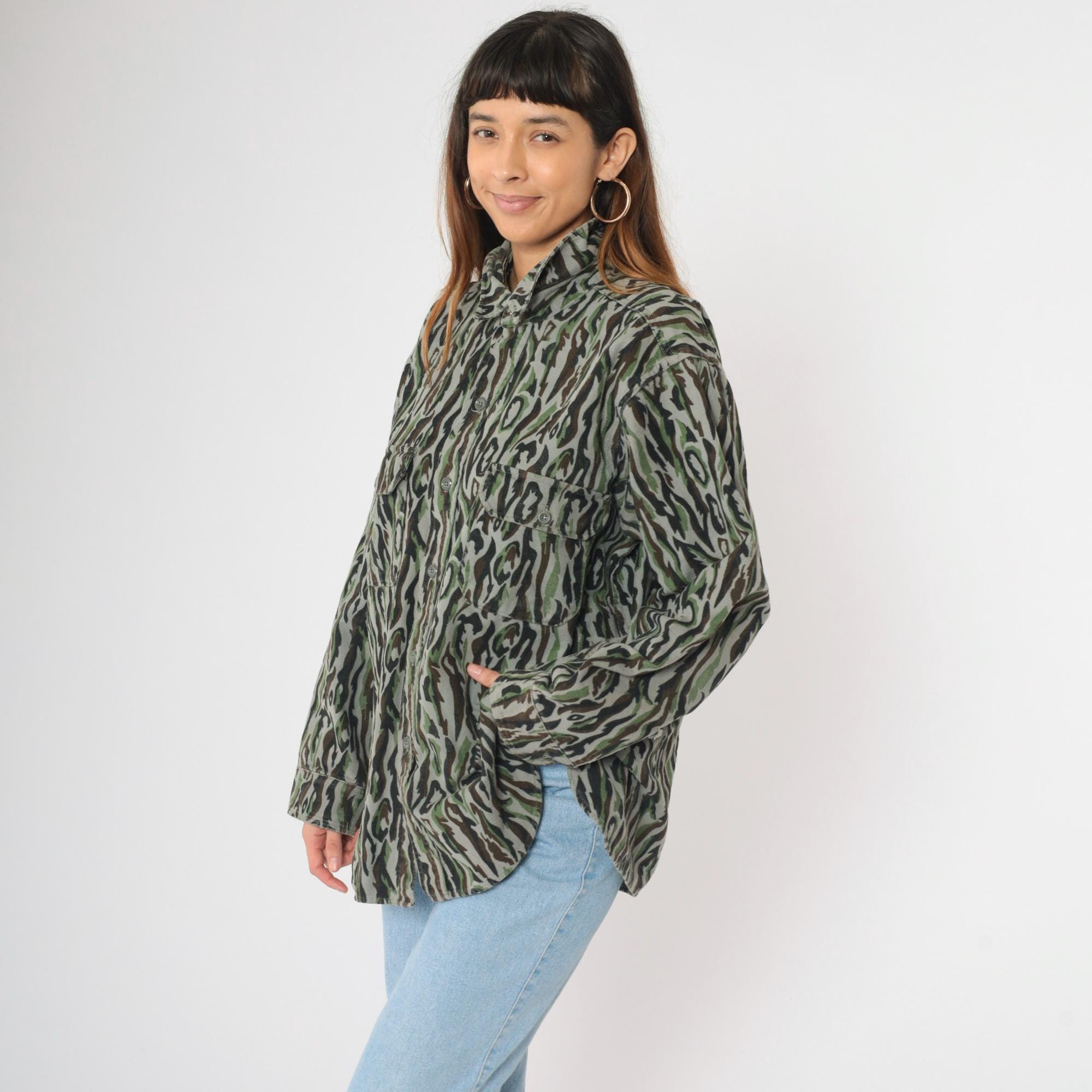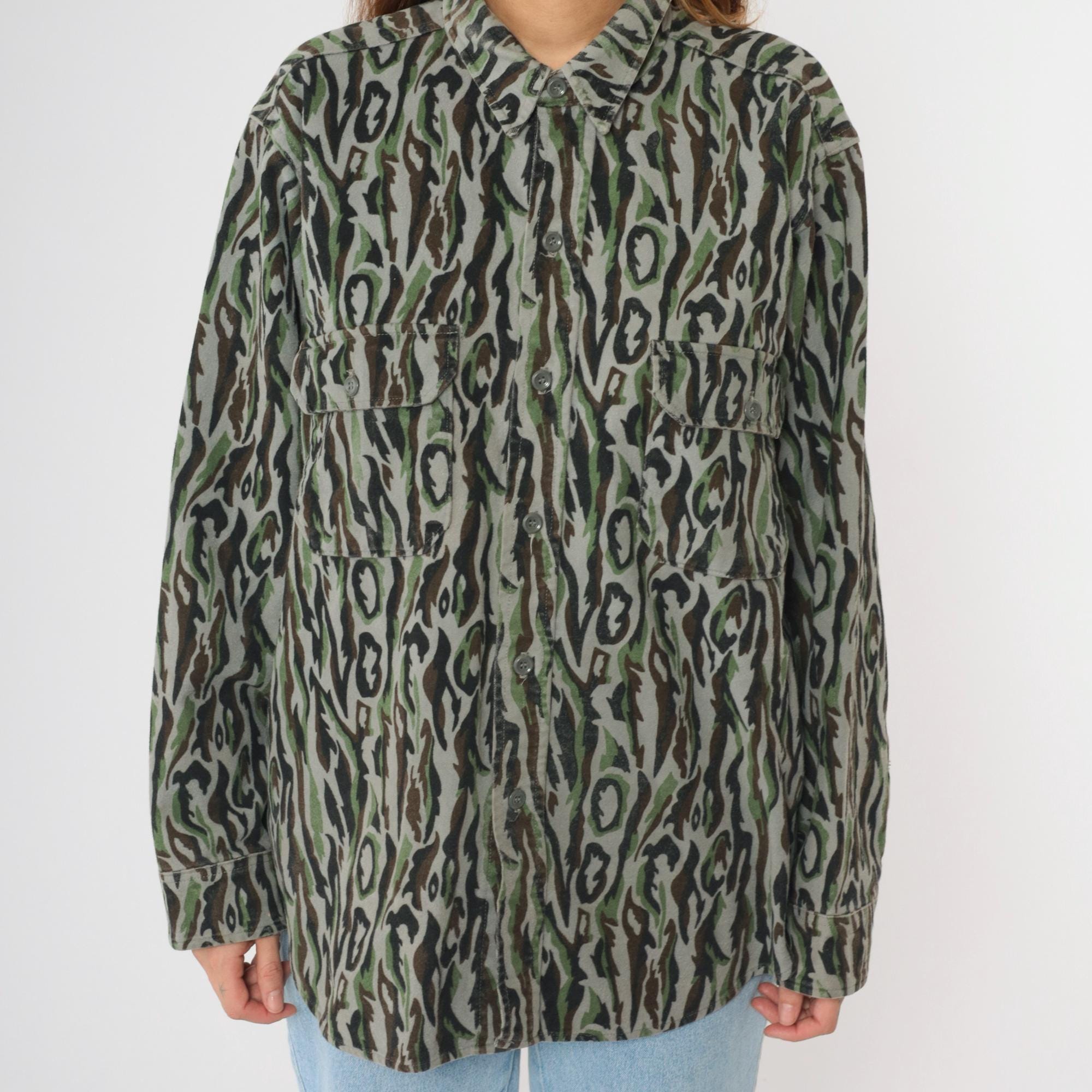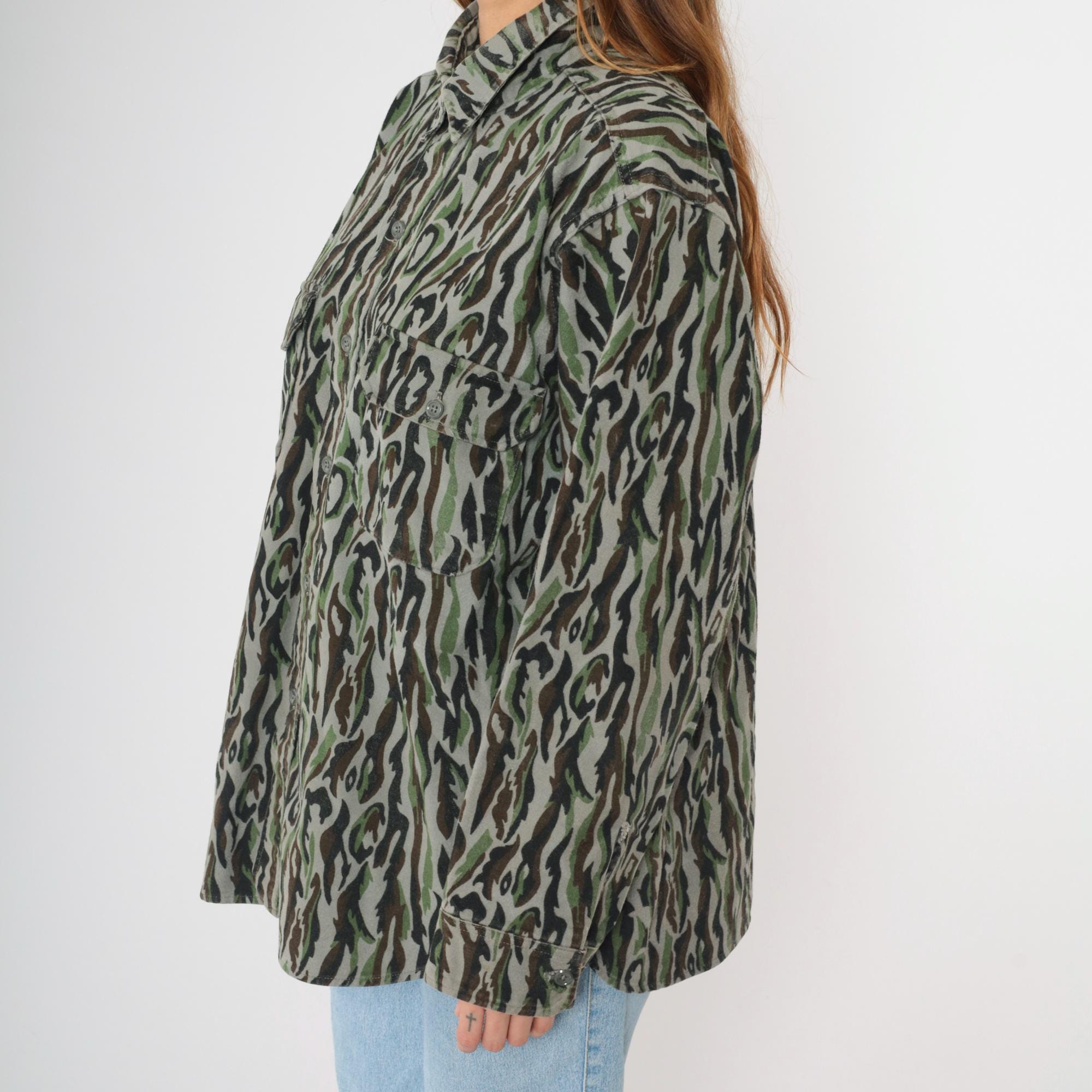 Vintage 90s Woolrich army shirt in camouflage with cargo pockets and buttons up the front. Originally for men.