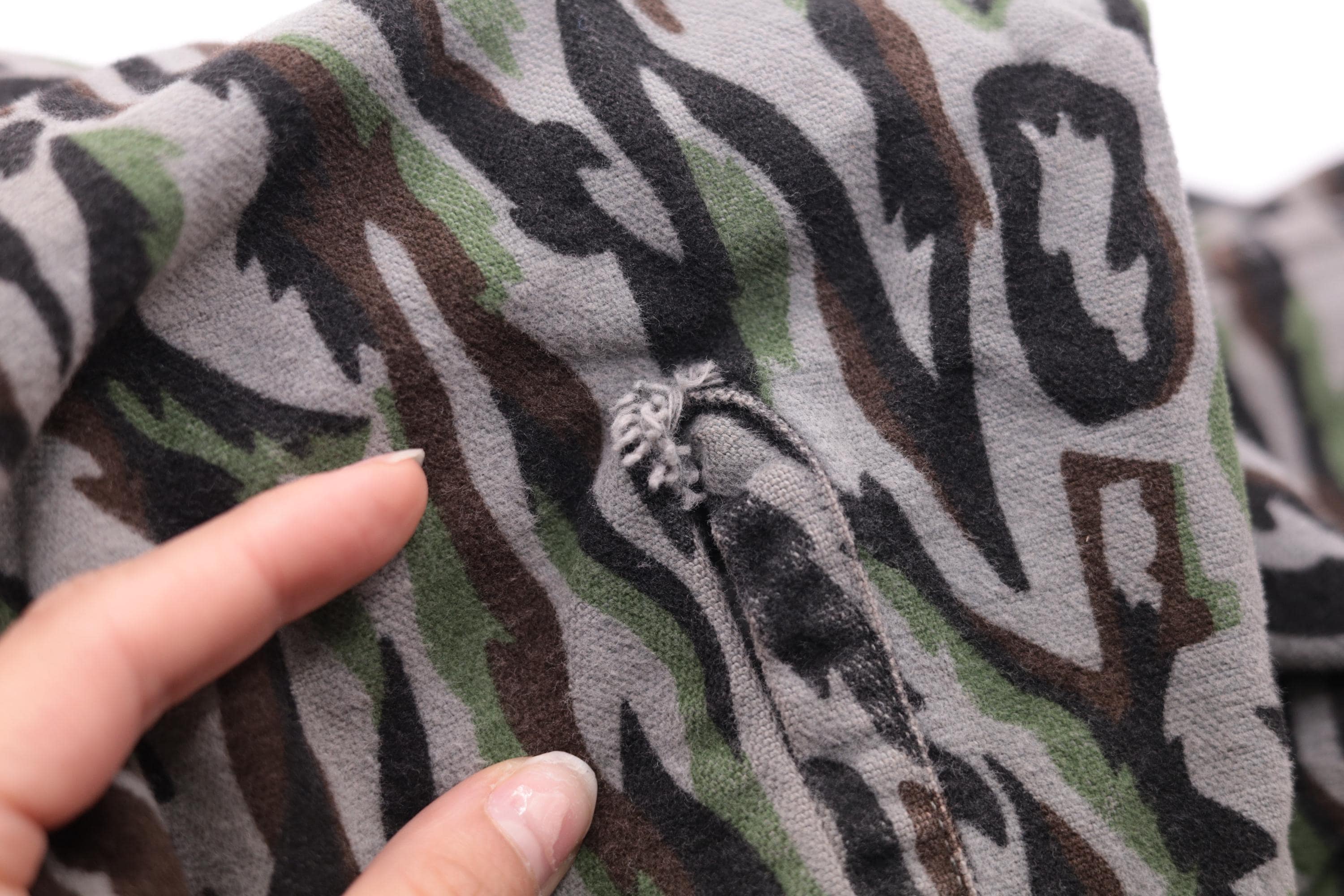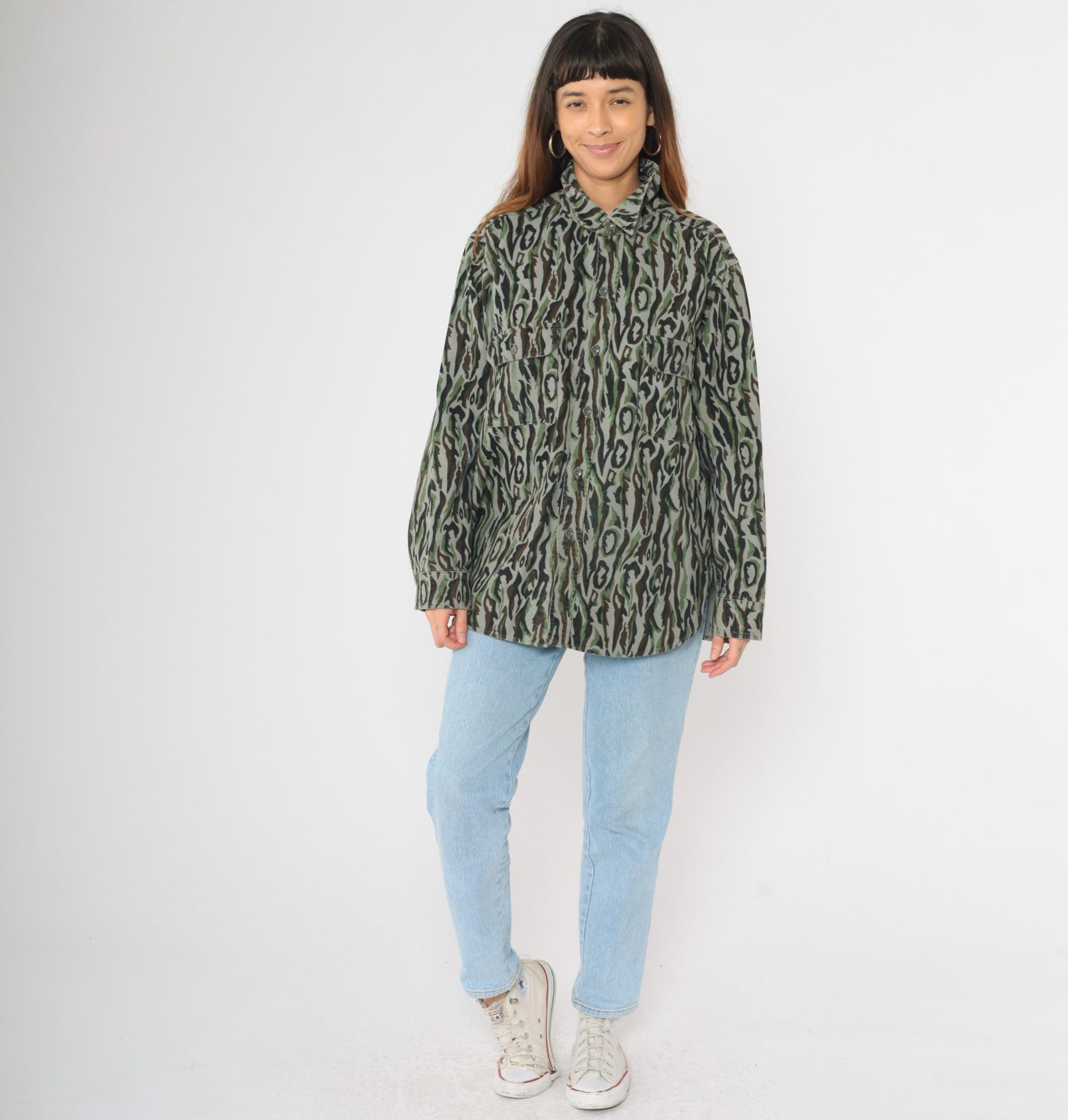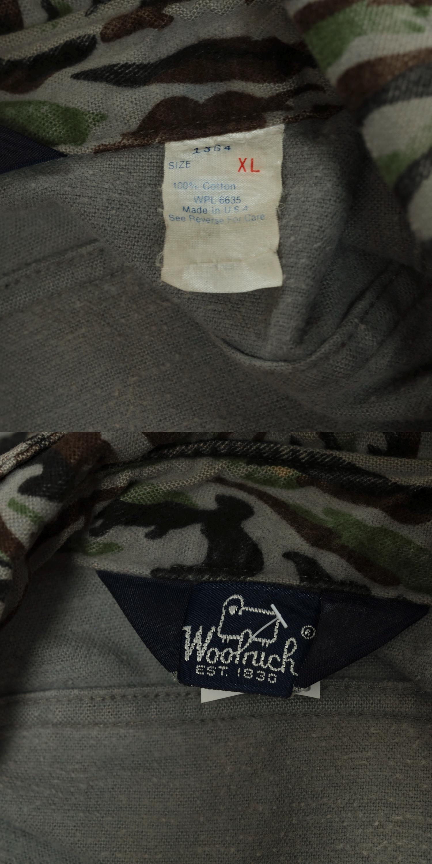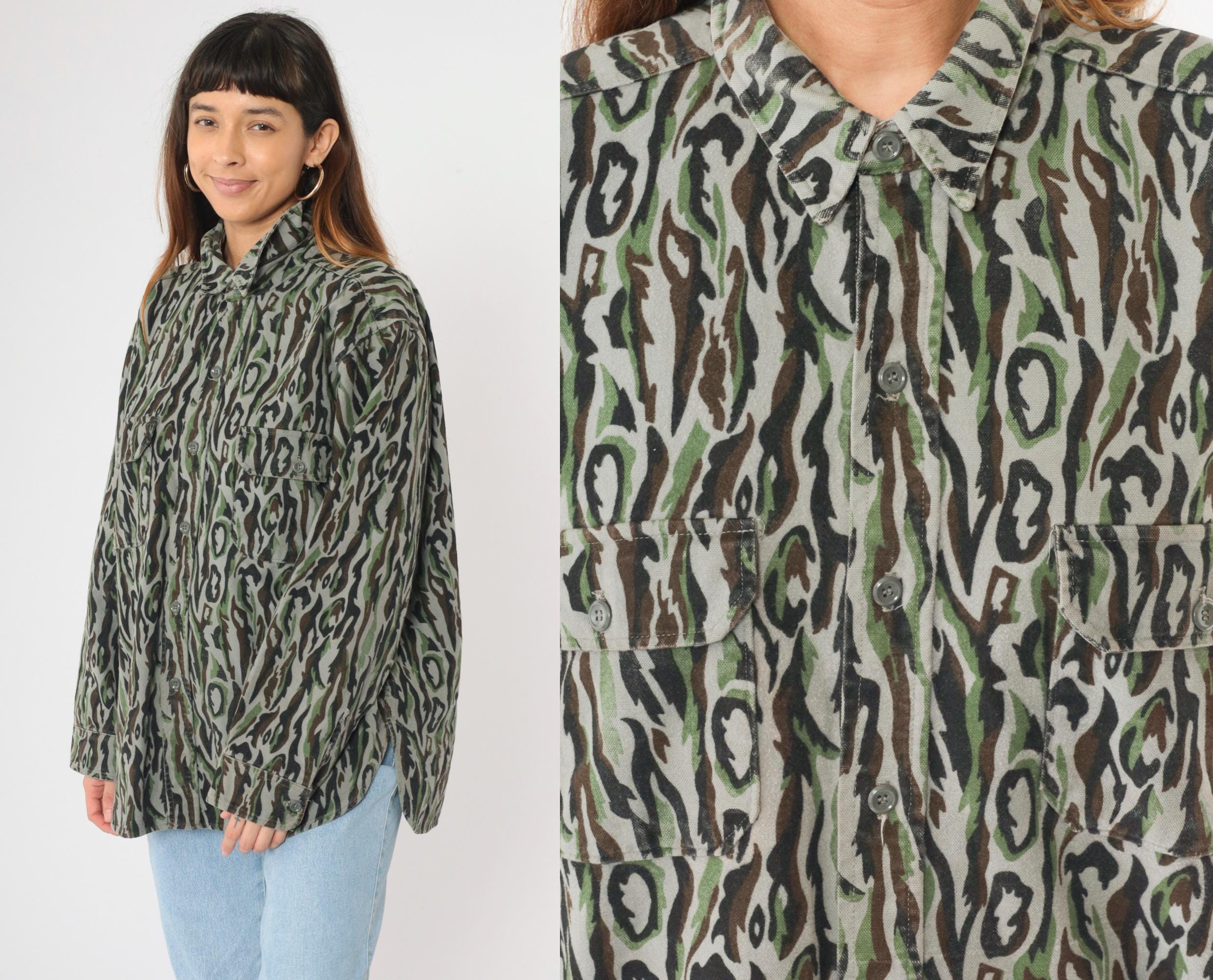 Vintage 90s Woolrich army shirt in camouflage with cargo pockets and buttons up the front. Originally for men.
