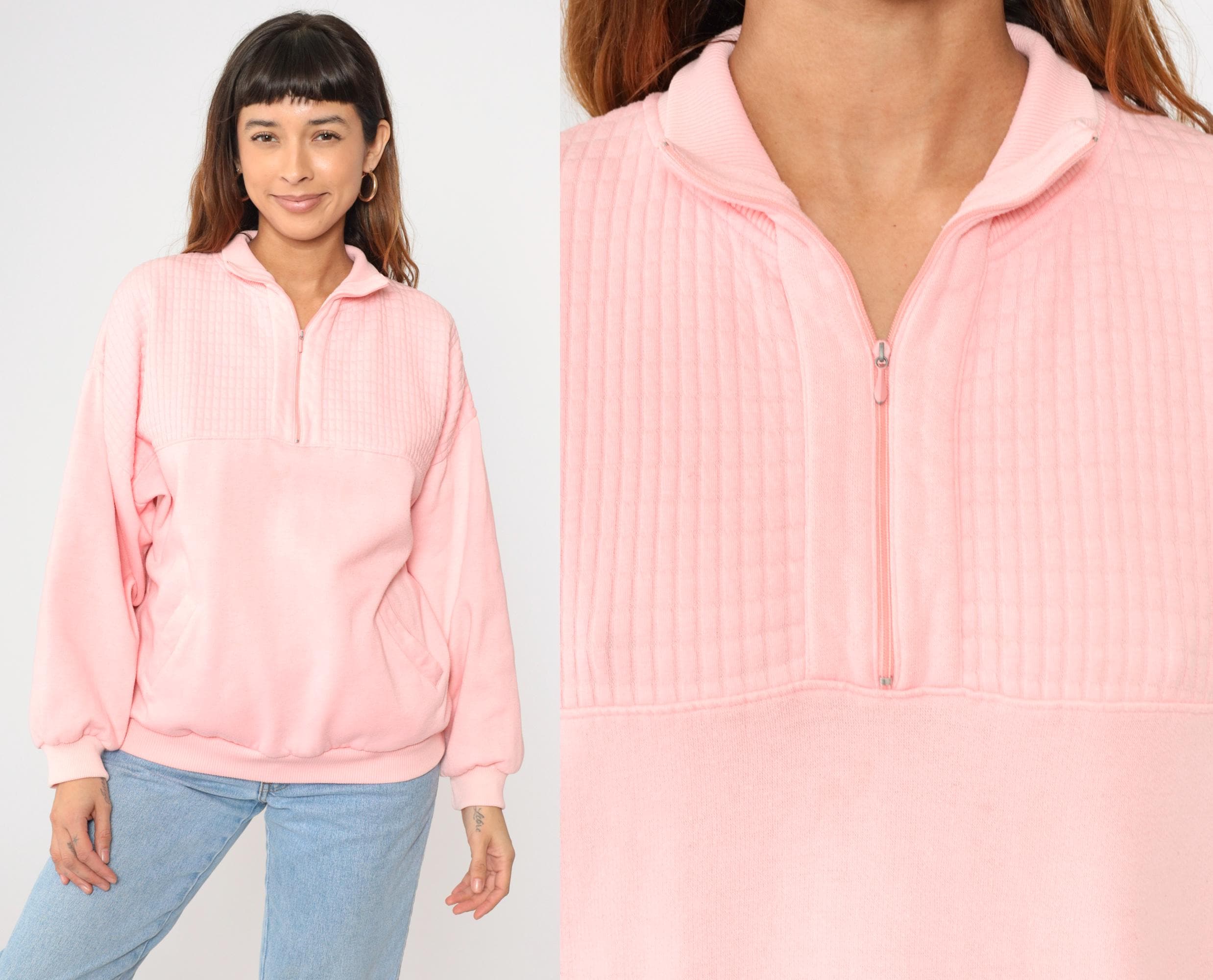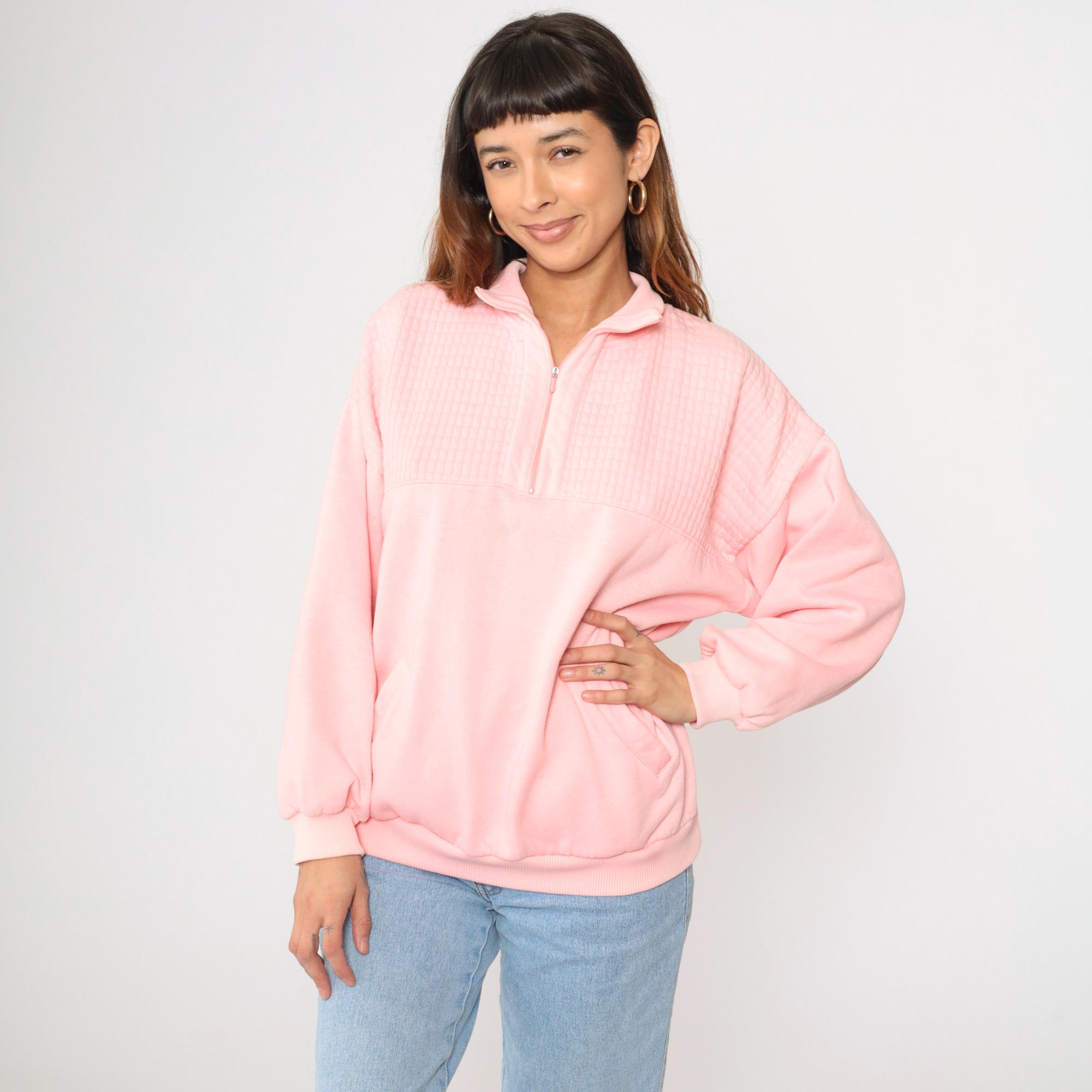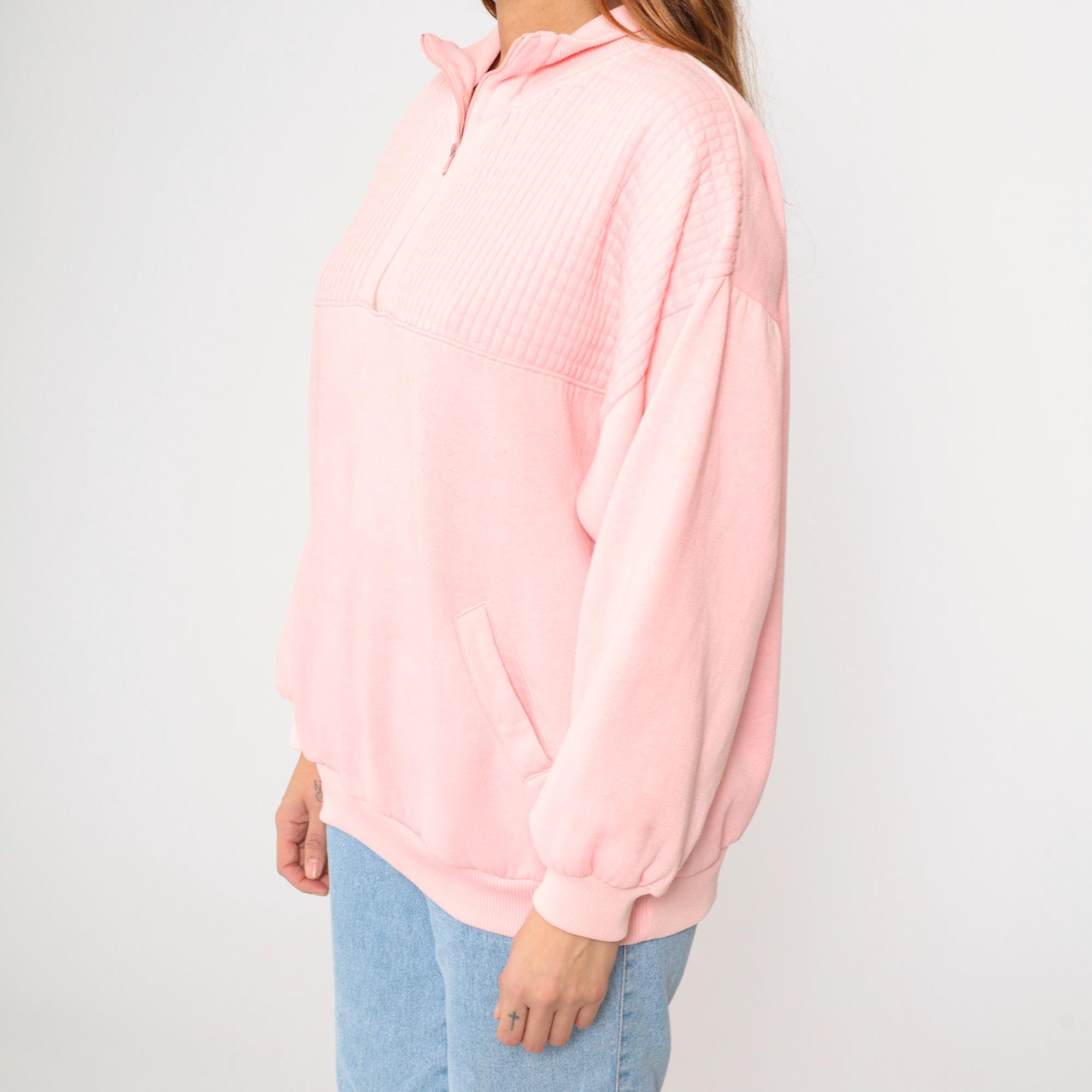Vintage 90s sweatshirt in baby pink with a quarter zip and a collar.