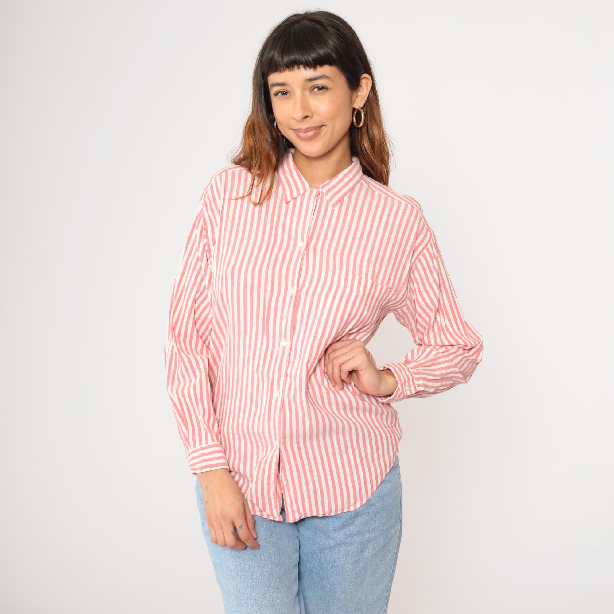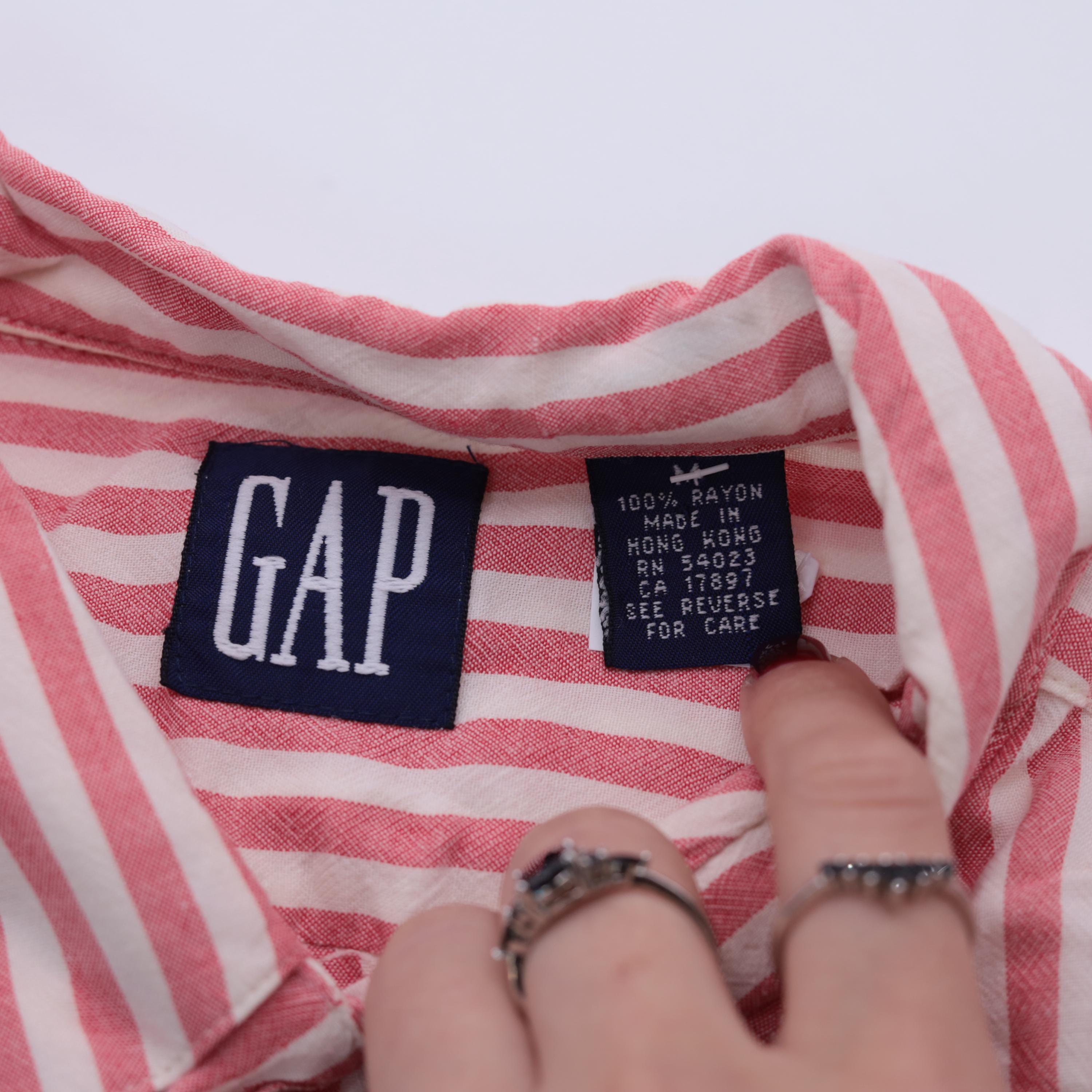Vintage 90s Gap shirt in pink and white stripes with a chest pocket. It has long sleeves and buttons up the front.