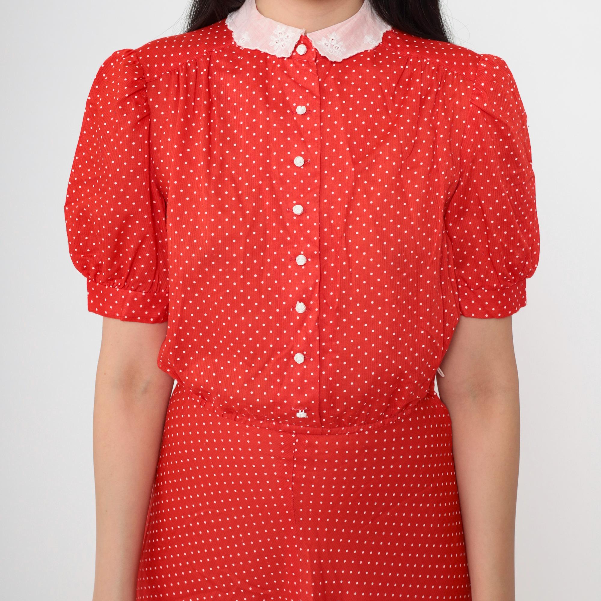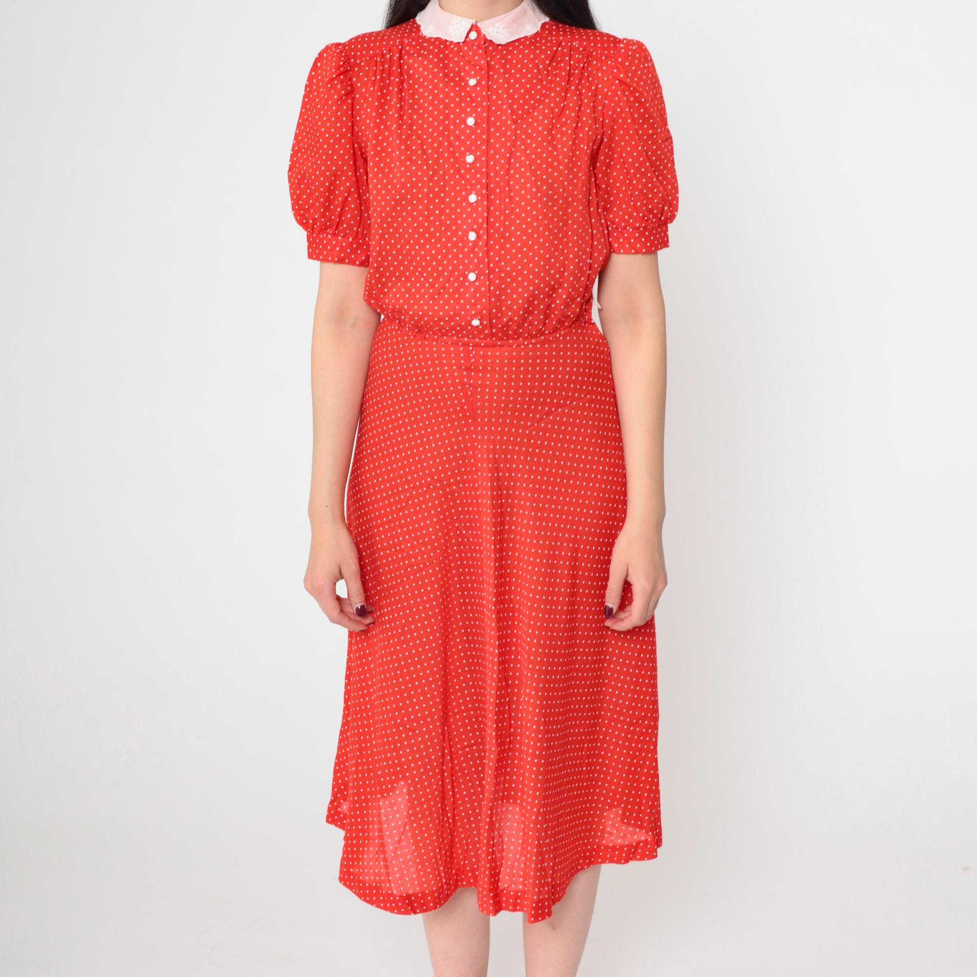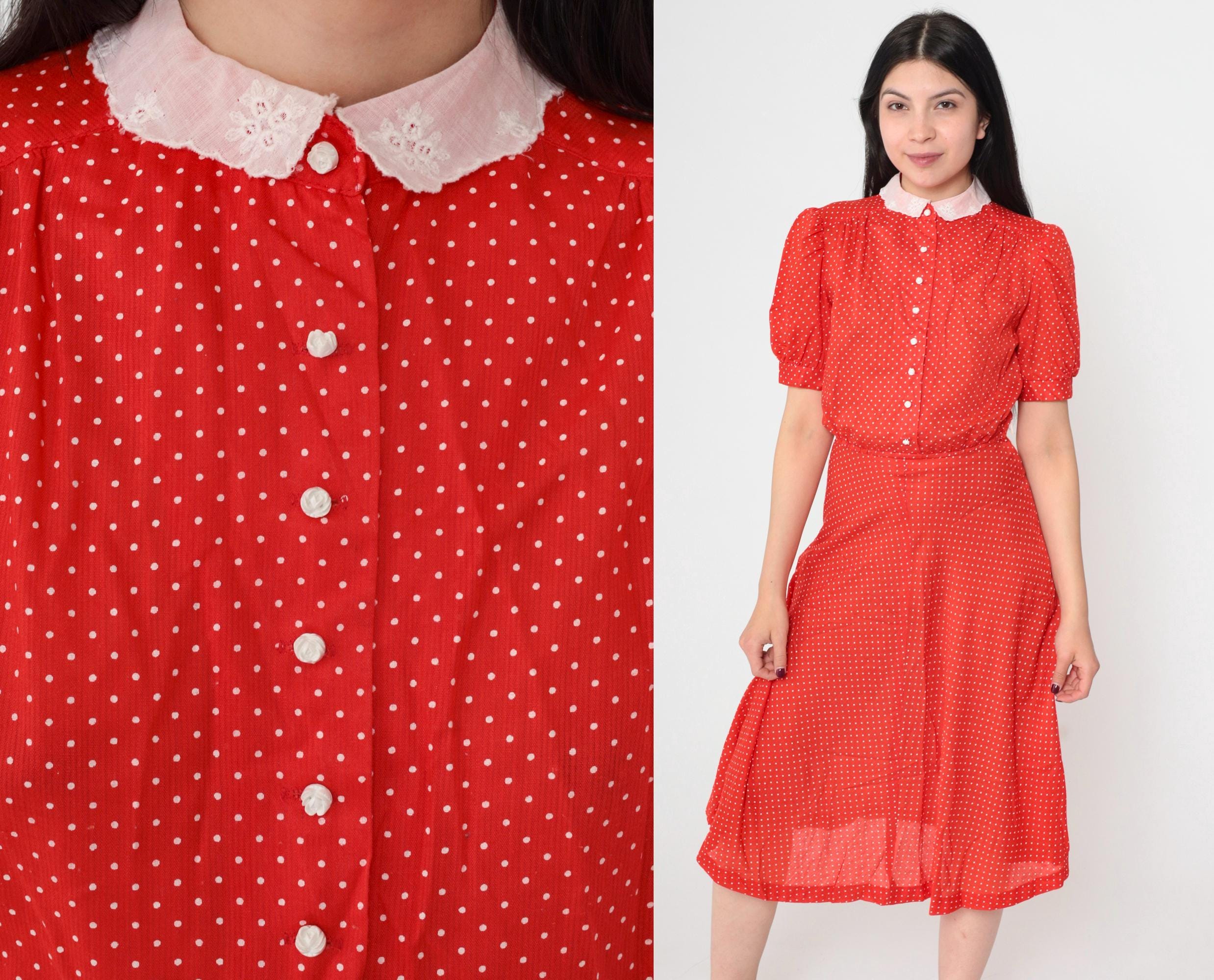 Vintage 80s dress with a red polka dot print with a white embroidered collar. It features floral buttons up the front and a high waist. Midi length.