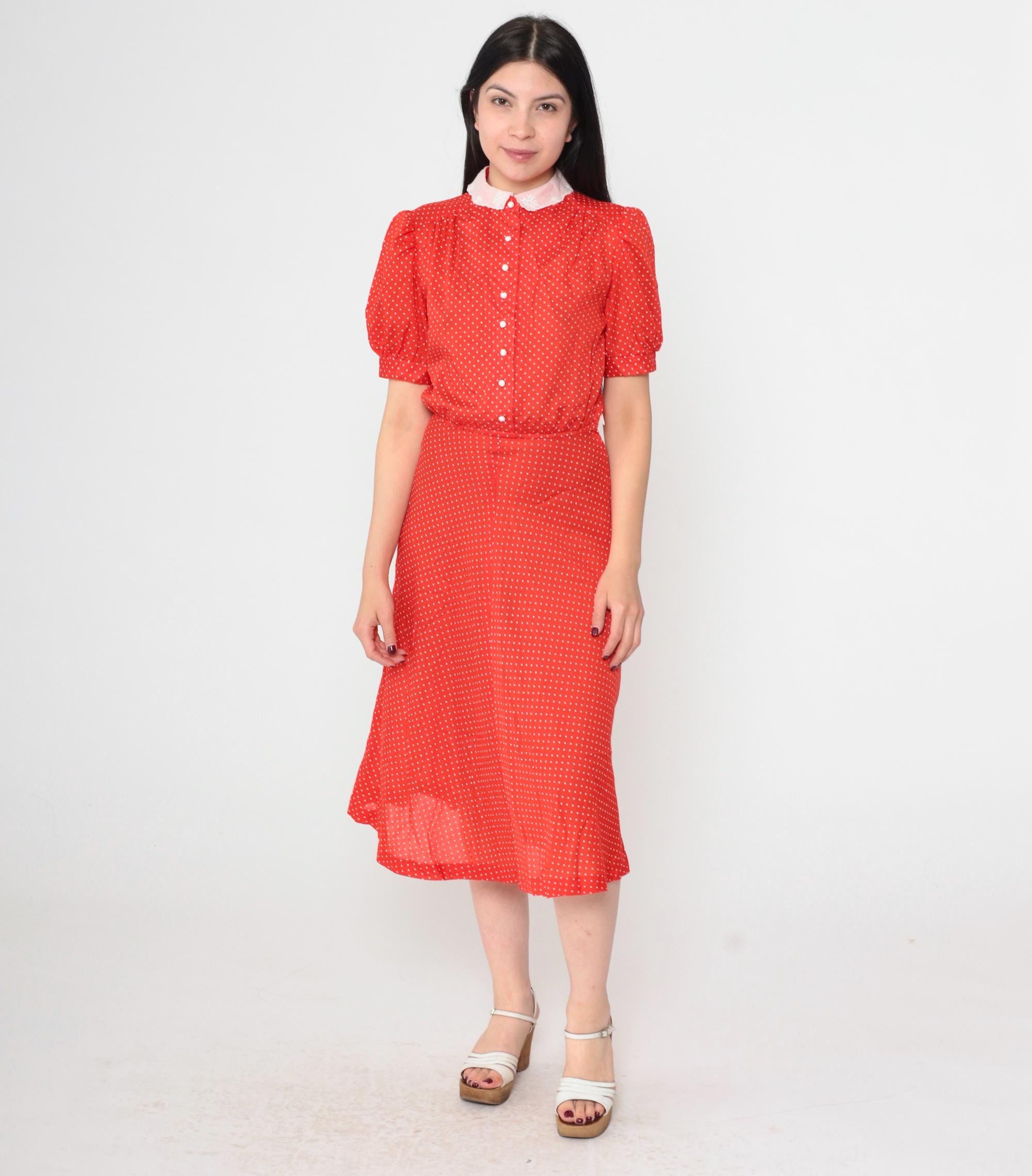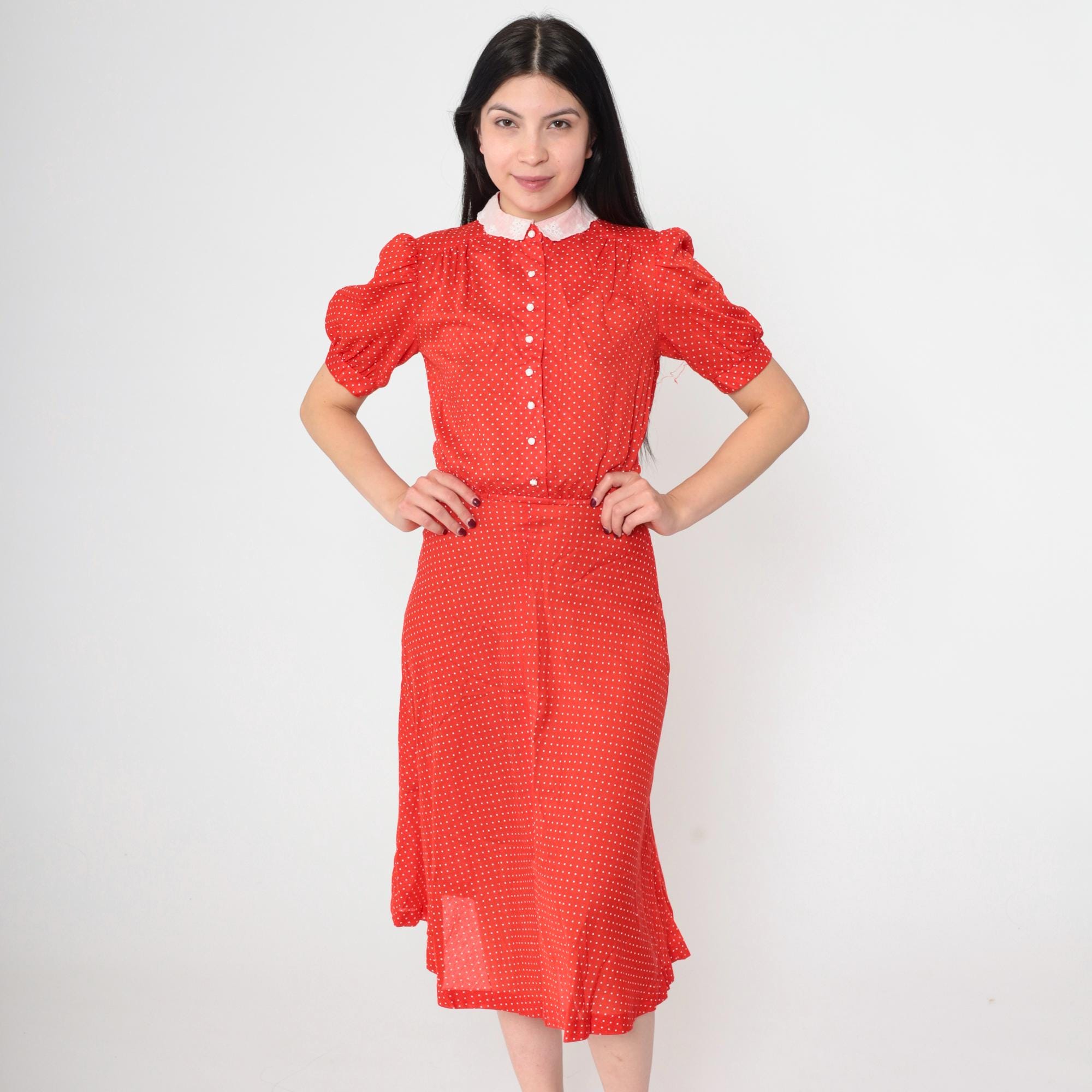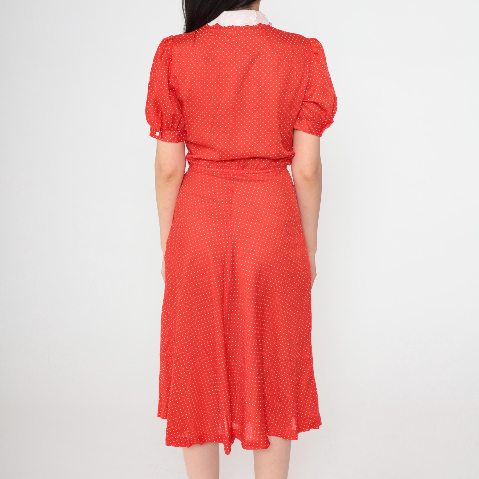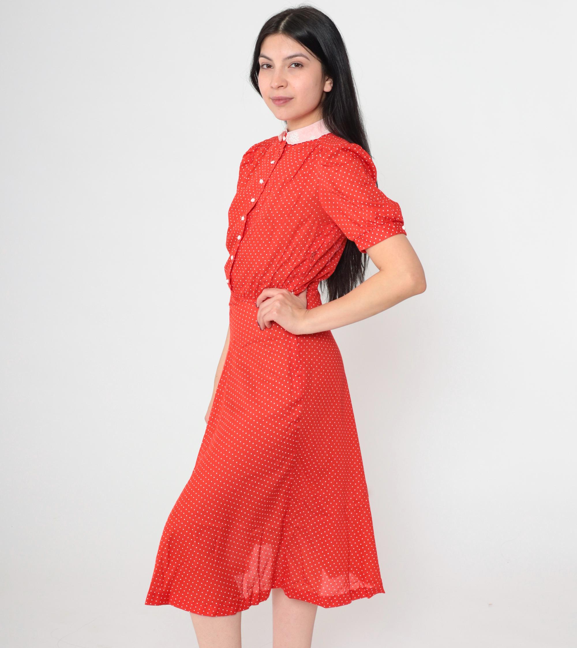 Vintage 80s dress with a red polka dot print with a white embroidered collar. It features floral buttons up the front and a high waist. Midi length.