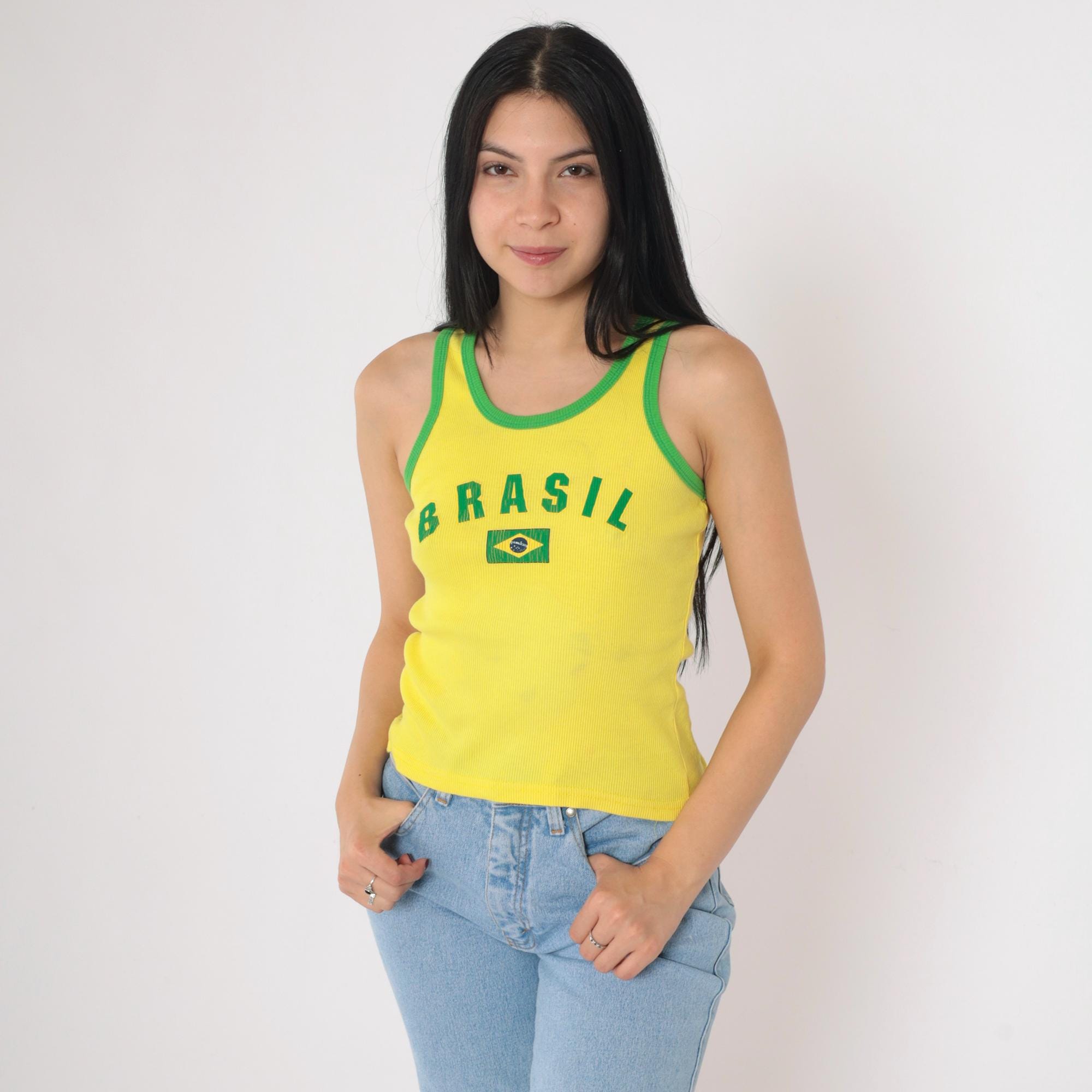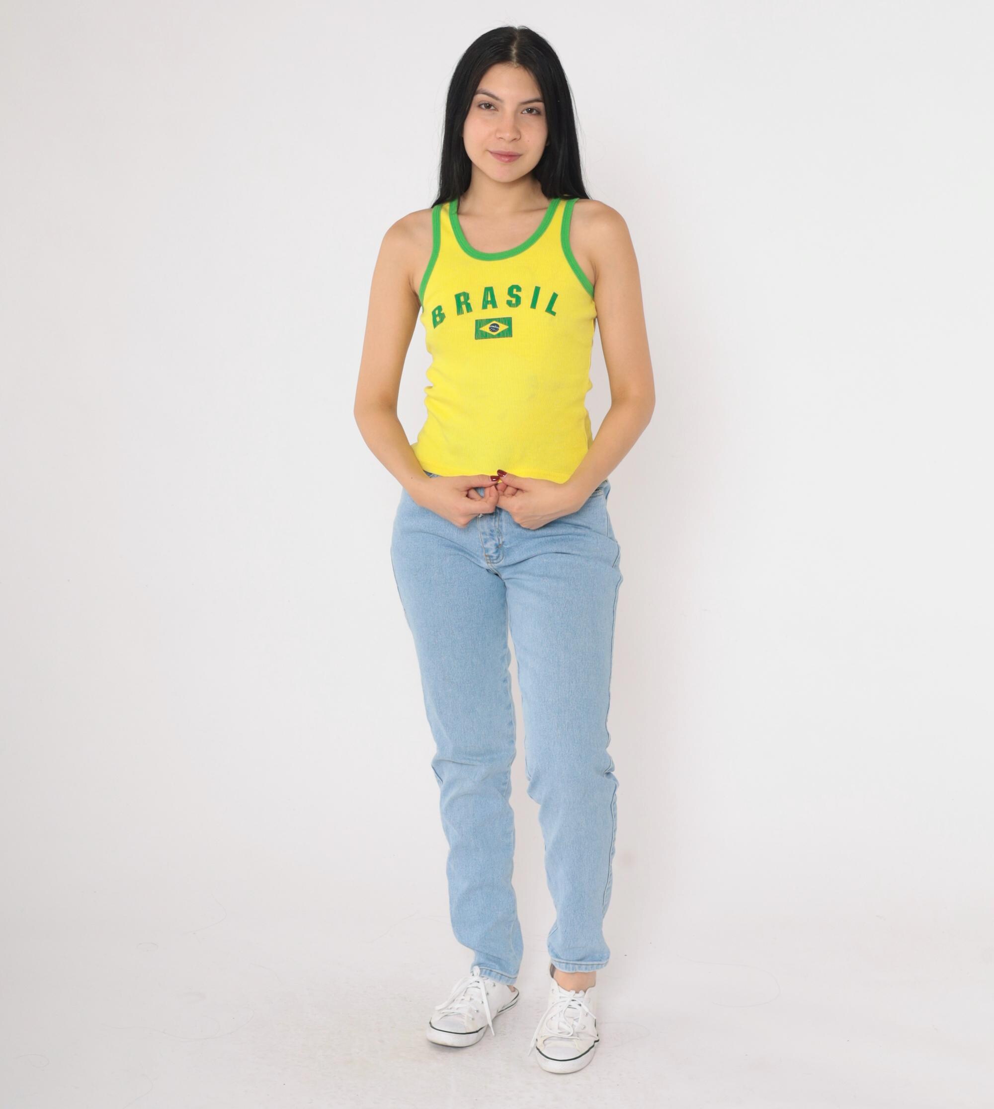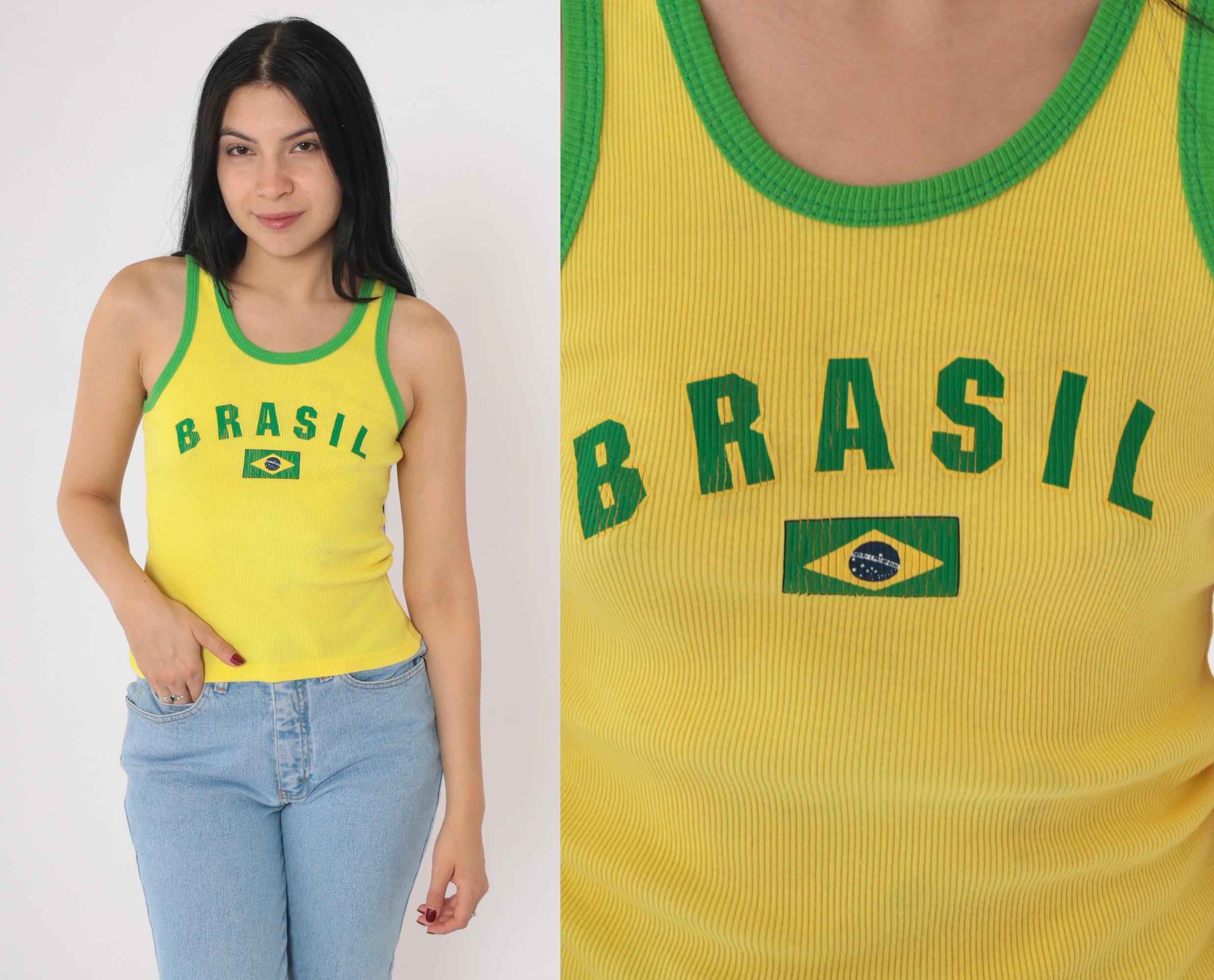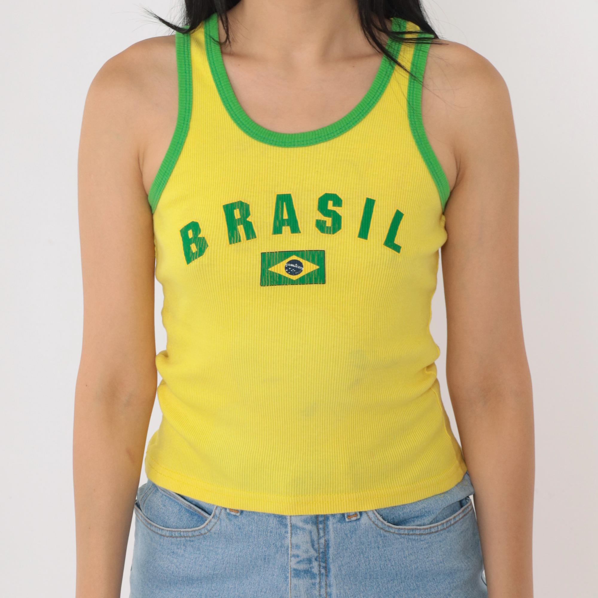 Vintage 90s Brazil tank top in bright yellow with green contrast trim. Features a ribbed knit texture, fitted silhouette, and a classic scoop neckline. The front displays "Brasil" lettering with a Brazilian flag graphic. Made in the USA from 100% cotton.
