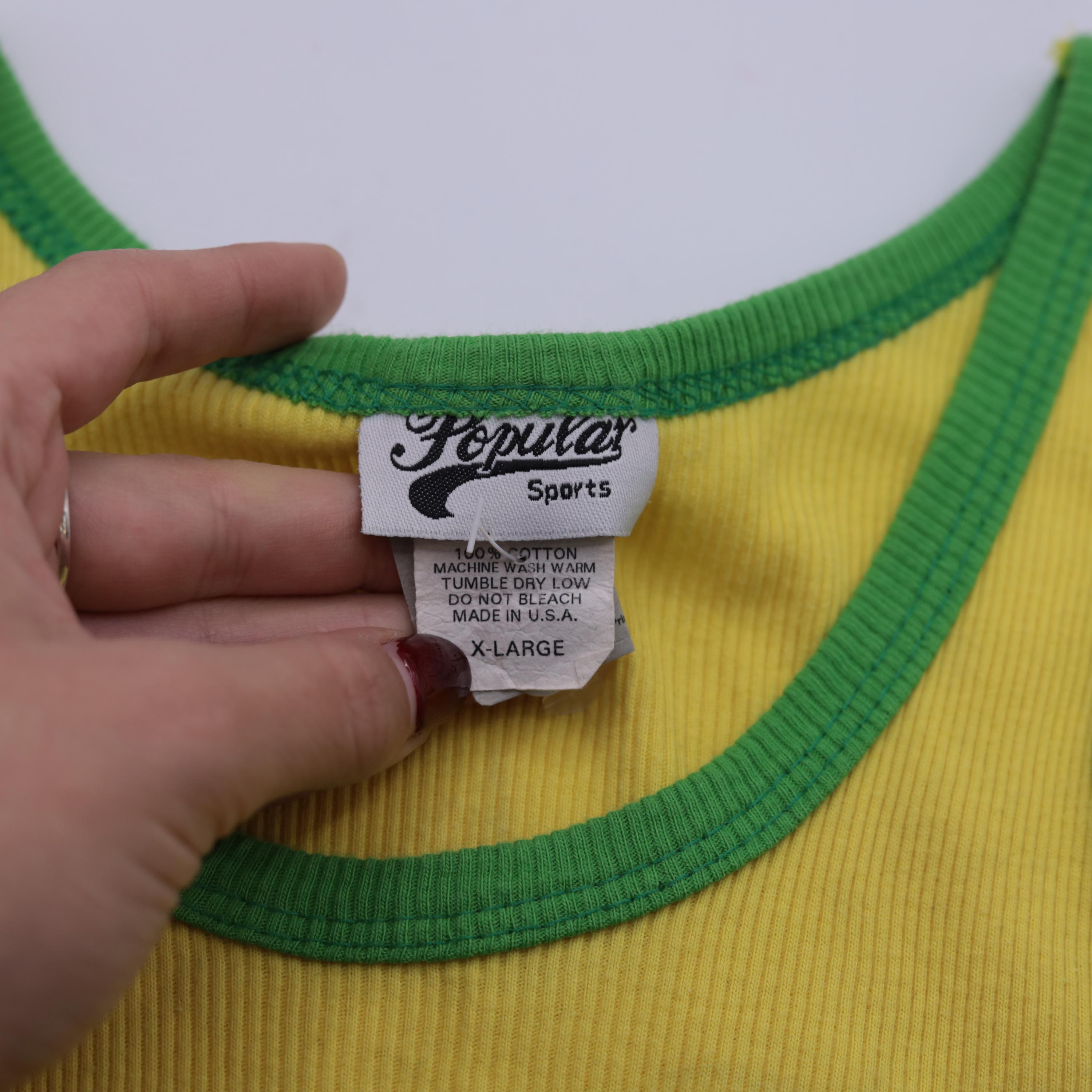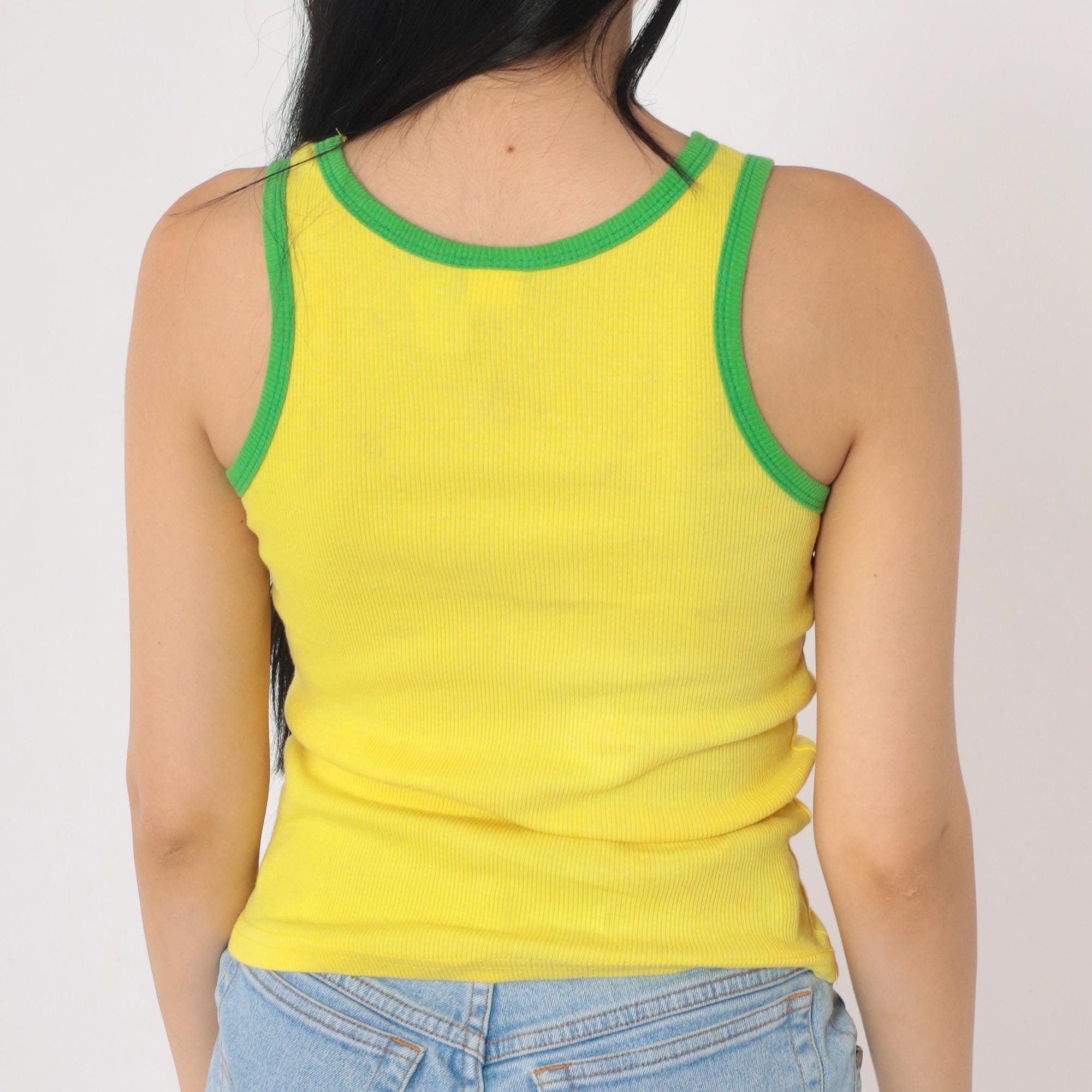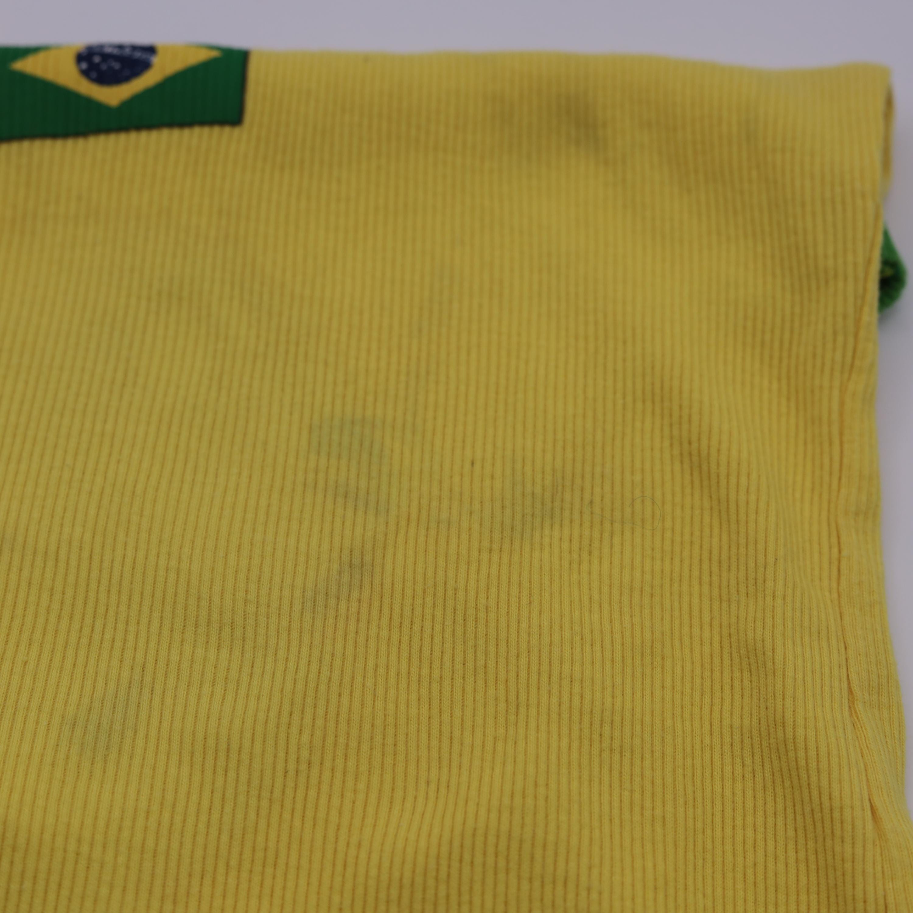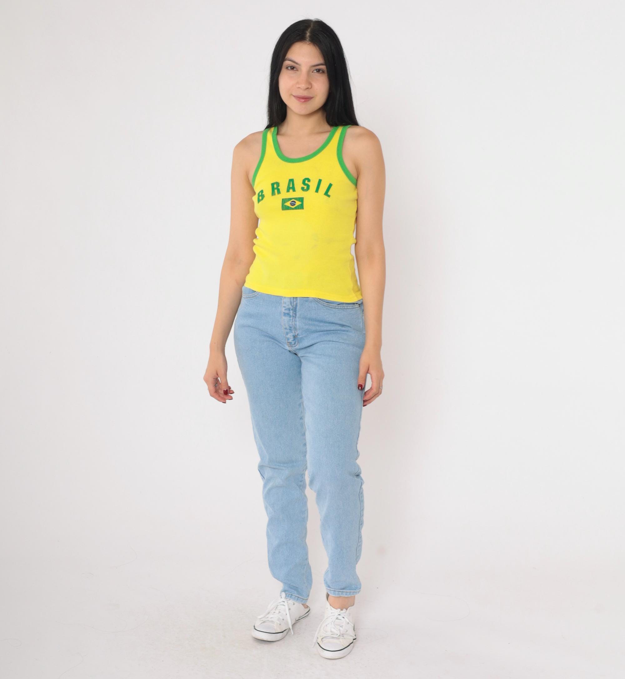 Vintage 90s Brazil tank top in bright yellow with green contrast trim. Features a ribbed knit texture, fitted silhouette, and a classic scoop neckline. The front displays "Brasil" lettering with a Brazilian flag graphic. Made in the USA from 100% cotton.
