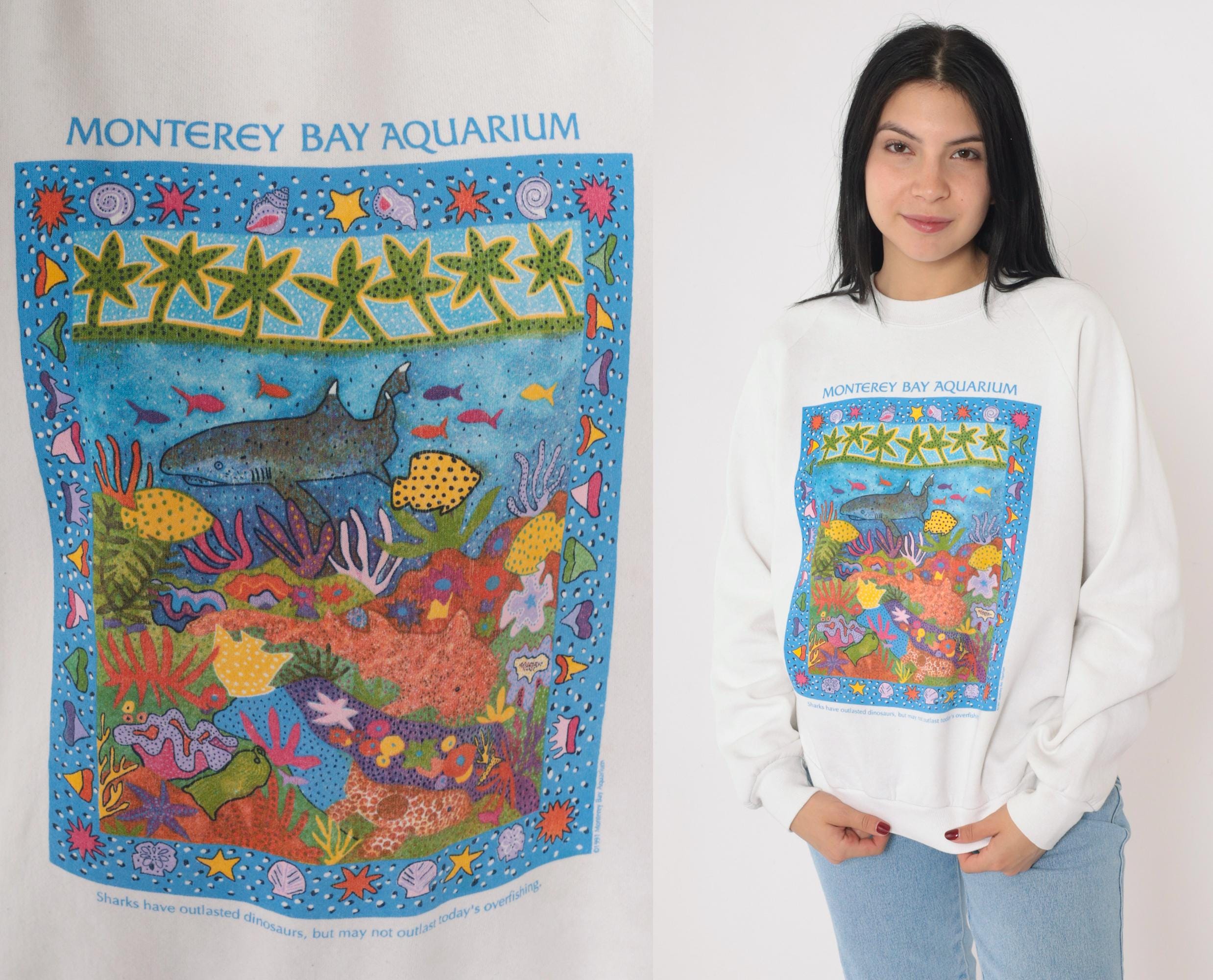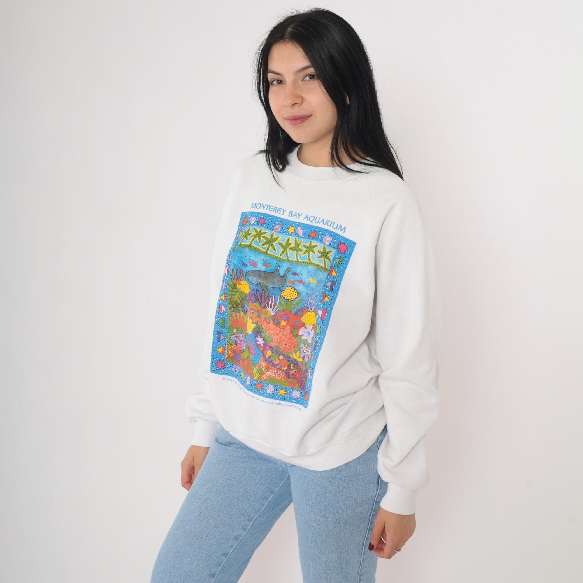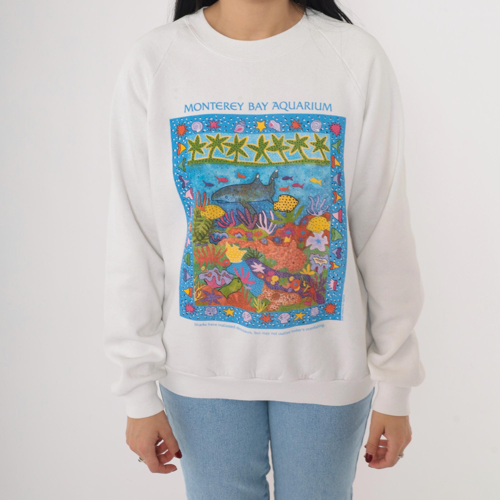 Vintage 90s Monterey Bay Aquarium sweatshirt in white. Features a colorful marine life graphic with sharks, coral, and sea creatures framed by a border of starfish and shells. Text at the bottom reads: "Sharks have outlasted dinosaurs, but may not outlast today's overfishing." Classic crewneck pullover with raglan sleeves and ribbed cuffs and hem. Made in the USA by Jerzees.