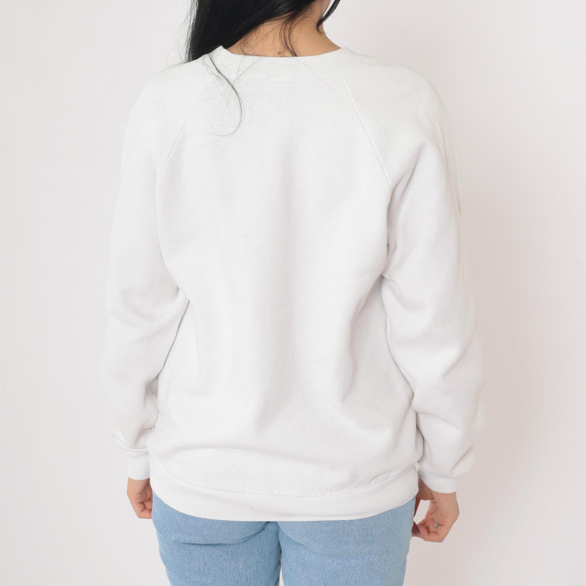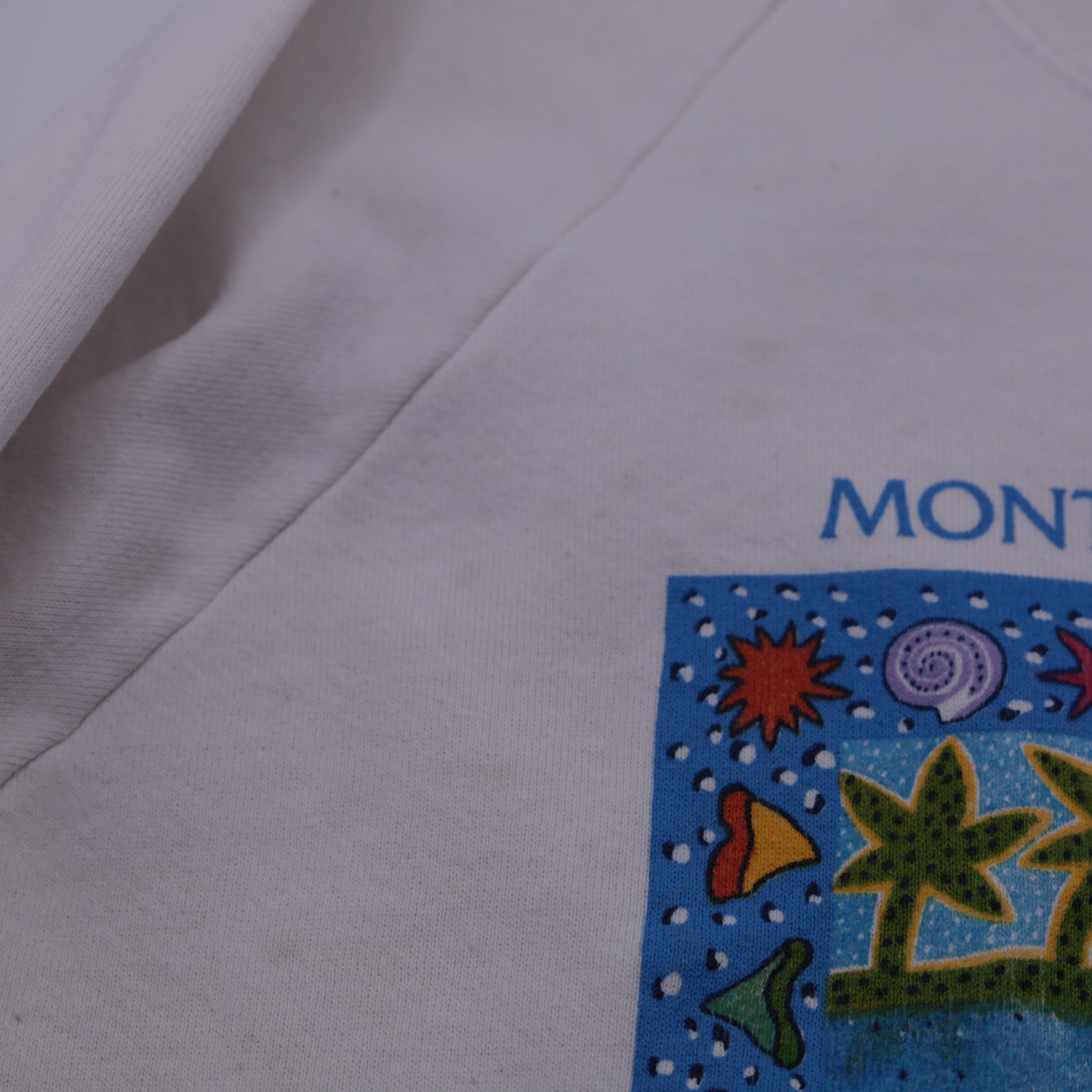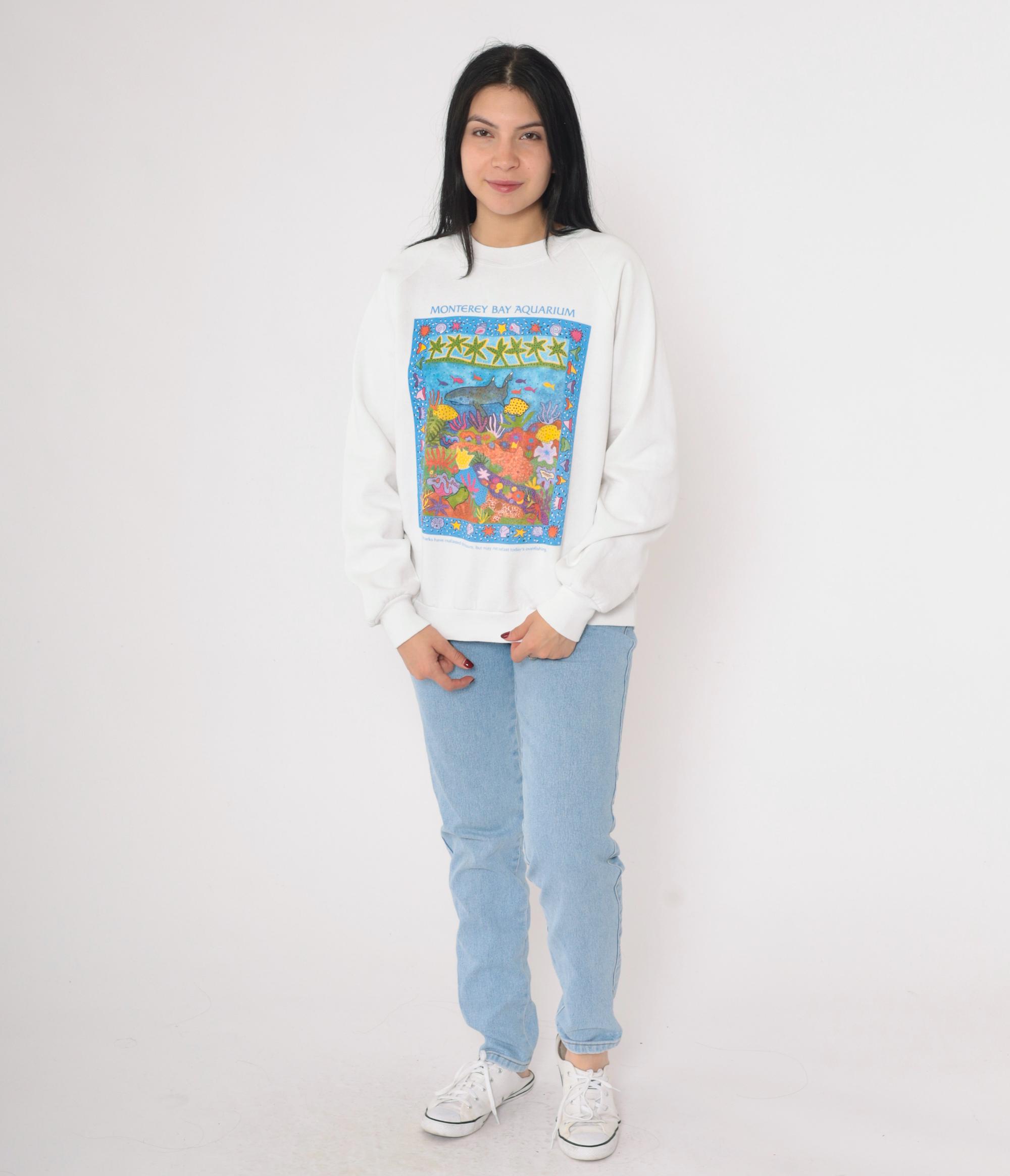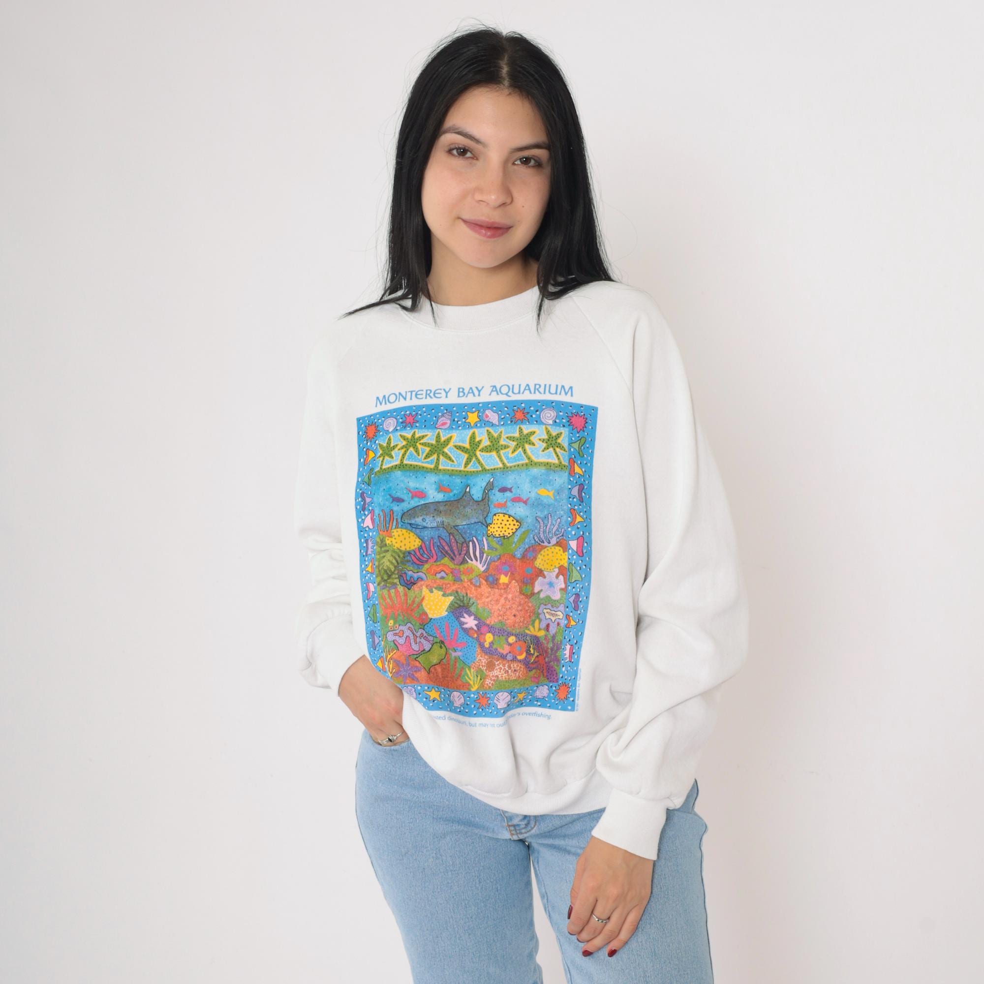 Vintage 90s Monterey Bay Aquarium sweatshirt in white. Features a colorful marine life graphic with sharks, coral, and sea creatures framed by a border of starfish and shells. Text at the bottom reads: "Sharks have outlasted dinosaurs, but may not outlast today's overfishing." Classic crewneck pullover with raglan sleeves and ribbed cuffs and hem. Made in the USA by Jerzees.