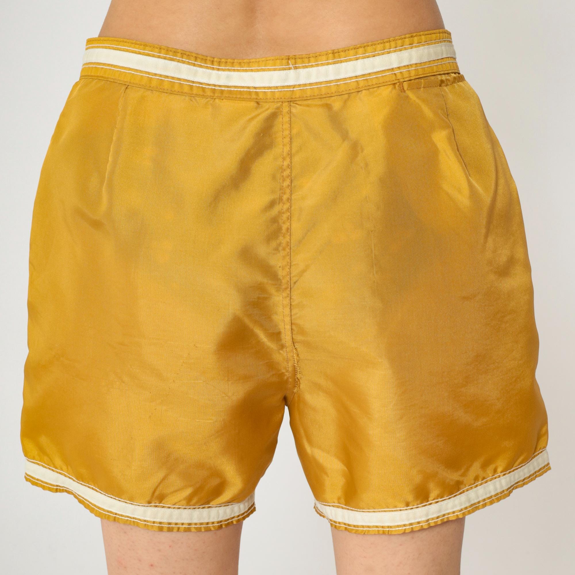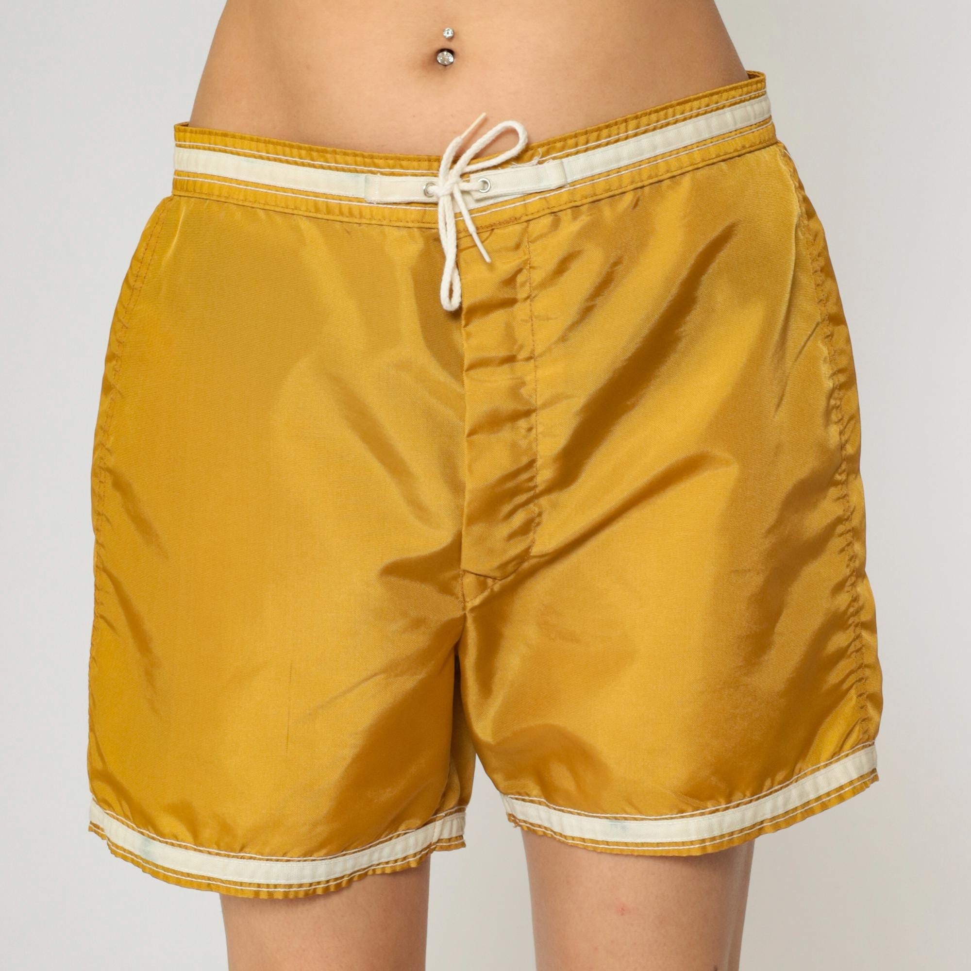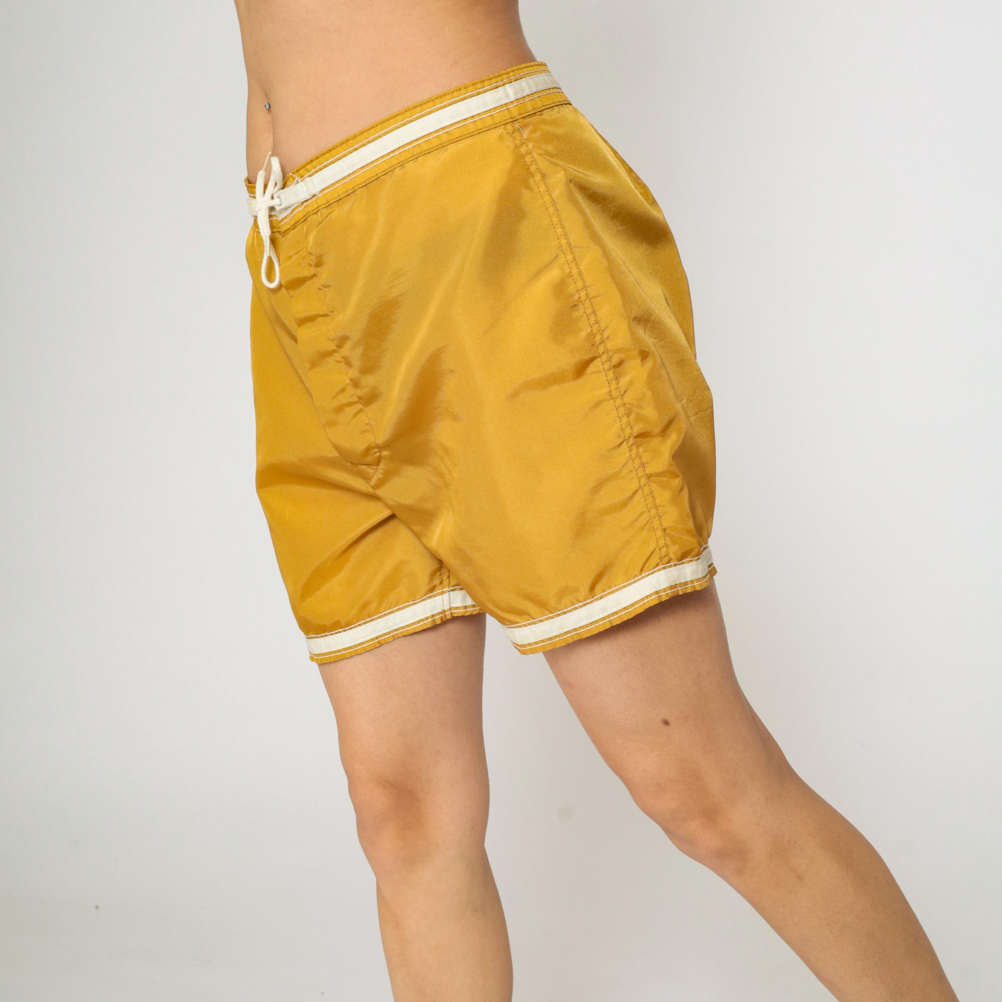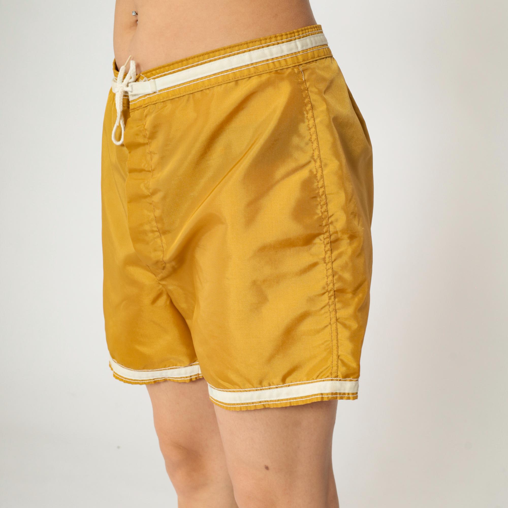 Vintage 70s swim shorts in mustard yellow with striped trim and a tie at the waist.