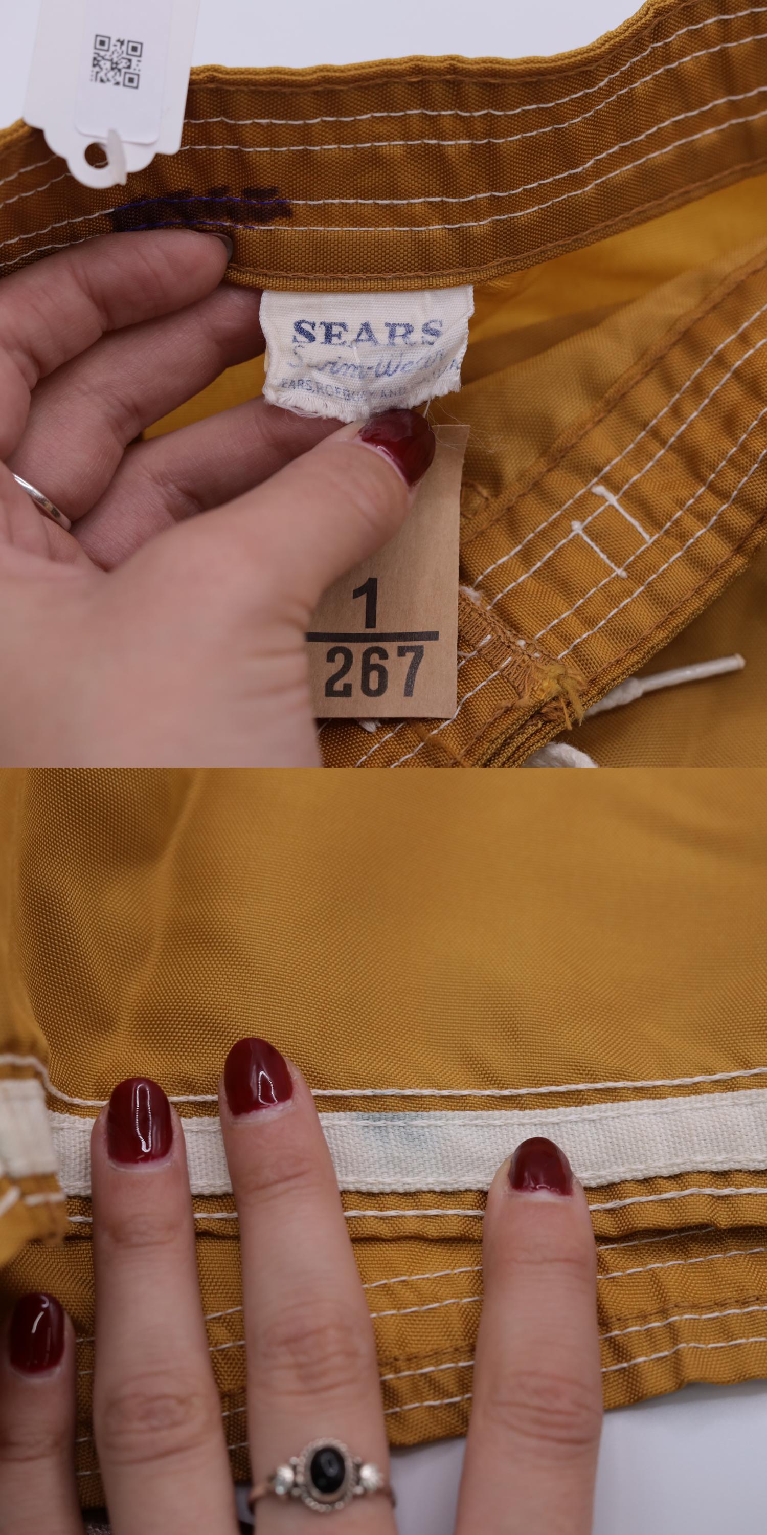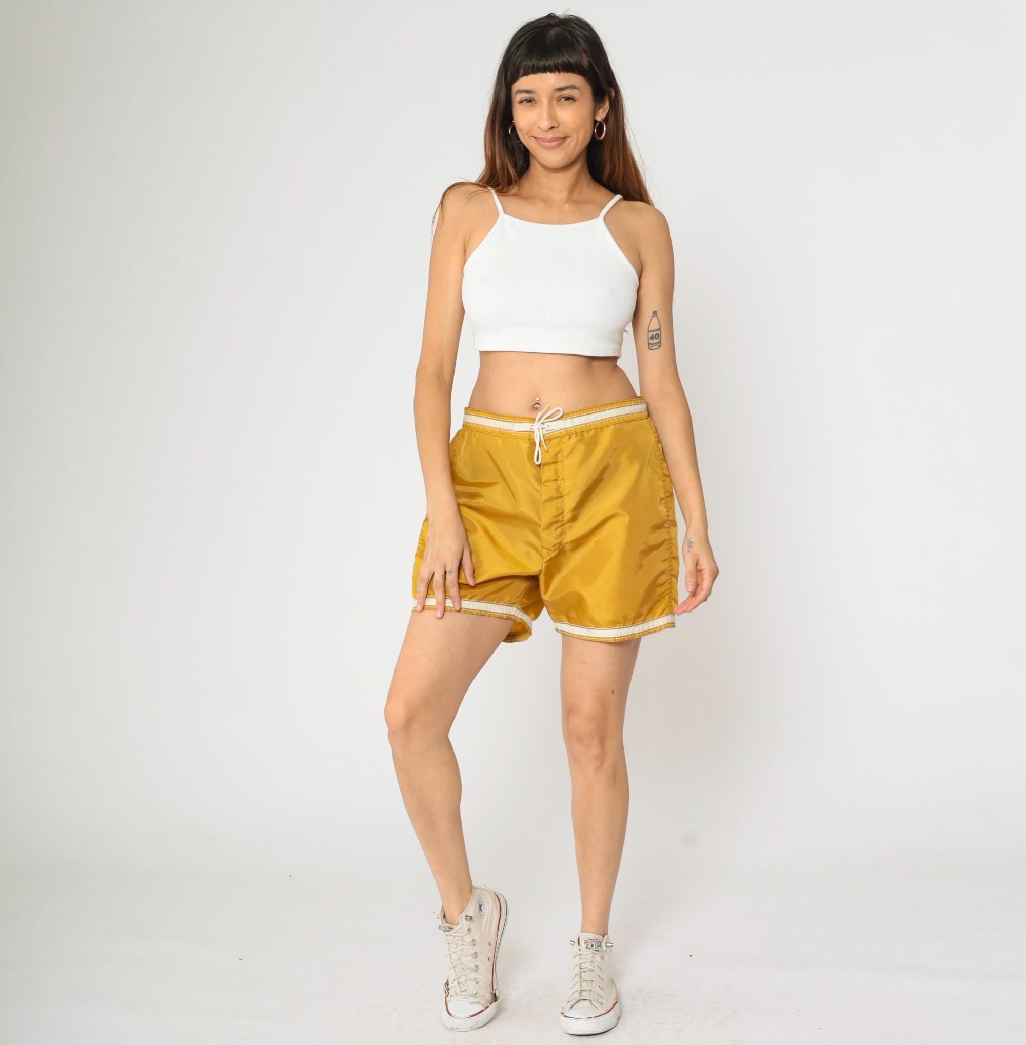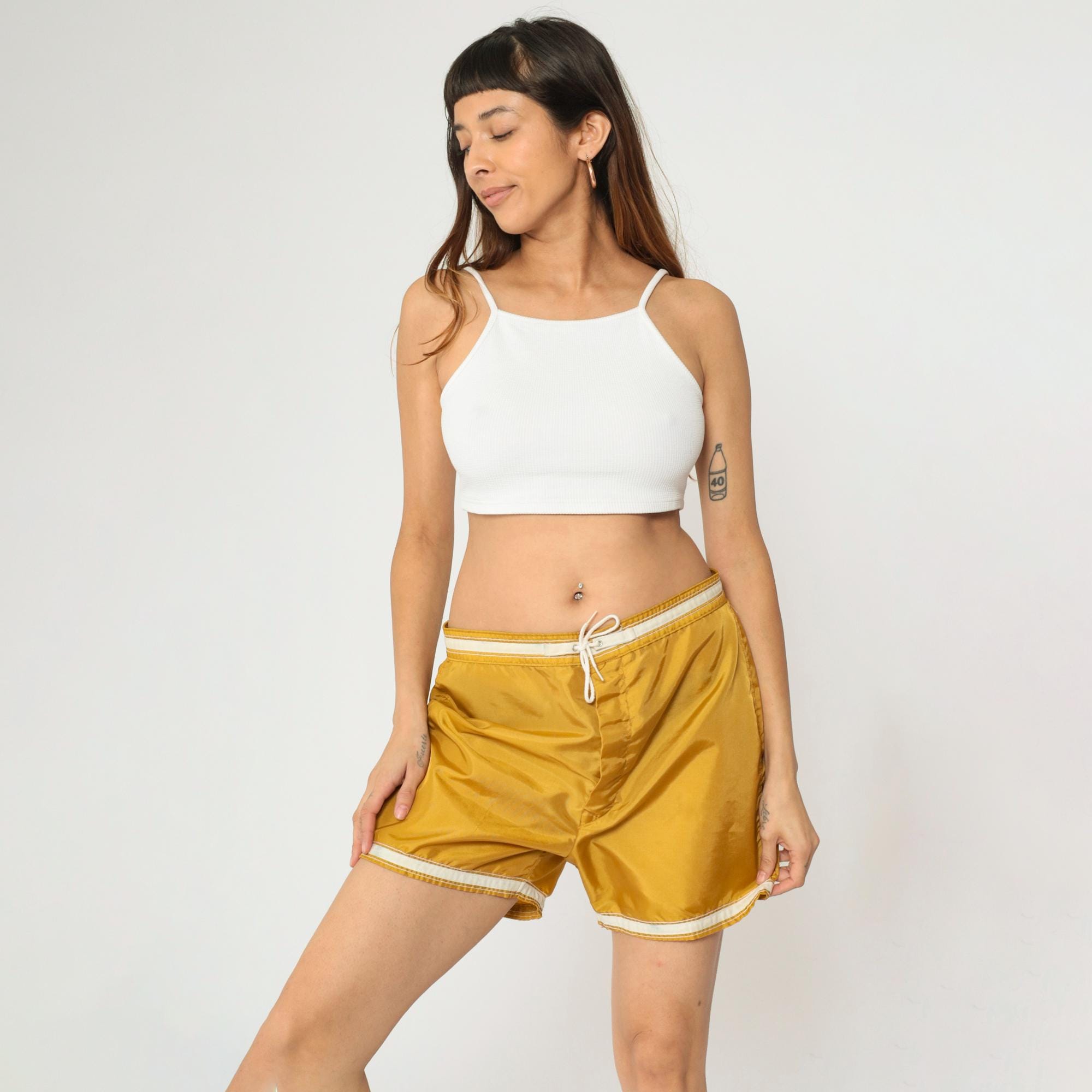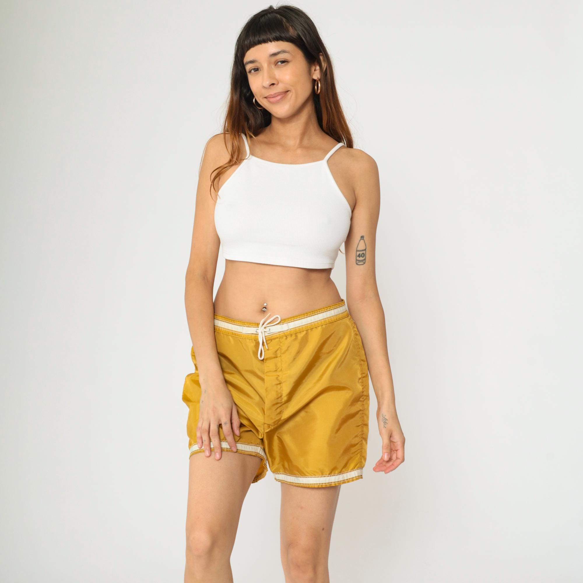 Vintage 70s swim shorts in mustard yellow with striped trim and a tie at the waist.