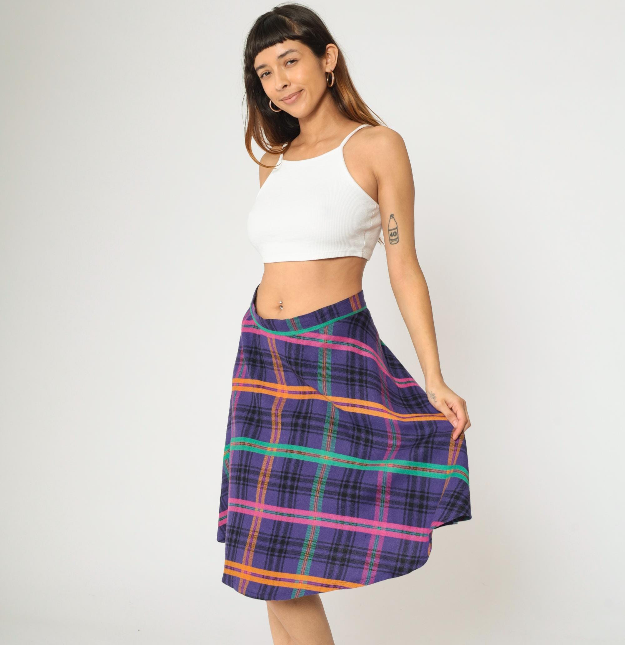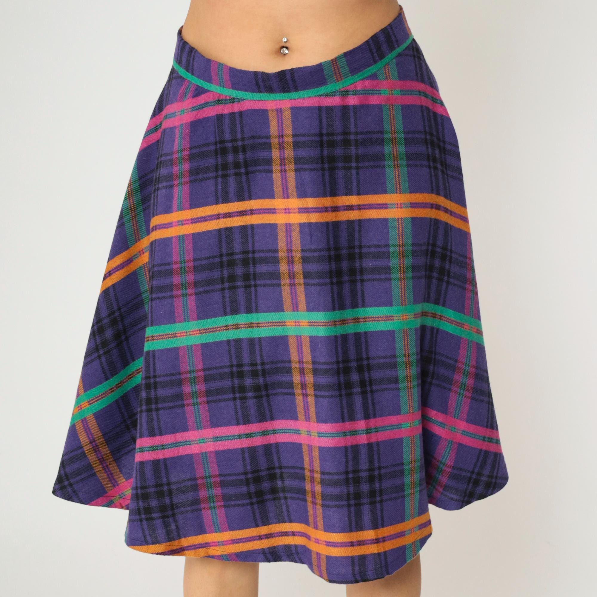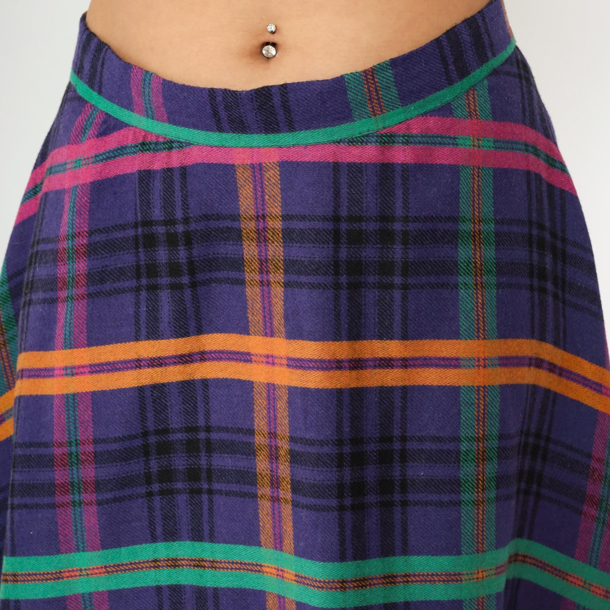 Vintage 90s skirt in a purple plaid print with a high waist. Midi length.