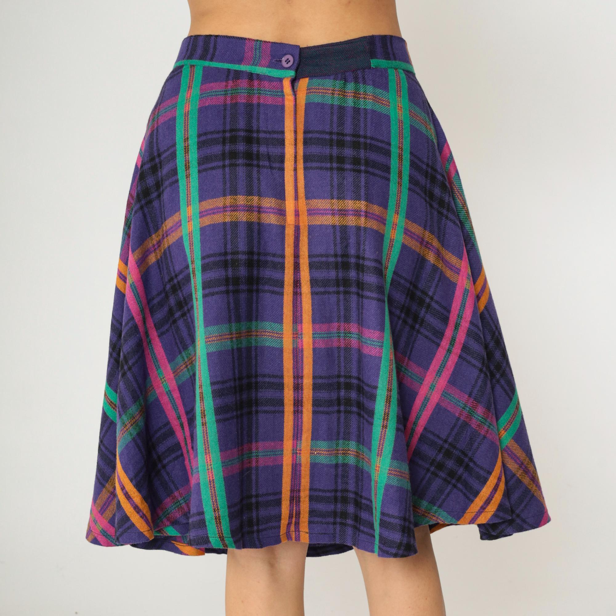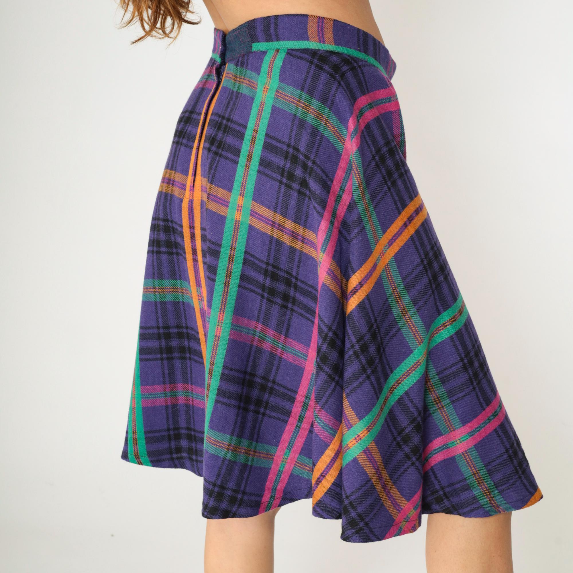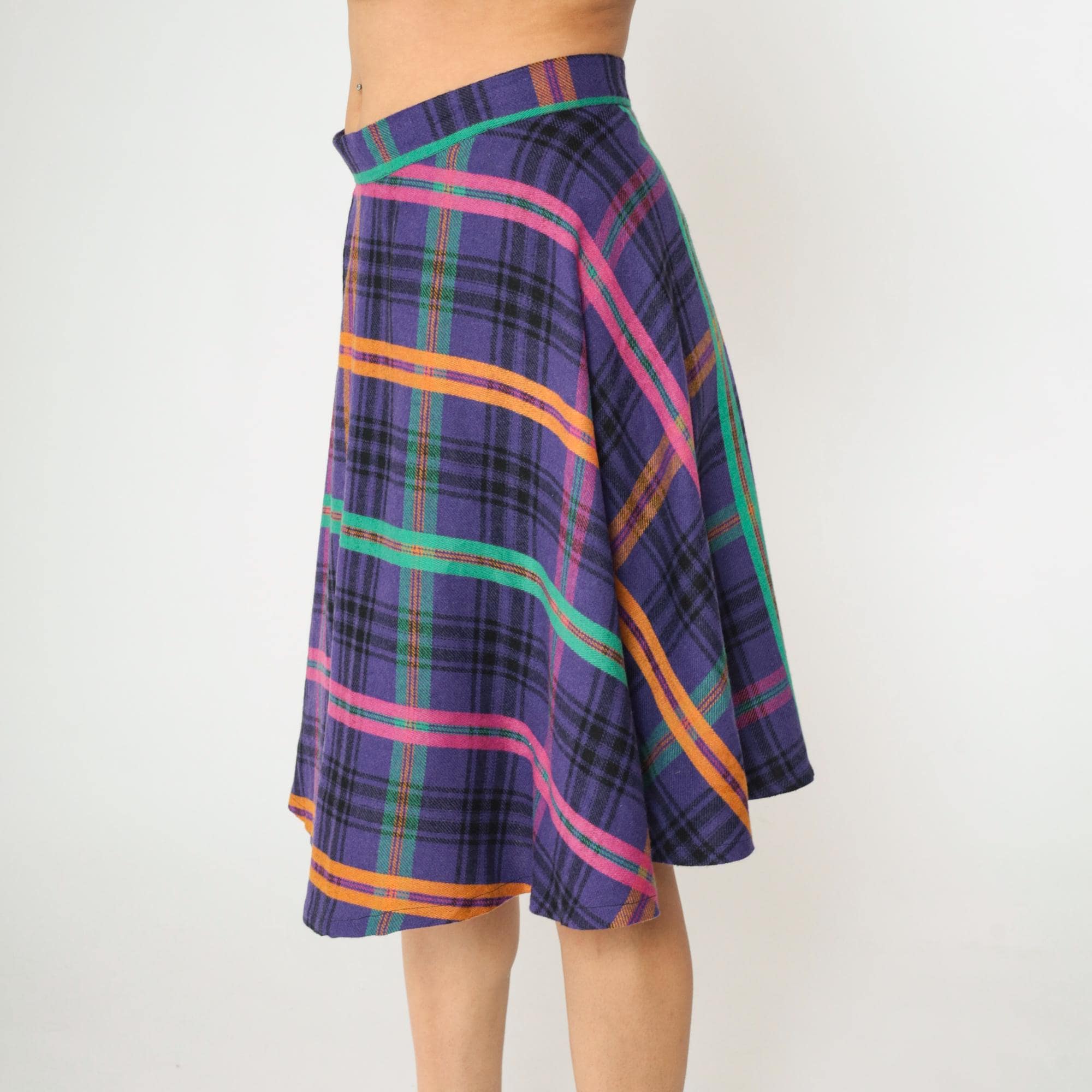 Vintage 90s skirt in a purple plaid print with a high waist. Midi length.