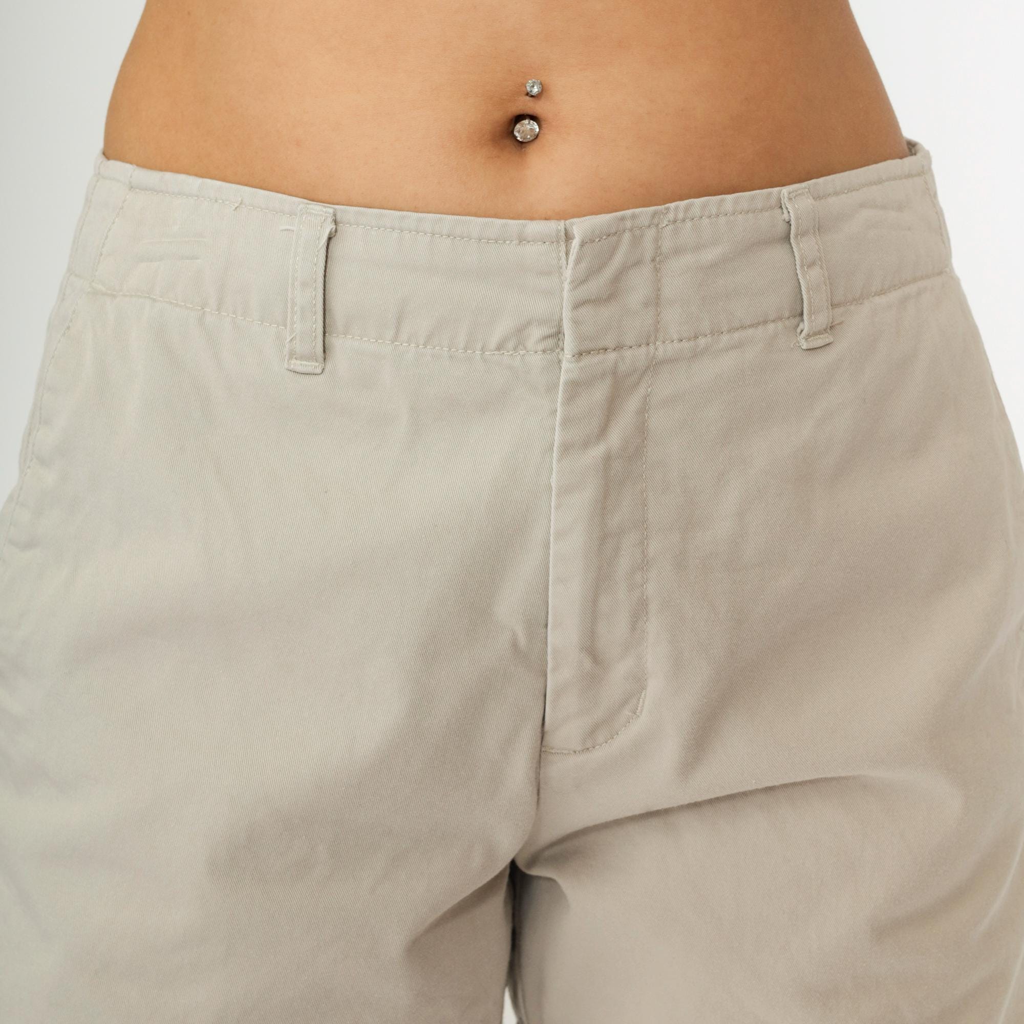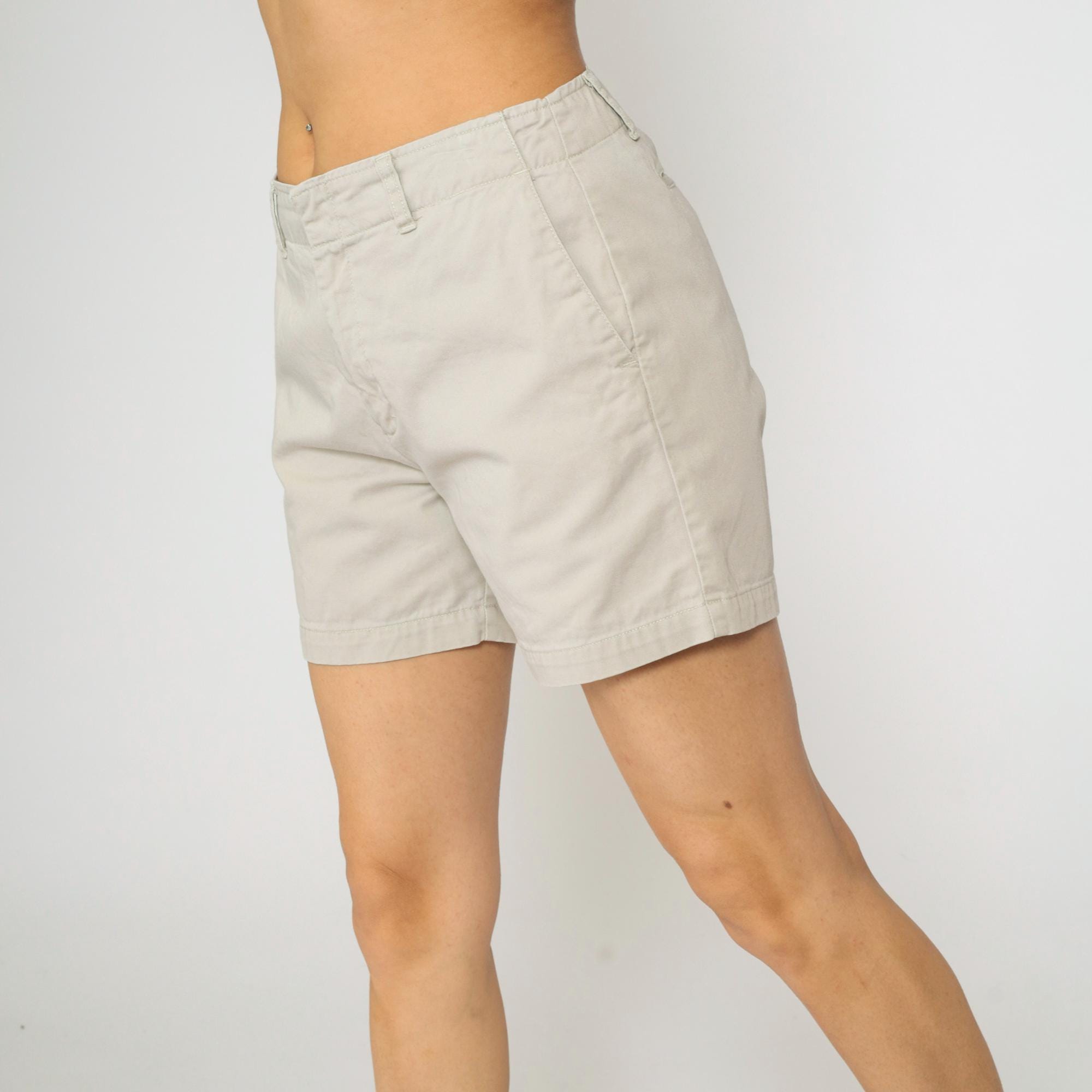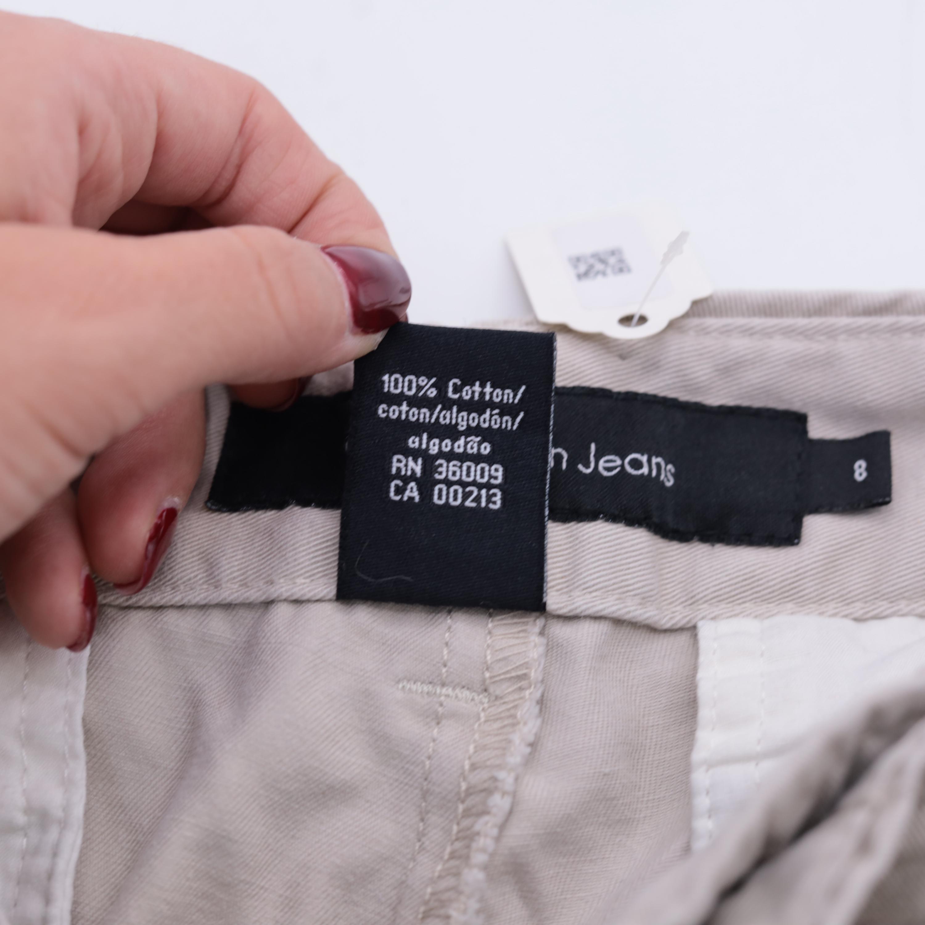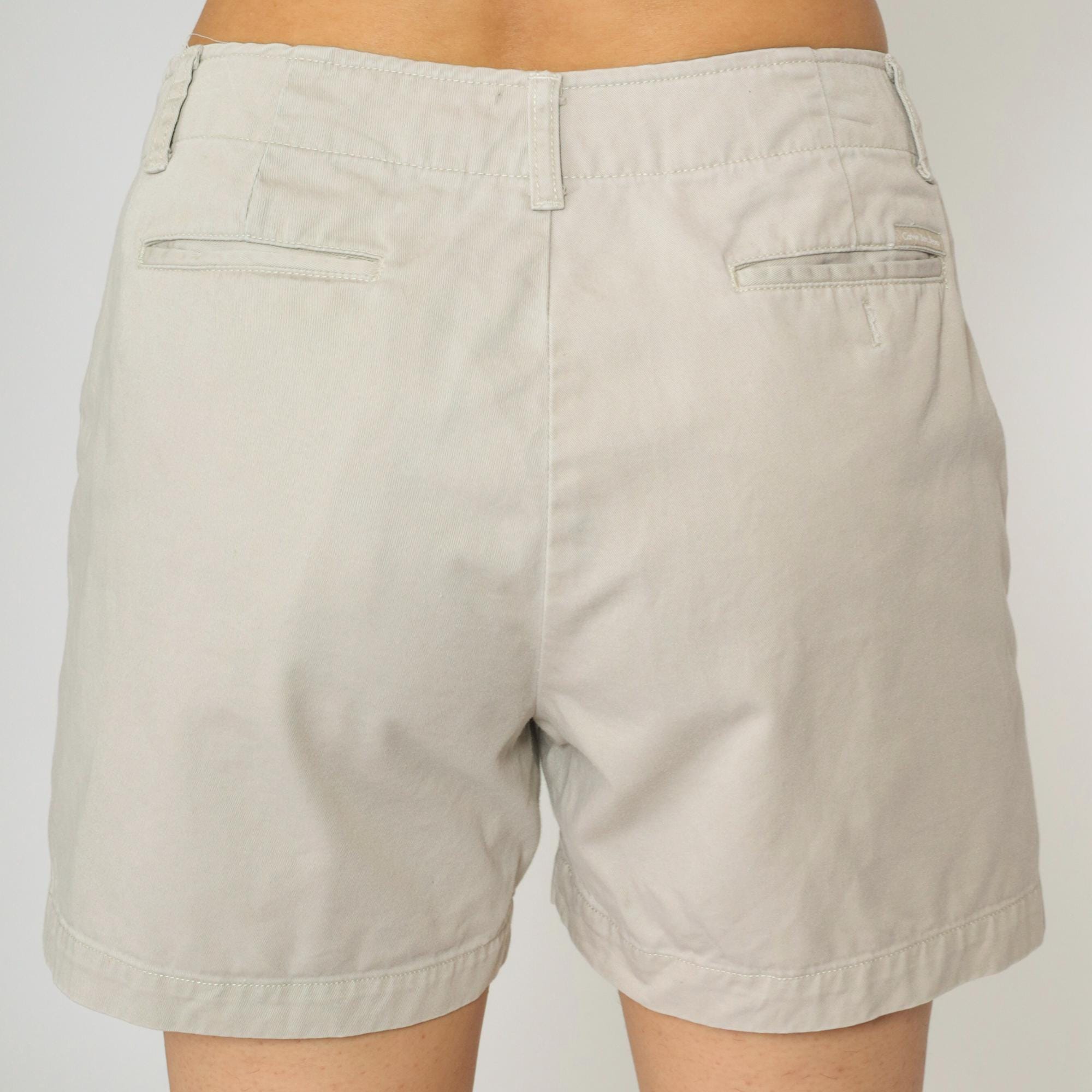 Calvin Klein Jeans khaki shorts in a neutral beige hue. Made from 100% cotton with a structured chino style. Features a mid-rise waist, belt loops, zip fly with button closure, and side pockets. Back welt pockets for a tailored look.