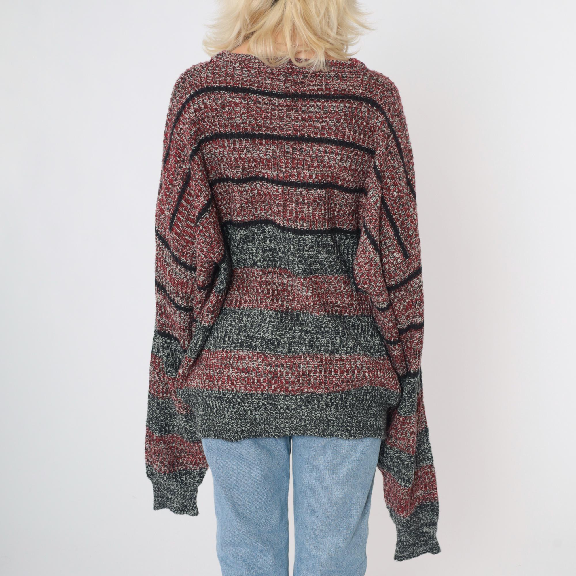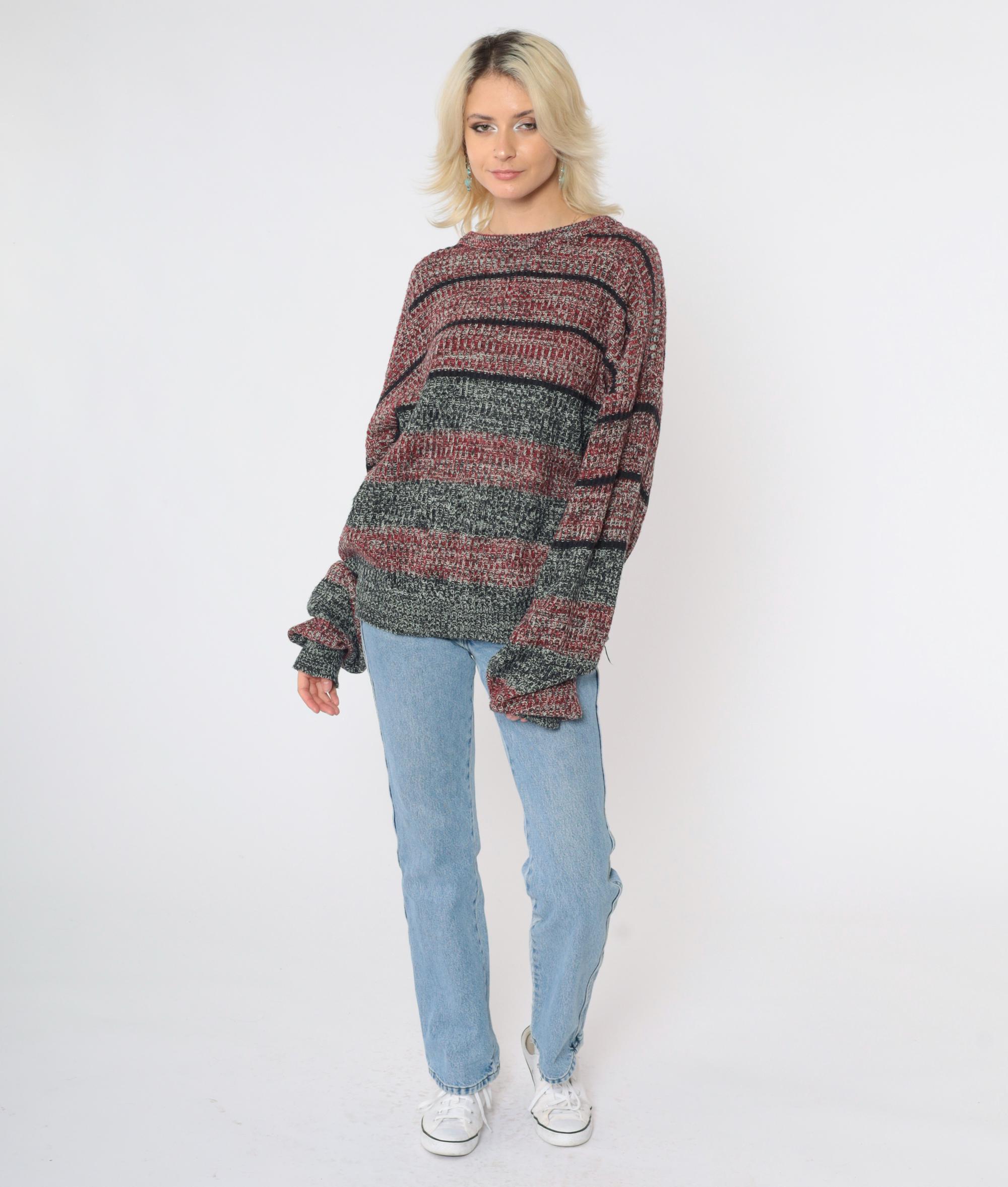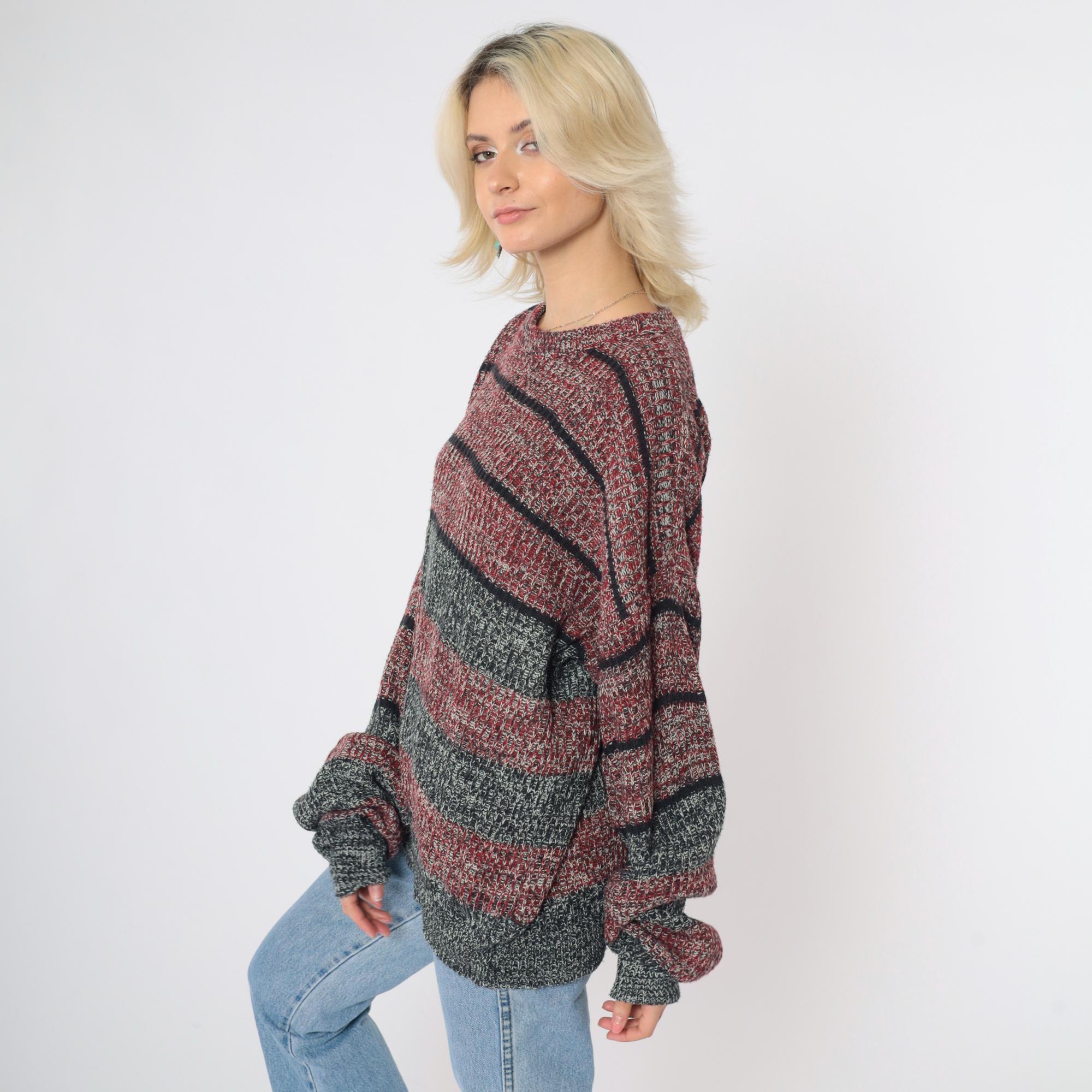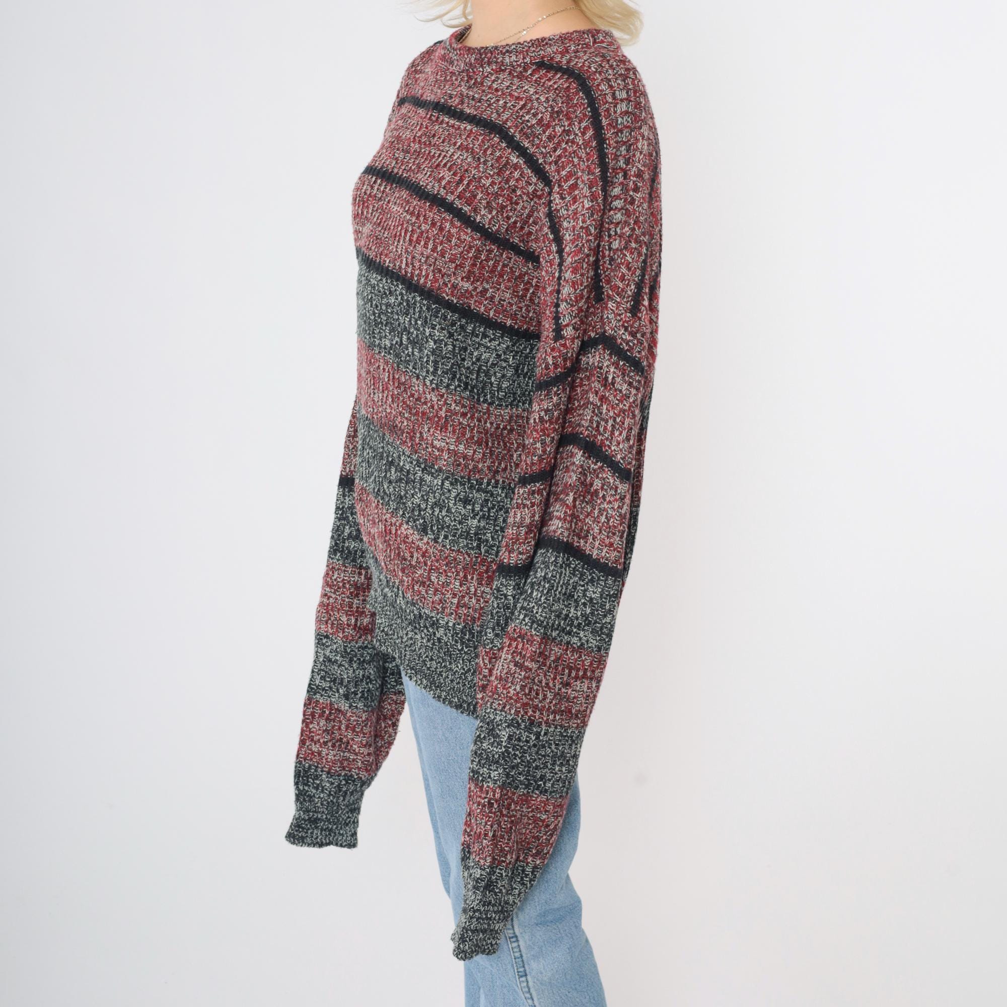 Vintage 80s Wrangler knit sweater in a marled acrylic blend with horizontal black, red, and gray stripes. Features a slouchy oversized fit, ribbed cuffs, and a classic crew neck.
