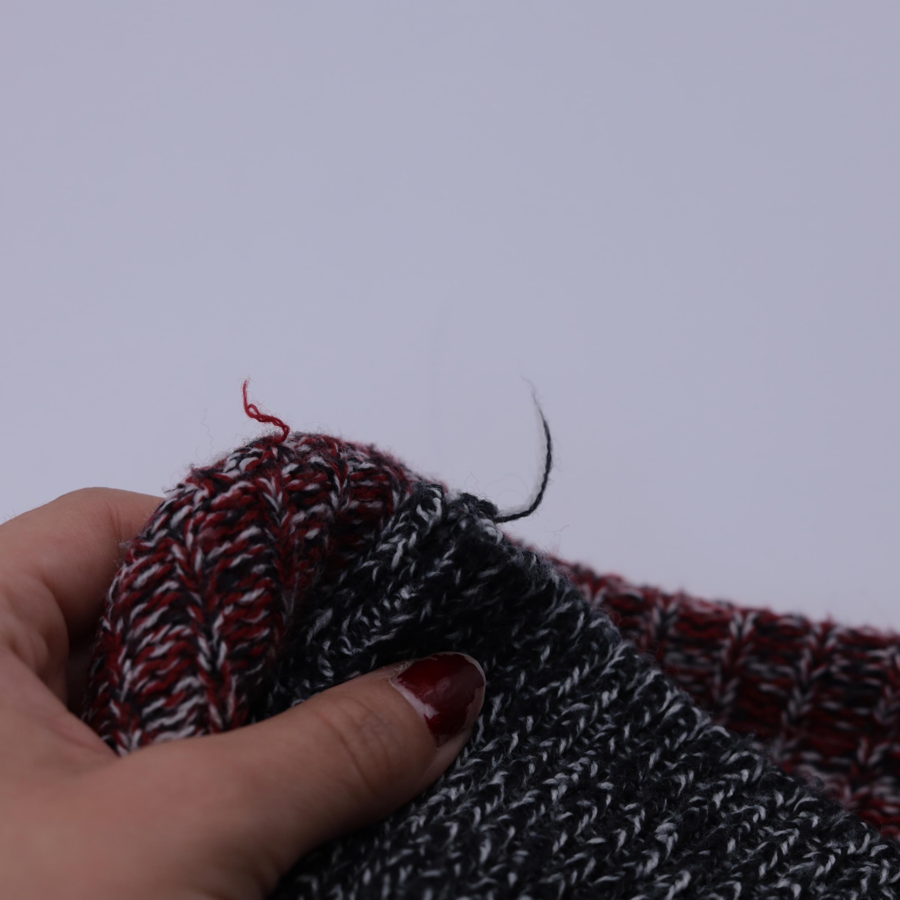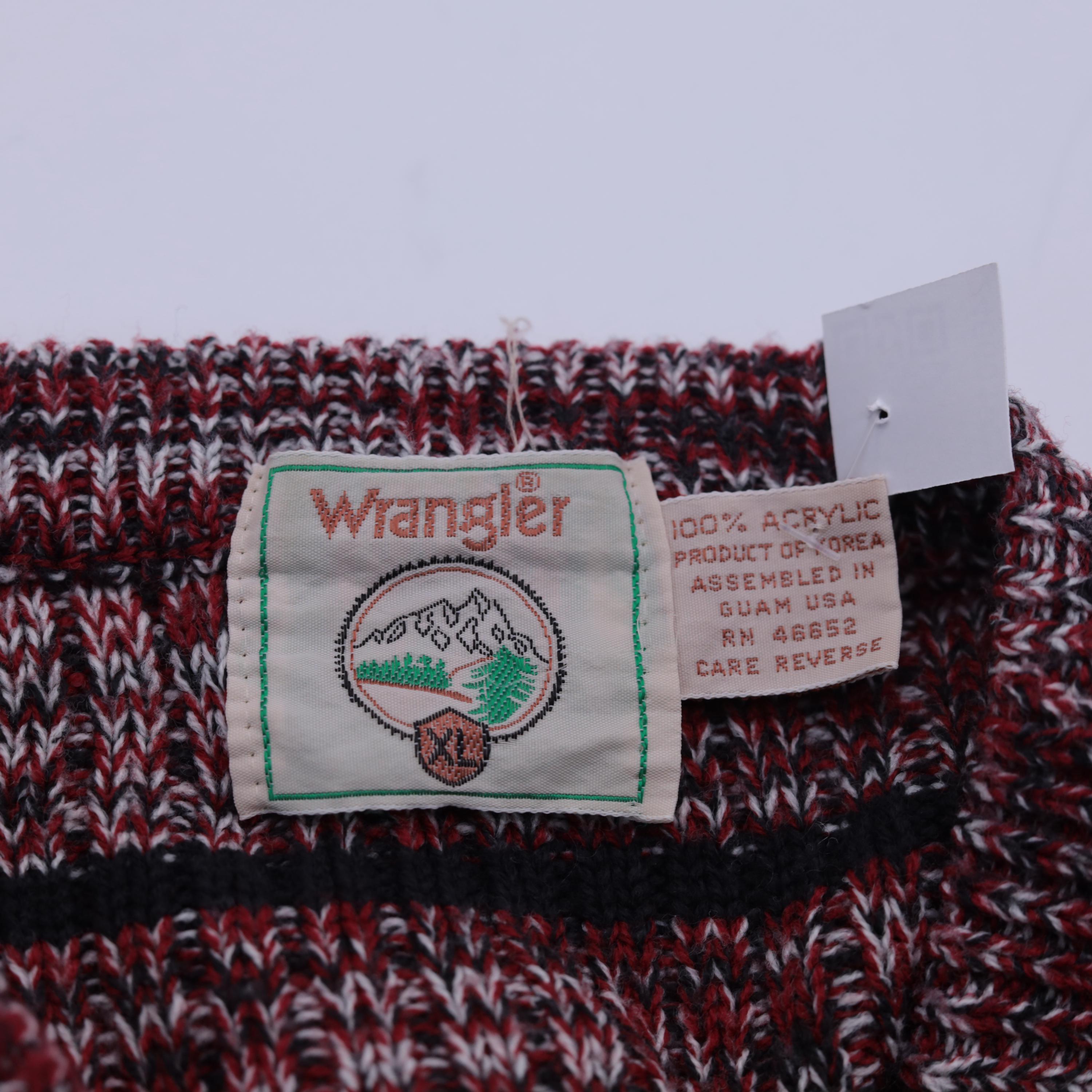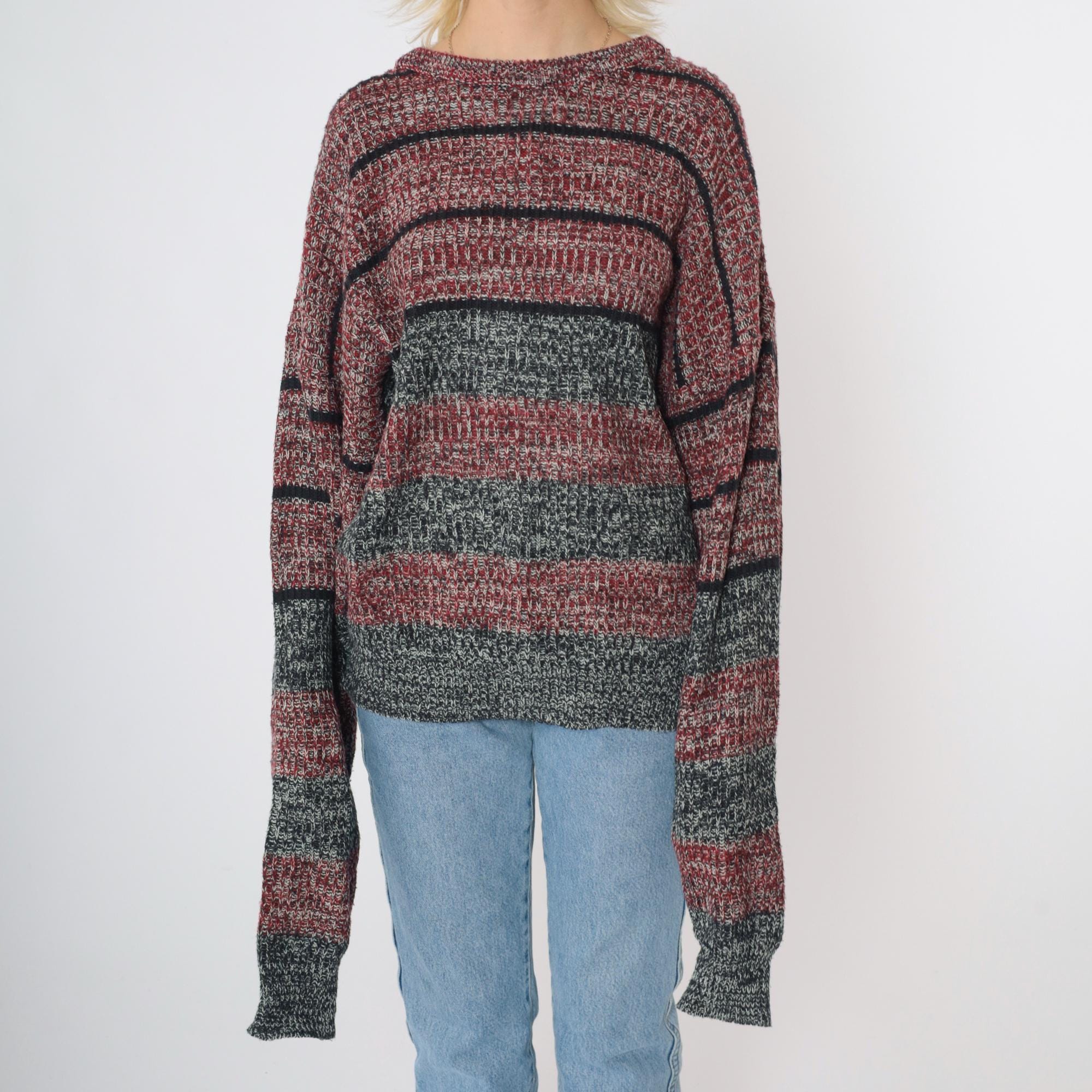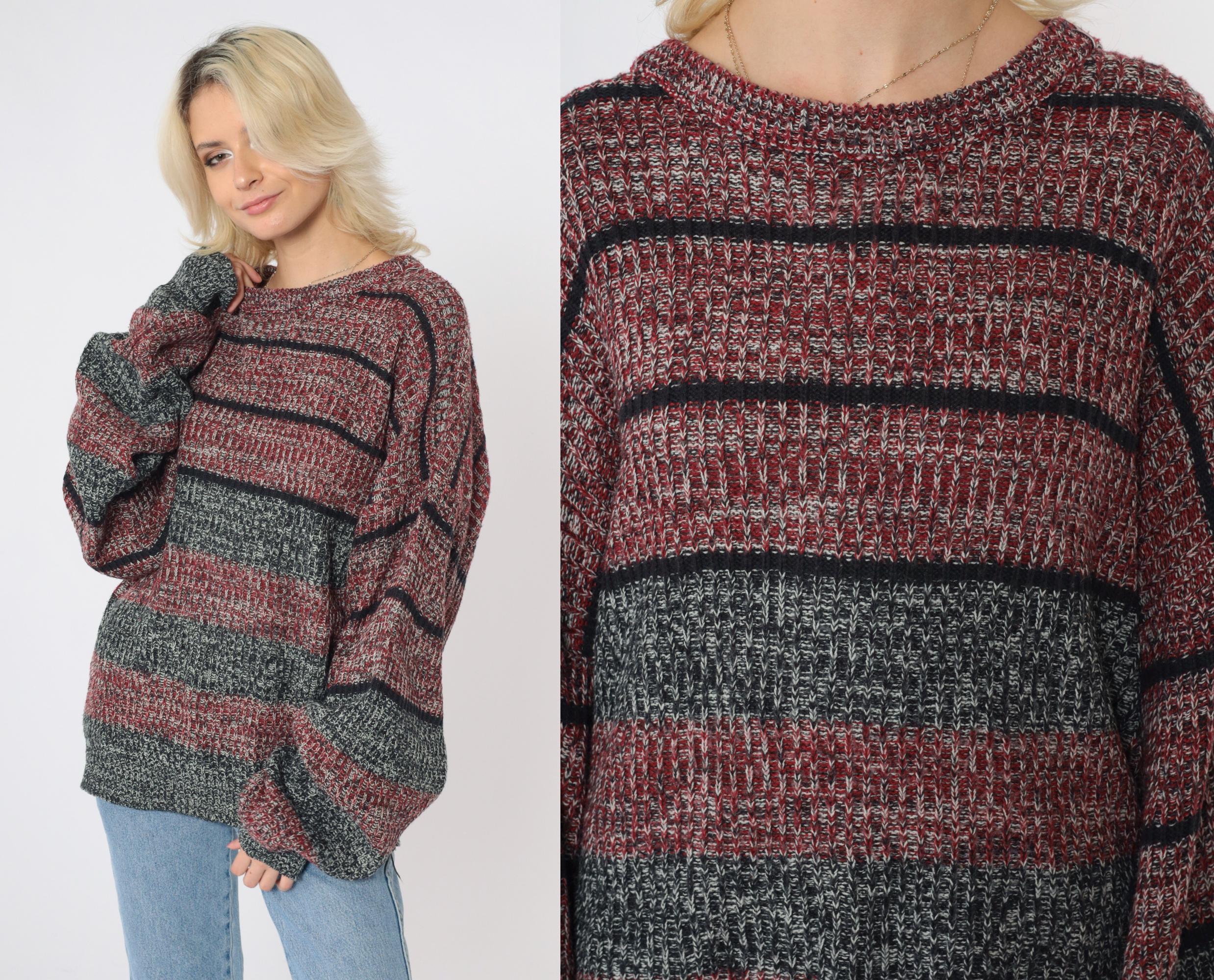 Vintage 80s Wrangler knit sweater in a marled acrylic blend with horizontal black, red, and gray stripes. Features a slouchy oversized fit, ribbed cuffs, and a classic crew neck.