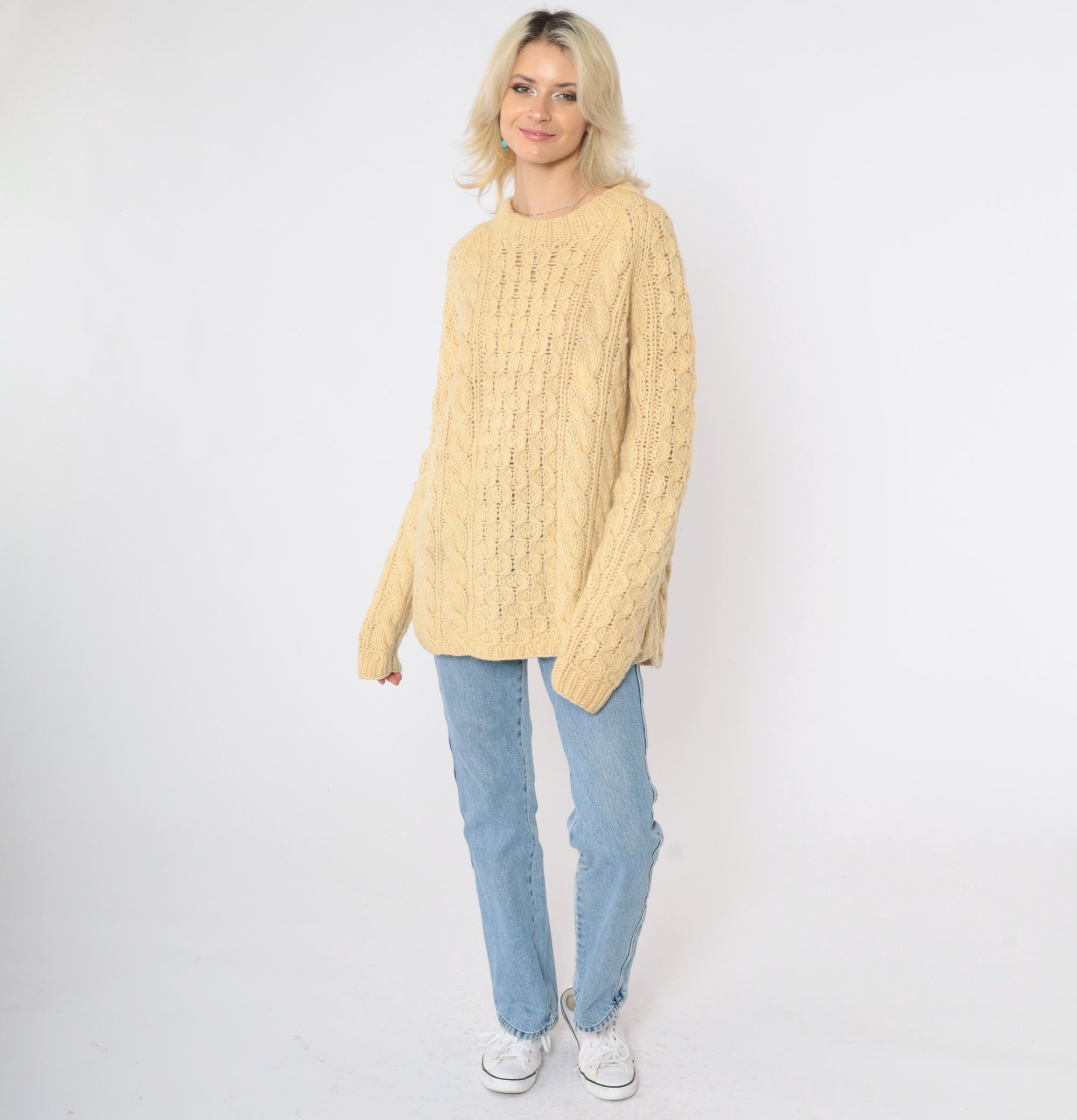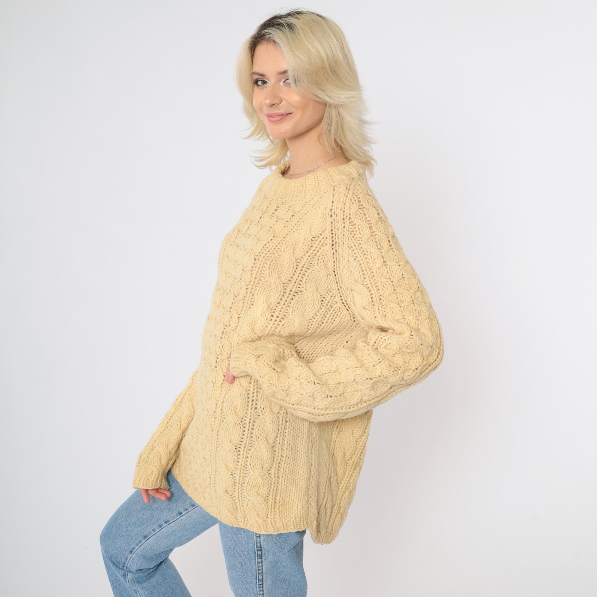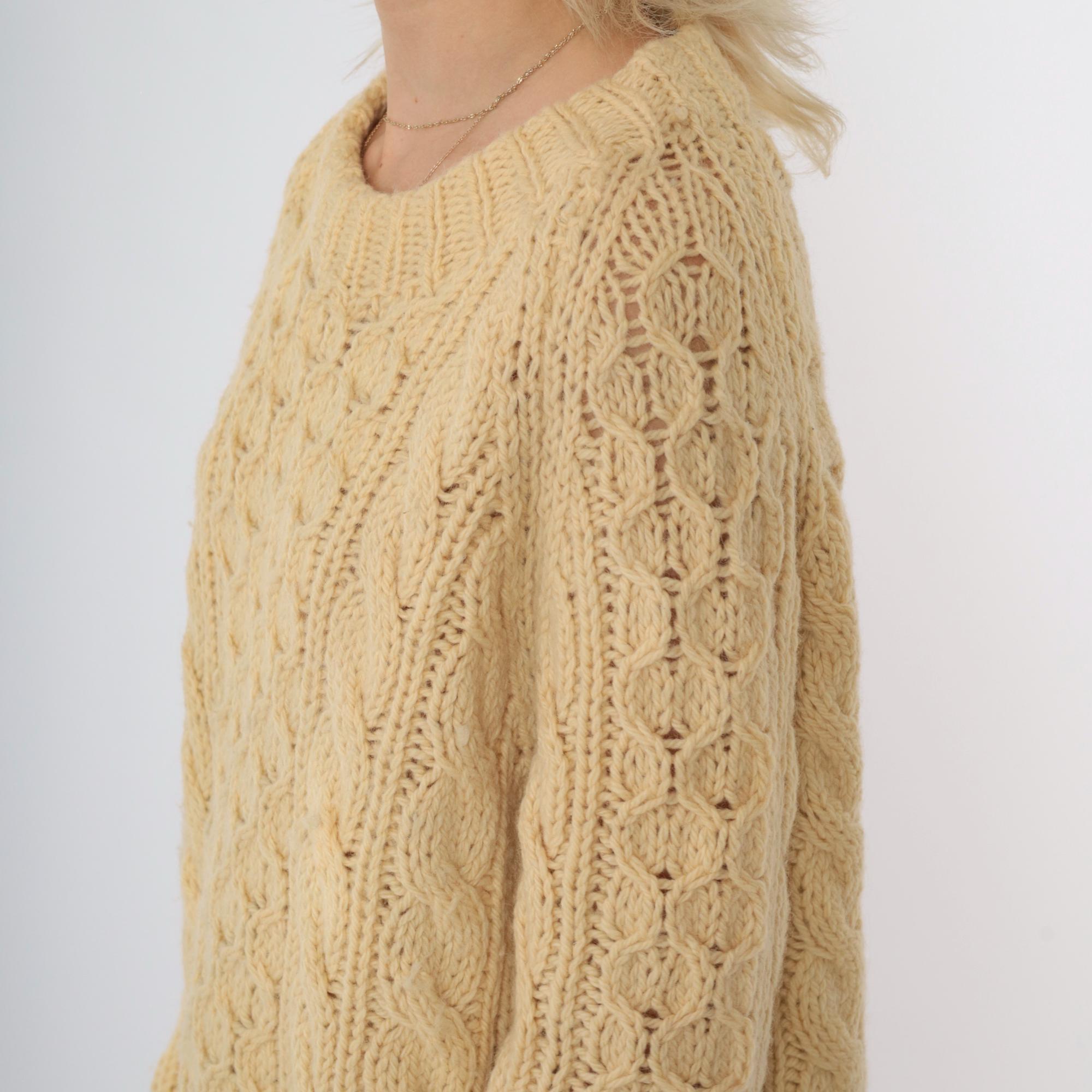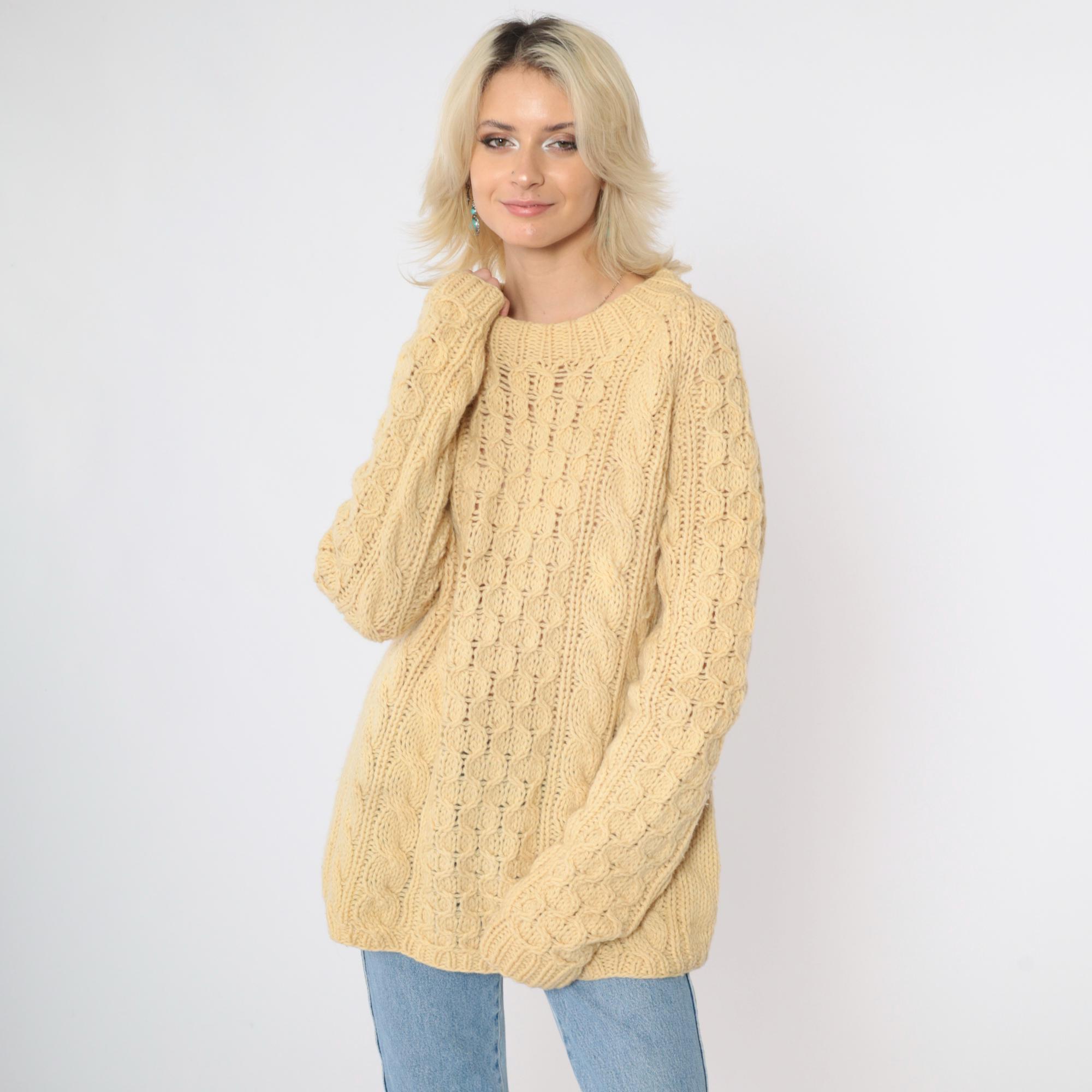 Vintage 80s sweater in light yellow cable knit. Loosely knit and semi-sheer.