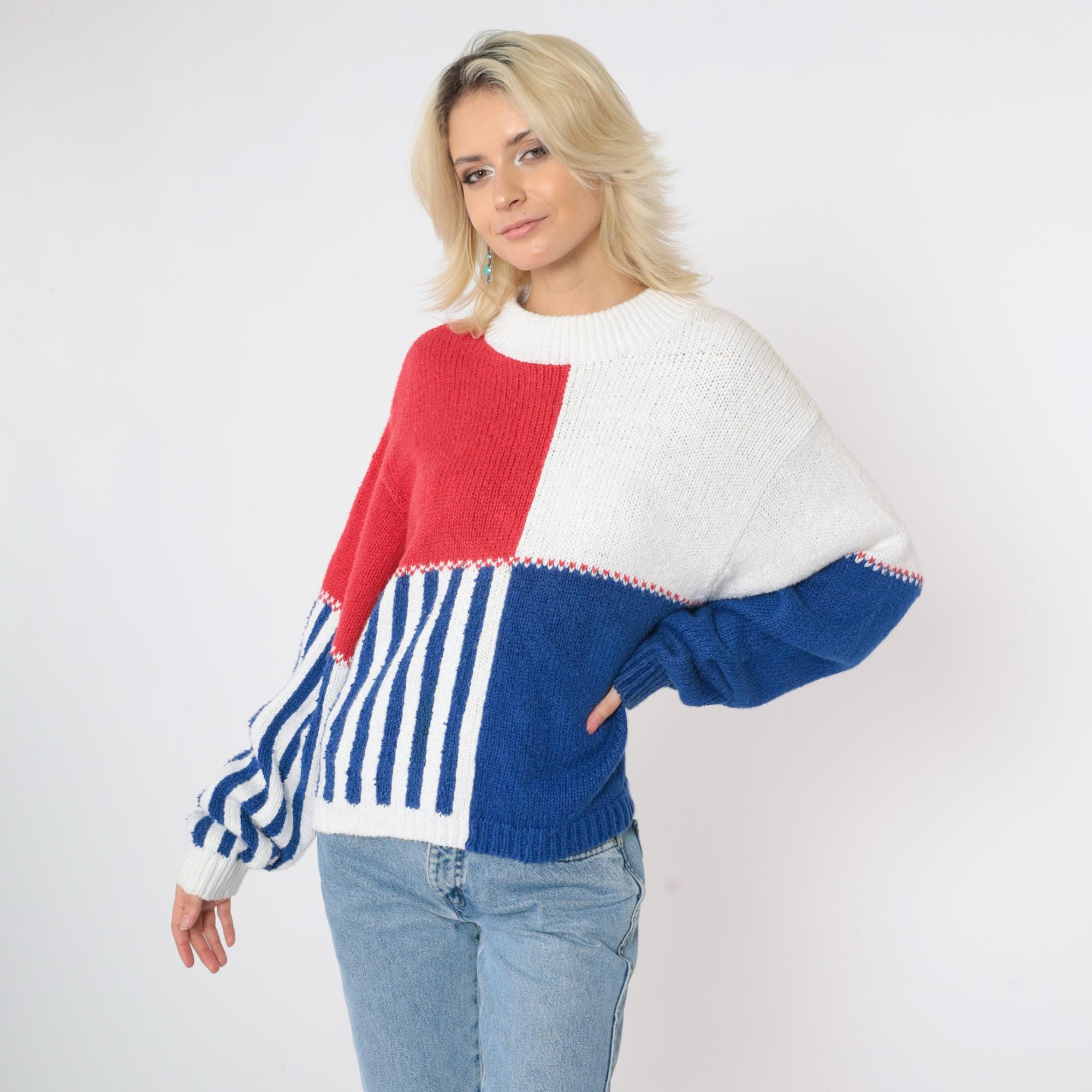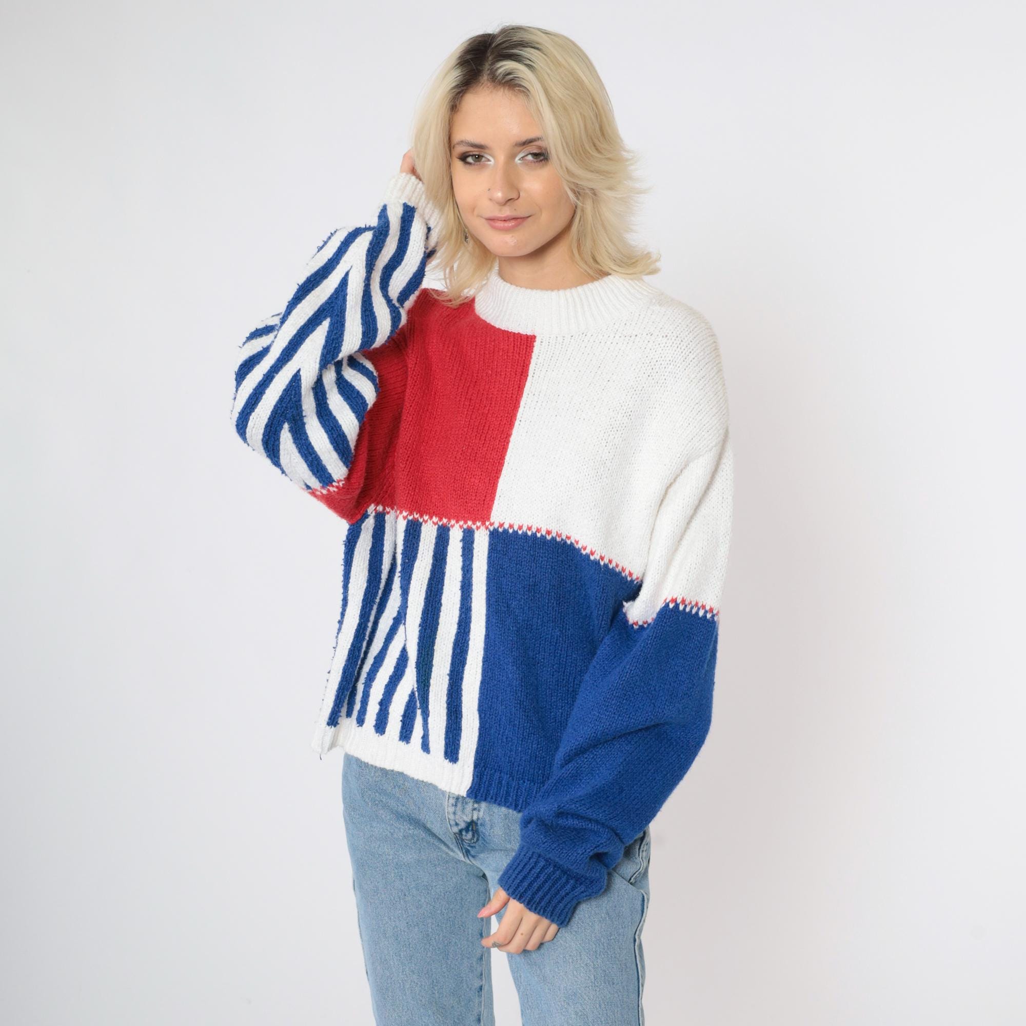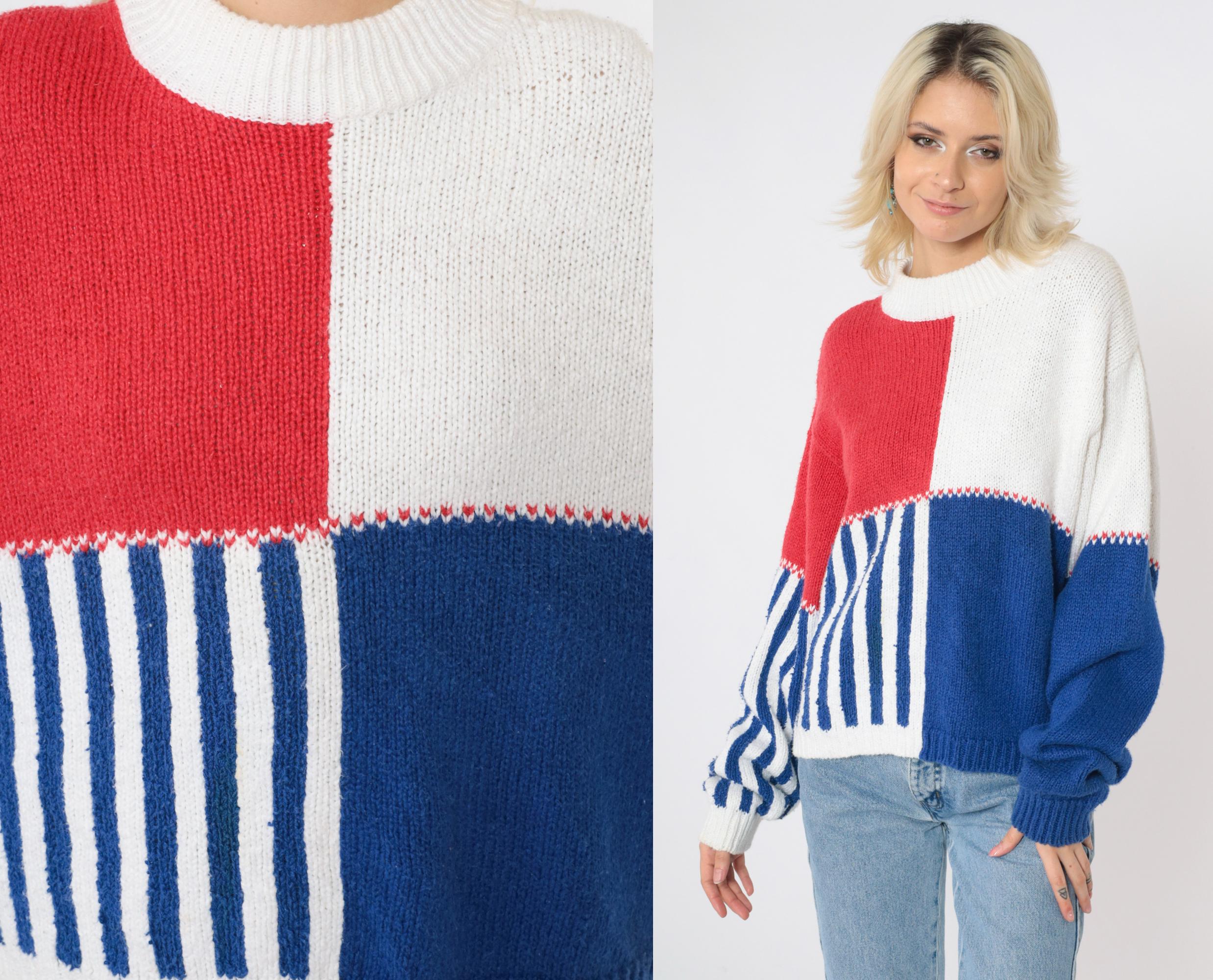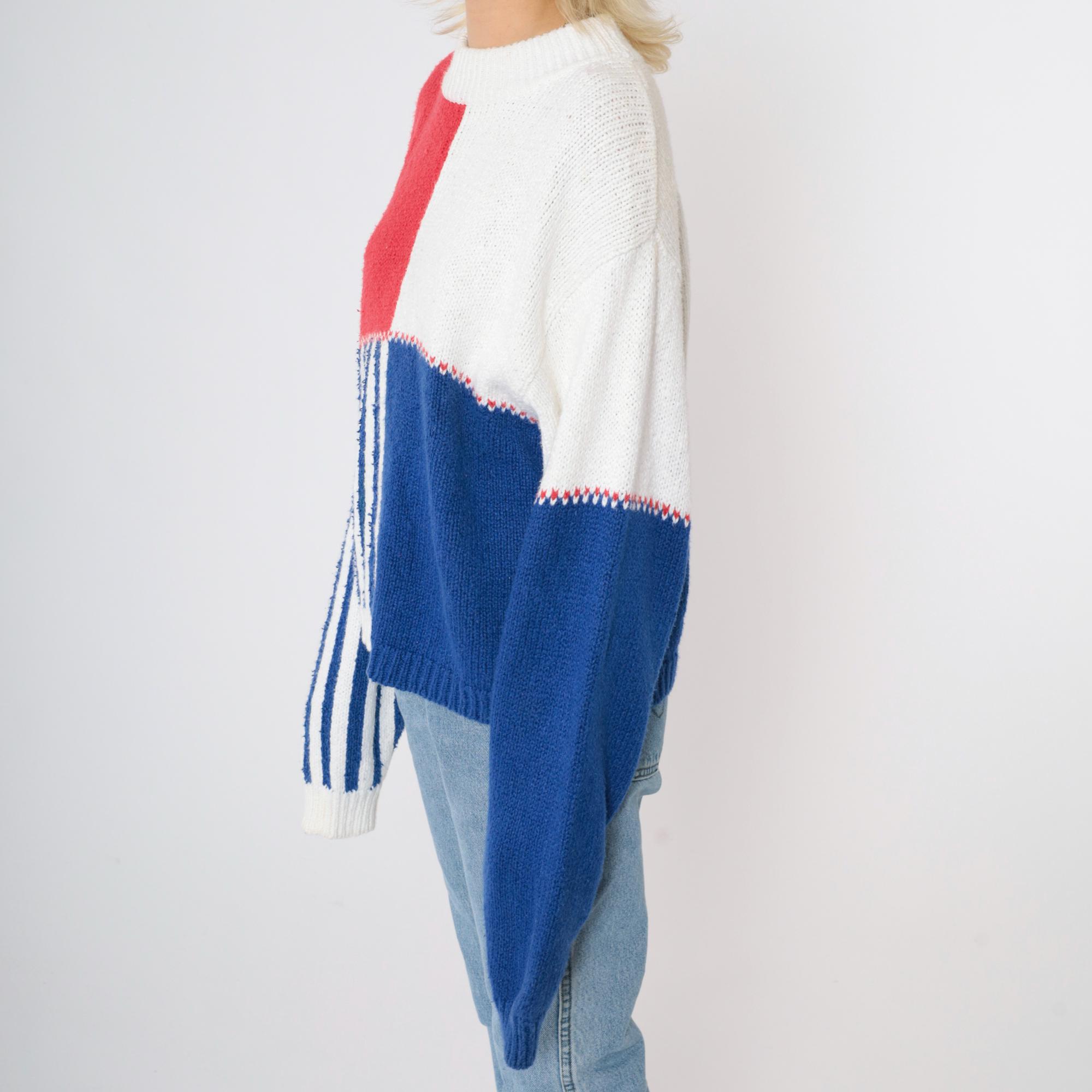 Vintage 90s sweater in red, white and blue colour blocking with stripes. It features a crewneck and long sleeves.