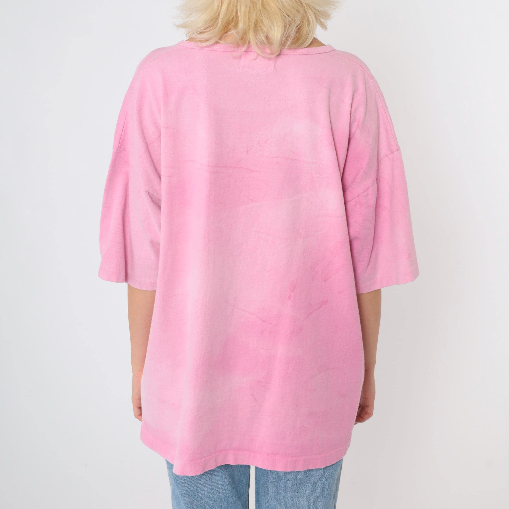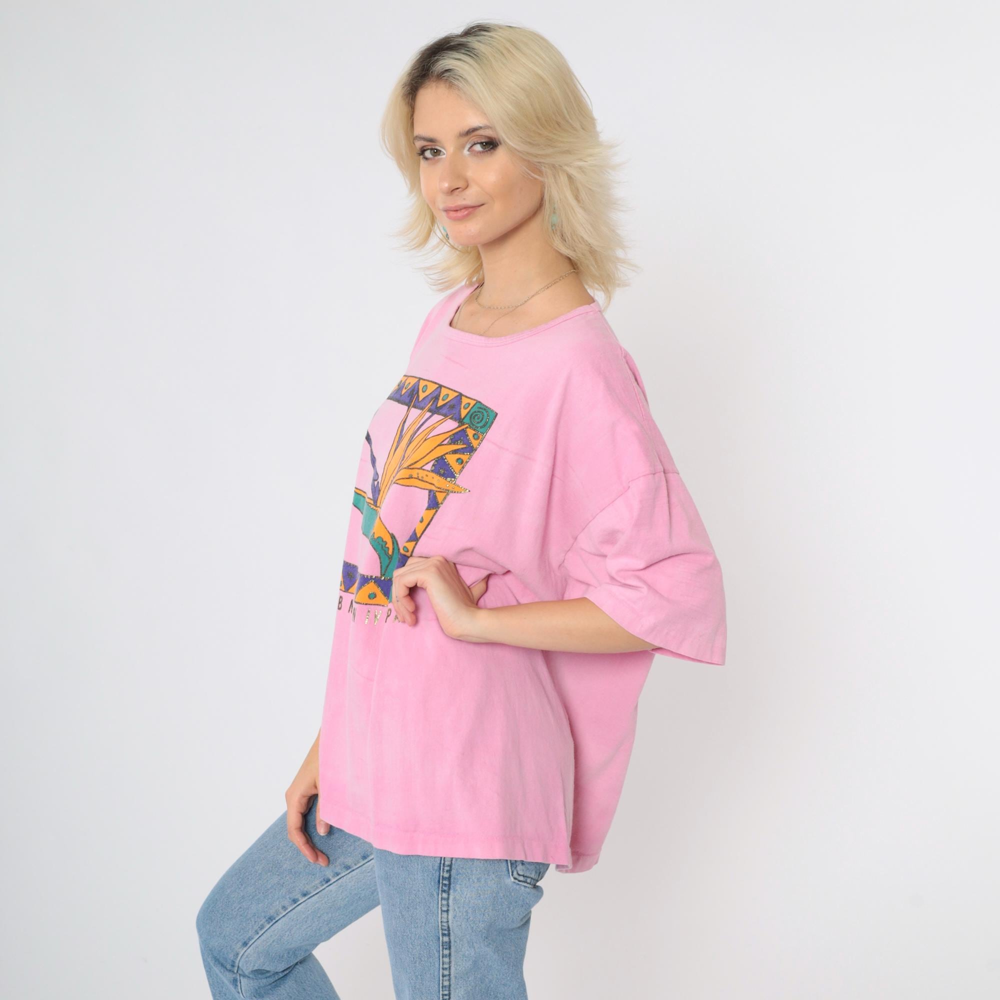 Vintage 90s Glen Ivy Spa t-shirt in a soft pink hue. Features a bold Bird of Paradise floral graphic with geometric accents and "Club Mud - Glen Ivy Spa" in gold lettering. Oversized boxy fit with a wide scoop neckline and dropped shoulders. Made in the USA from 100% cotton.