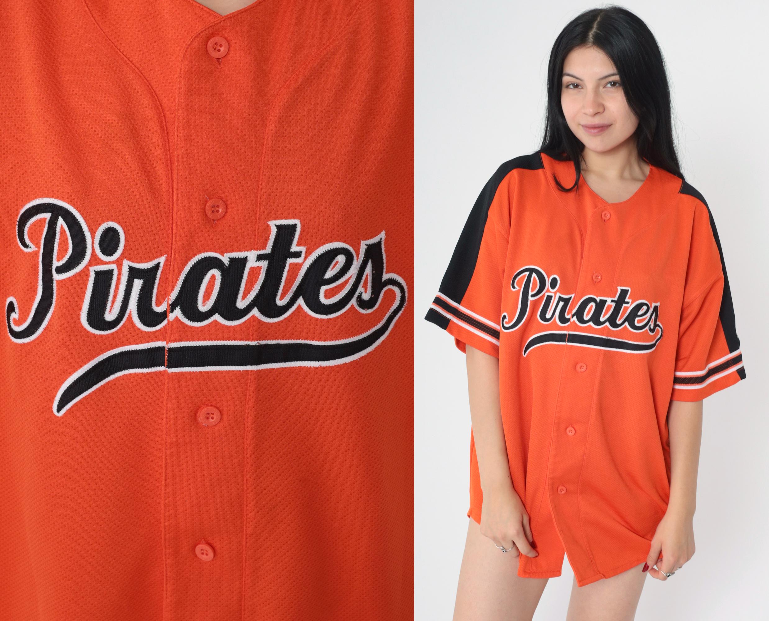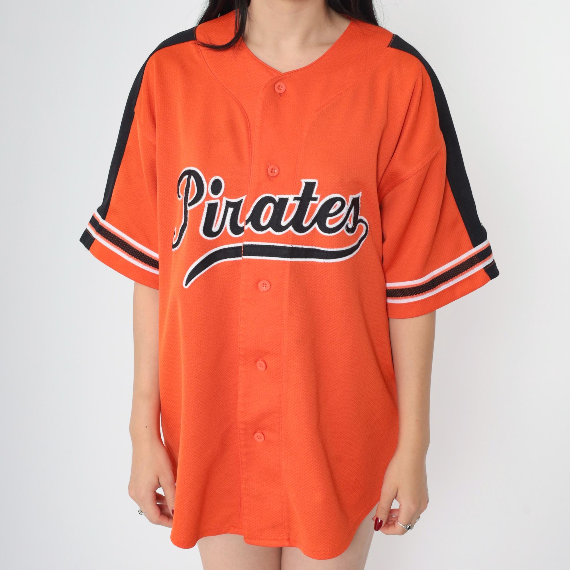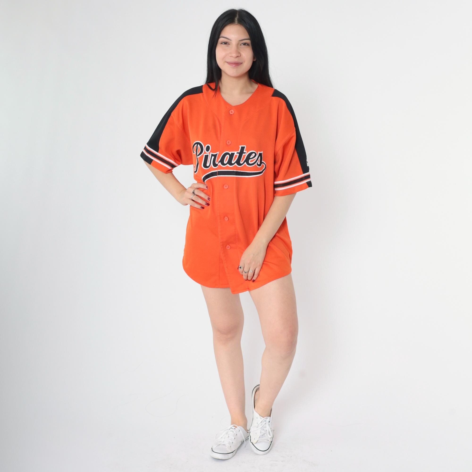 Vintage 90s Pittsburgh Pirates jersey by Starter. Buttons up the front and features short sleeves with stripes.