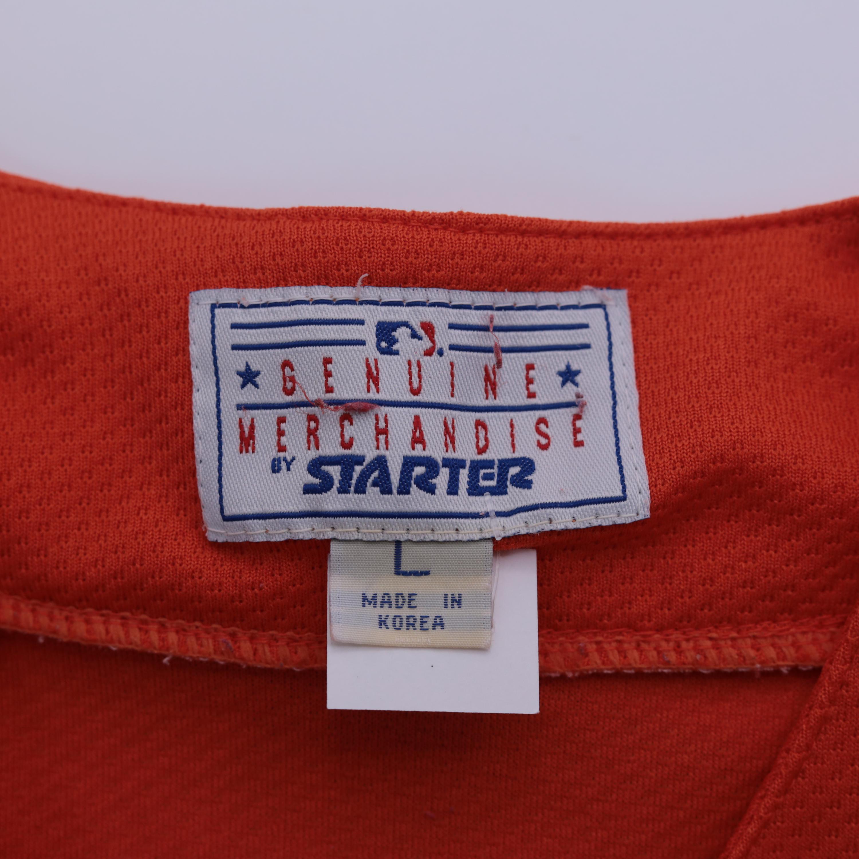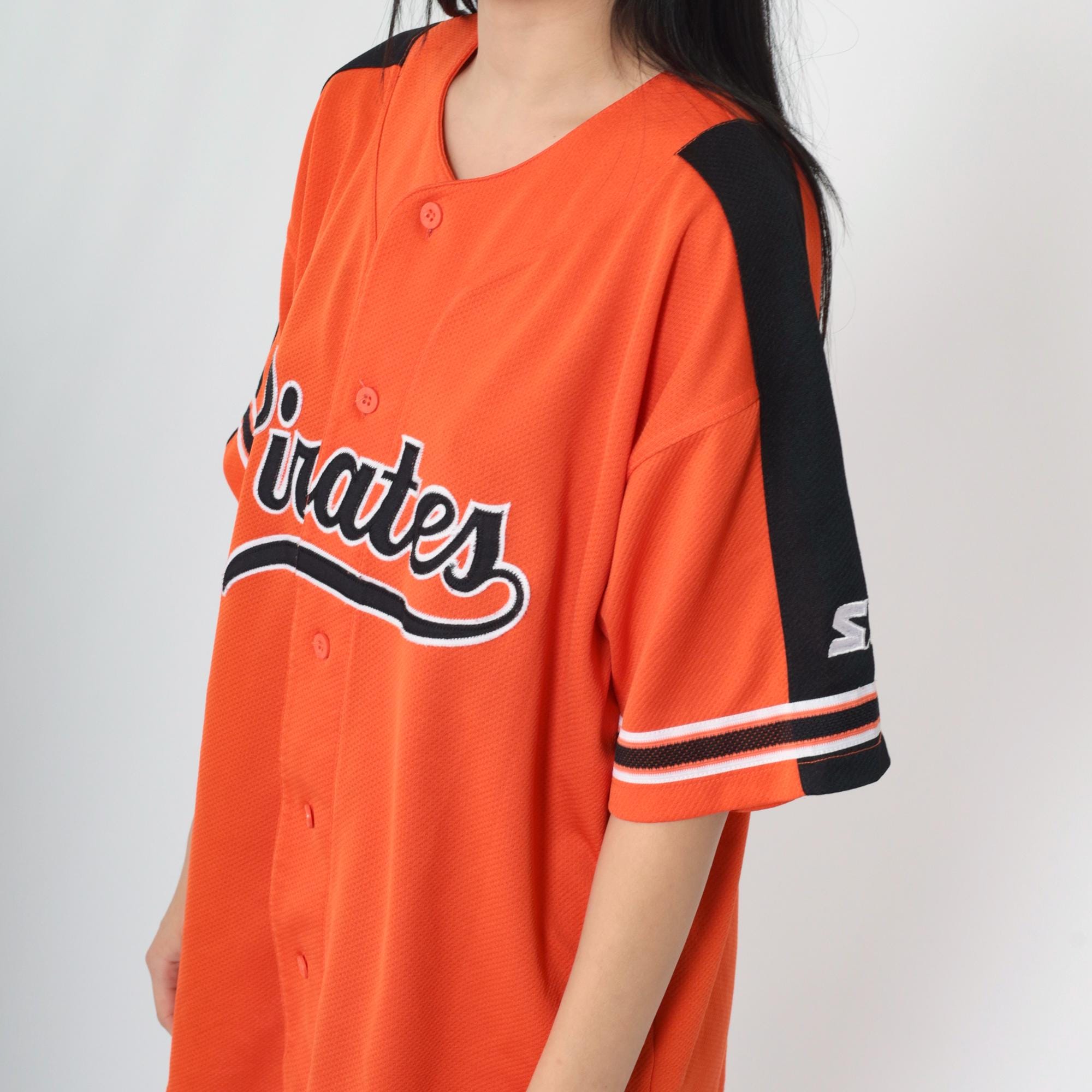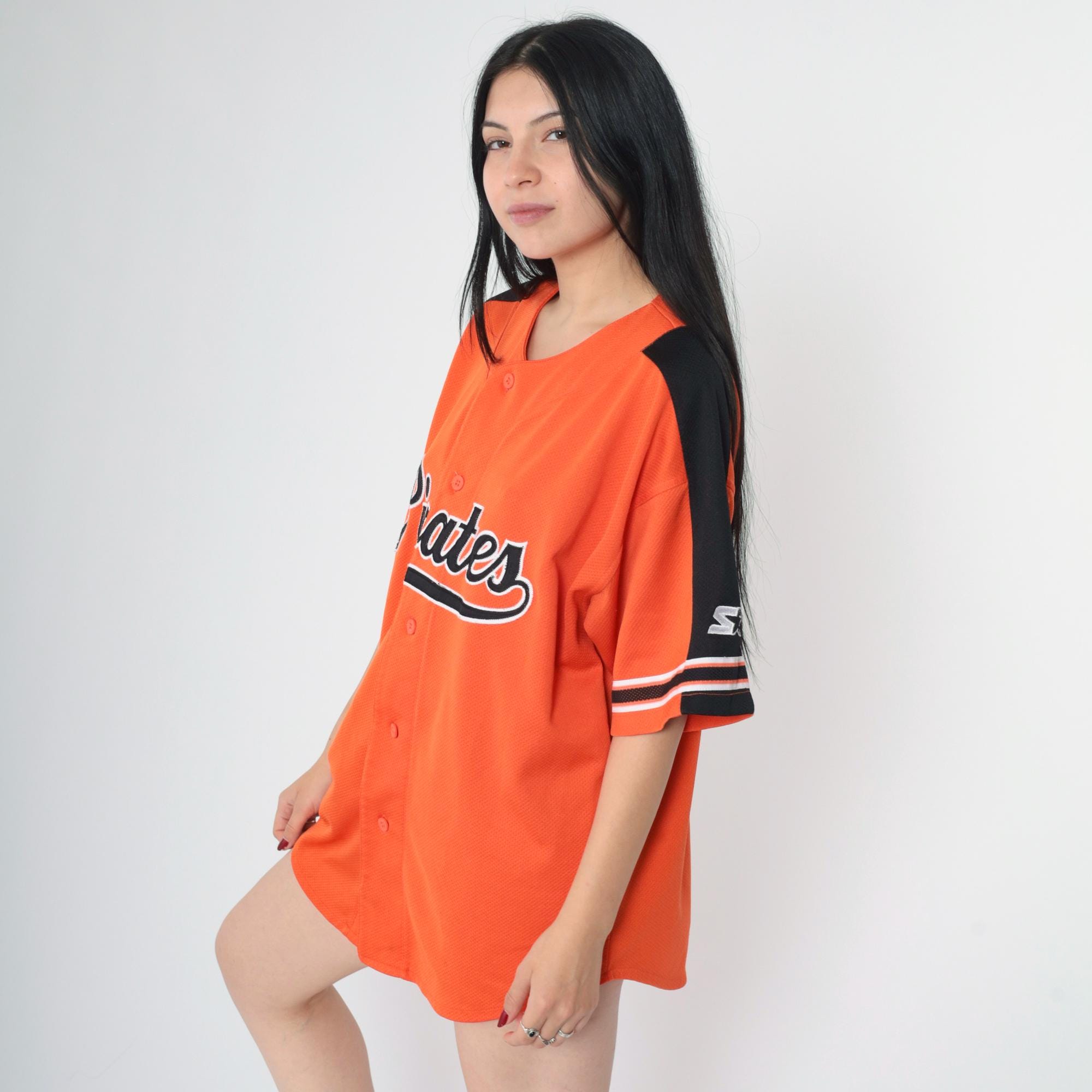 Vintage 90s Pittsburgh Pirates jersey by Starter. Buttons up the front and features short sleeves with stripes.