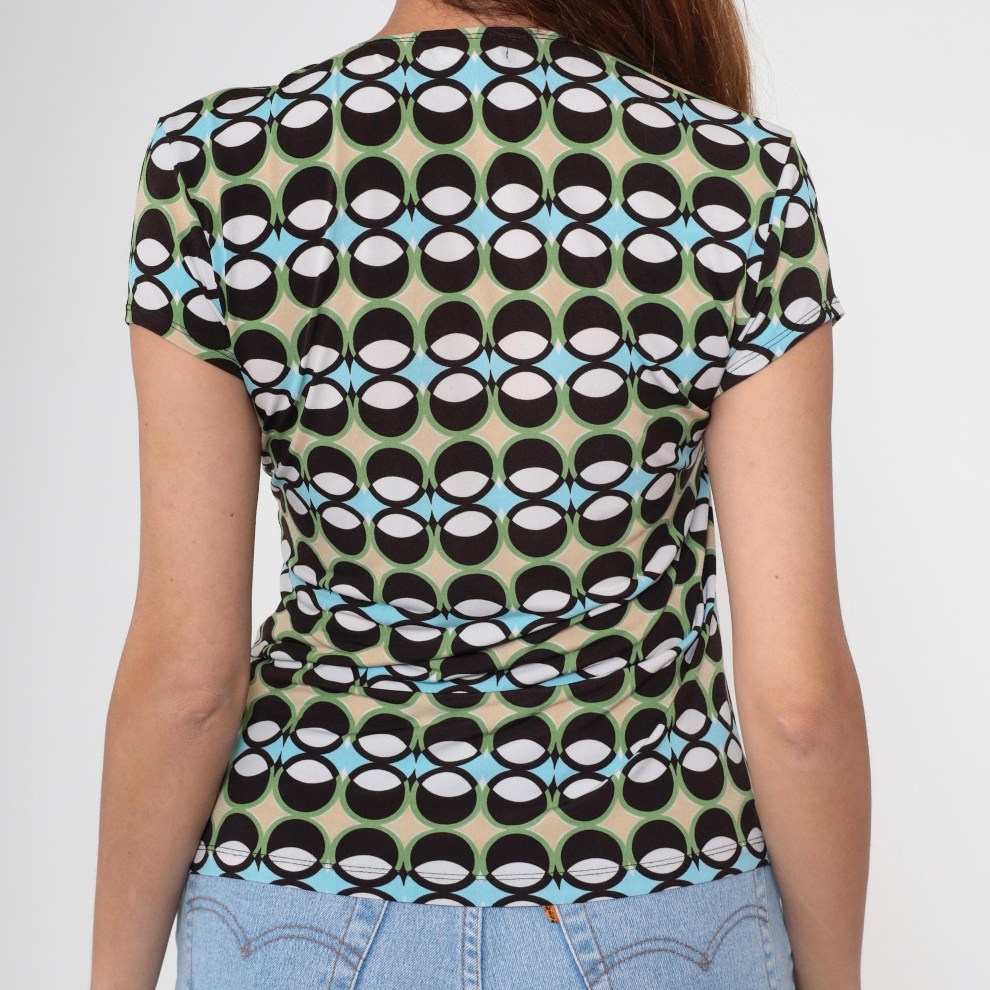 Vintage Y2K top with a bold geometric print in green, black, blue, and beige. Features a deep V-neckline with a statement black O-ring detail at the bust. Short sleeves and a stretchy, form-fitting silhouette.
