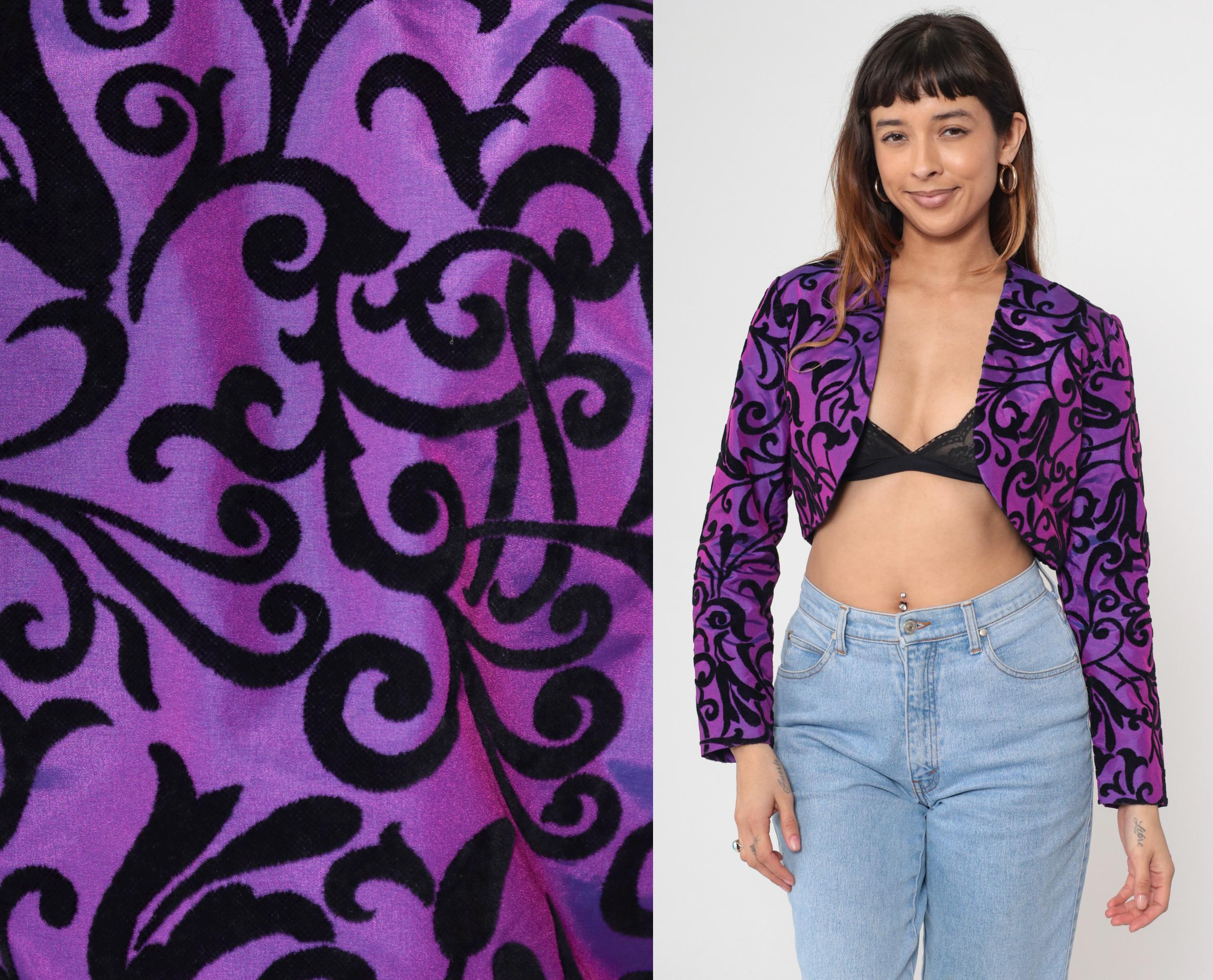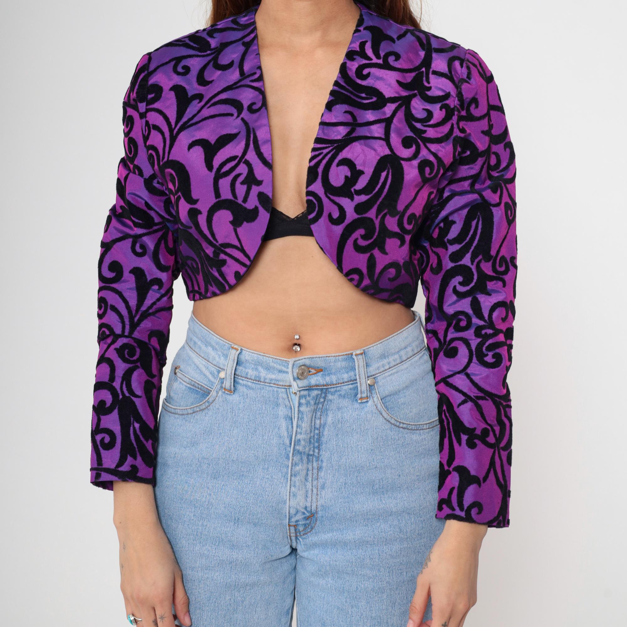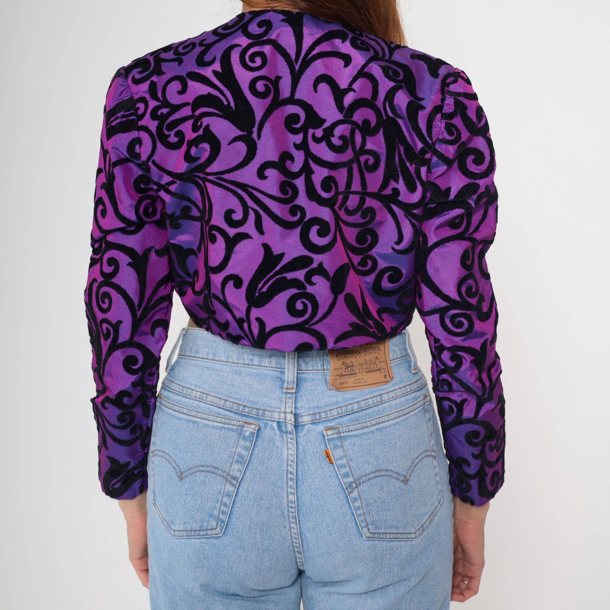 Vintage 80s bolero jacket in iridescent purple taffeta with black velvet flocked scroll print. Features a structured cropped fit with long puff sleeves. Open front with no closures.