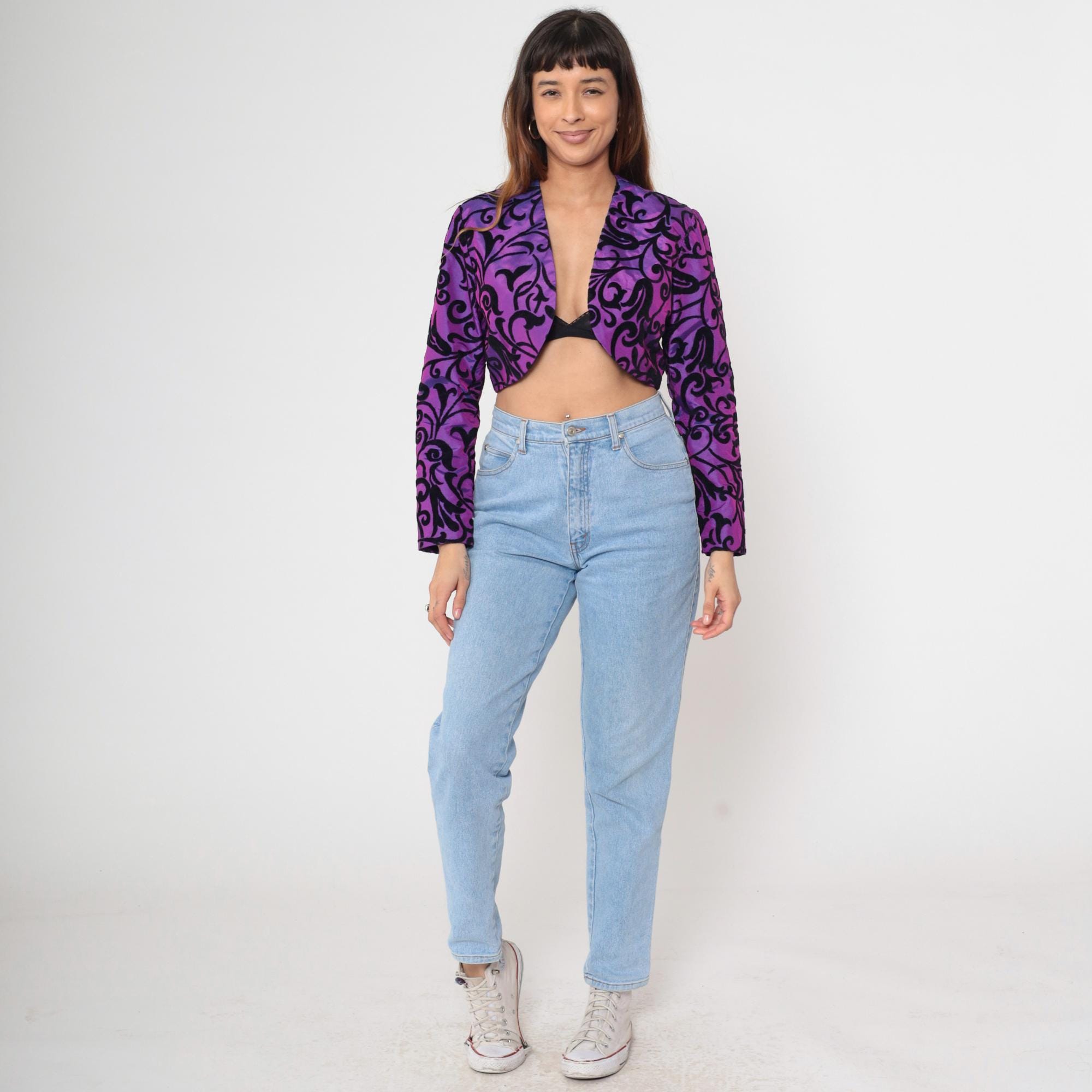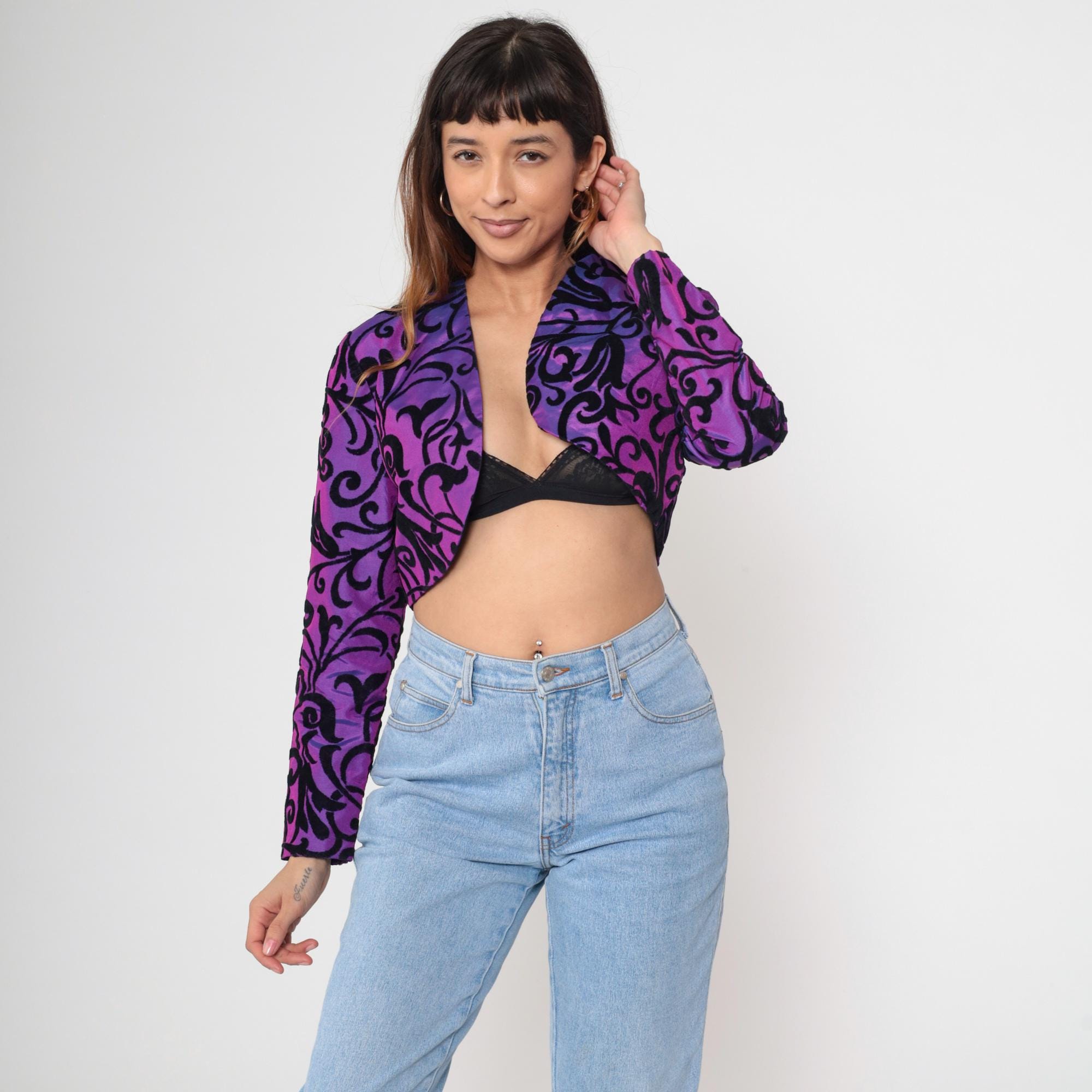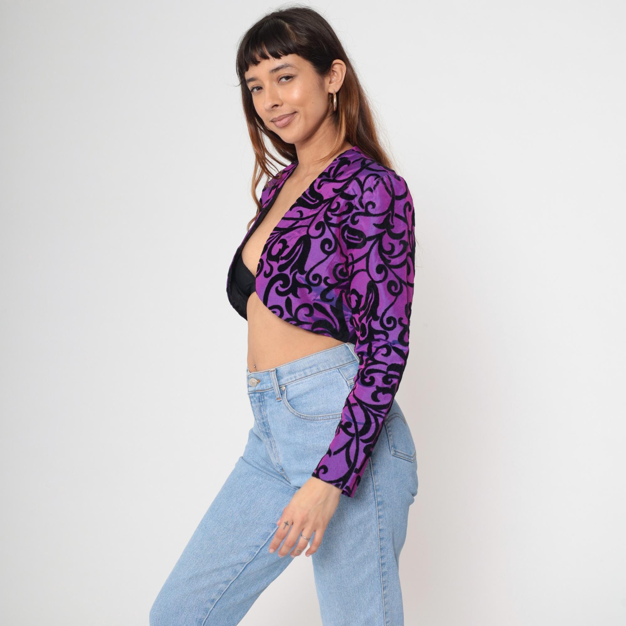 Vintage 80s bolero jacket in iridescent purple taffeta with black velvet flocked scroll print. Features a structured cropped fit with long puff sleeves. Open front with no closures.