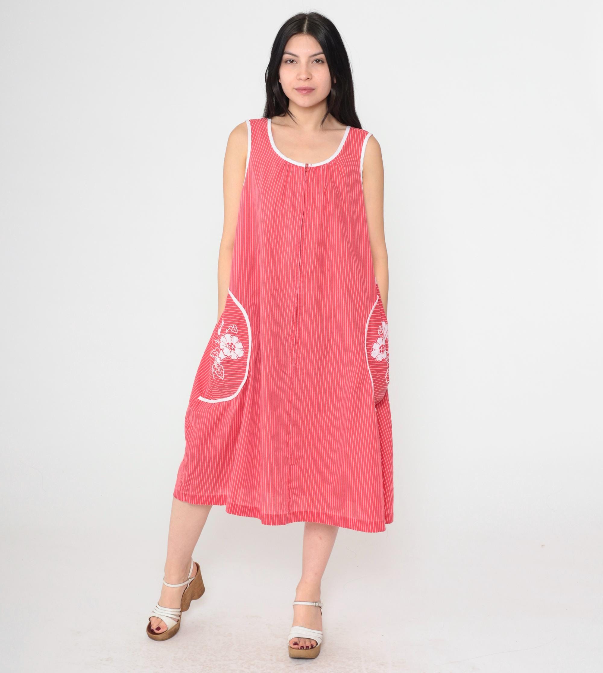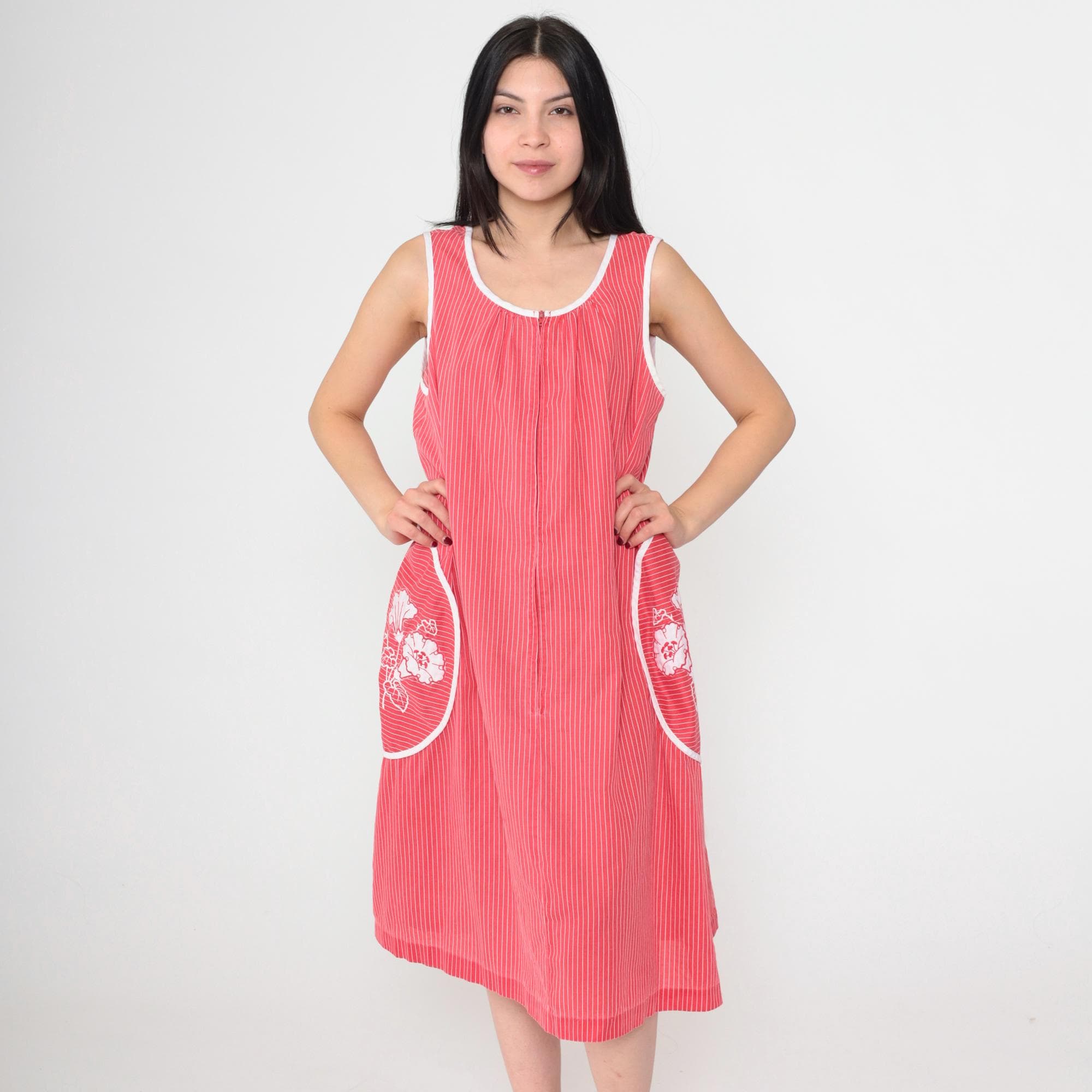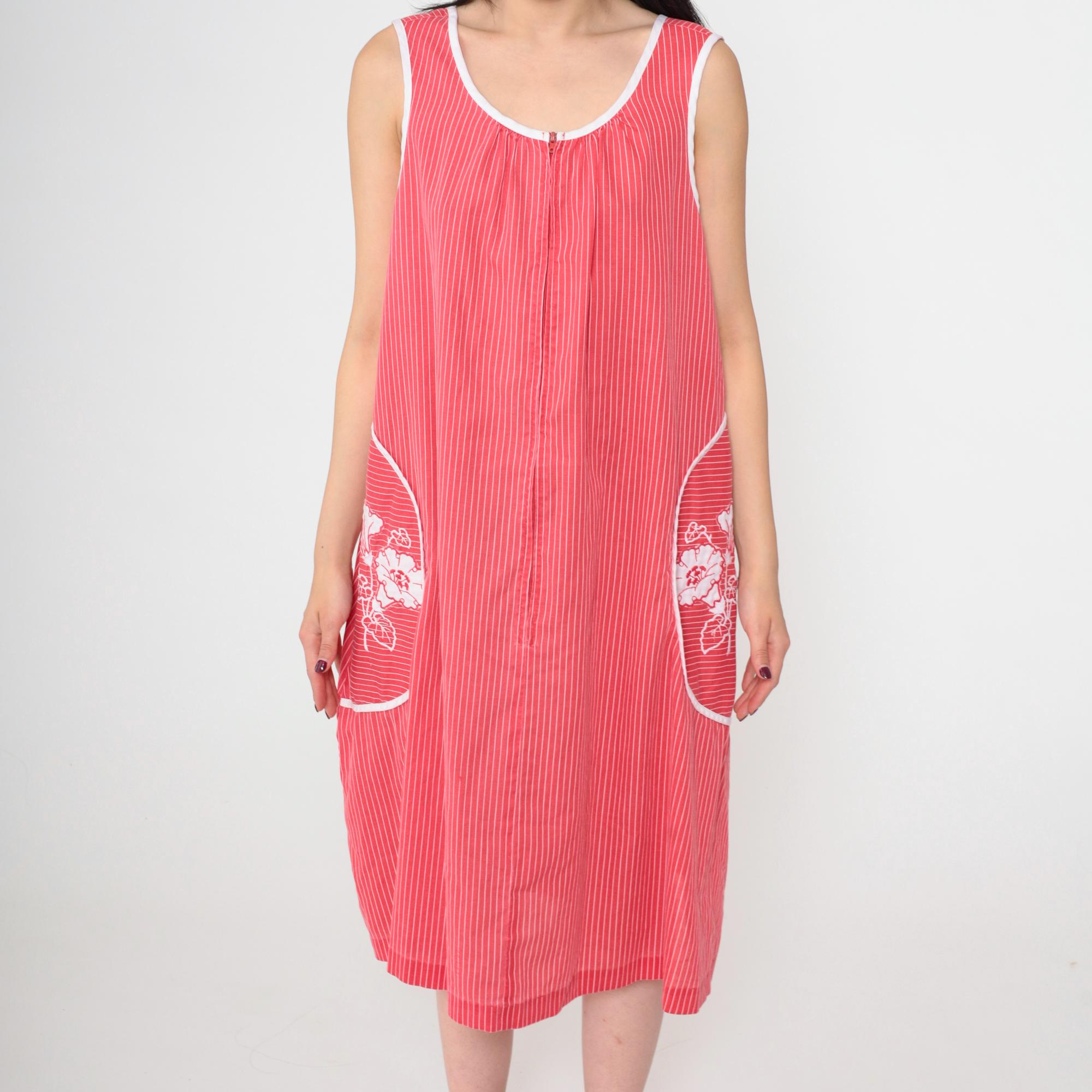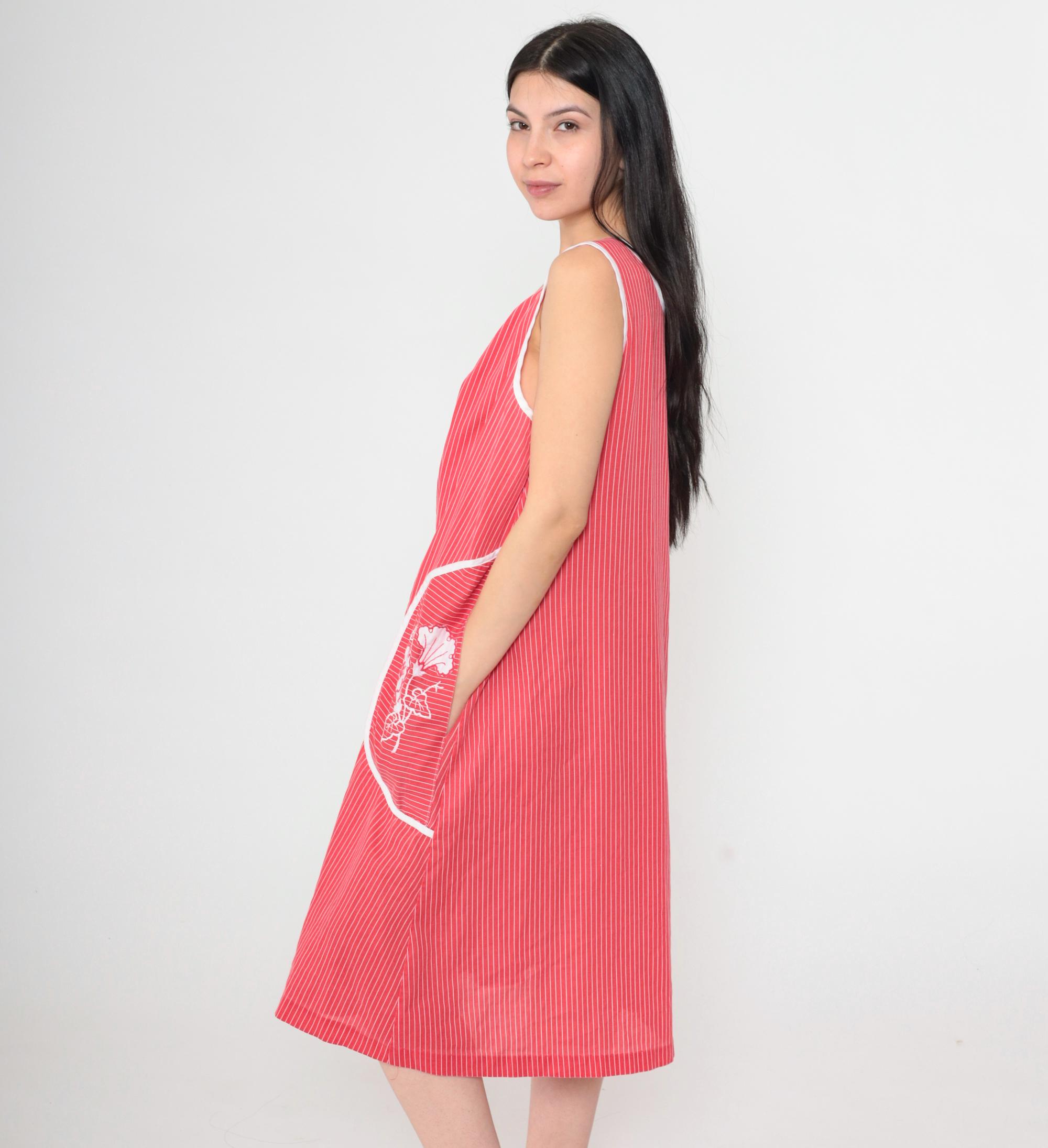 Vintage 80s red striped midi dress featuring white floral embroidery on two large front pockets. Sleeveless design with a scoop neckline, a front zipper and a loose fit.
