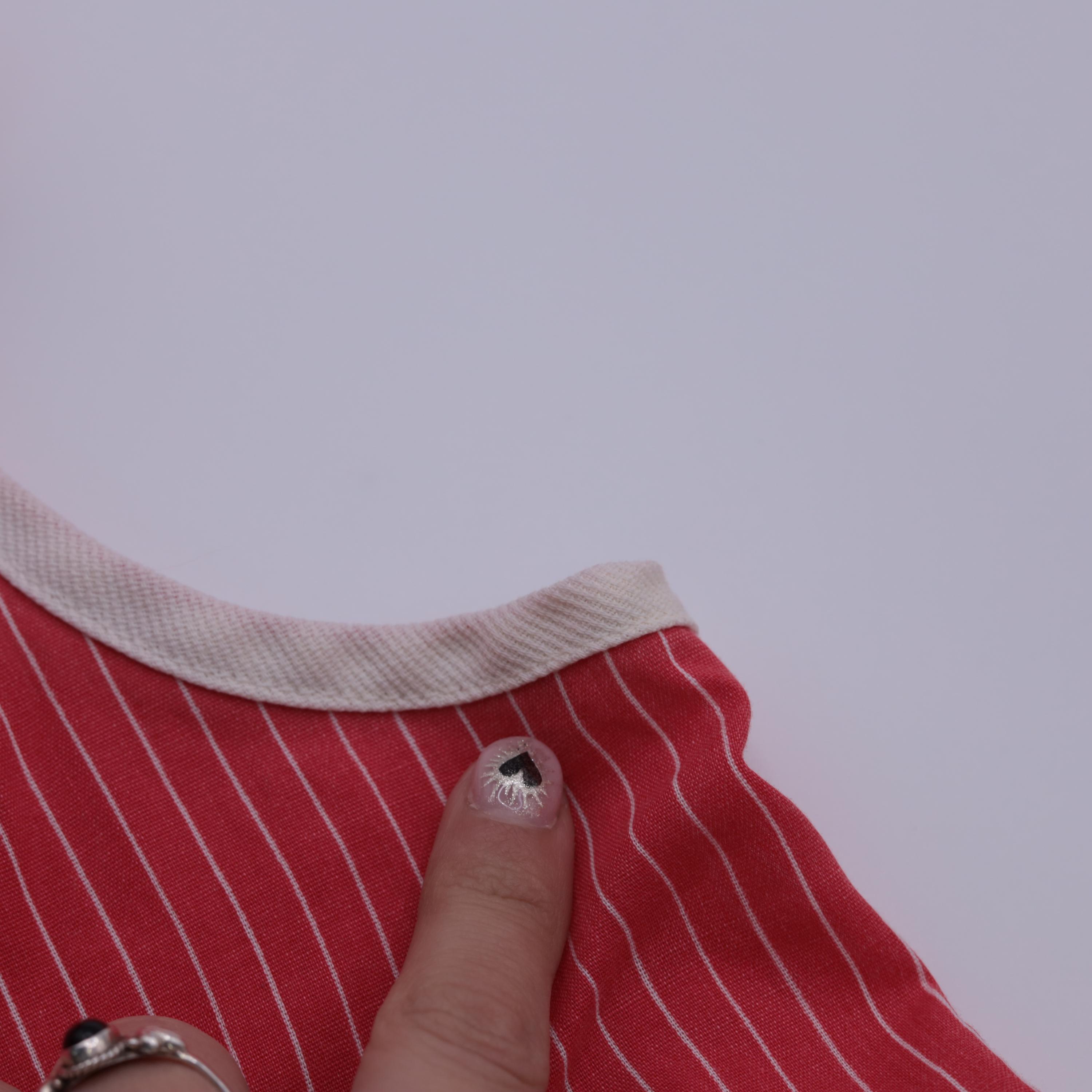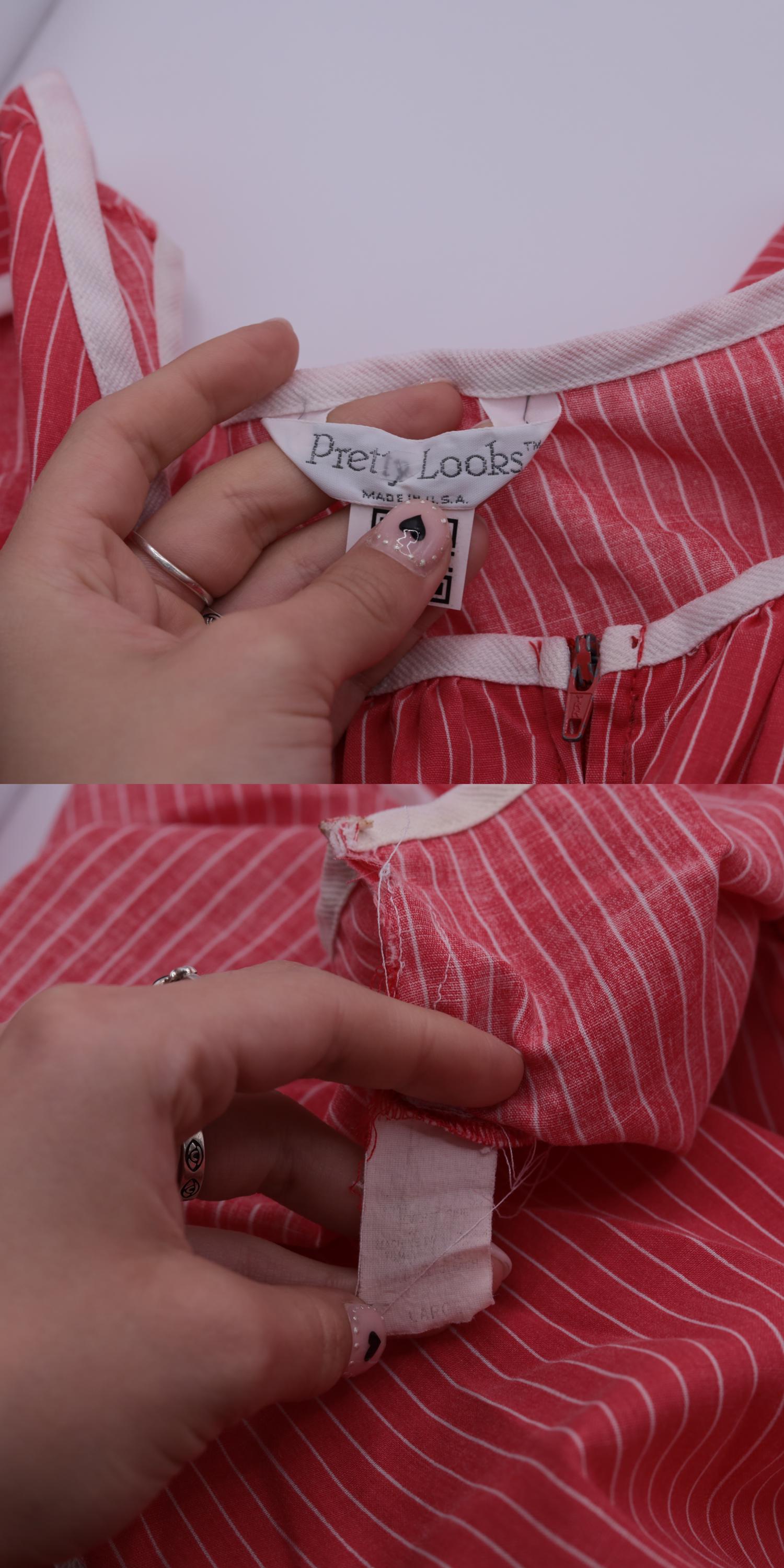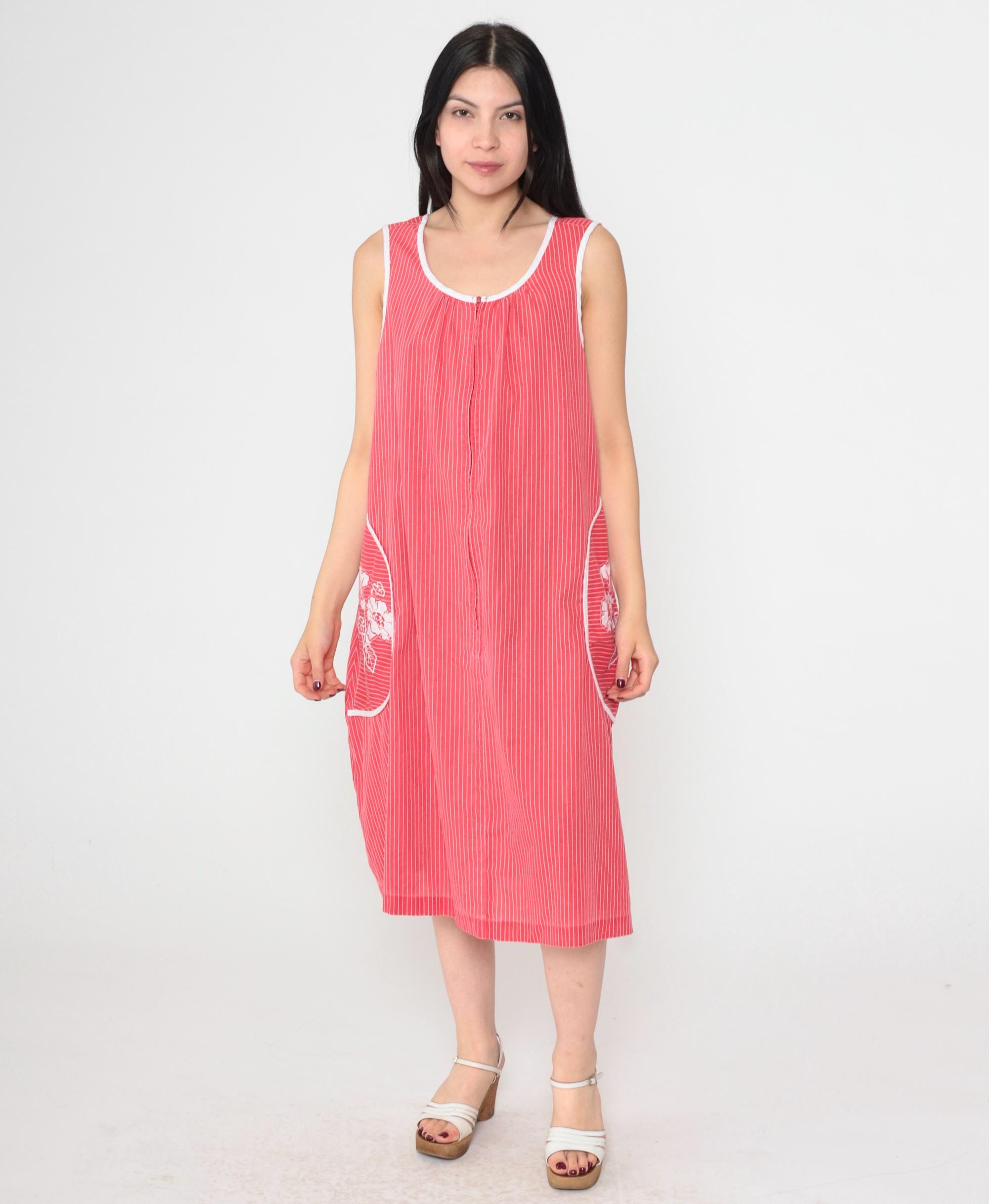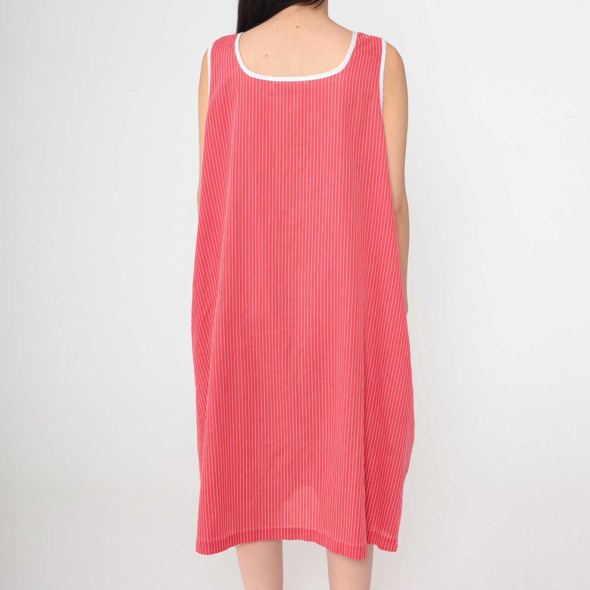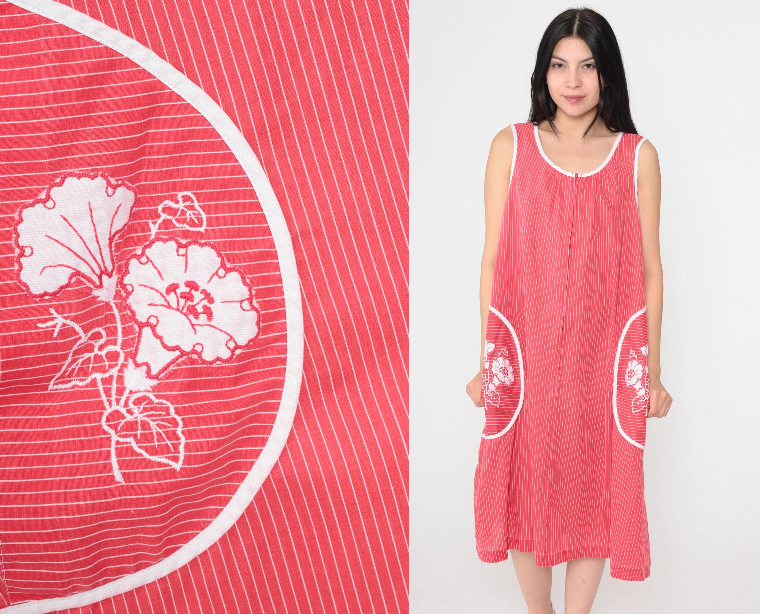 Vintage 80s red striped midi dress featuring white floral embroidery on two large front pockets. Sleeveless design with a scoop neckline, a front zipper and a loose fit.