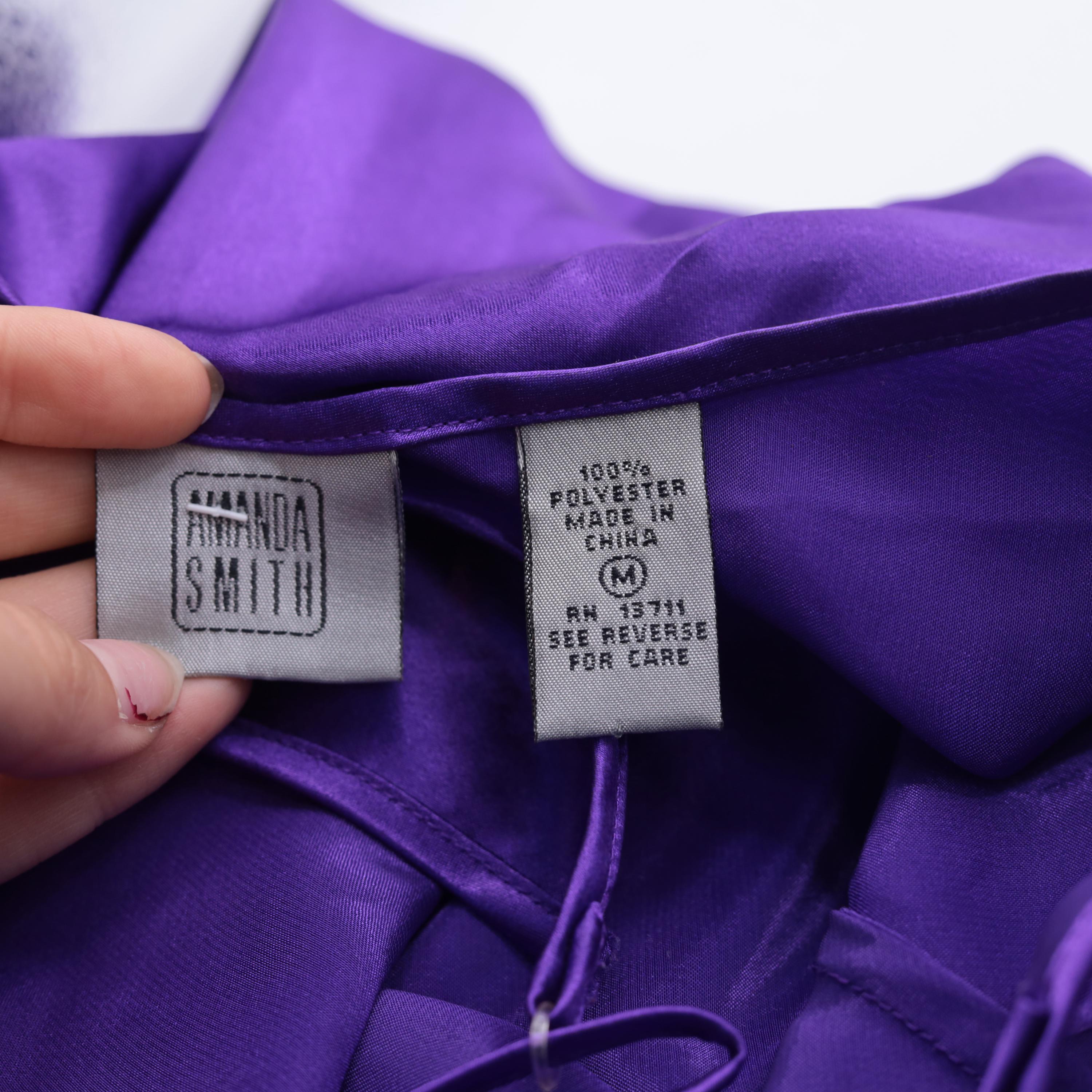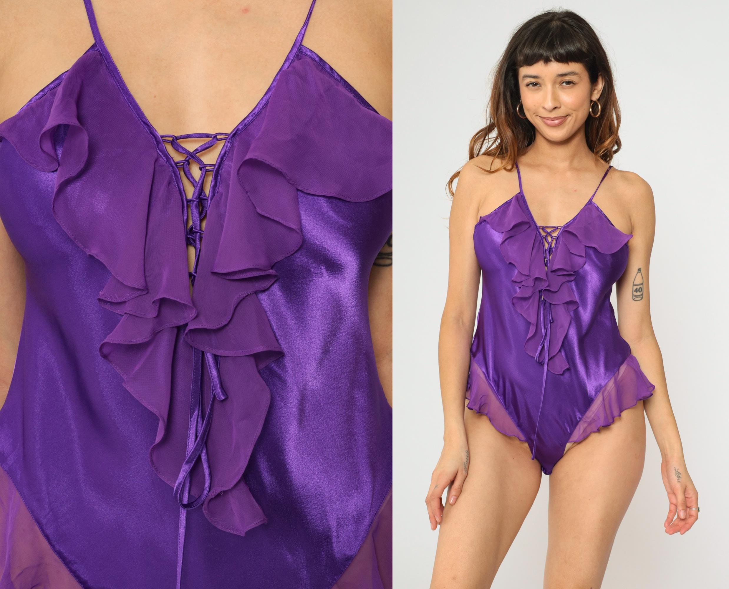Vintage 90s lingerie teddy romper in purple satin with ruffled chiffon trim. Sleeveless with a low back and a lace up tie in the front.