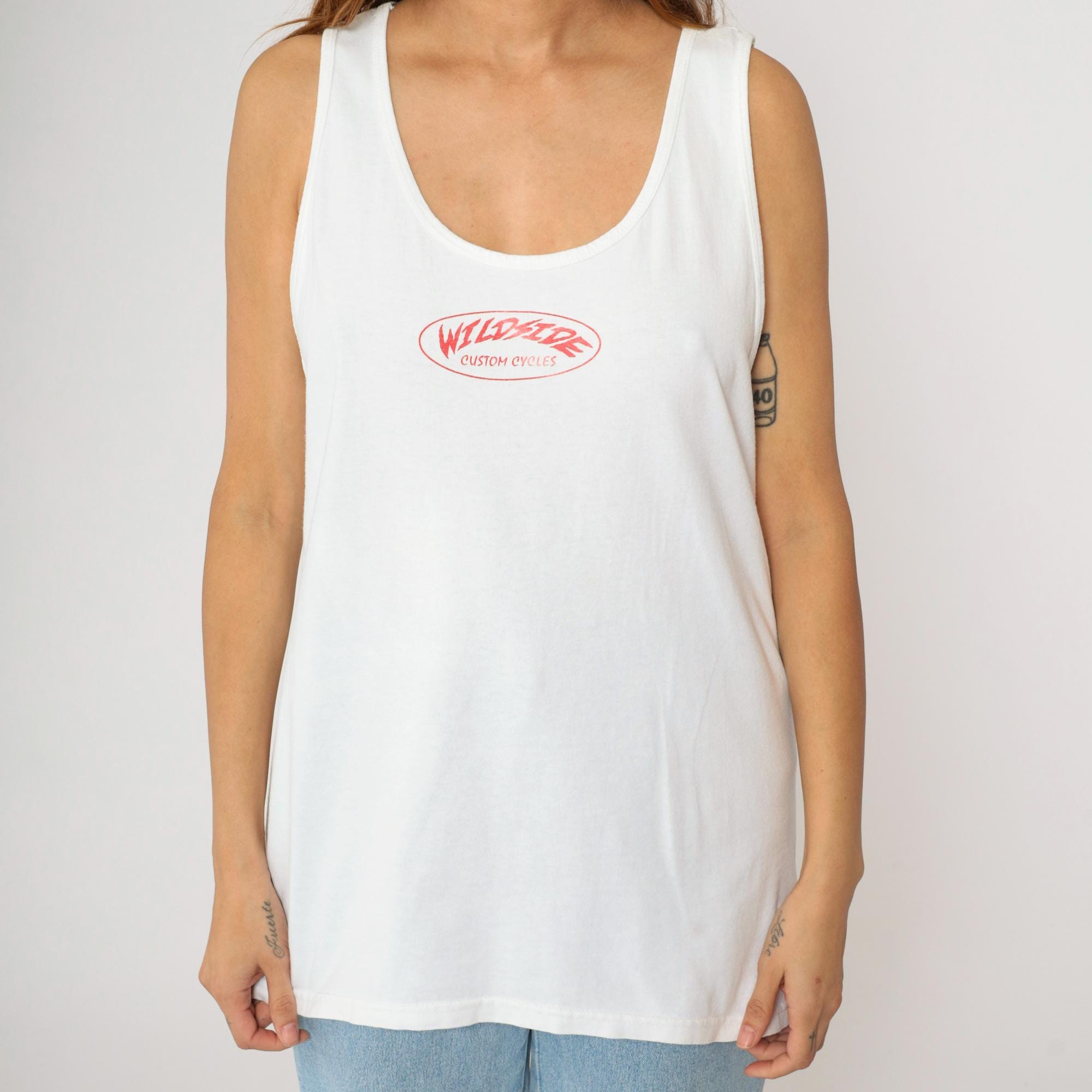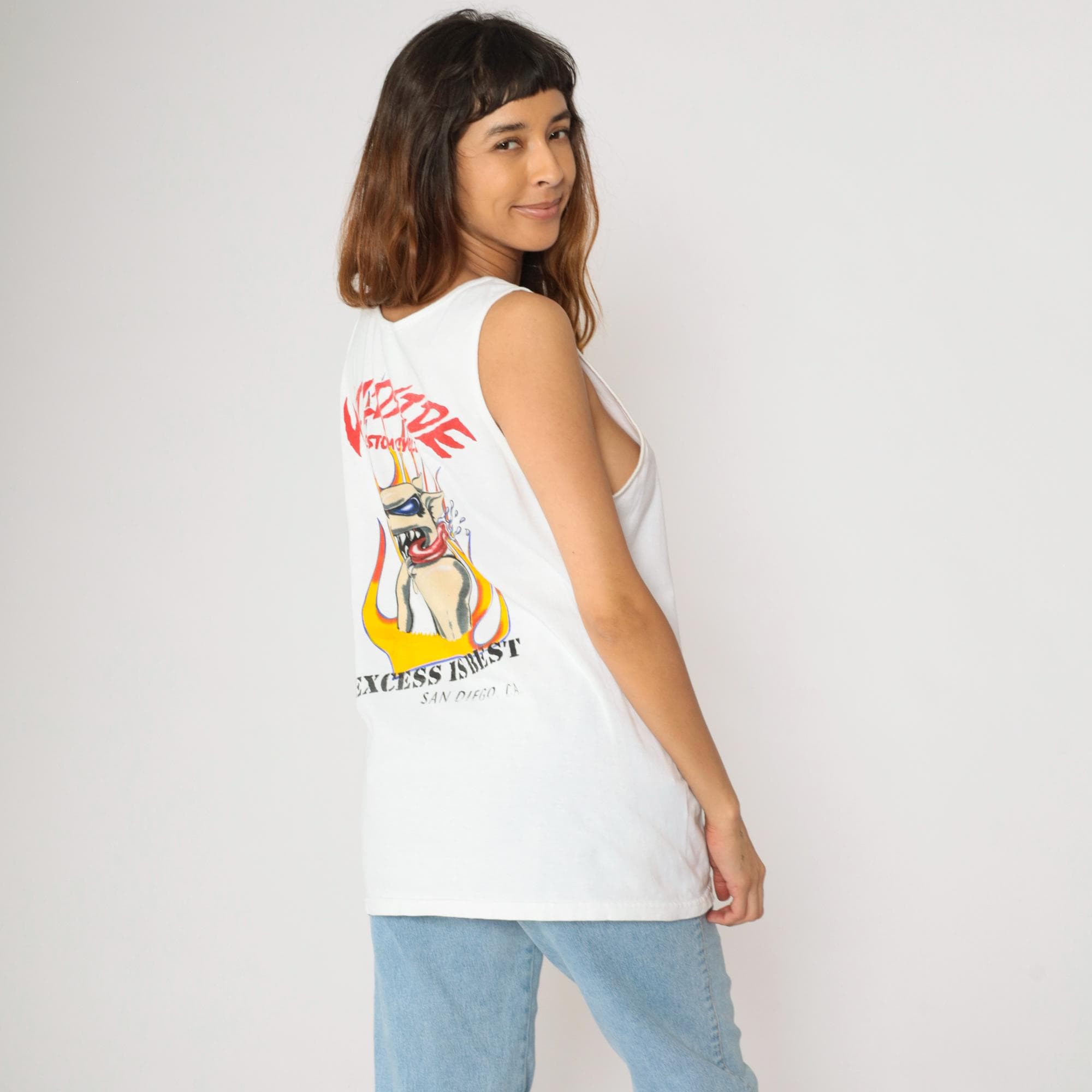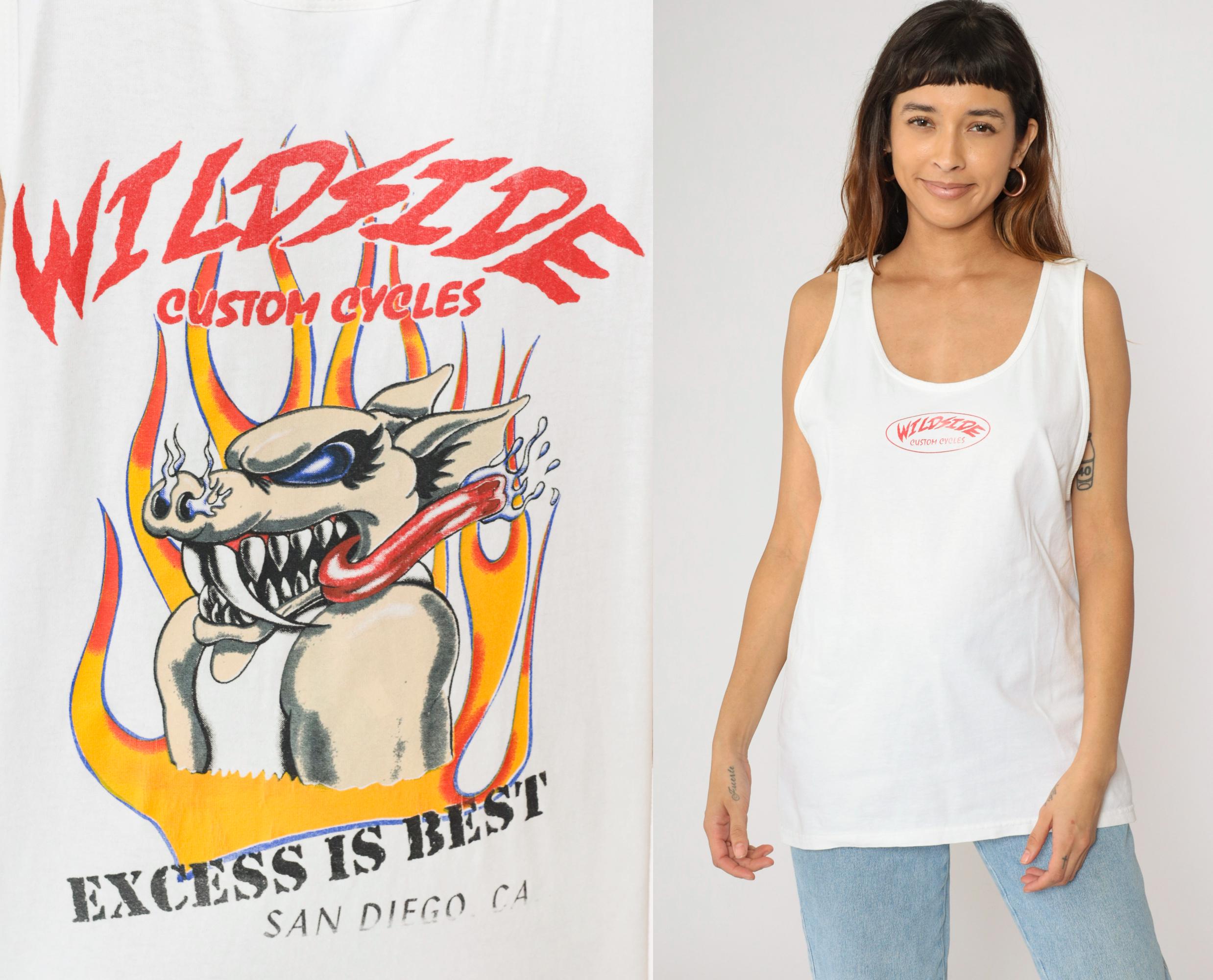 Vintage 90s Wildside Custom Cycles tank top in white. Features a front logo and a back graphic with a snarling animal, flames, and "Excess is Best" lettering. Classic sleeveless cut with a scoop neckline.