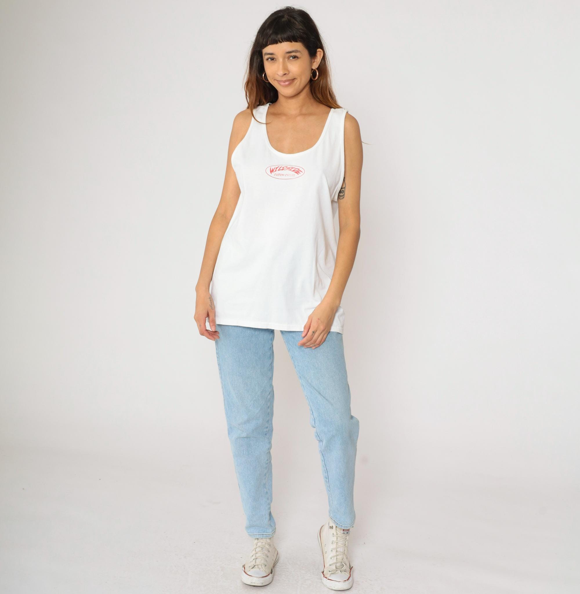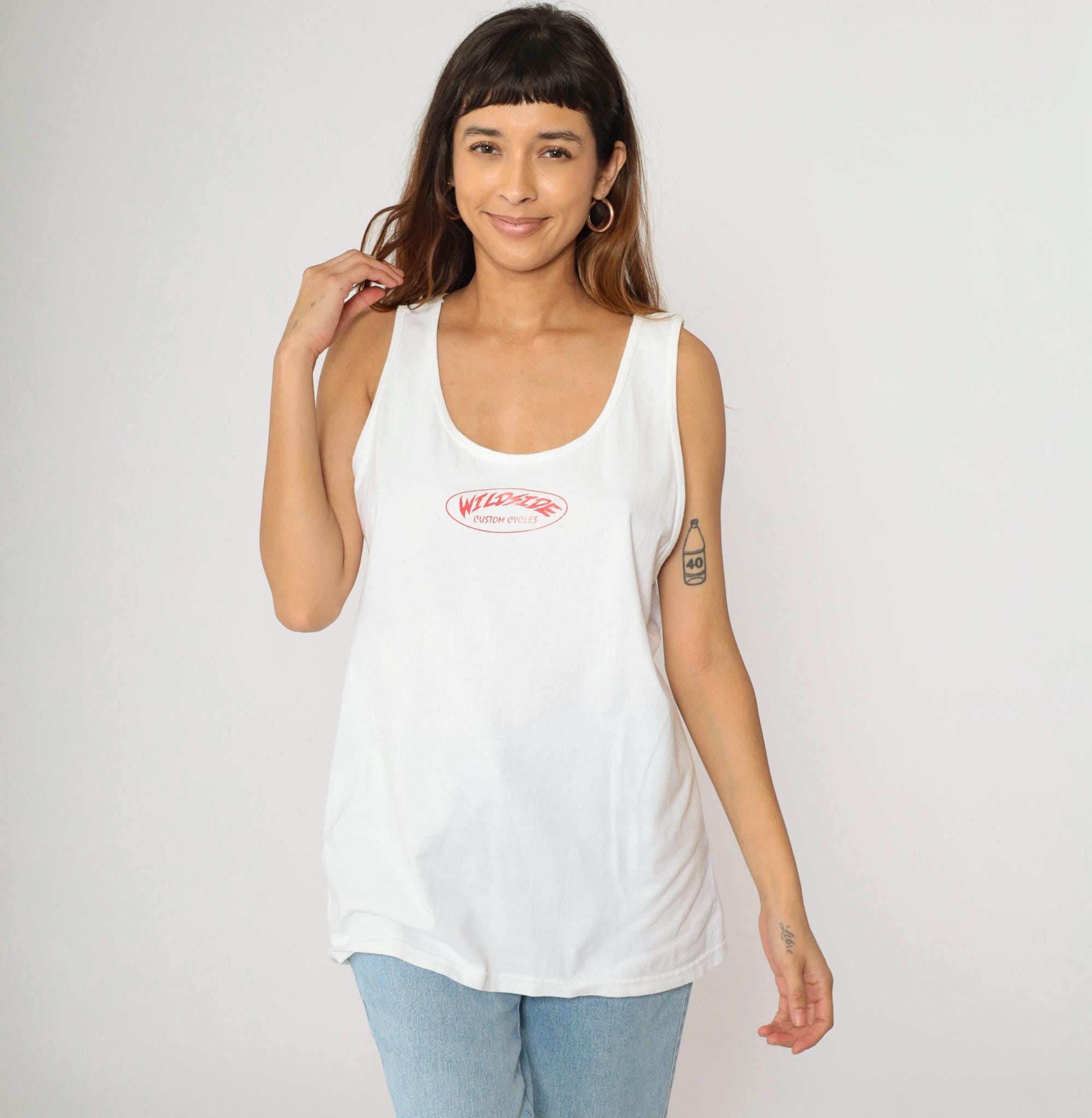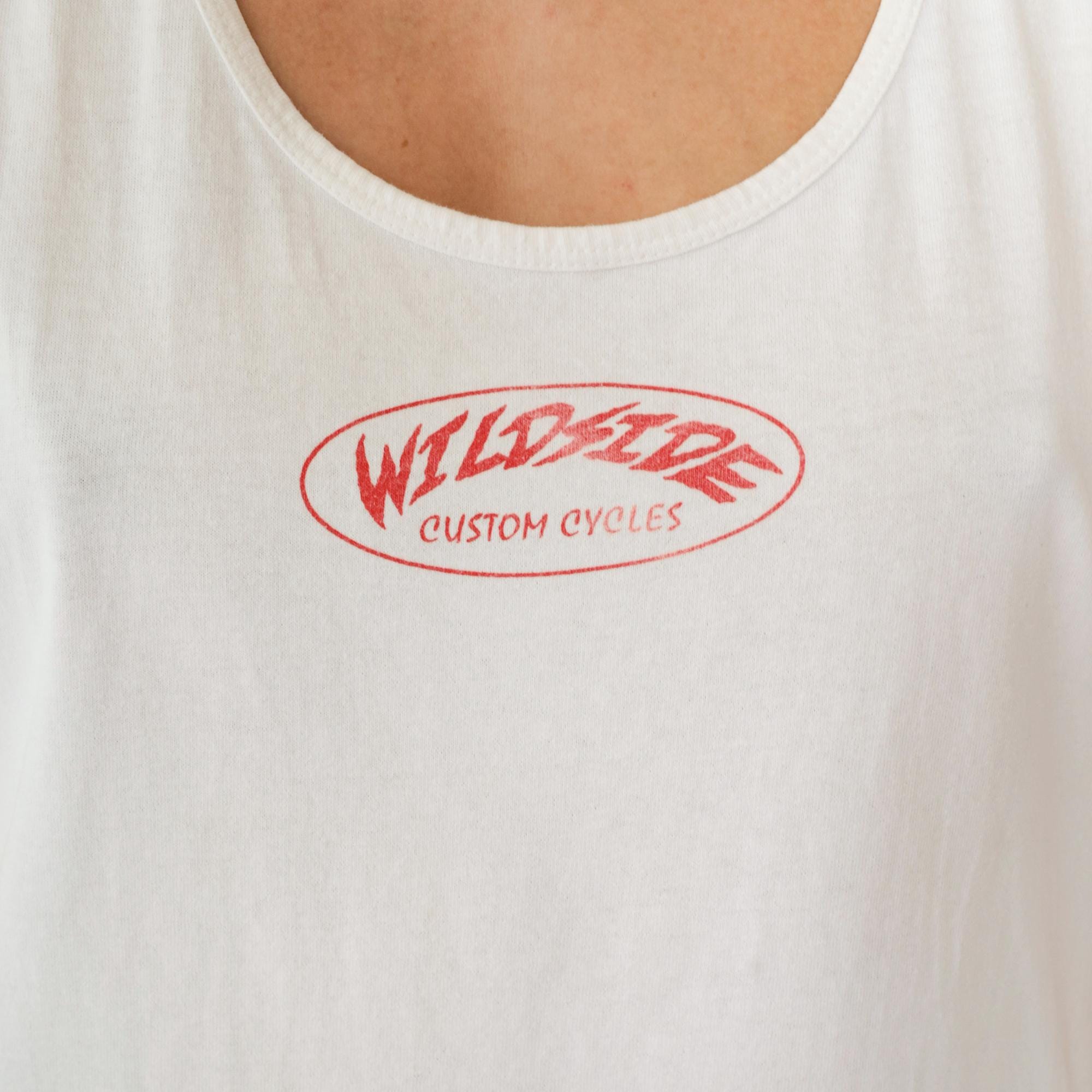 Vintage 90s Wildside Custom Cycles tank top in white. Features a front logo and a back graphic with a snarling animal, flames, and "Excess is Best" lettering. Classic sleeveless cut with a scoop neckline.