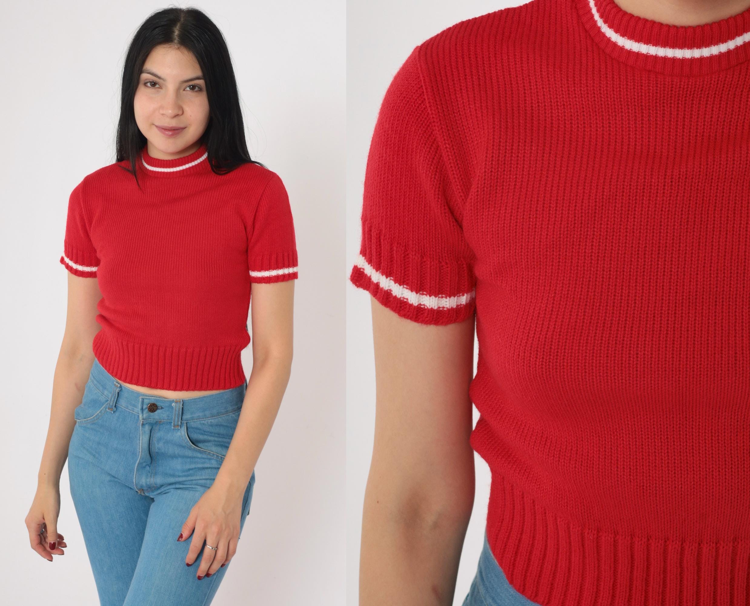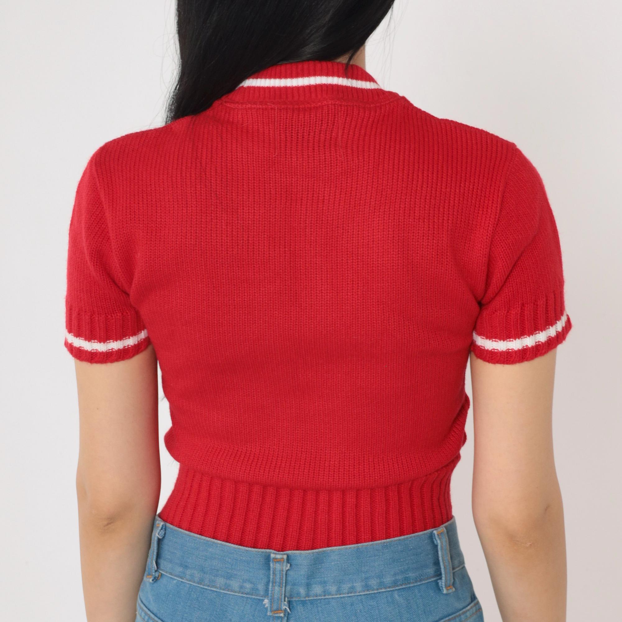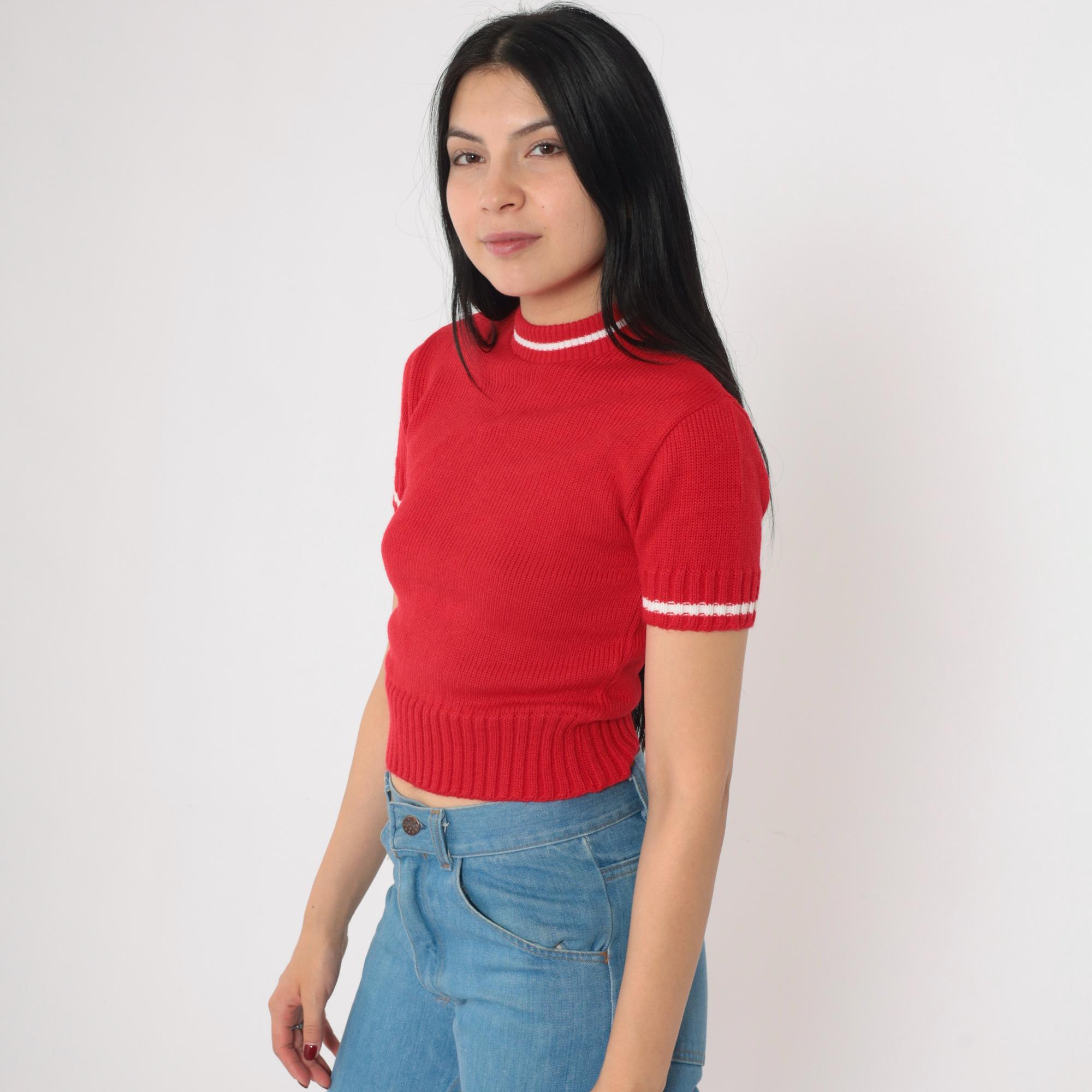Vintage 70s red varsity-style knit sweater with short sleeves and white striped ribbed trim. Features a high crew neck and cropped fit with a thick ribbed waistband.