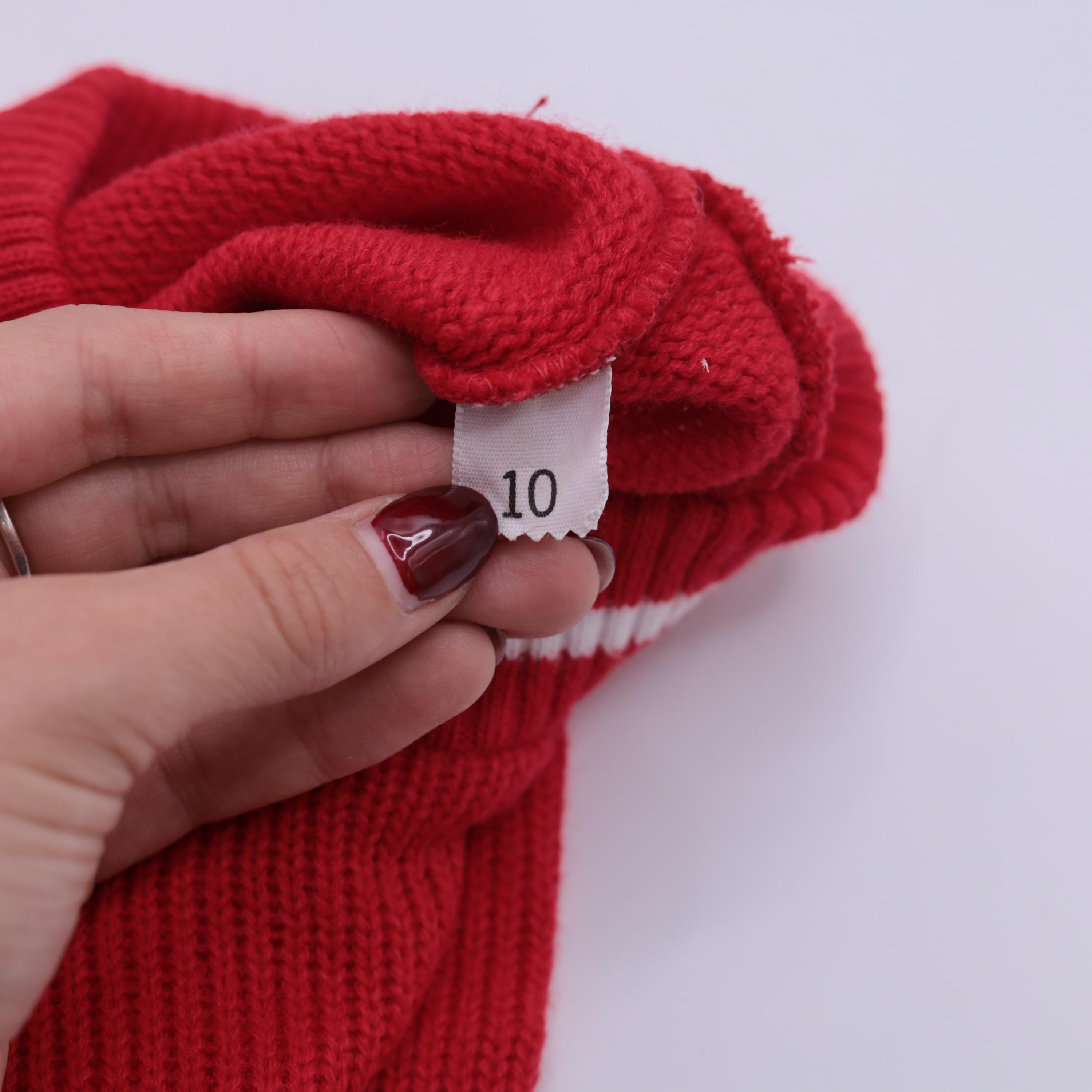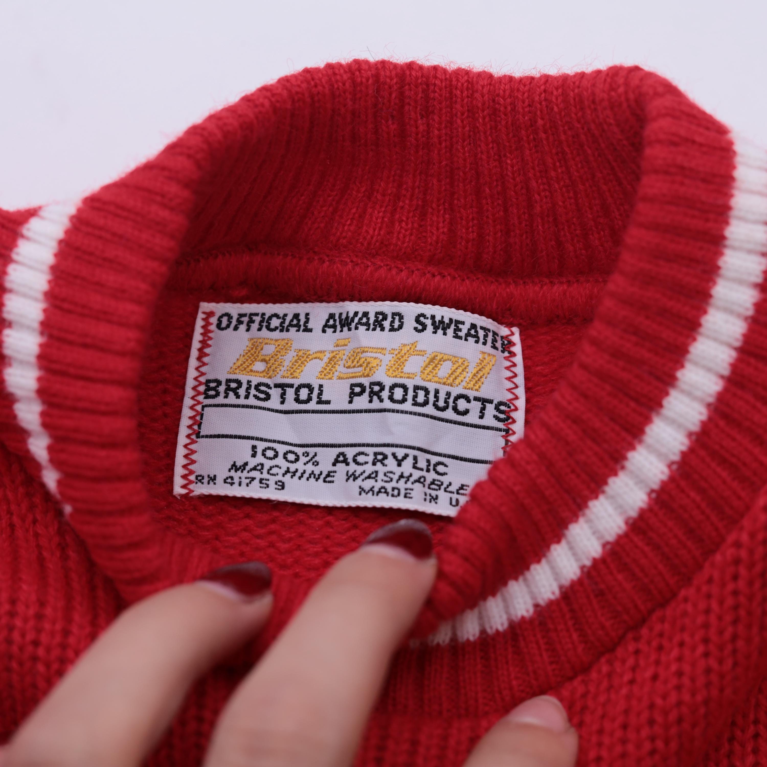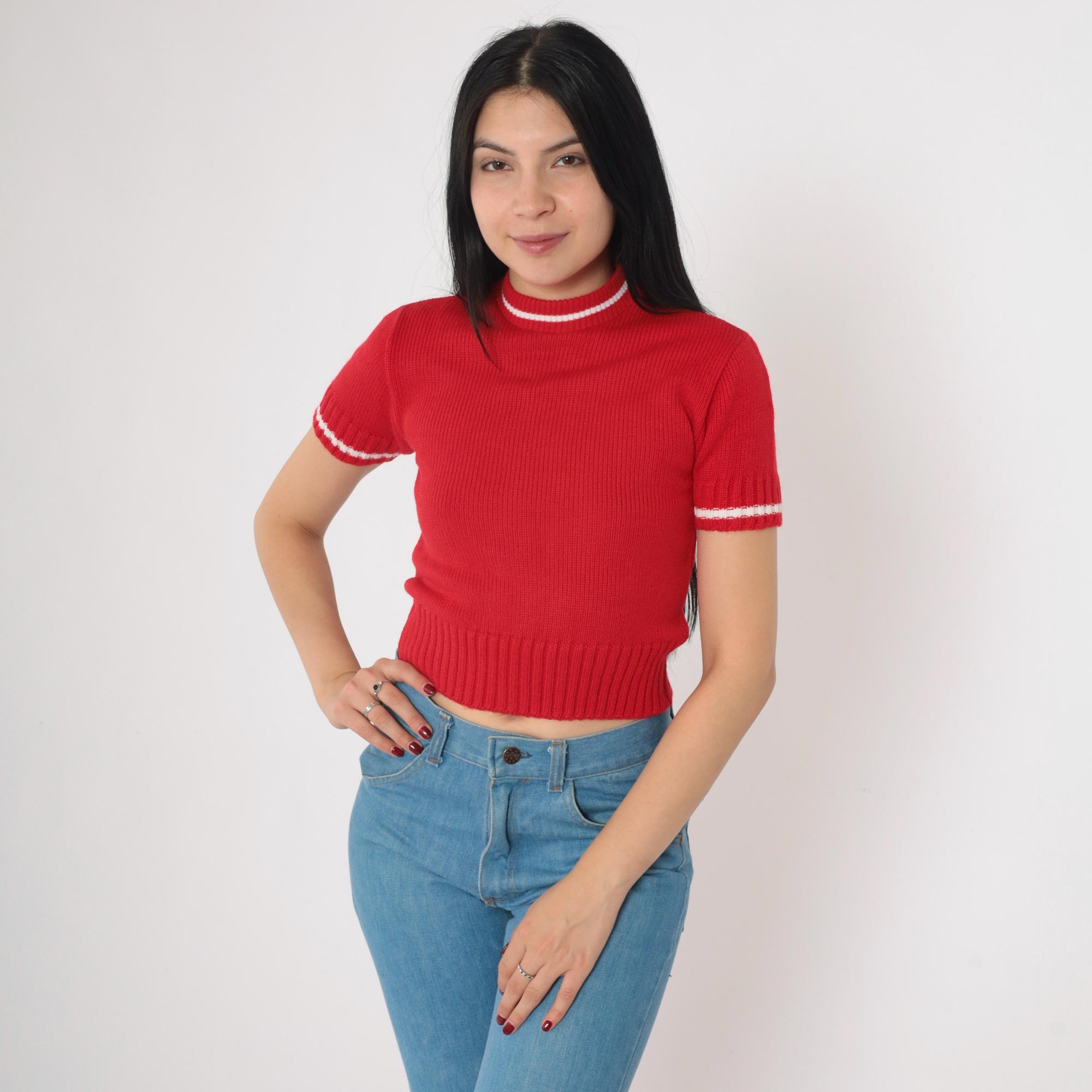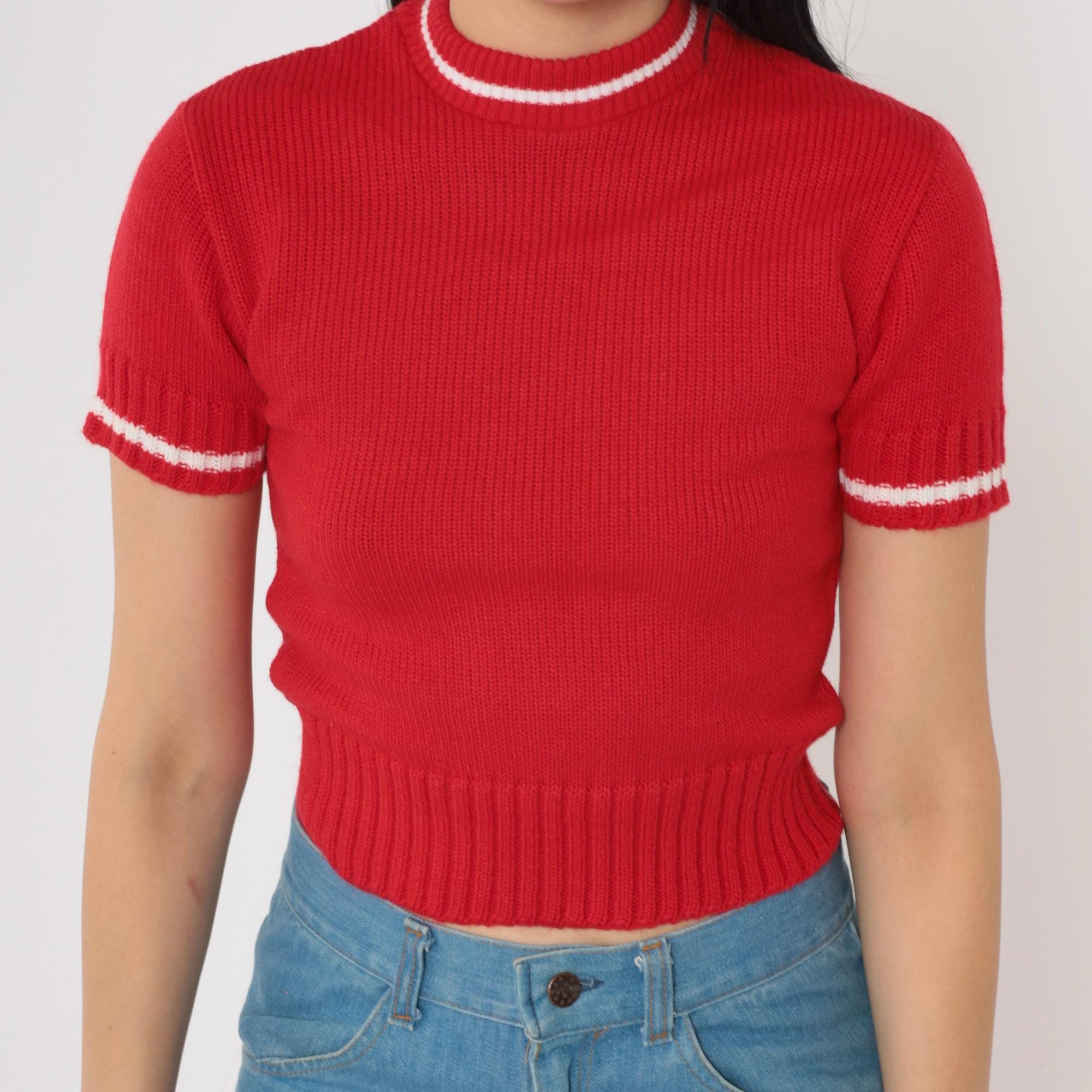 Vintage 70s red varsity-style knit sweater with short sleeves and white striped ribbed trim. Features a high crew neck and cropped fit with a thick ribbed waistband.