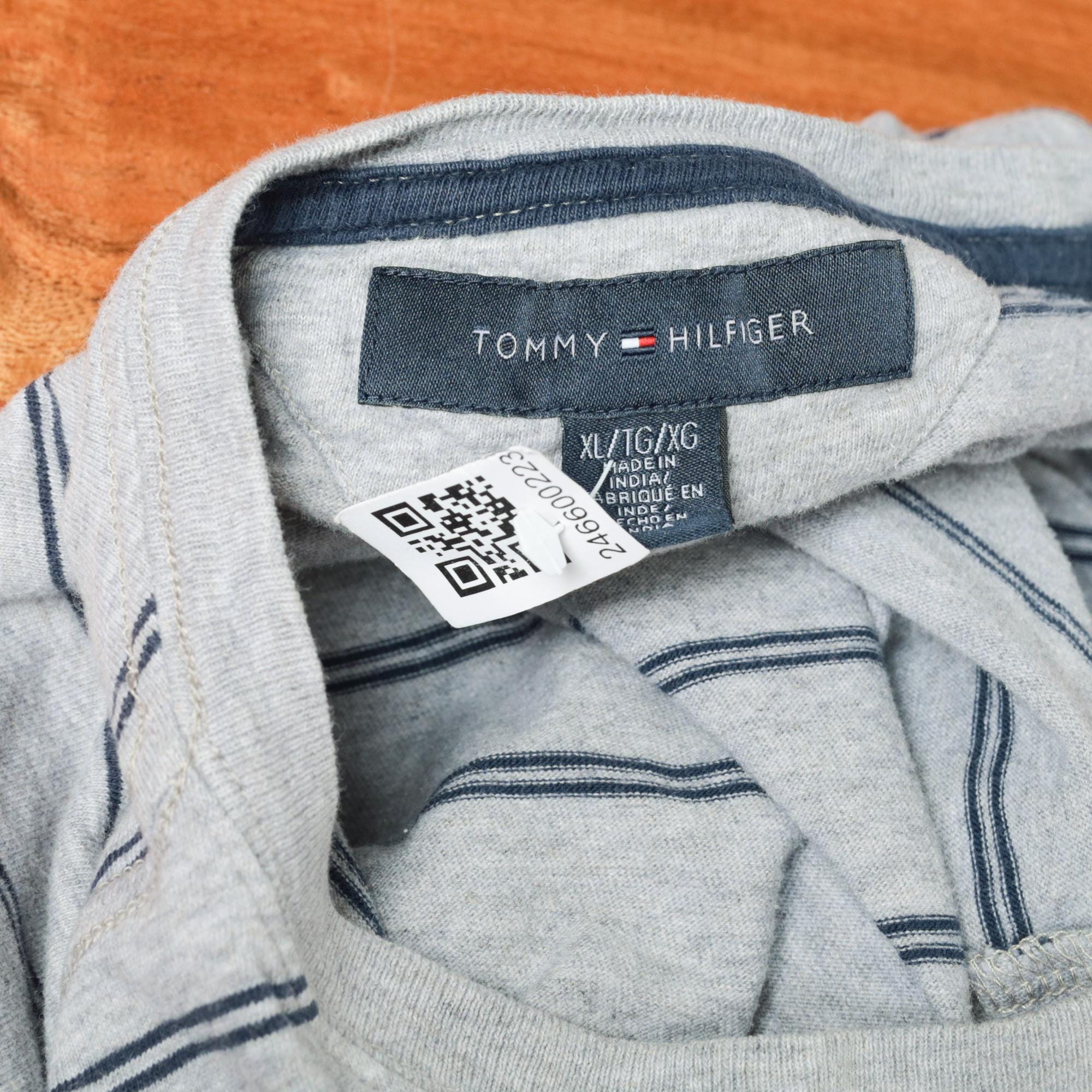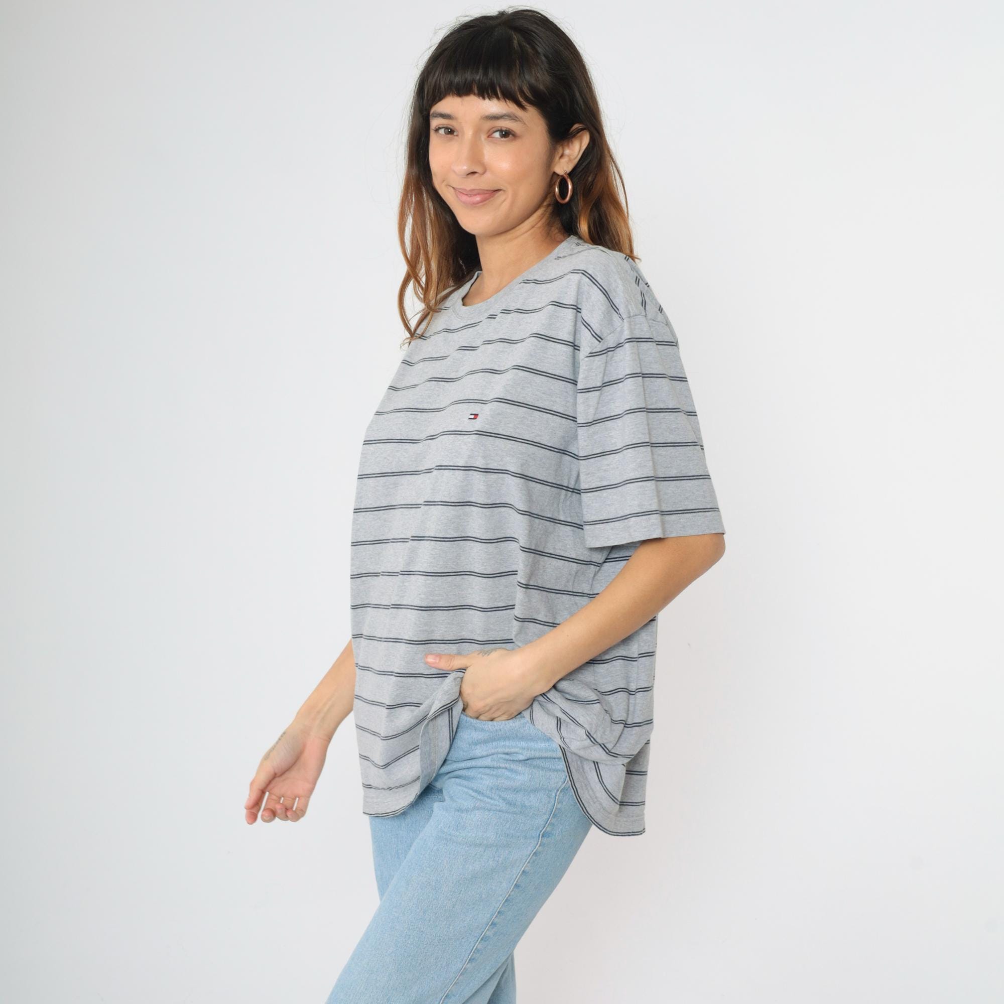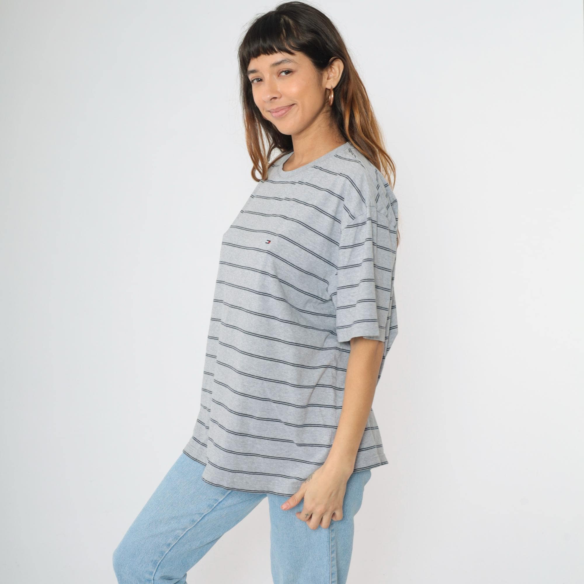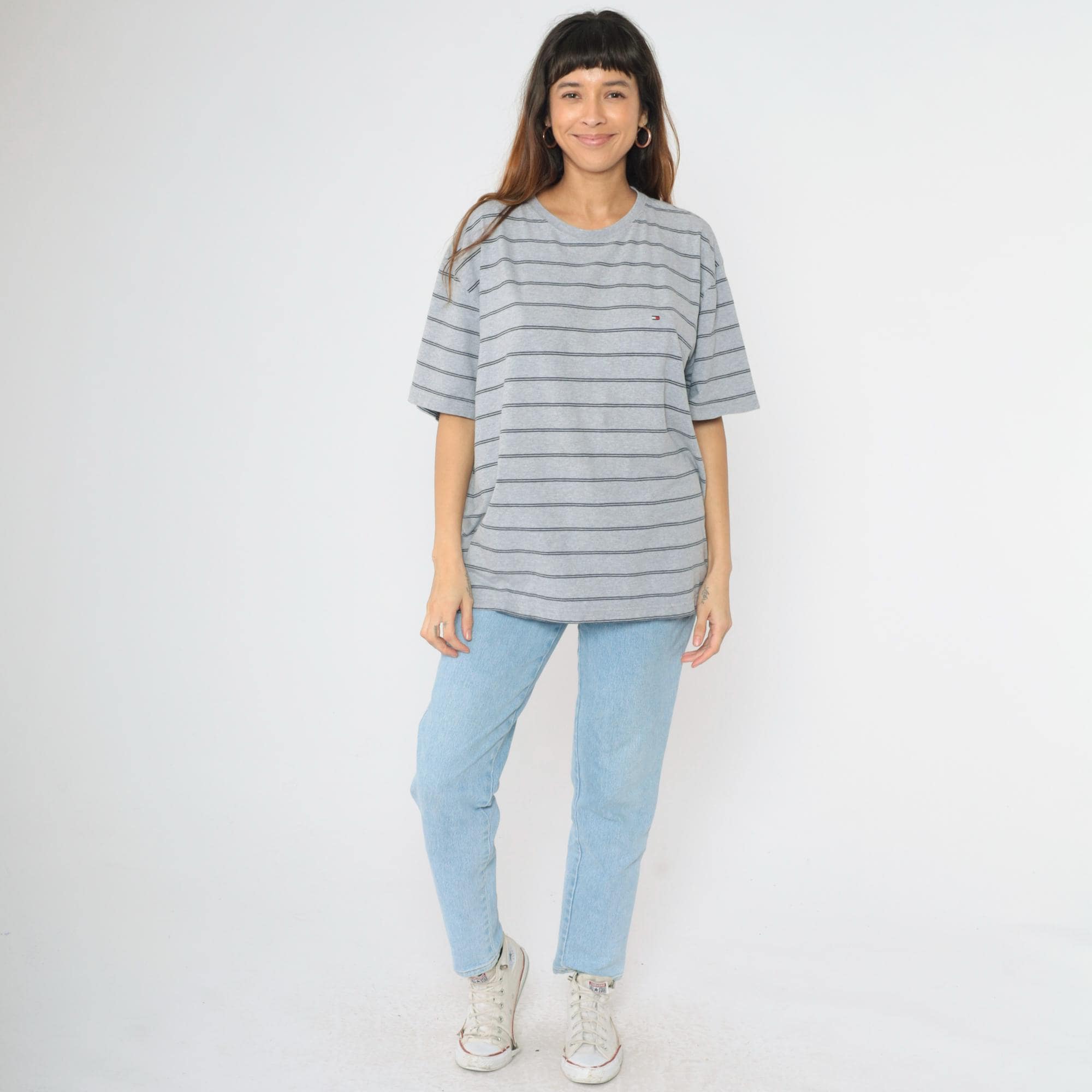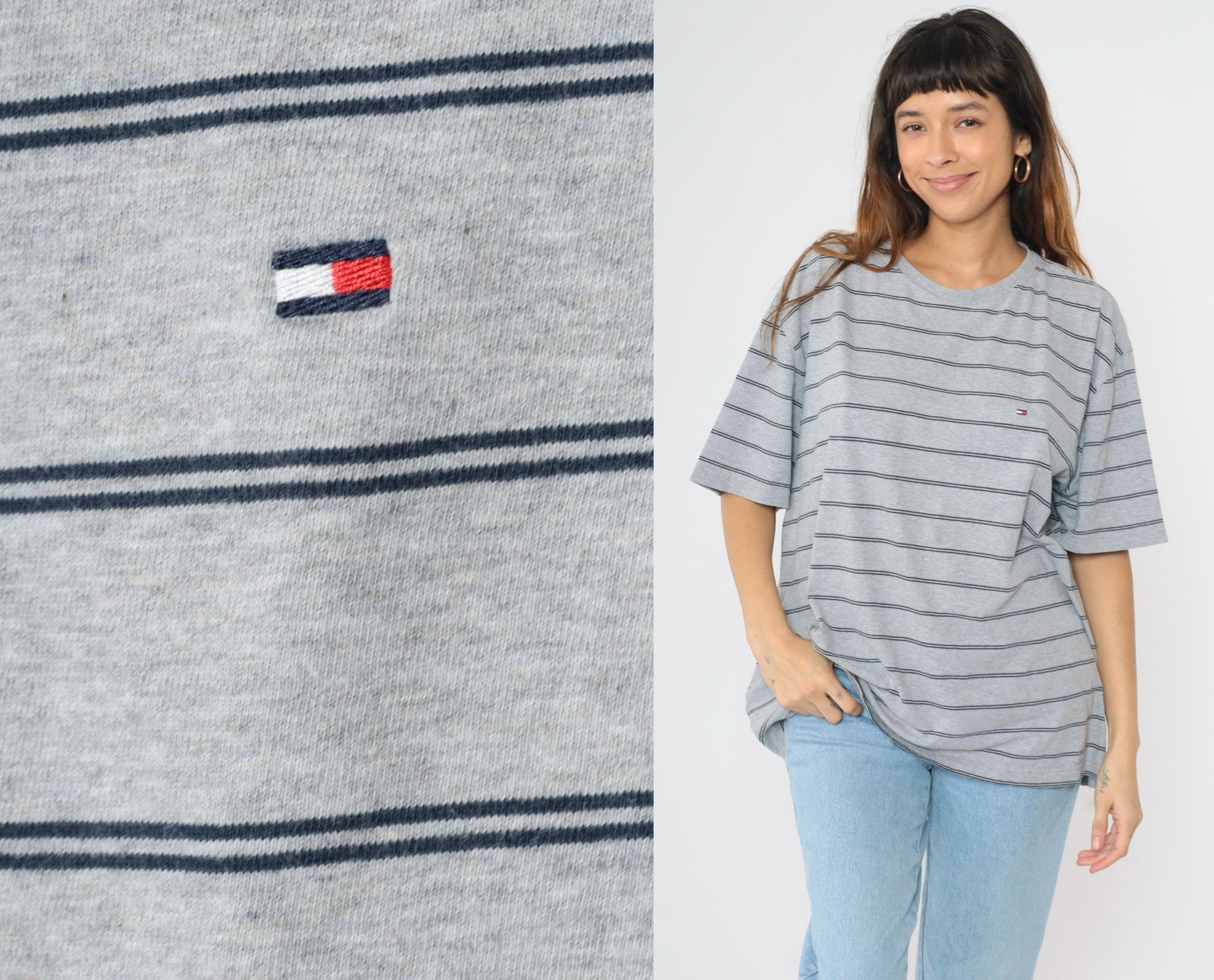 Tommy Hilfiger t shirt in grey with navy blue stripes and the flag logo on the chest.