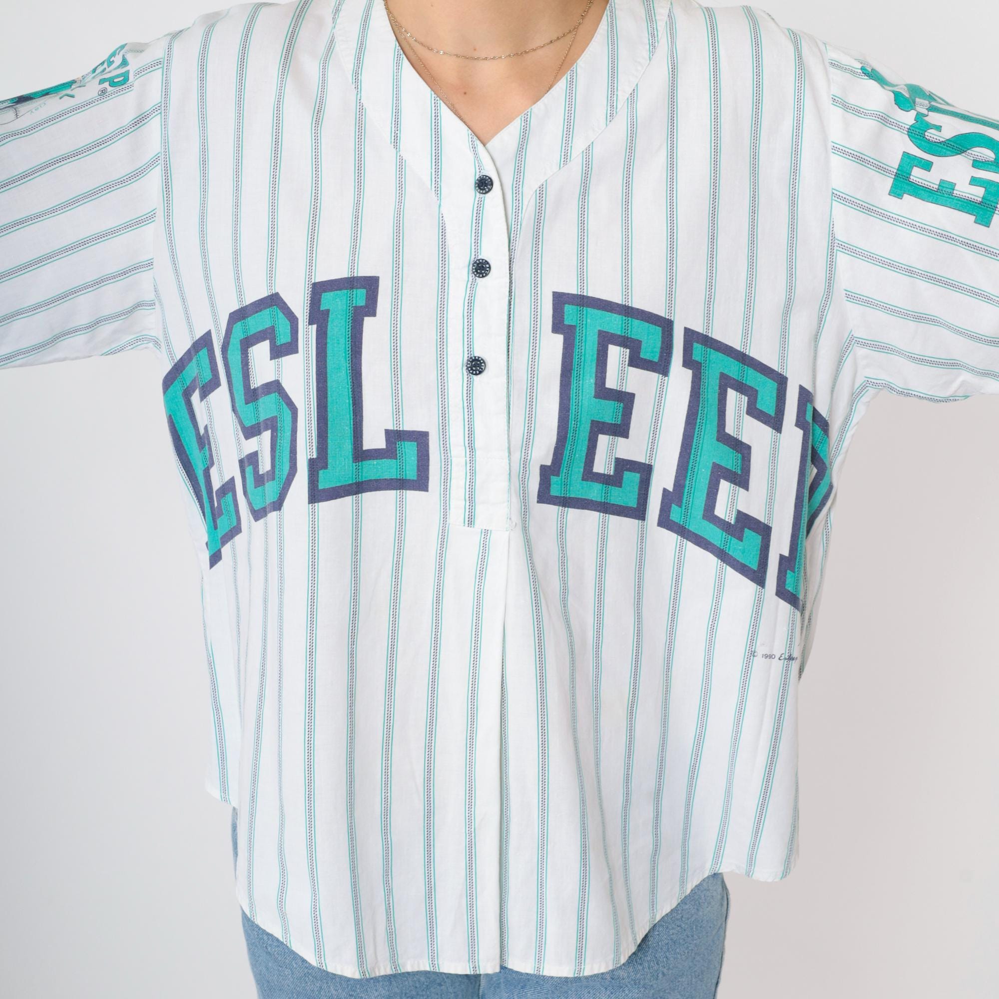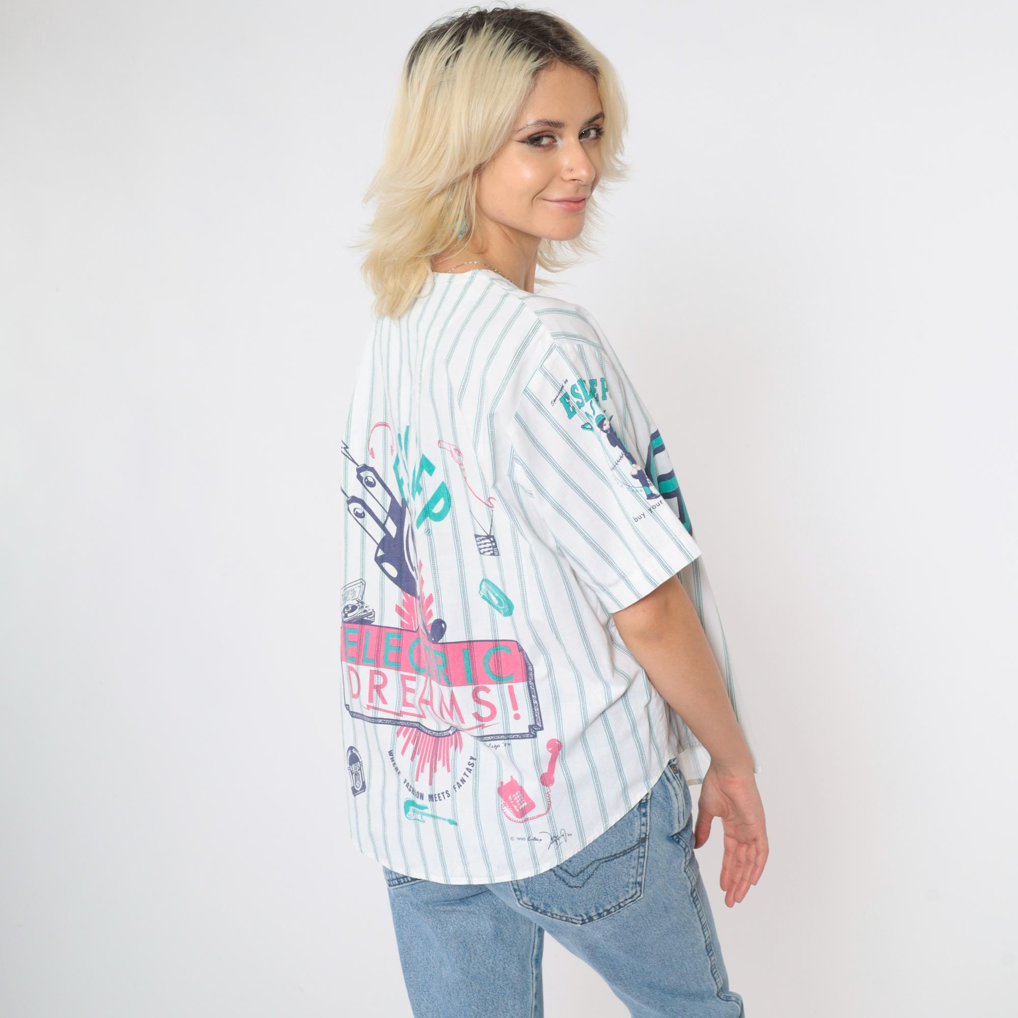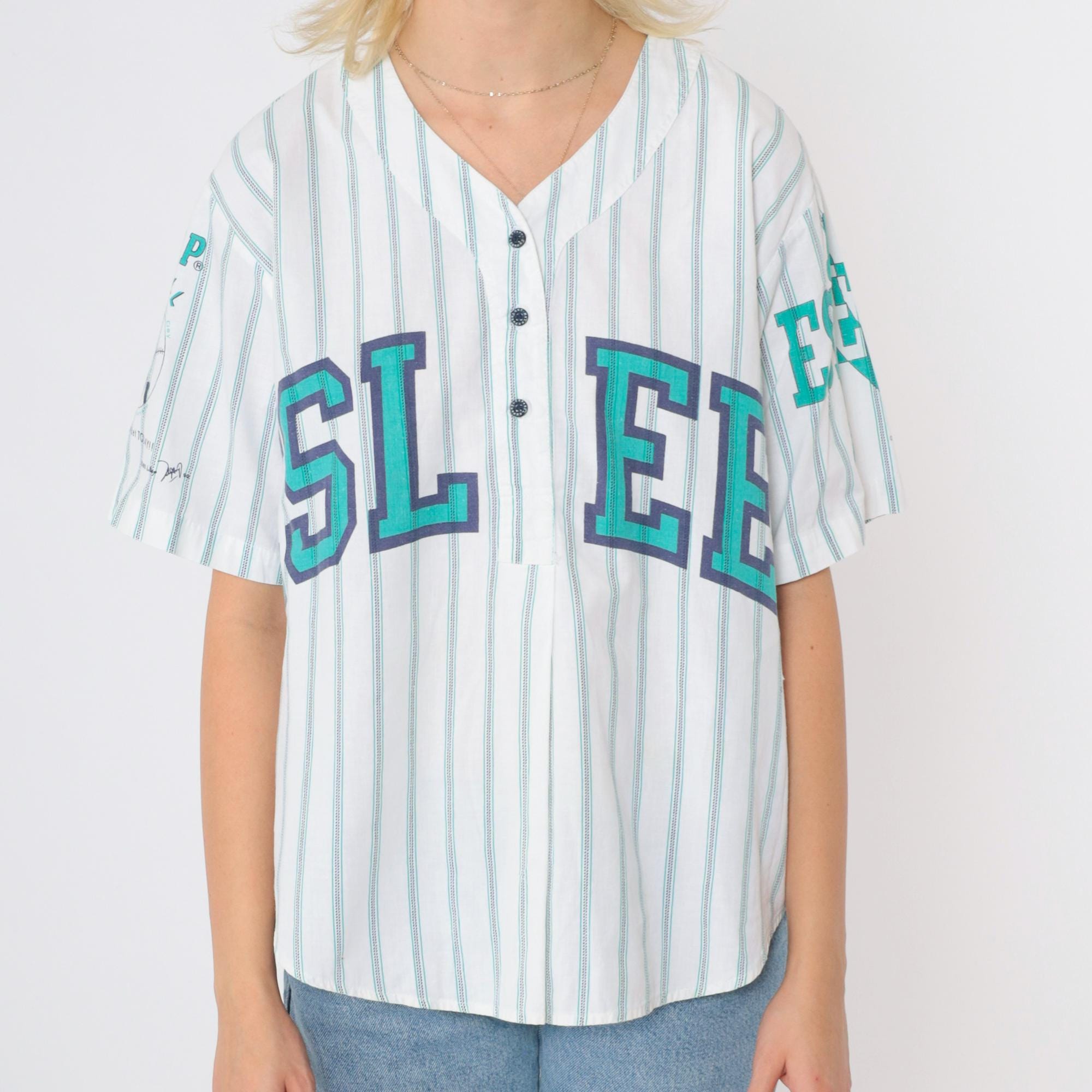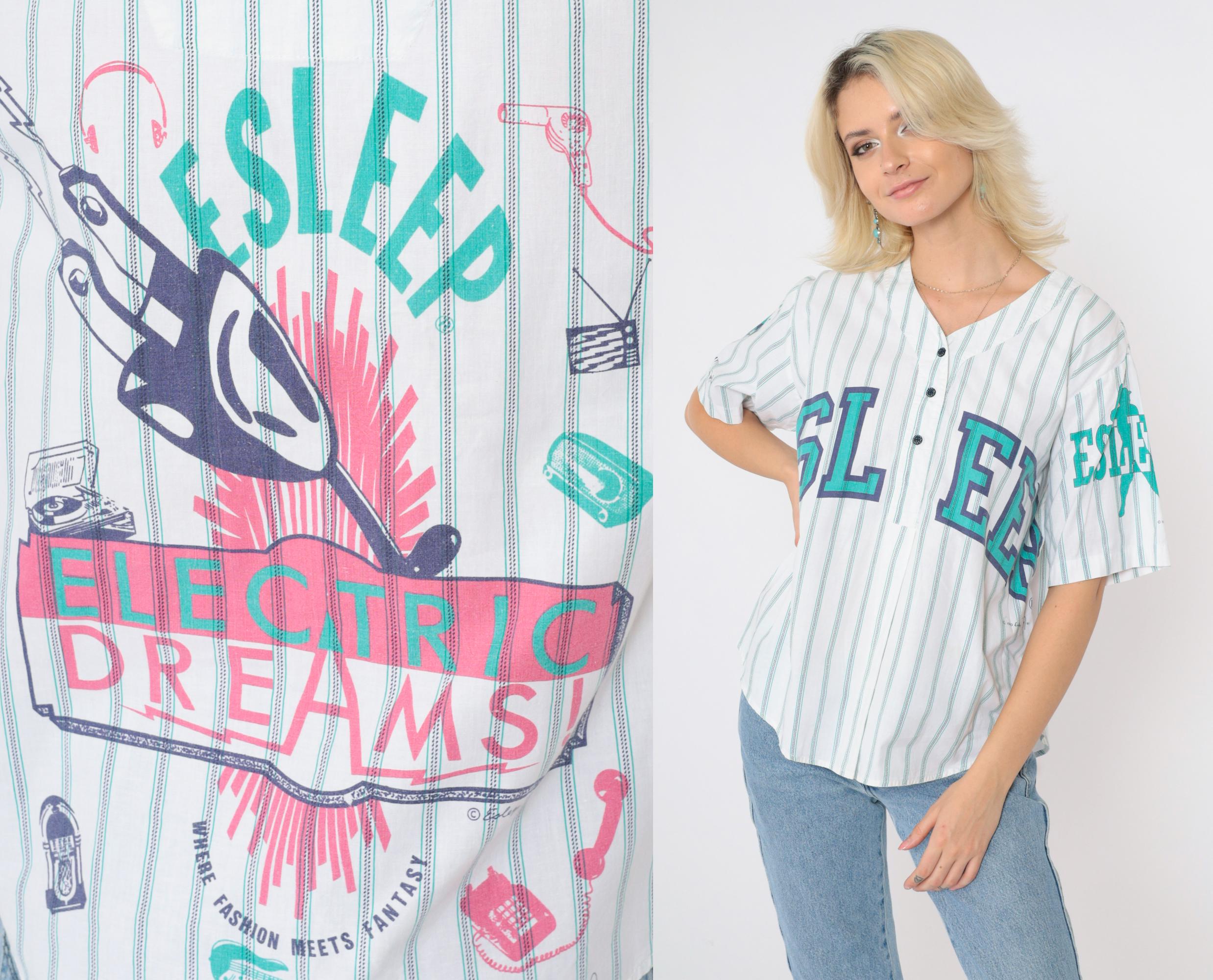 Vintage 90s Esleep baseball jersey style shirt in white with teal pinstripes. Features bold "Esleep" lettering across the front and a large back graphic that reads "Electric Dreams," with retro illustrations. Henley neckline with three buttons and short sleeves. Originally marketed as sleepwear, but often worn as streetwear in the 90s.