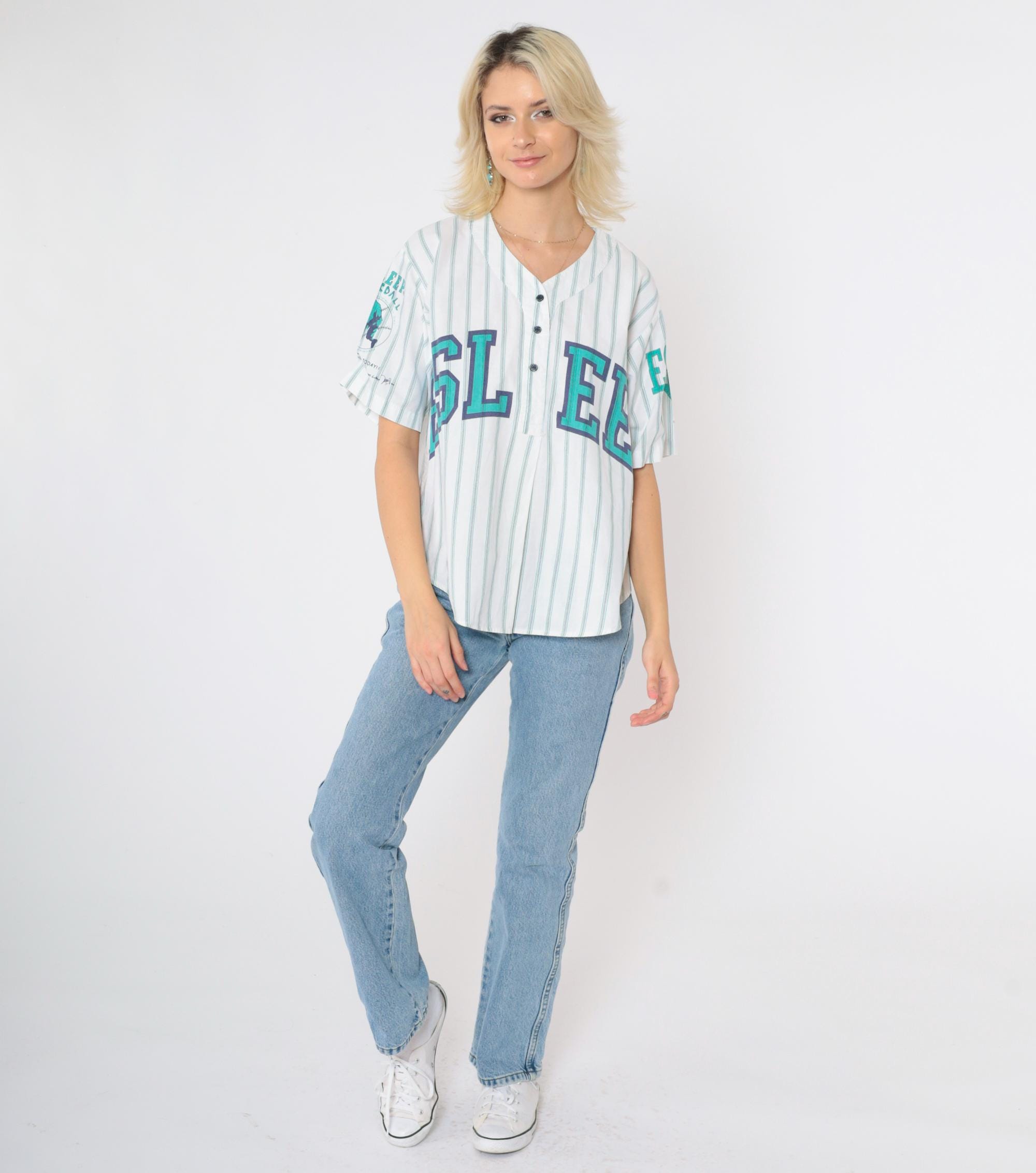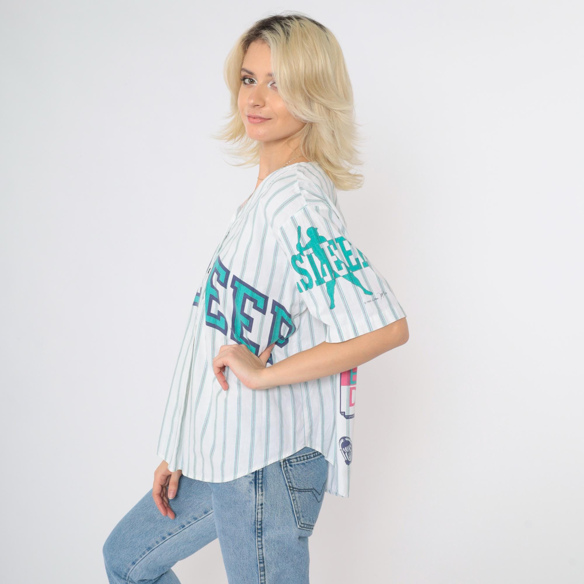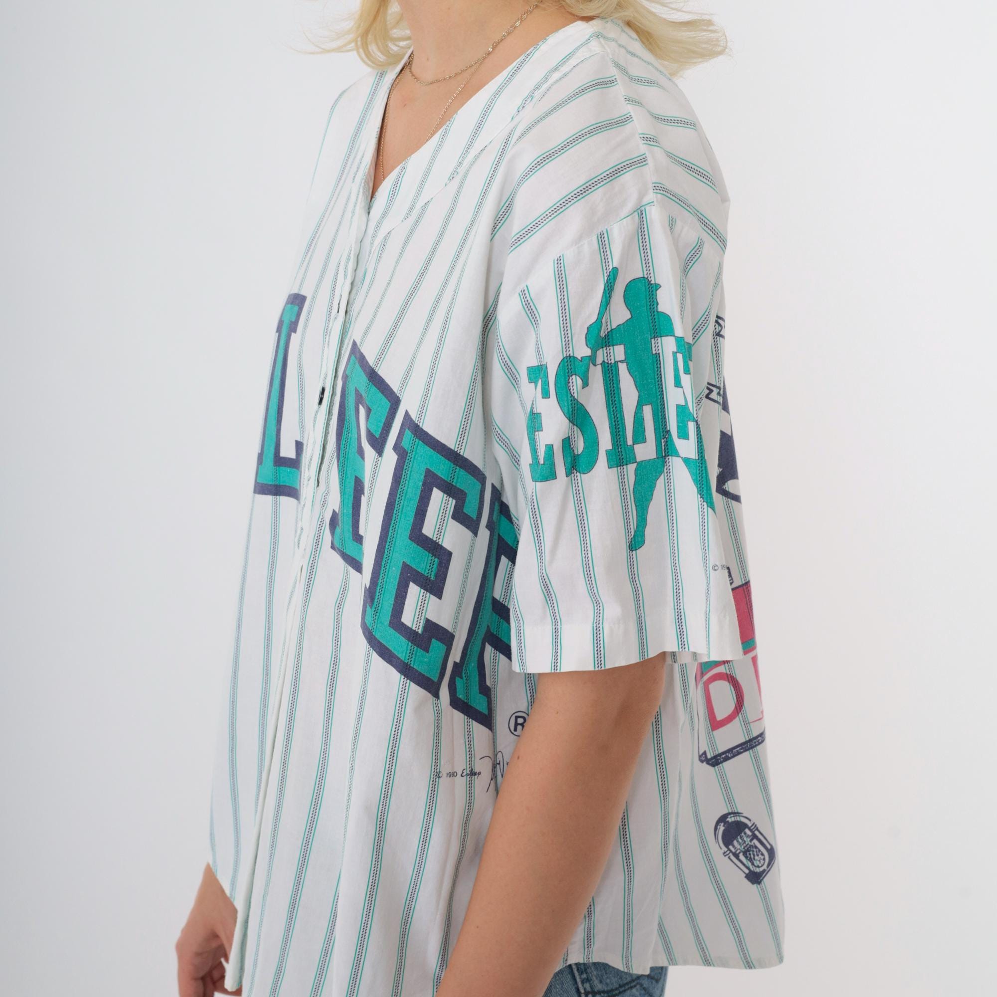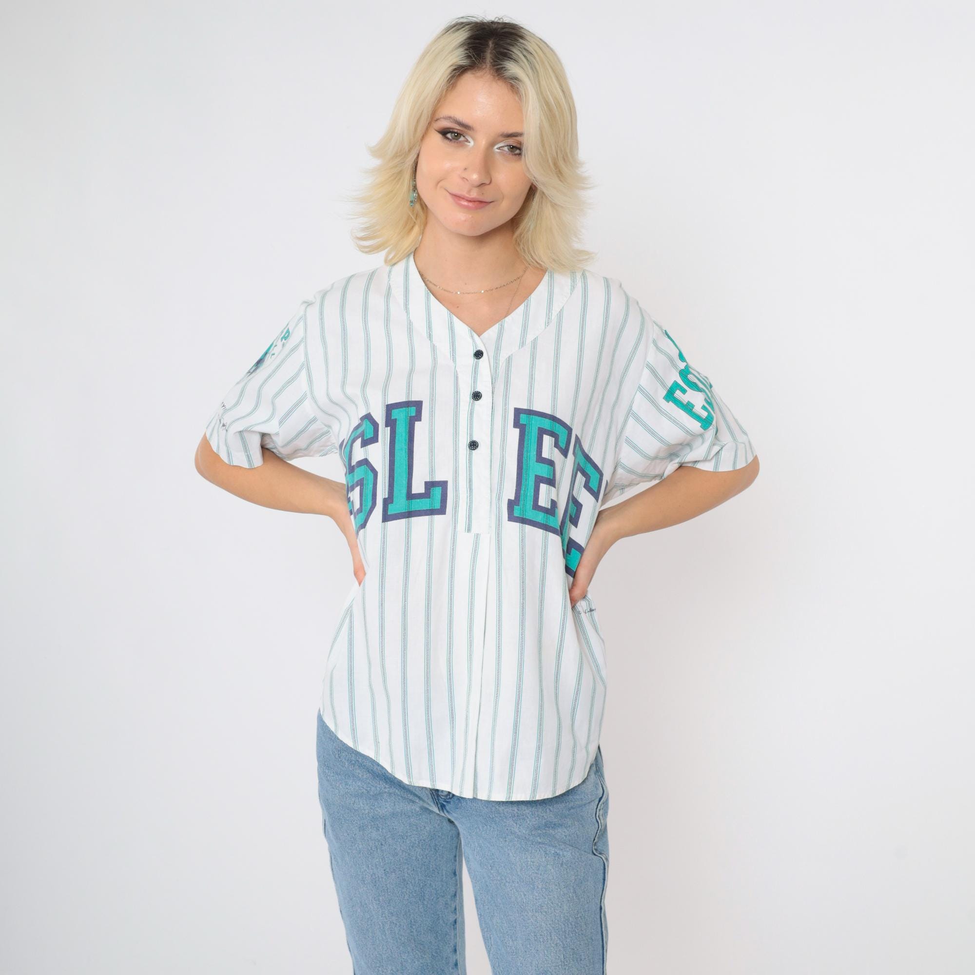 Vintage 90s Esleep baseball jersey style shirt in white with teal pinstripes. Features bold "Esleep" lettering across the front and a large back graphic that reads "Electric Dreams," with retro illustrations. Henley neckline with three buttons and short sleeves. Originally marketed as sleepwear, but often worn as streetwear in the 90s.