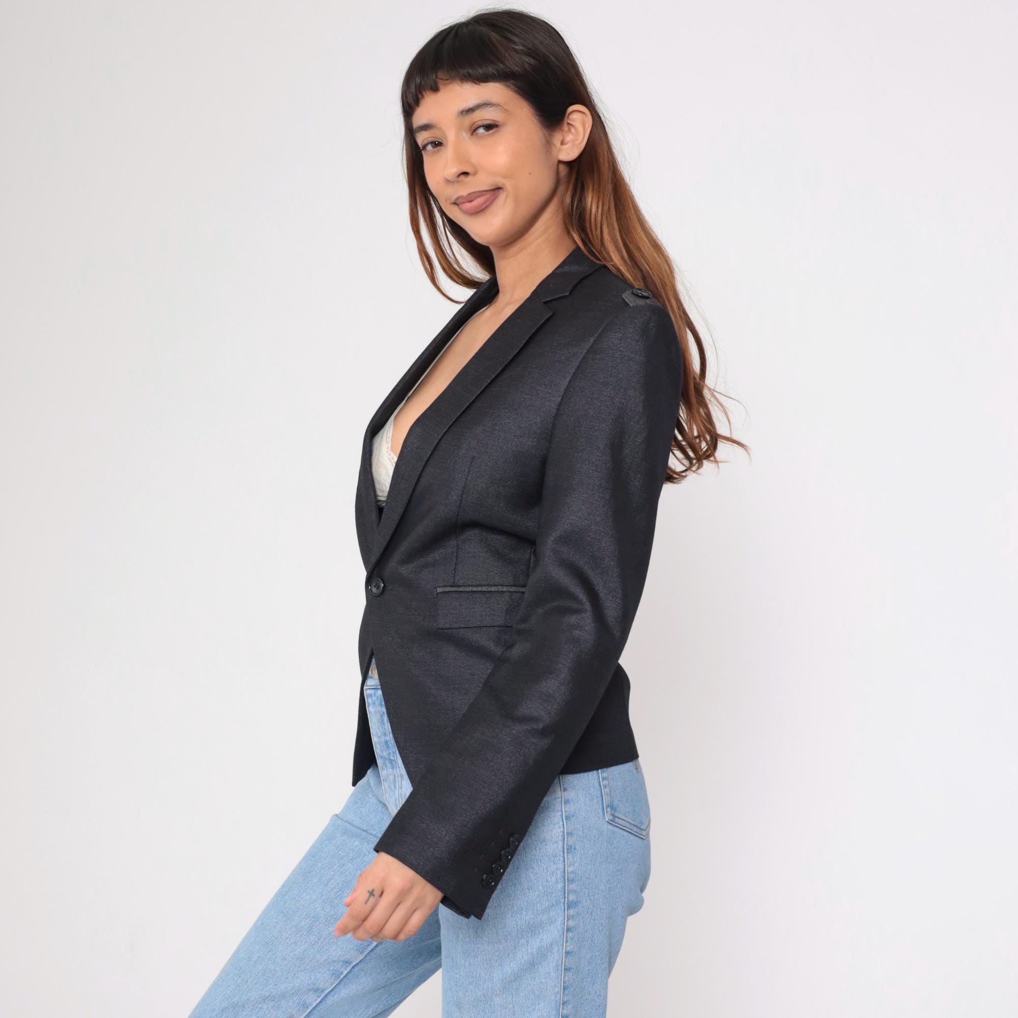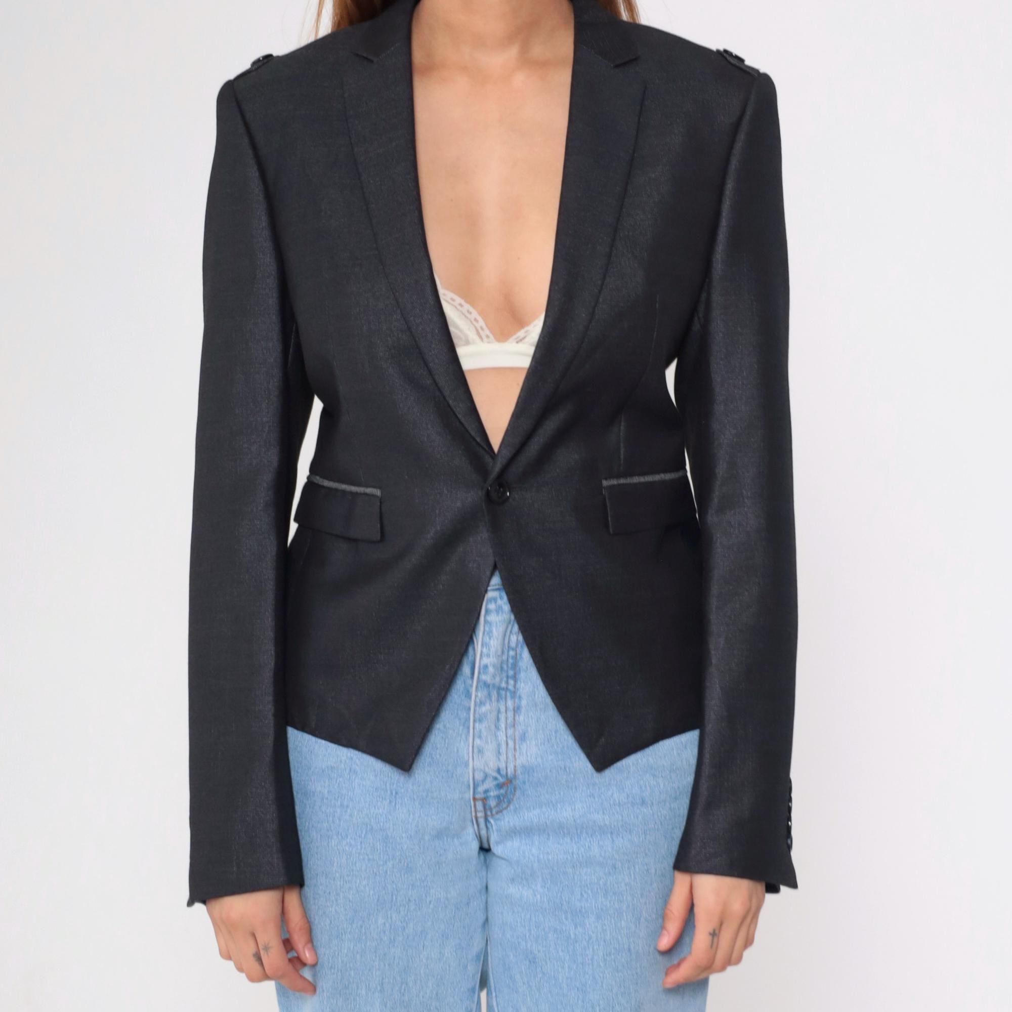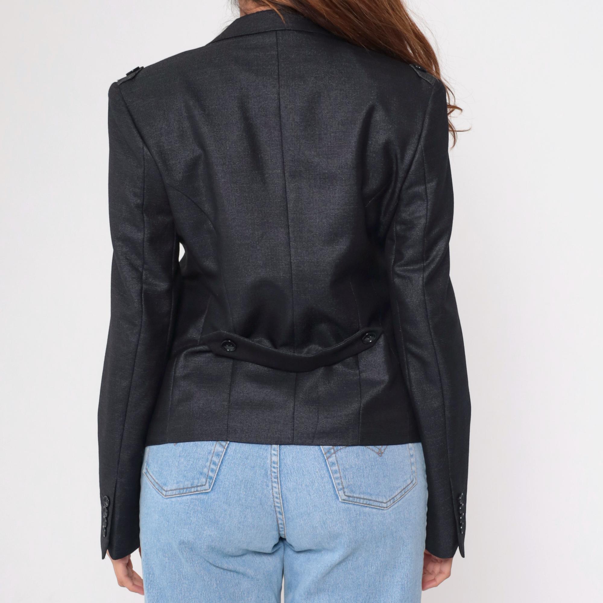 Vintage 00s black fitted blazer with structured shoulders, a tailored fit, and military-inspired details. This blazer features a deep v neck, a single-button closure, and decorative epaulettes on the shoulders.
