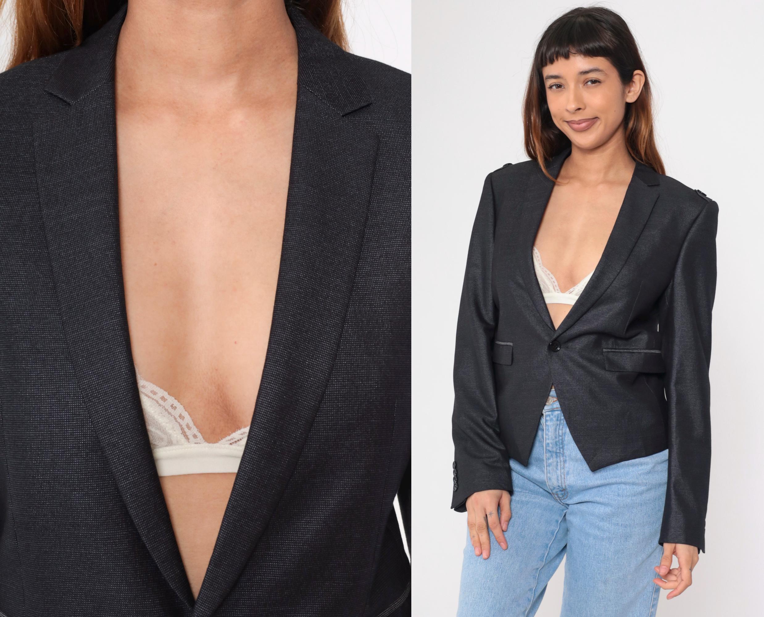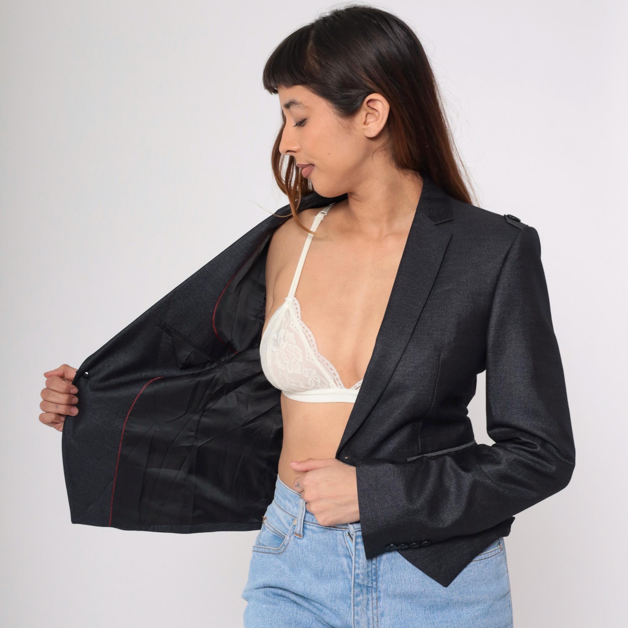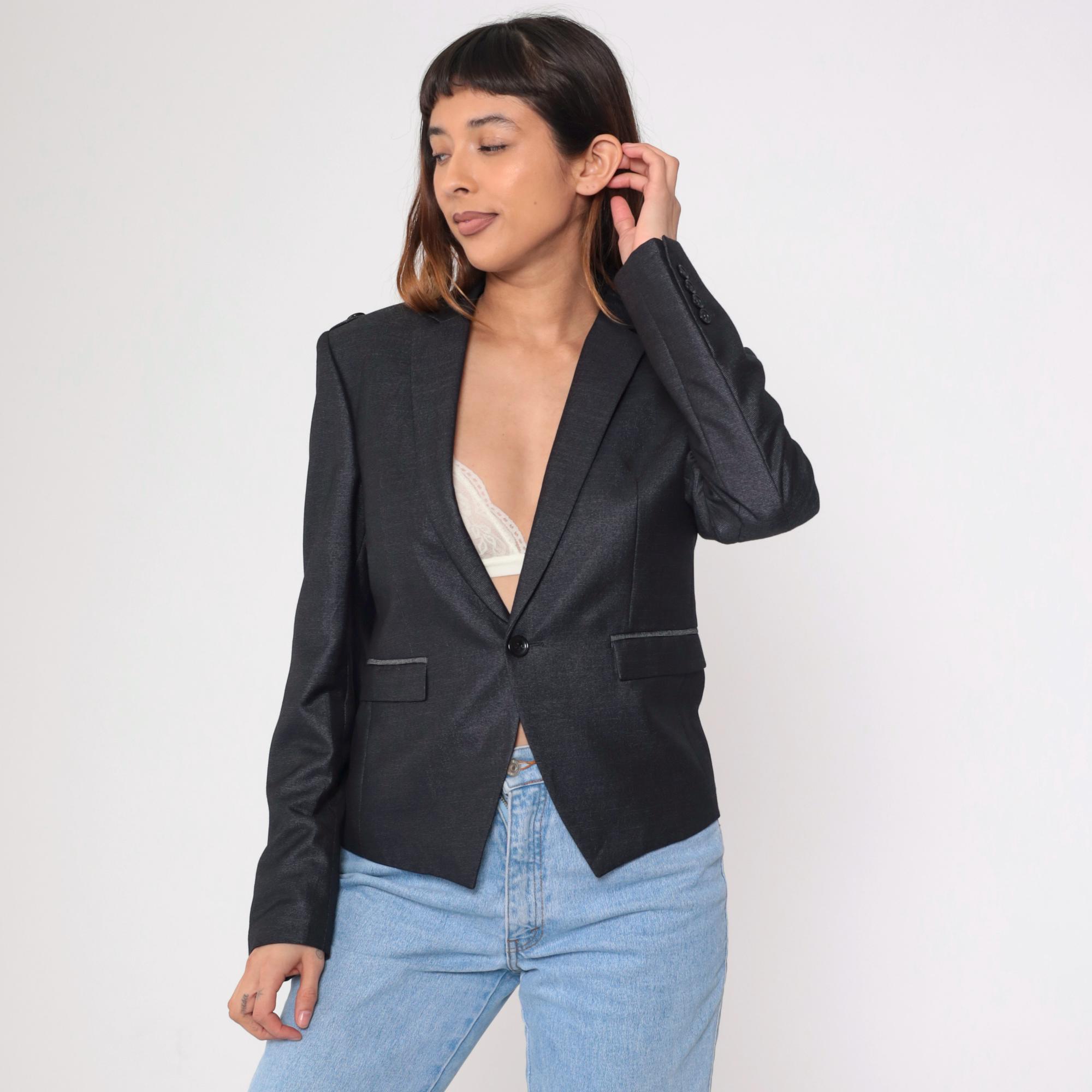 Vintage 00s black fitted blazer with structured shoulders, a tailored fit, and military-inspired details. This blazer features a deep v neck, a single-button closure, and decorative epaulettes on the shoulders.