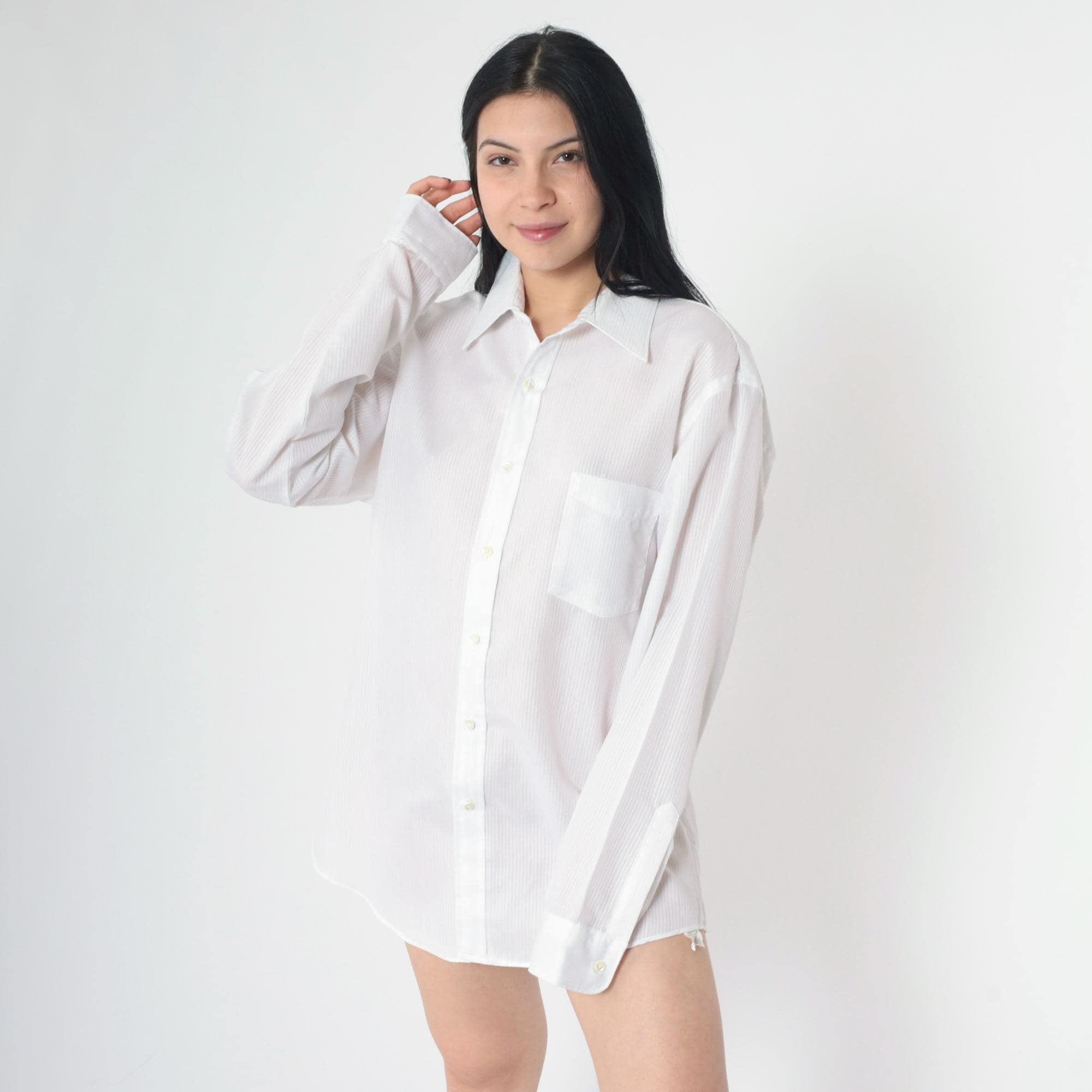 Vintage 80s shirt in sheer white with stripes. Buttons up the front with long sleeves and a collar.