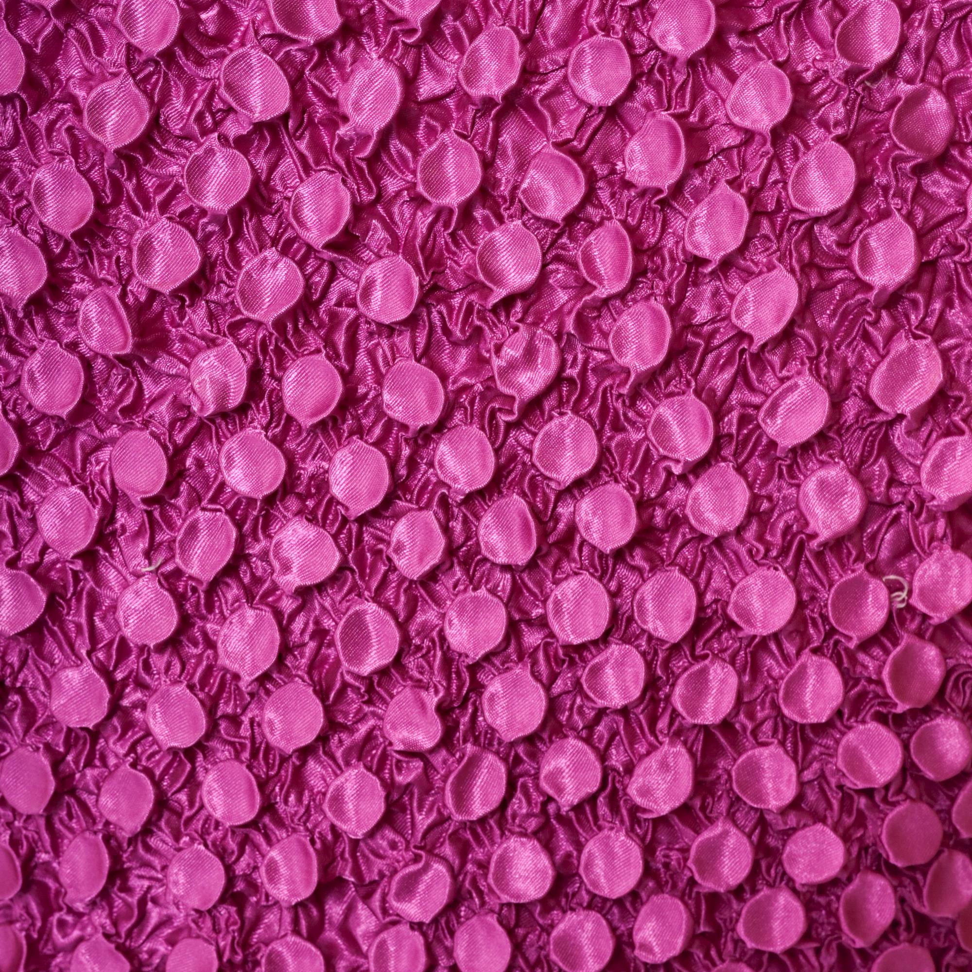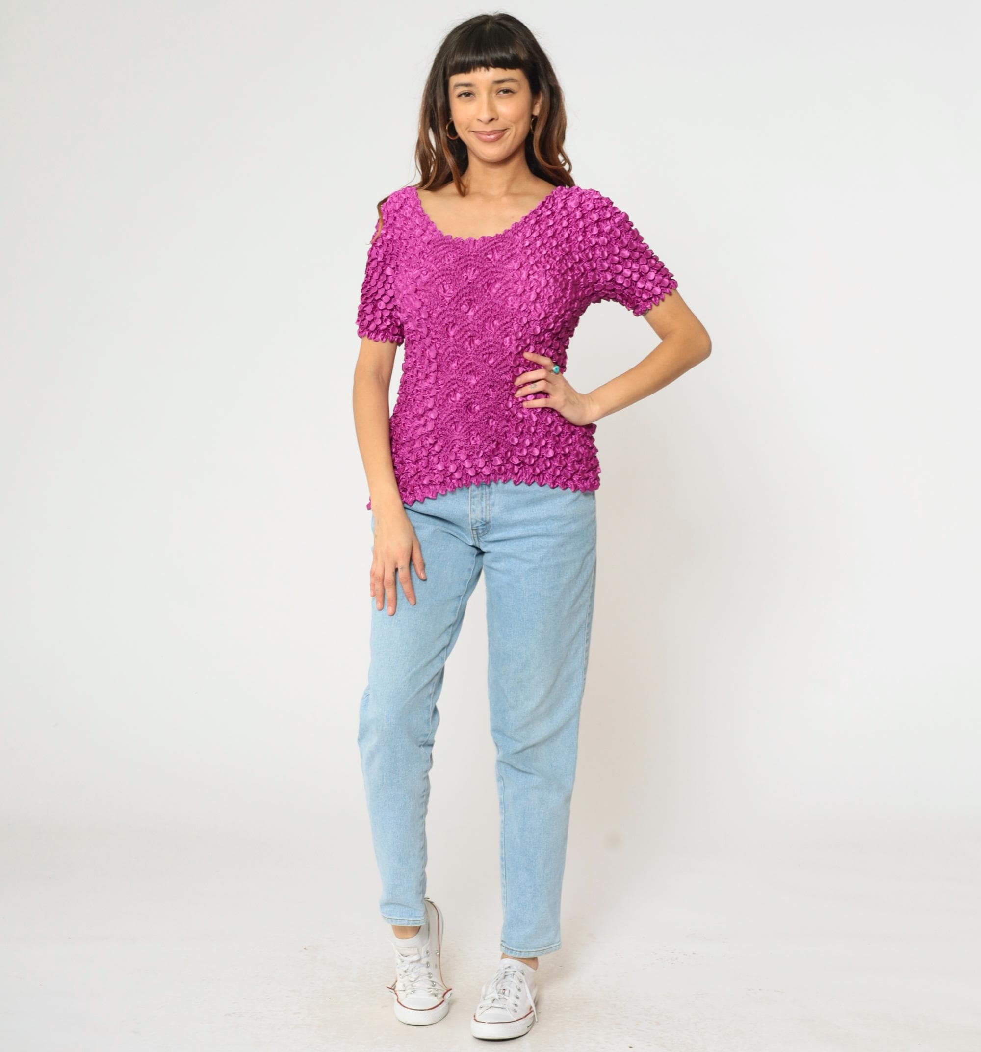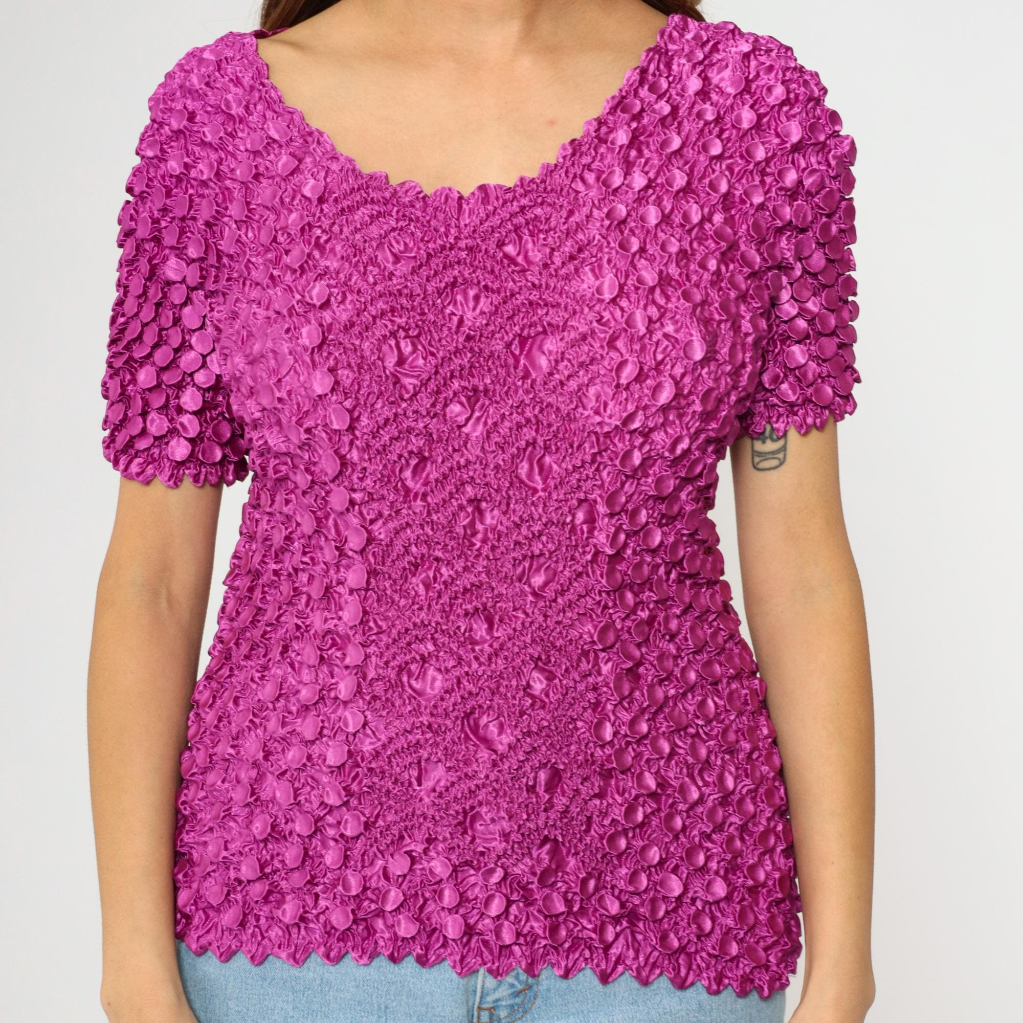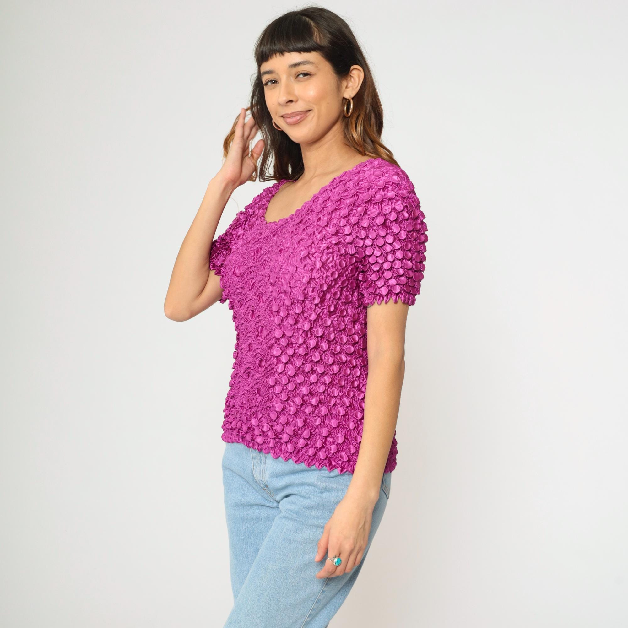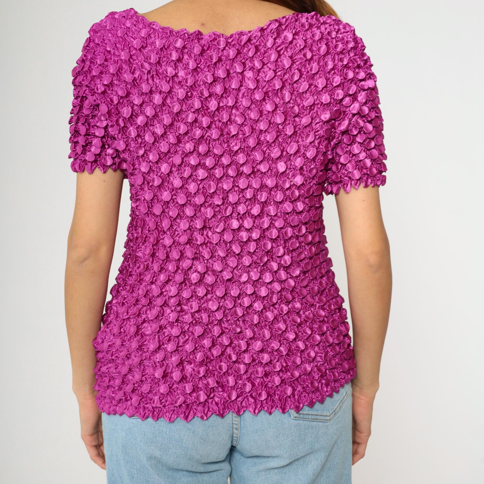 Vintage 00s top in magenta purple stretchy popcorn material with short sleeves.