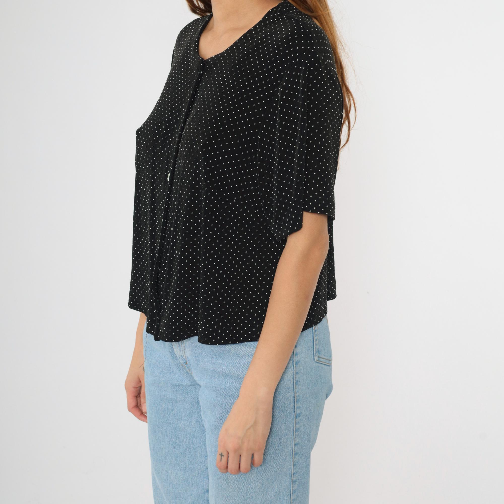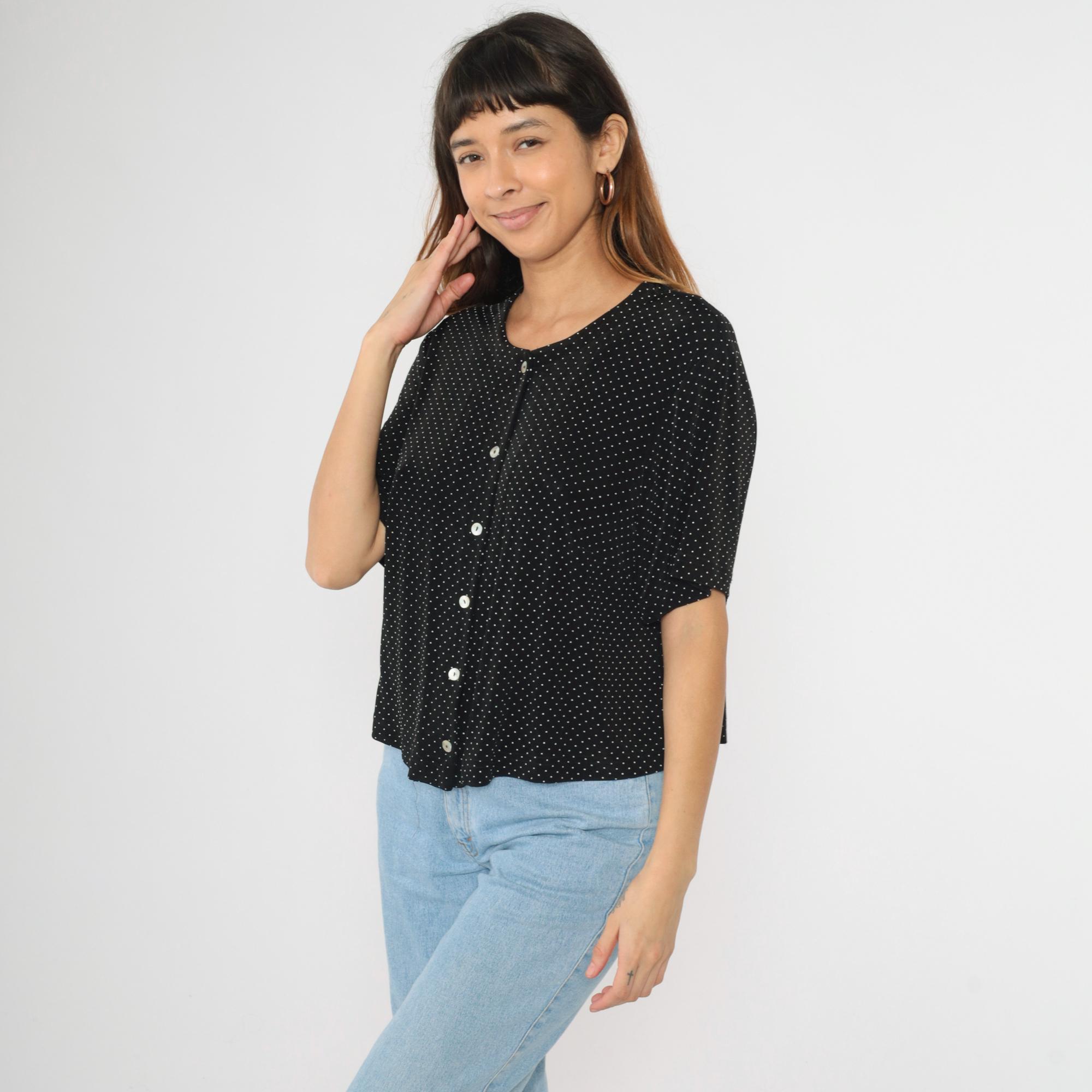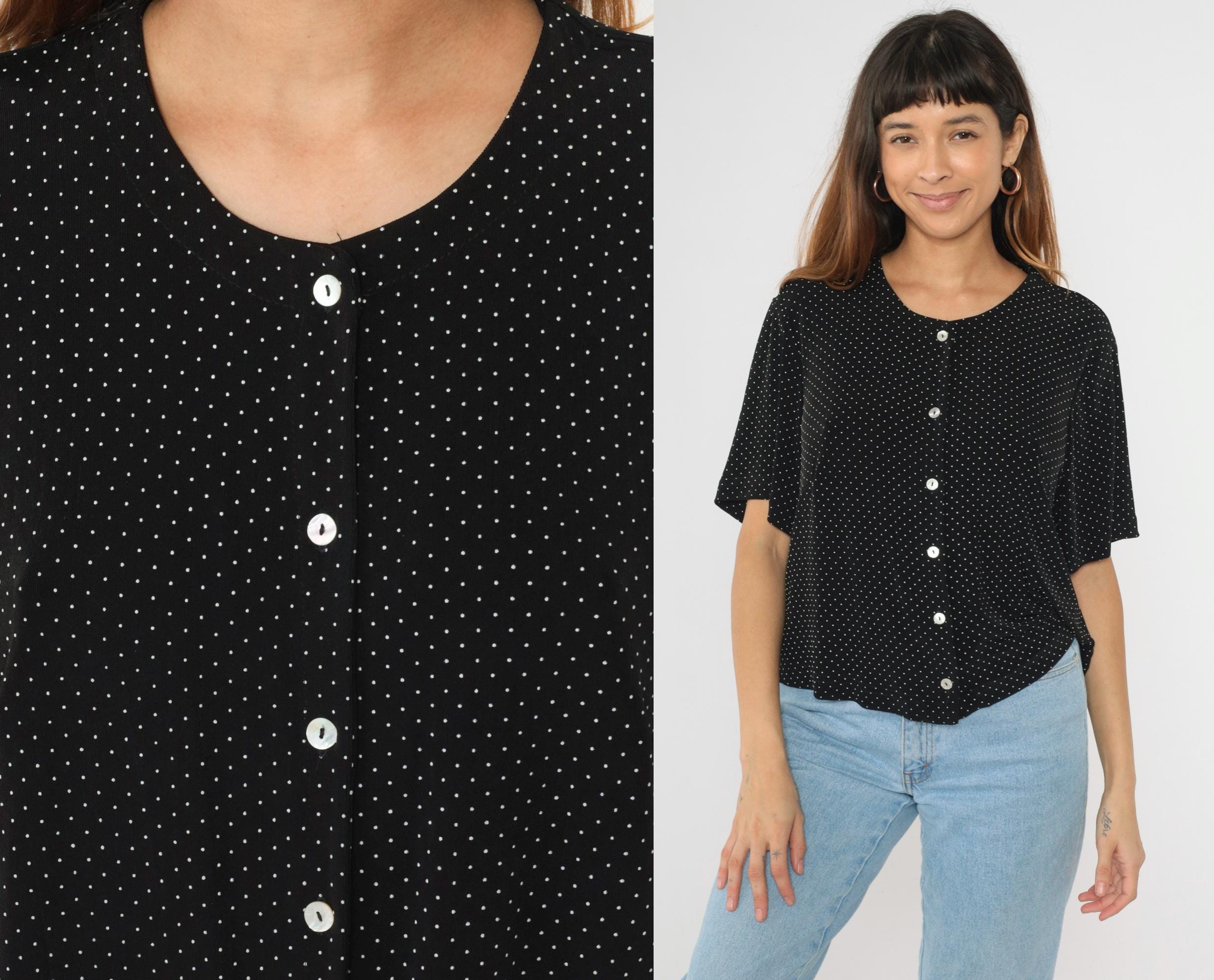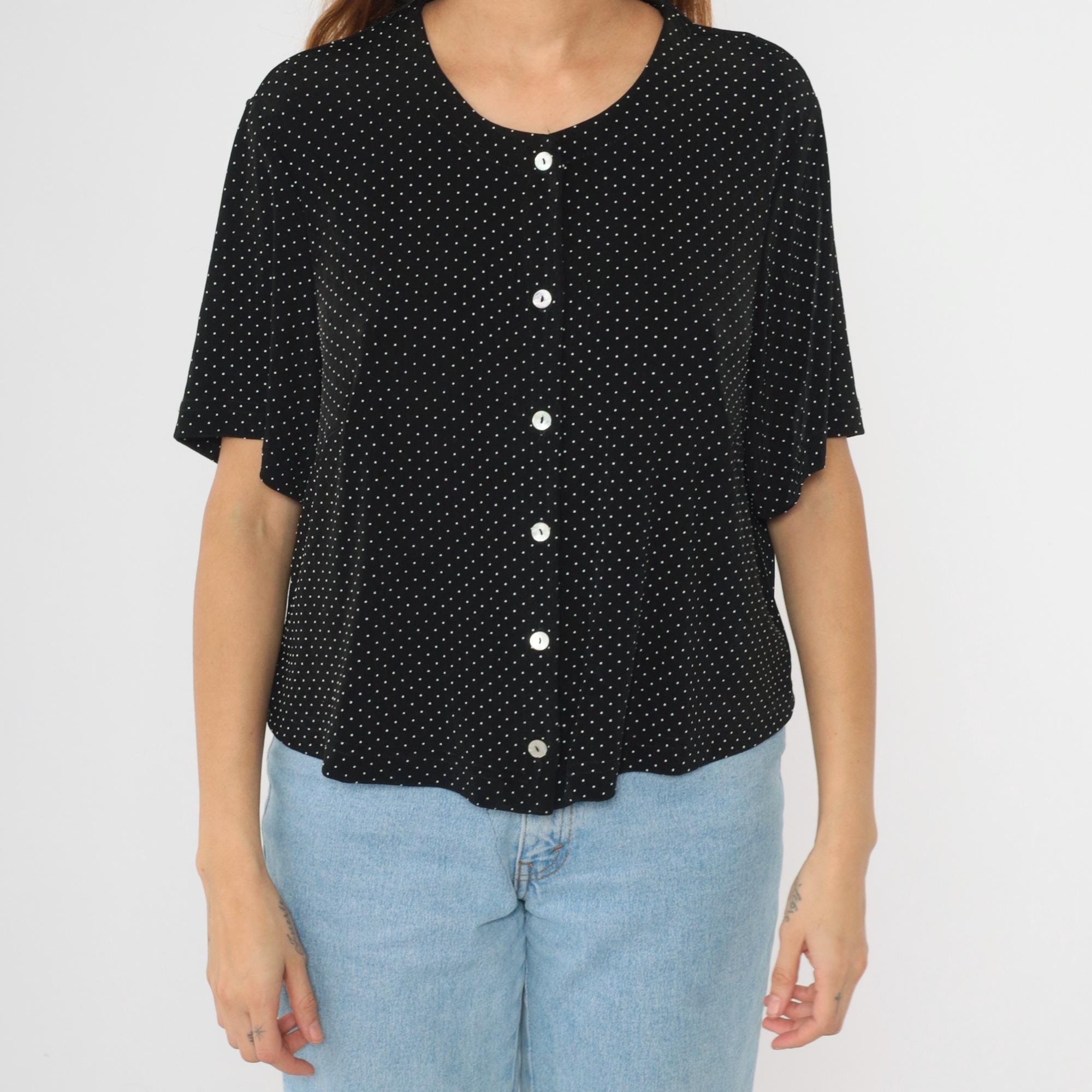 Vintage 90s shirt in black with a white polka dot print. Buttons up the front with short sleeves and a scoop neck.