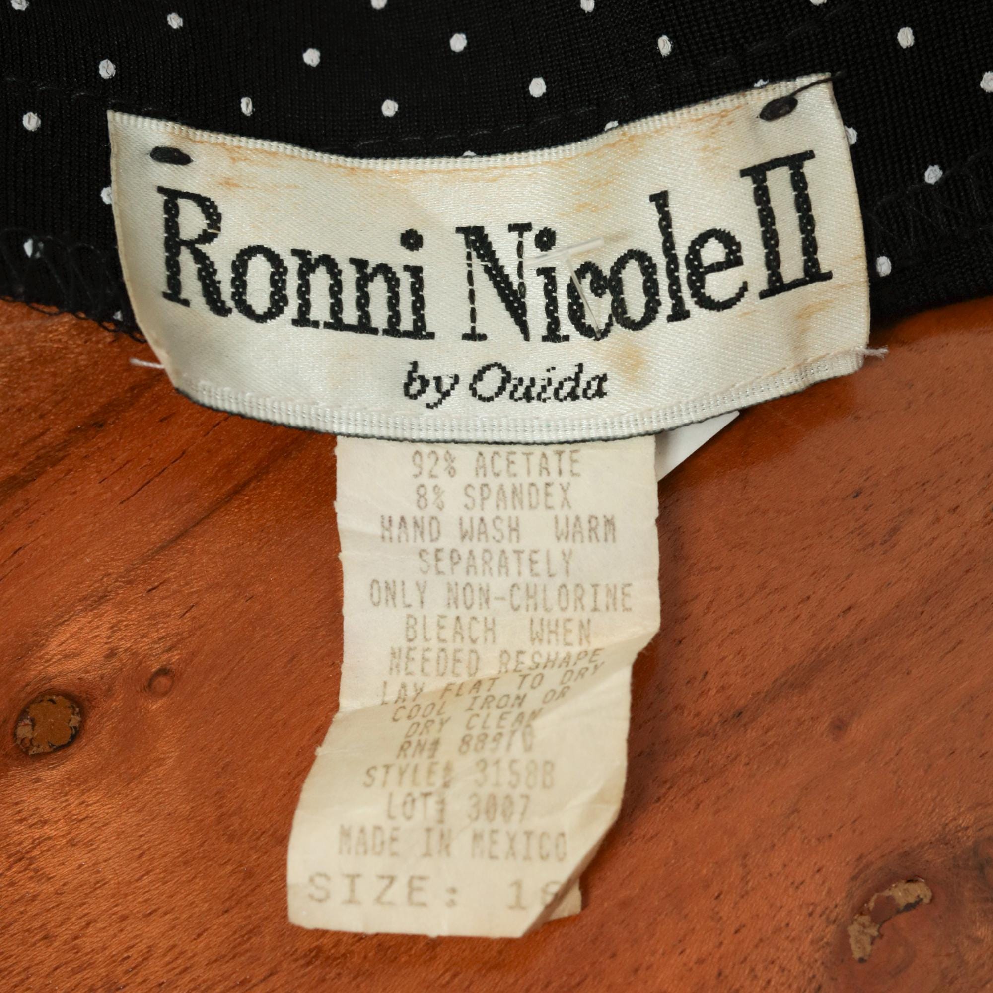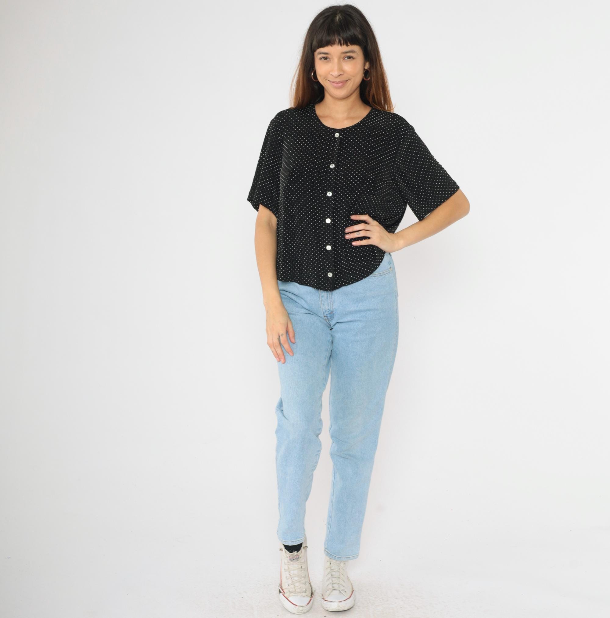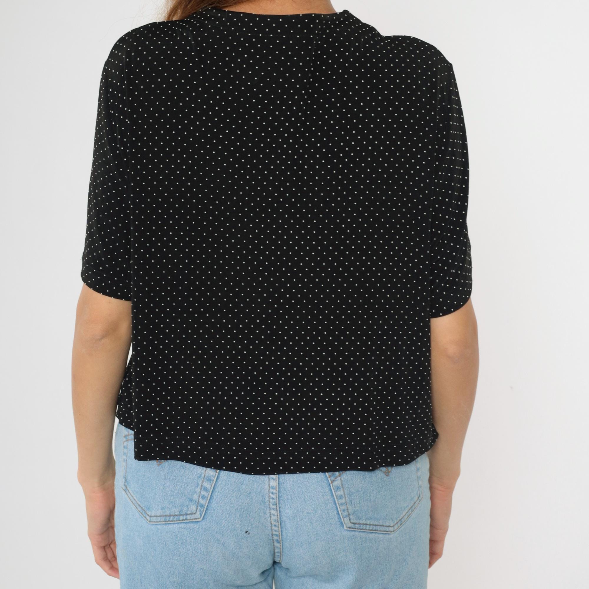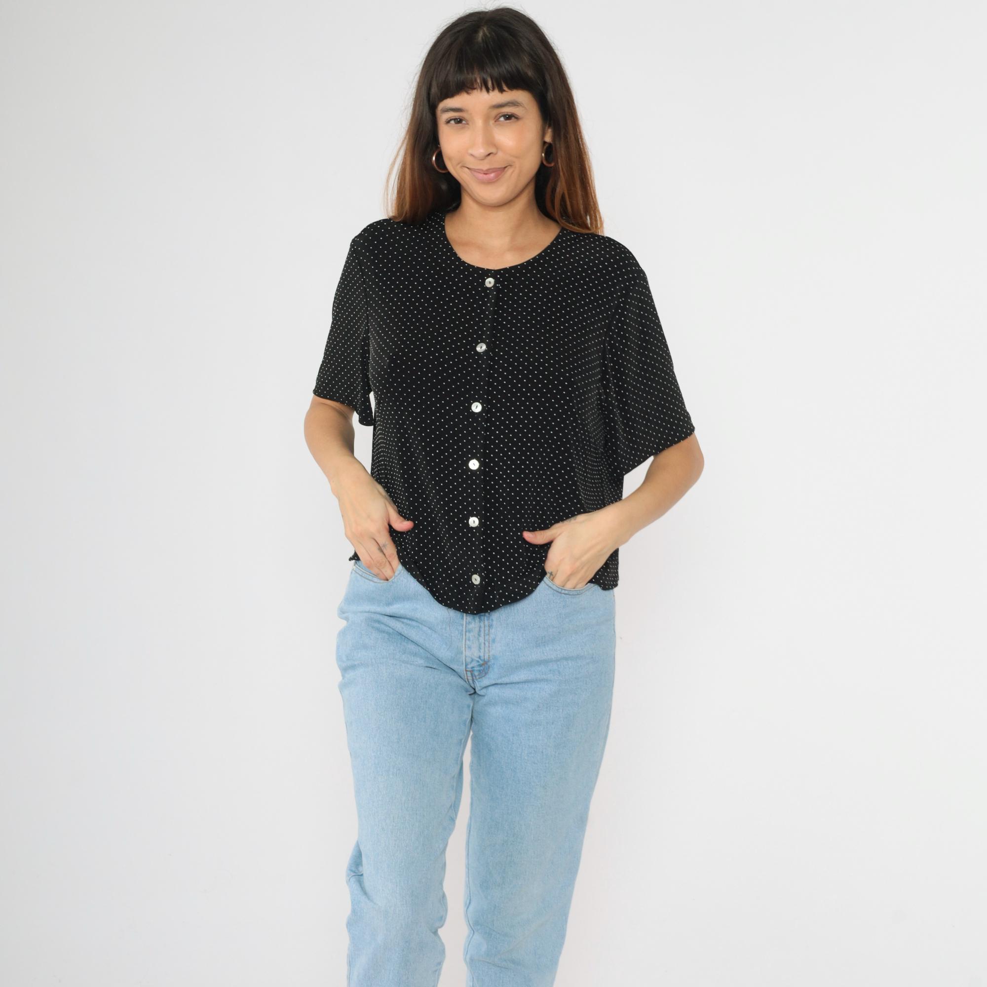 Vintage 90s shirt in black with a white polka dot print. Buttons up the front with short sleeves and a scoop neck.