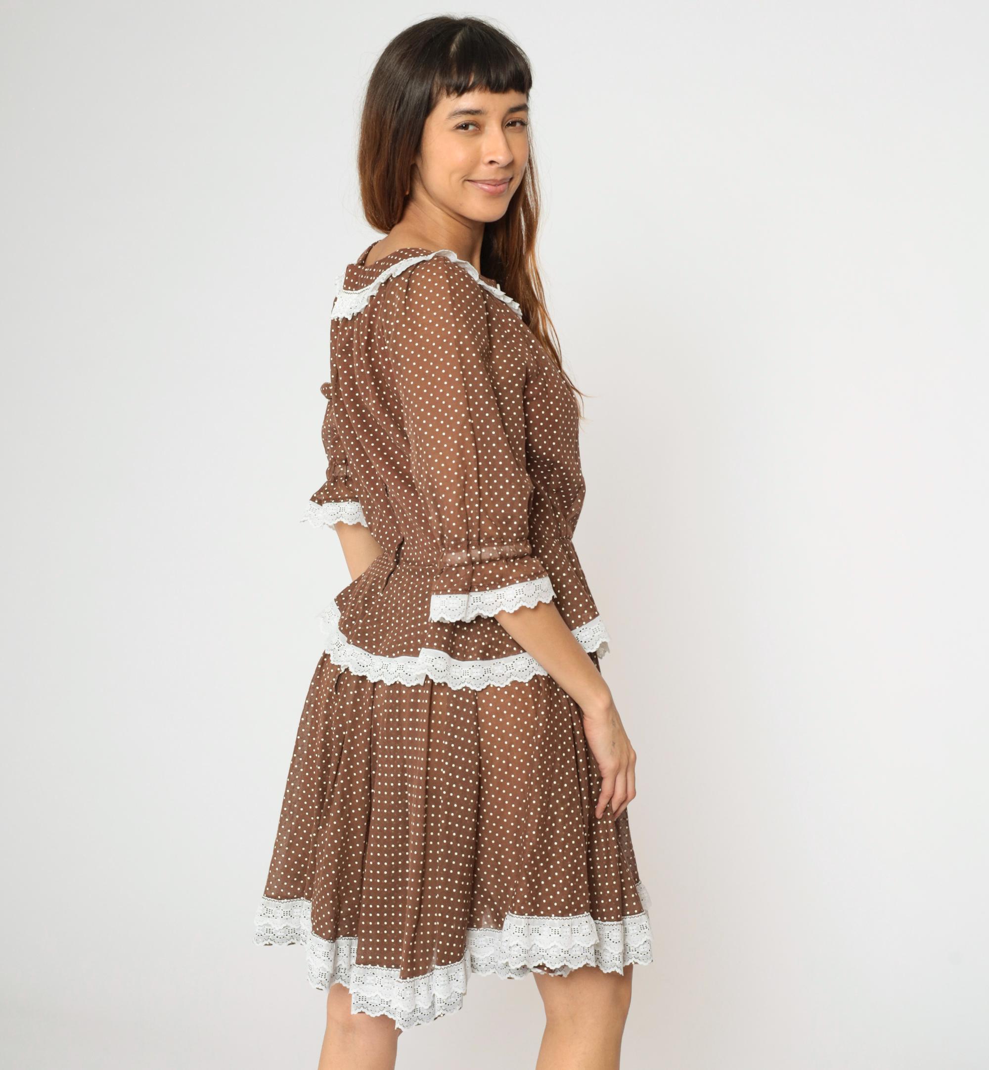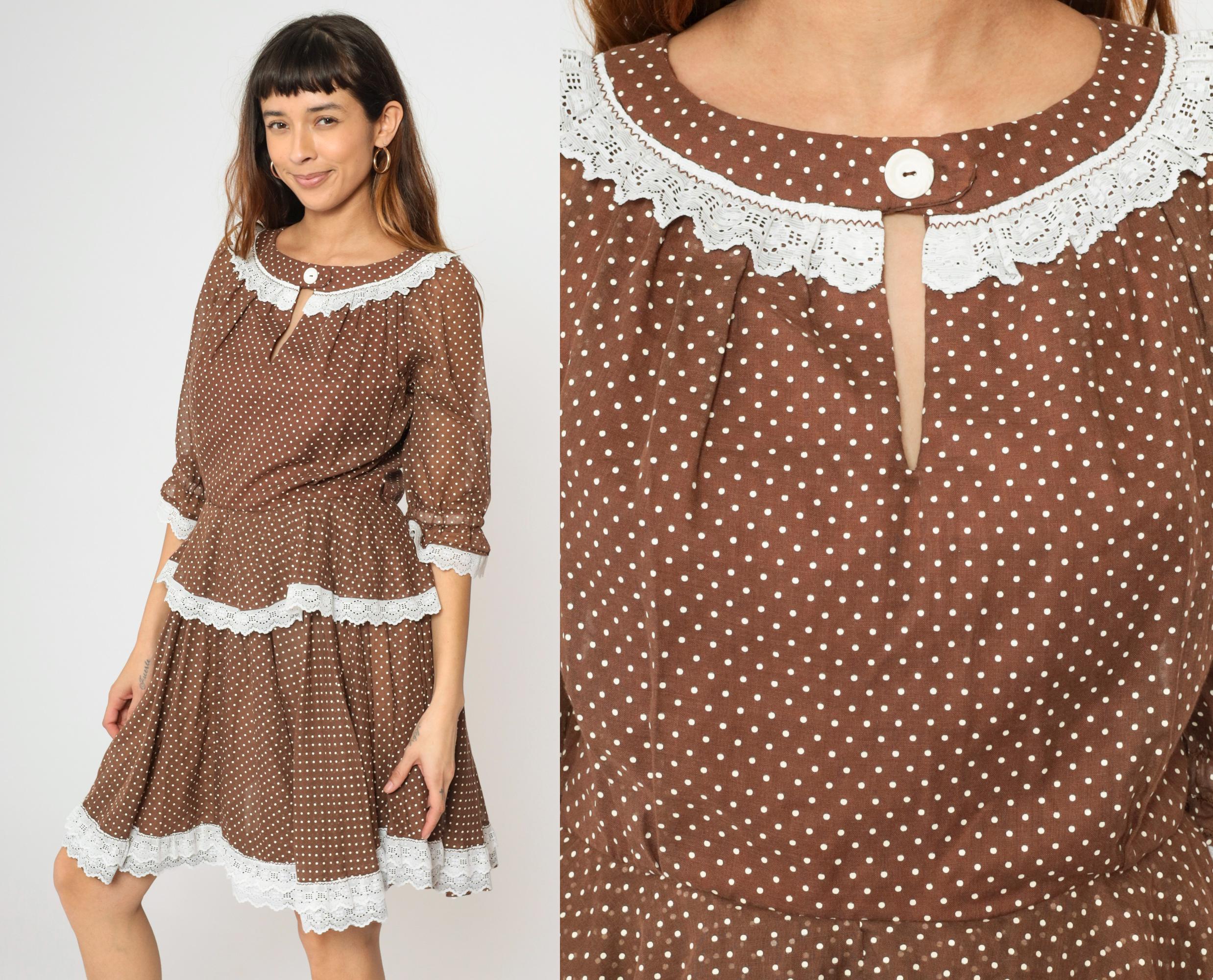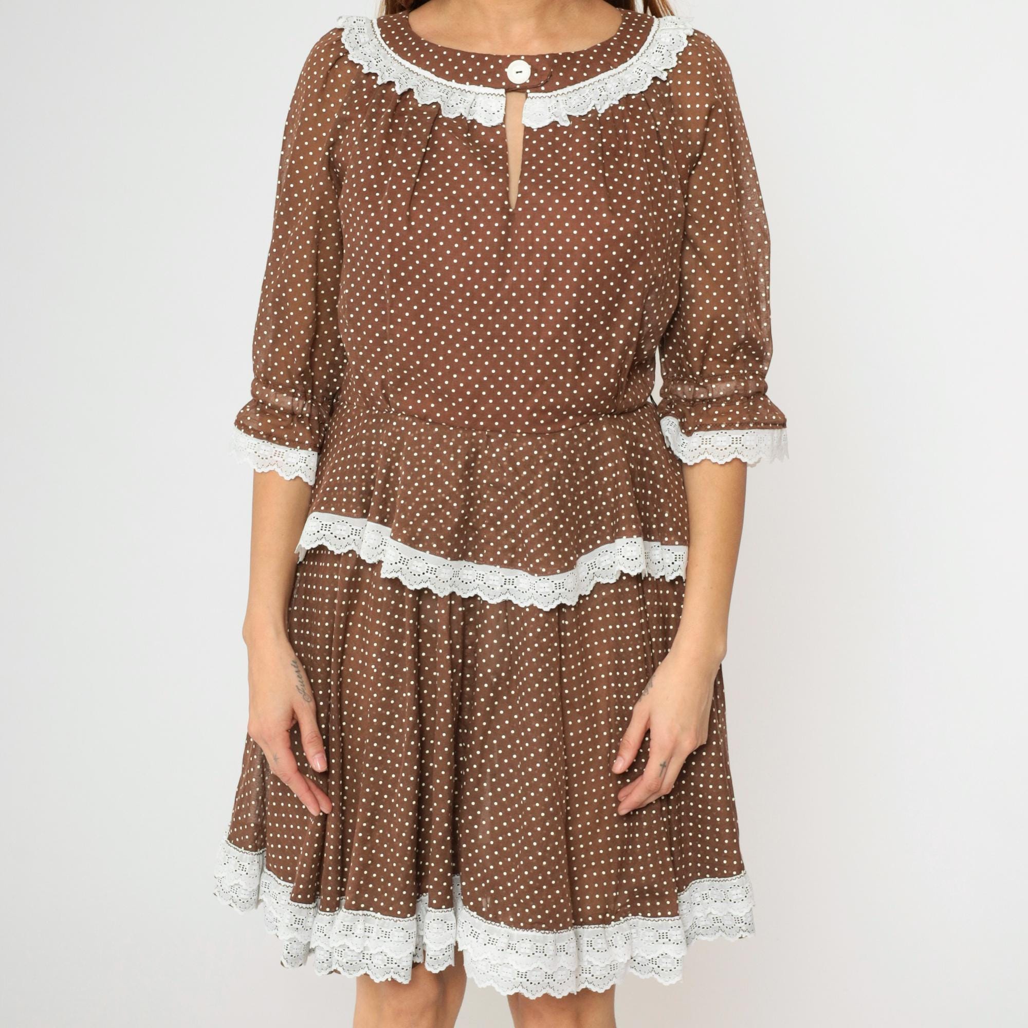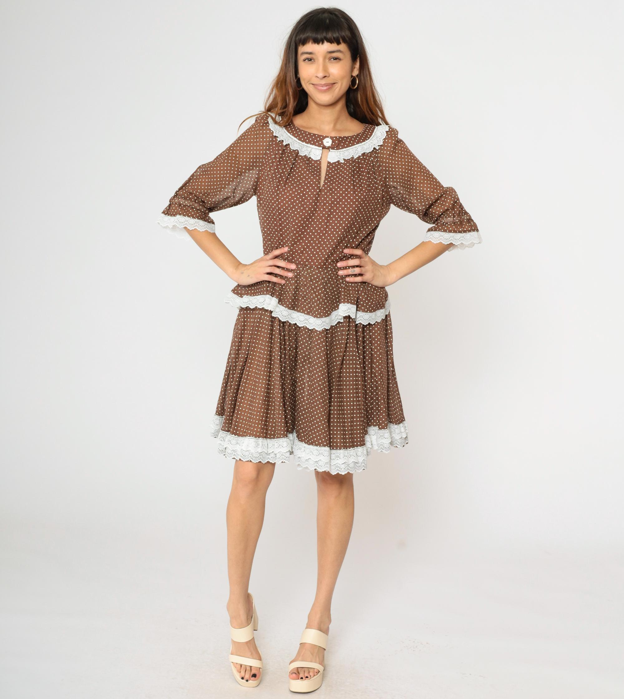 Vintage 70s dress in brown with a polka dot print and a tiered skirt. It has a high waist, a full skirt, and a keyhole button at the neck.