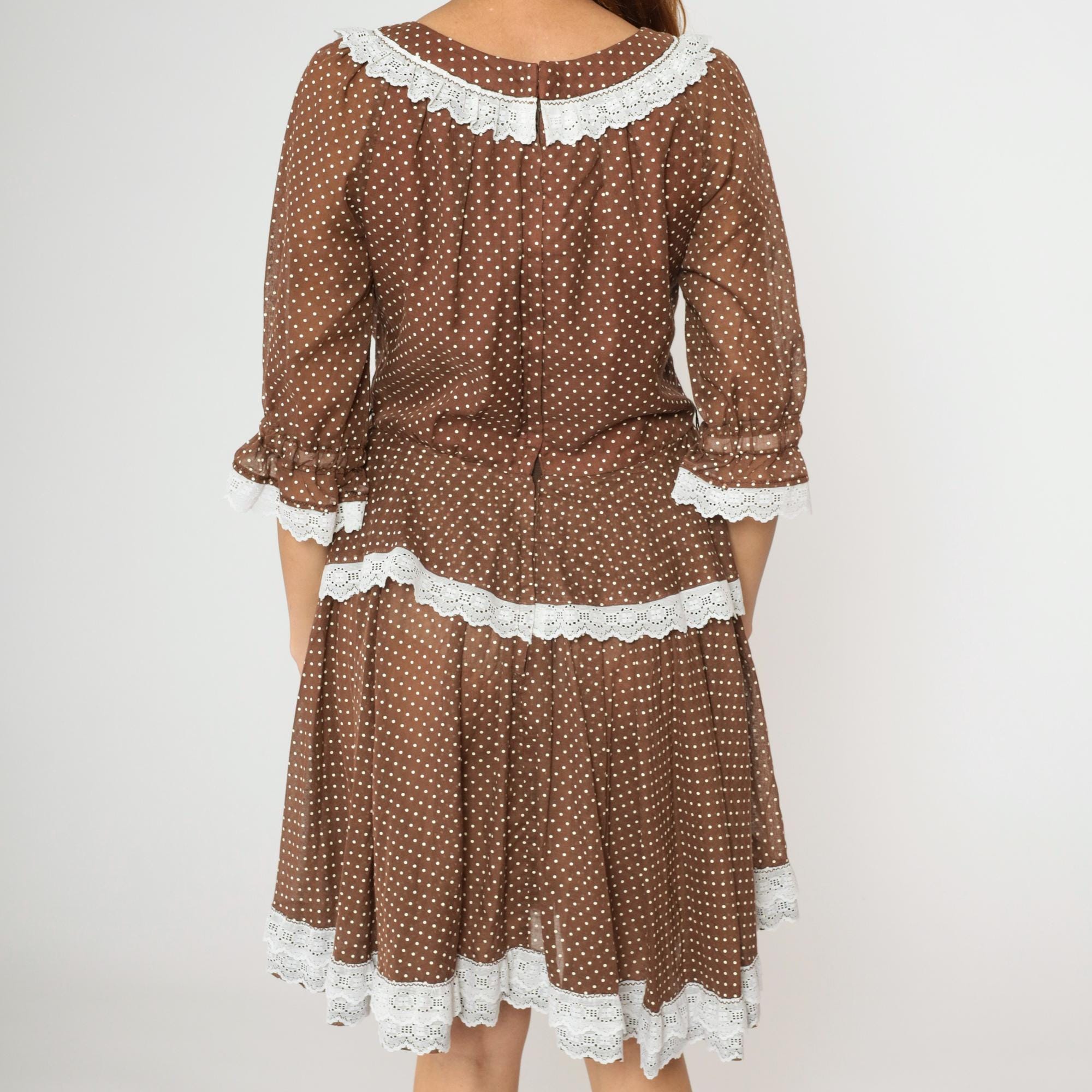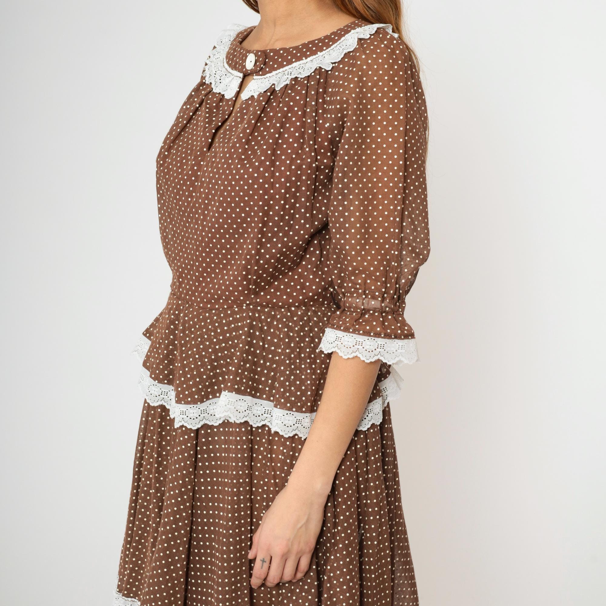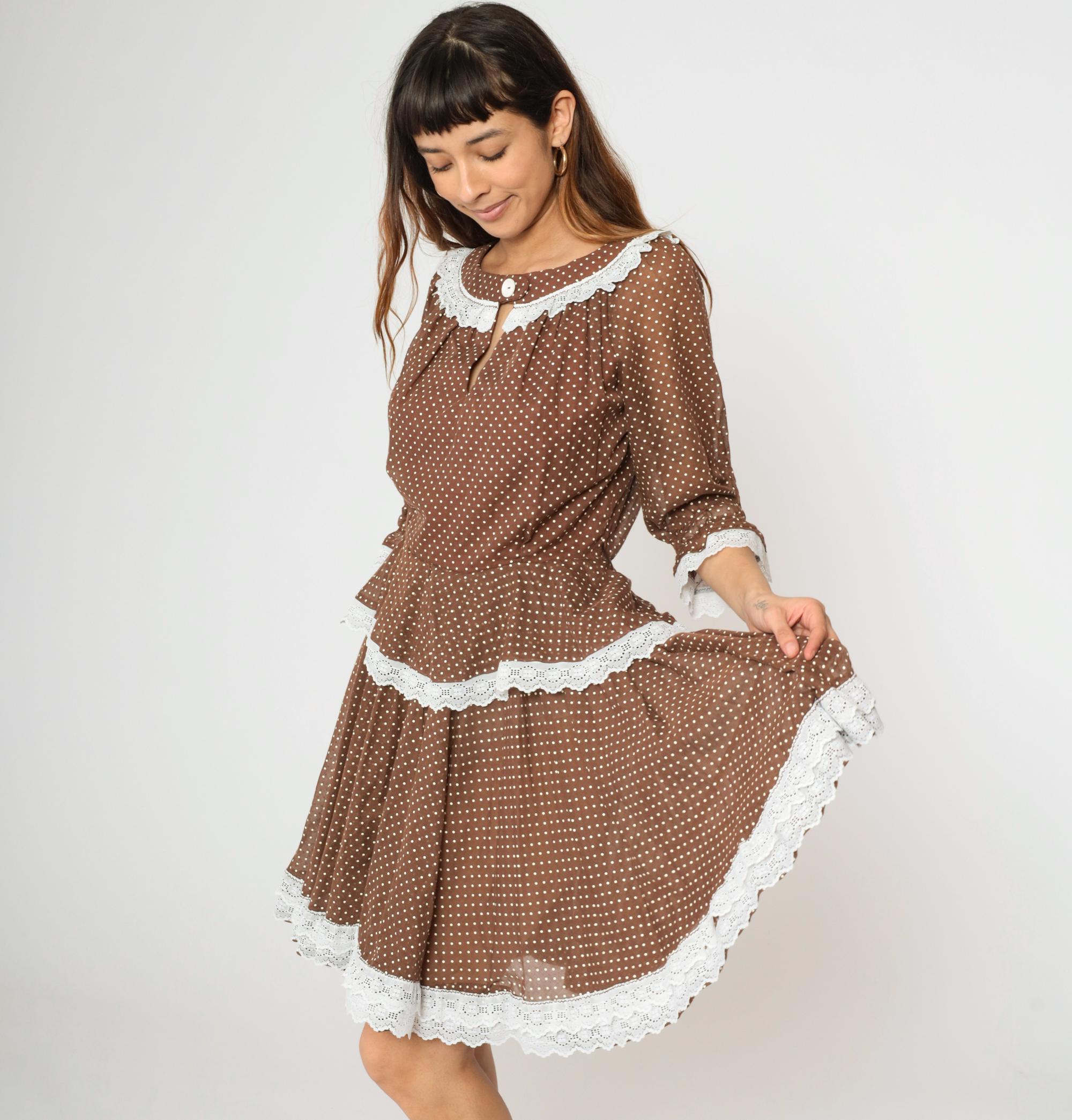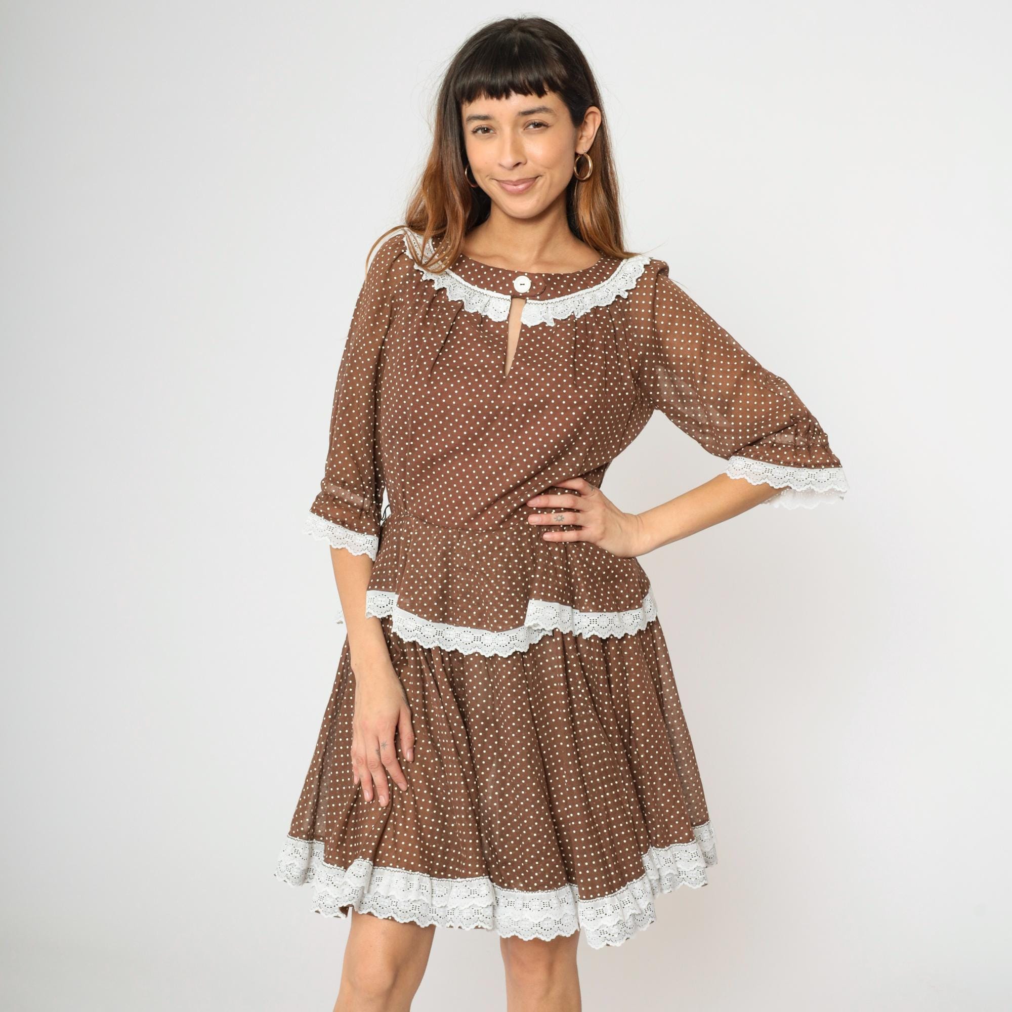 Vintage 70s dress in brown with a polka dot print and a tiered skirt. It has a high waist, a full skirt, and a keyhole button at the neck.